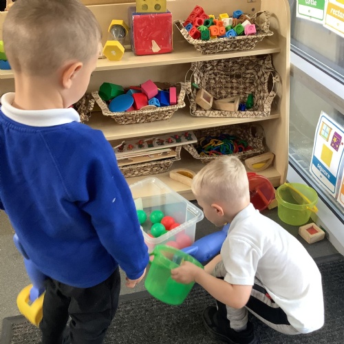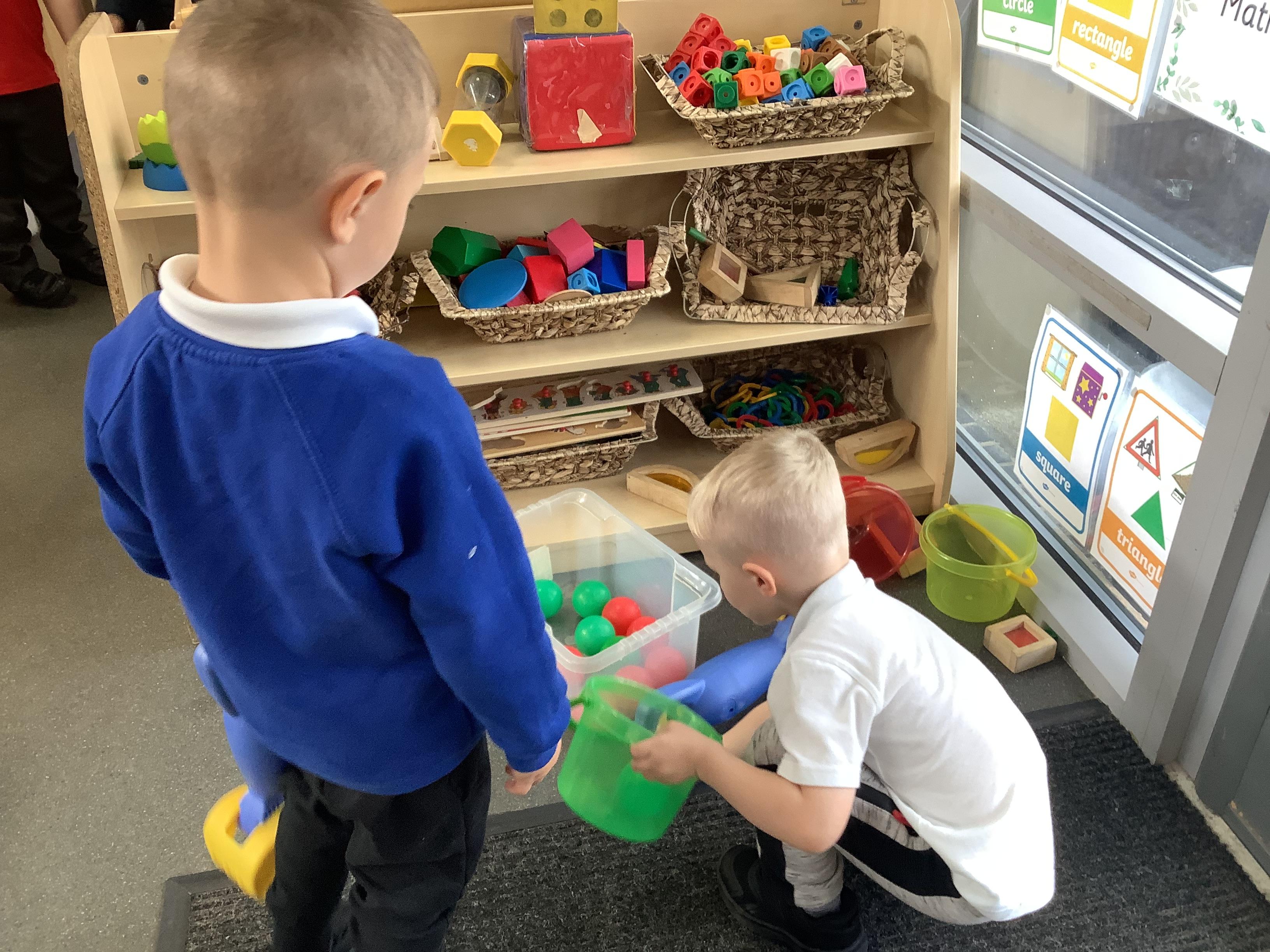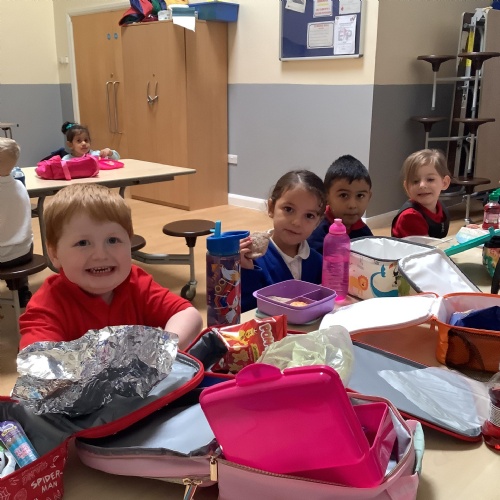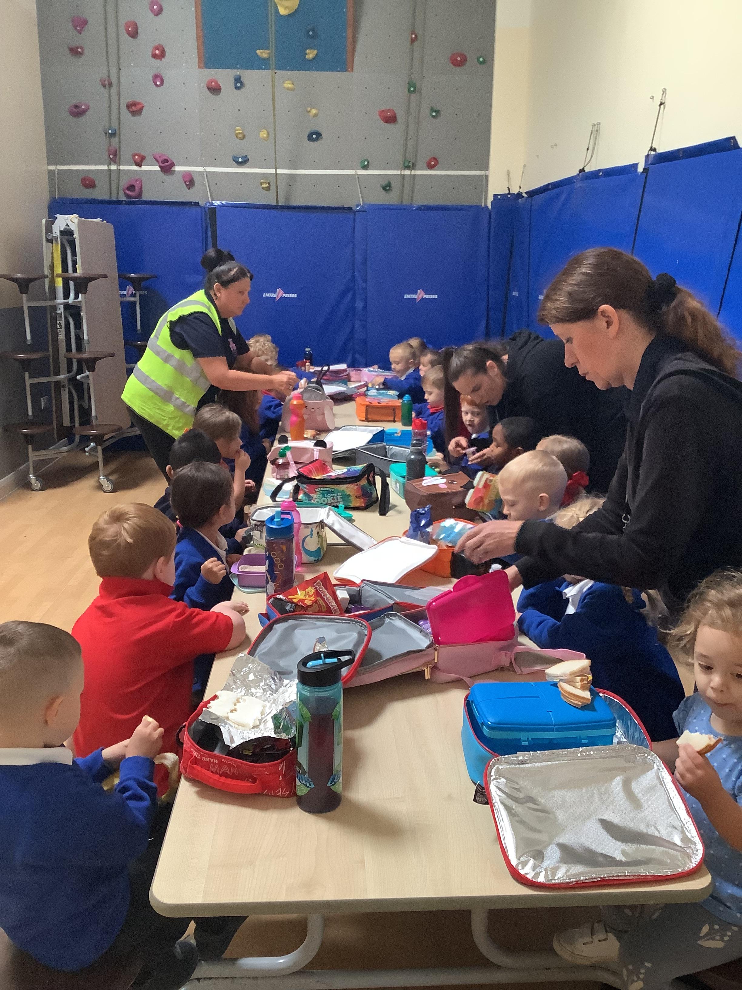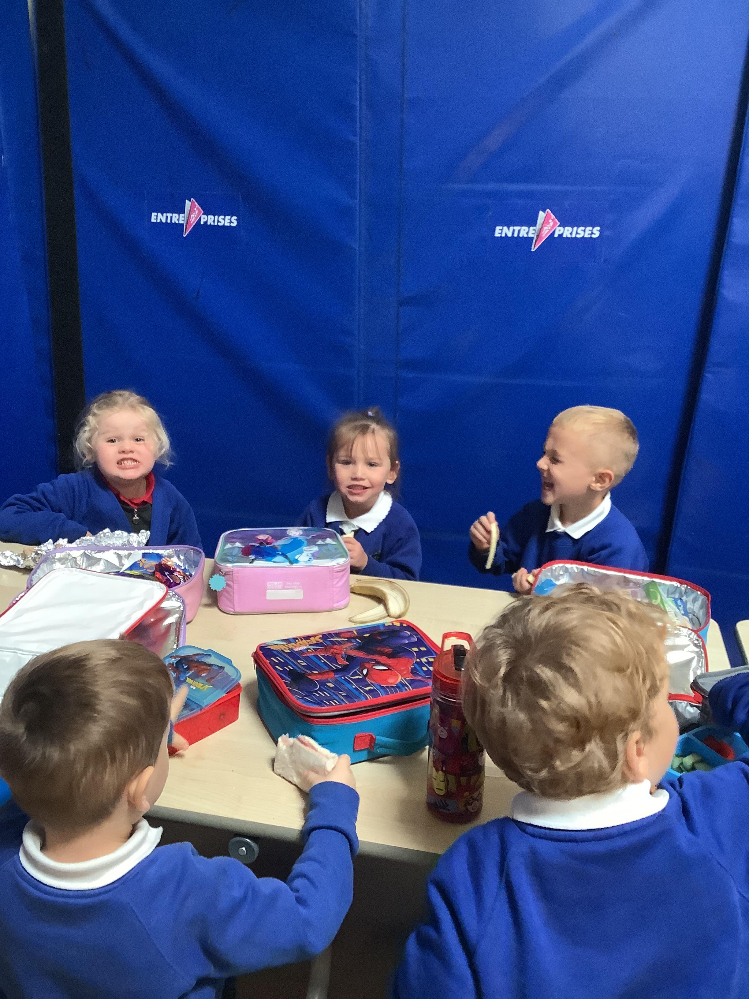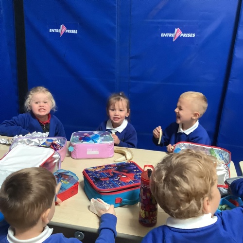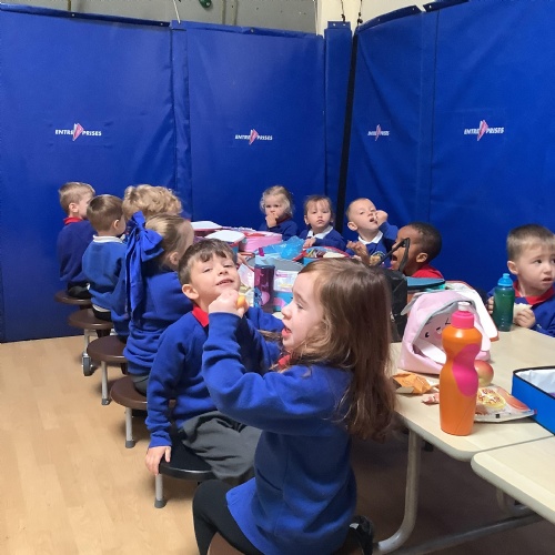 We have become quite confident now in going to the dinner hall at lunchtimes. We know how to line up sensibly and follow our grown up down to the dinner hall. We have met Leanne and Tina who help us in the dinner hall along with Miss Cain from our classroom. We enjoy being together at lunchtime, sharing stories from our morning of play and looking forward to going back to the classroom to carry on our play and learning.