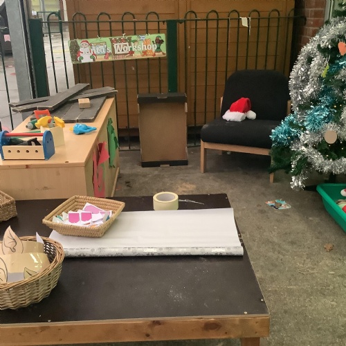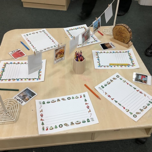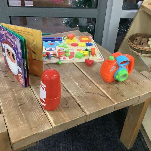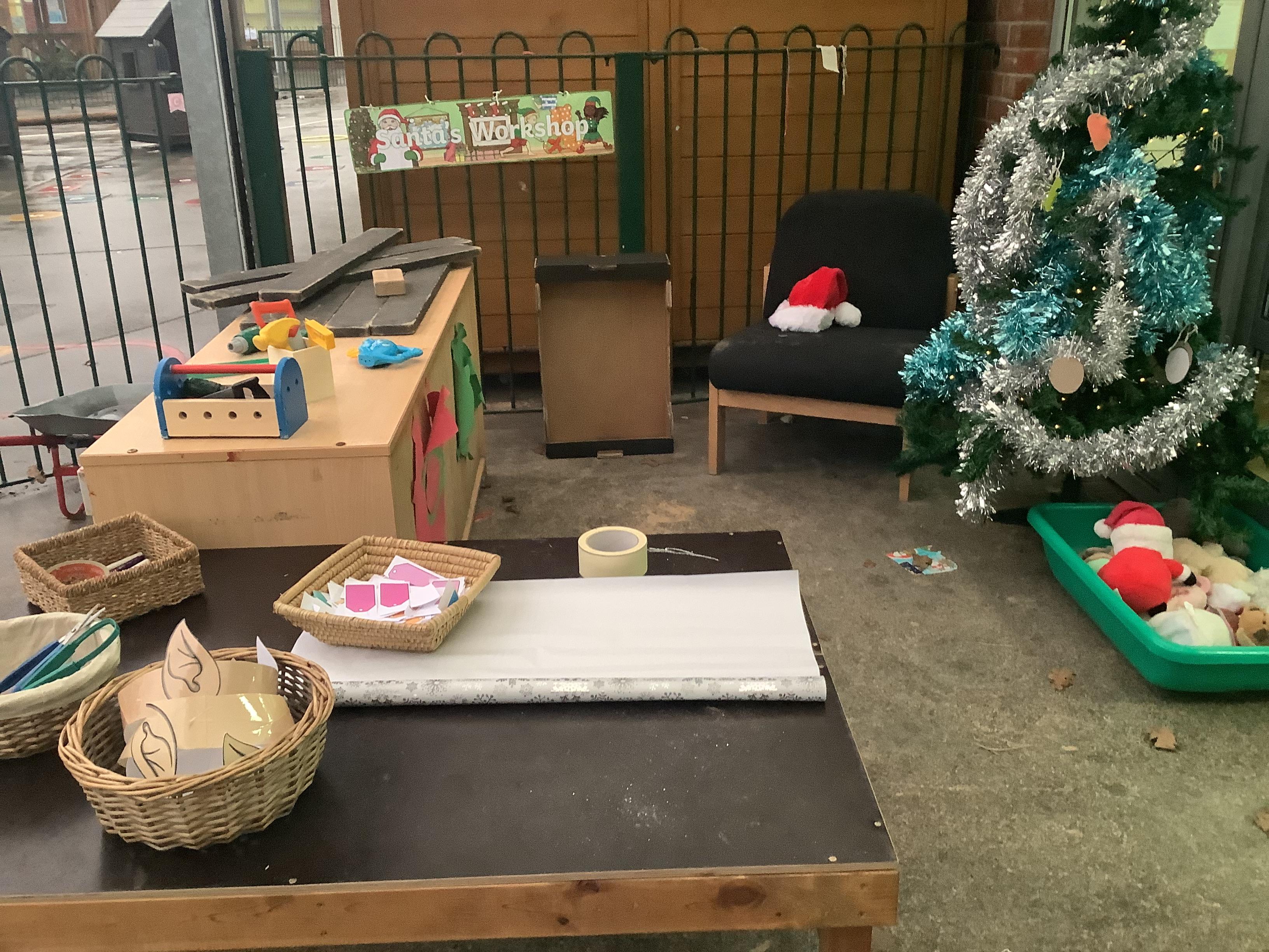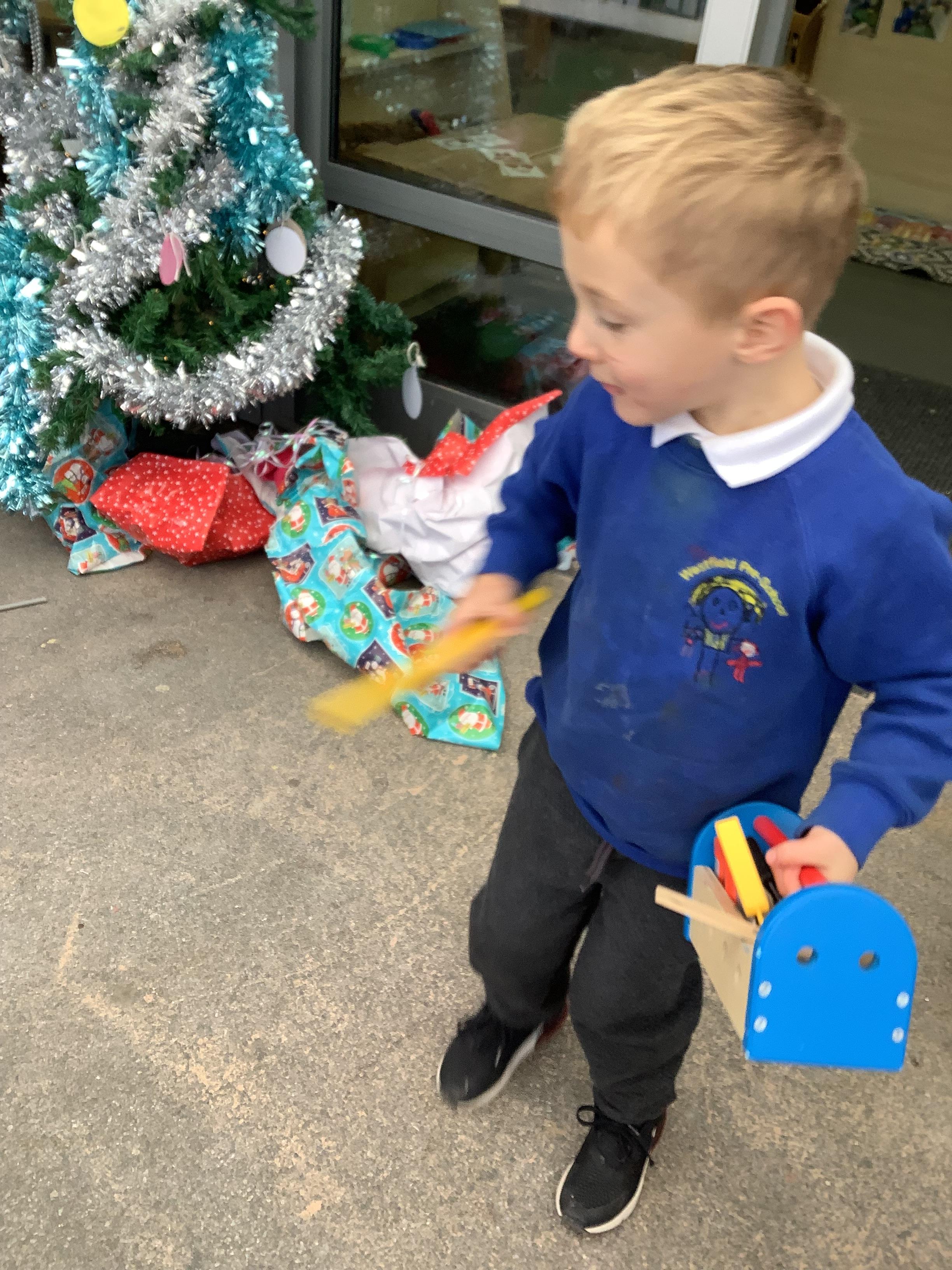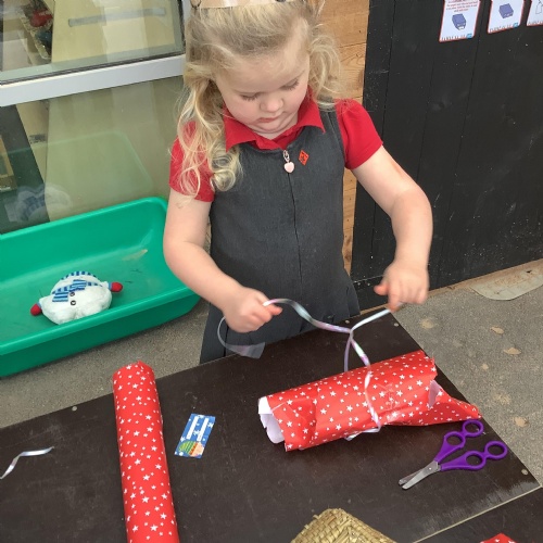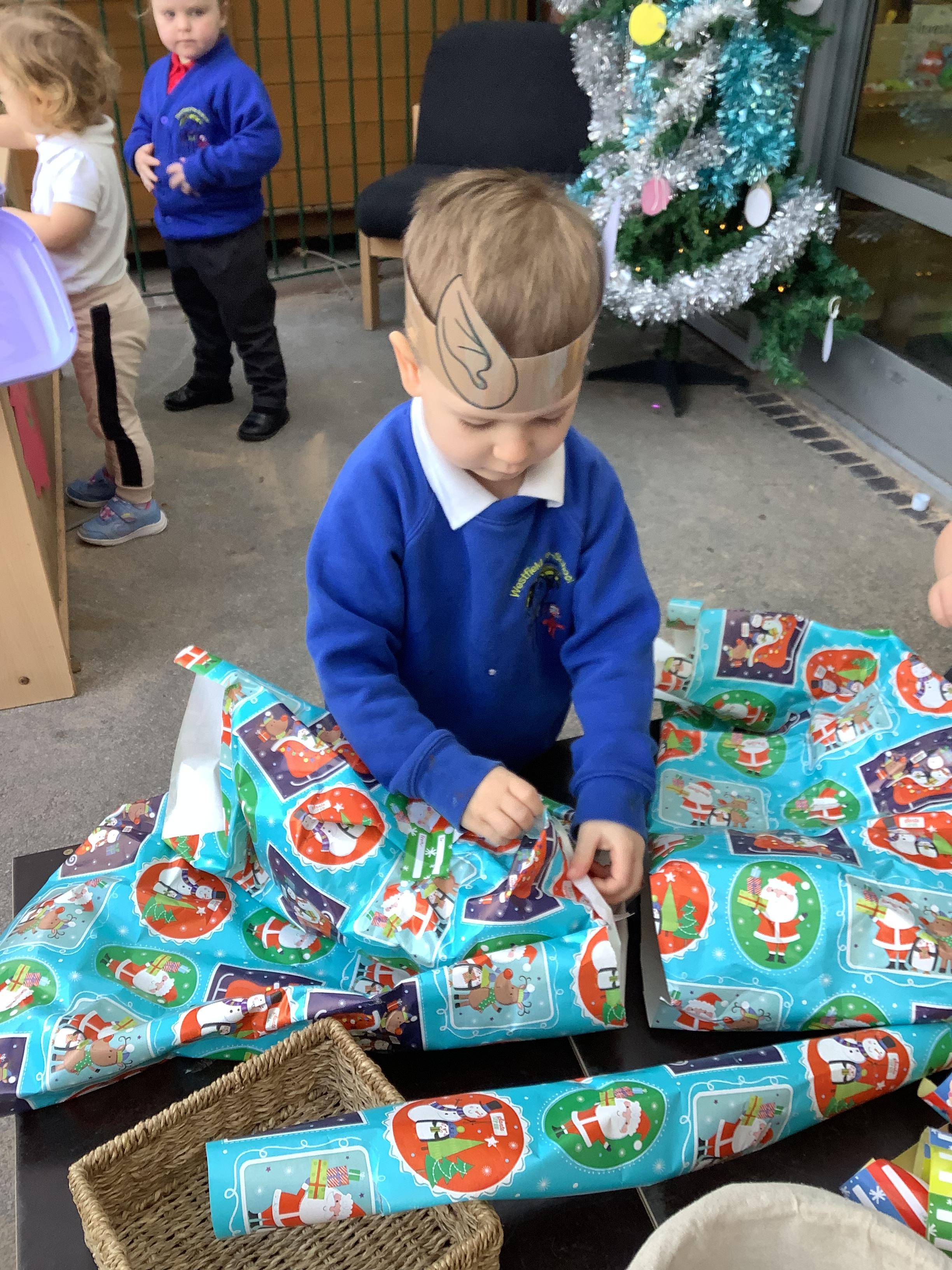We worked as little elves in Santa's workshop. We chose a toy, used scissors to cut the wrapping paper and then sellotape to wrap it!