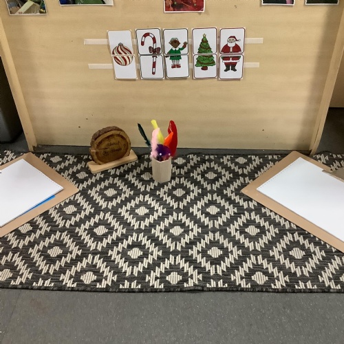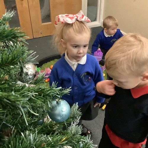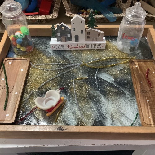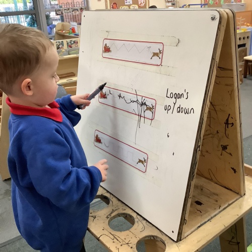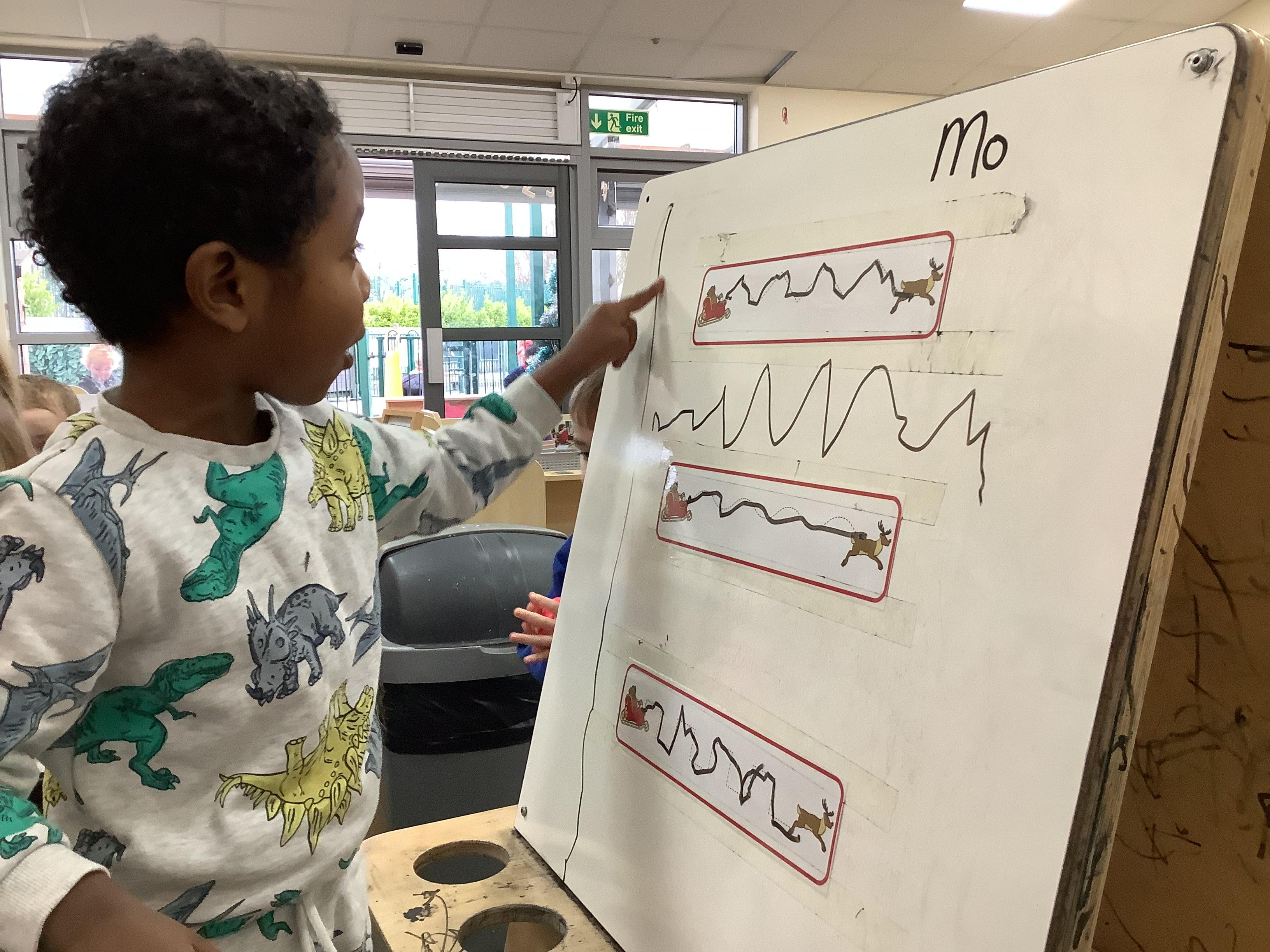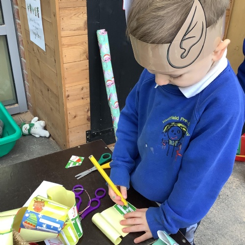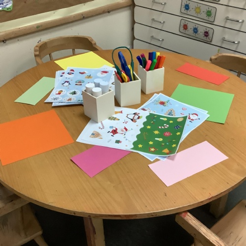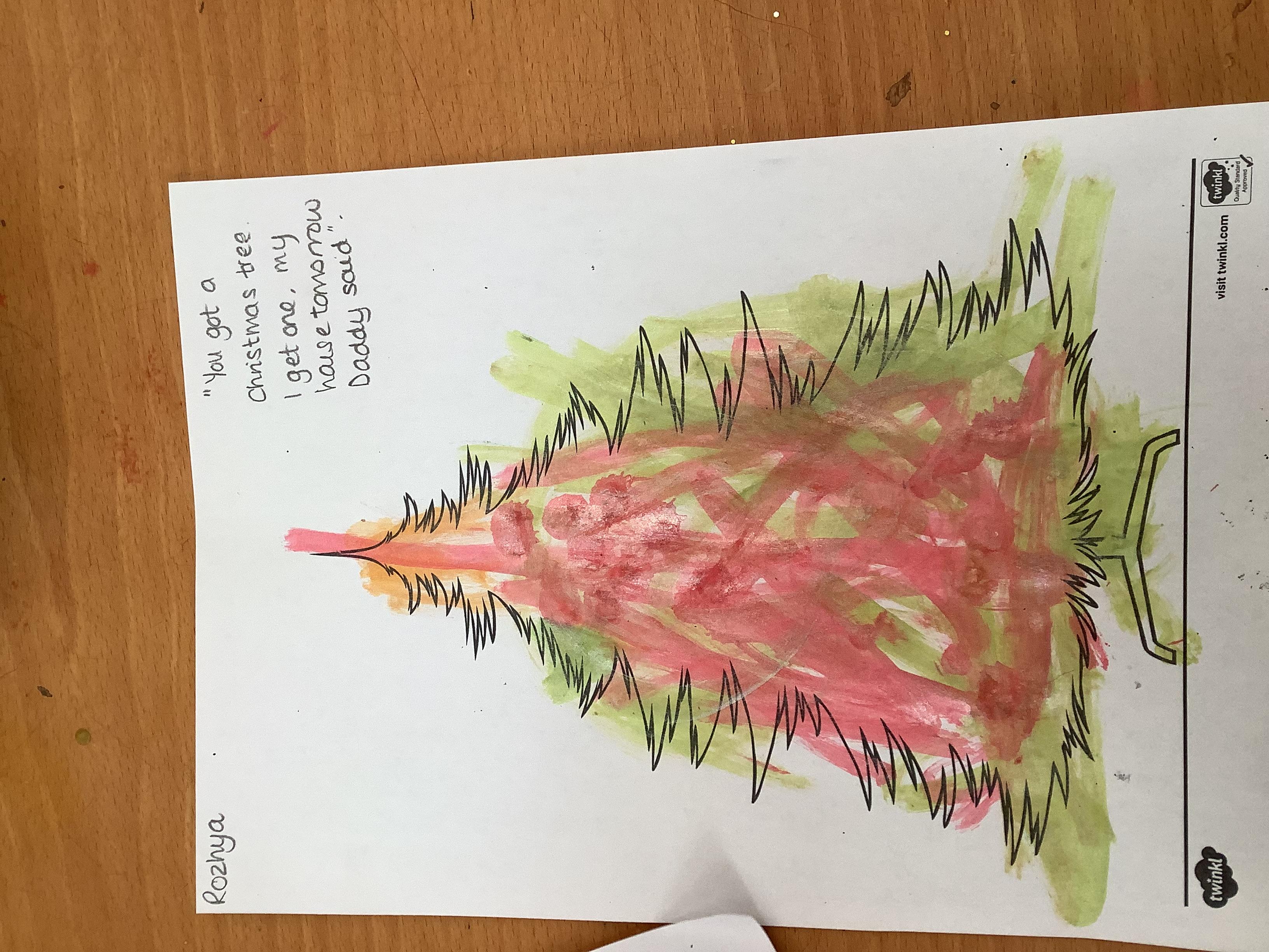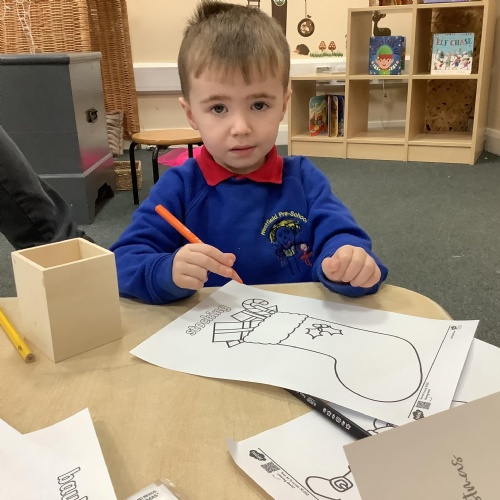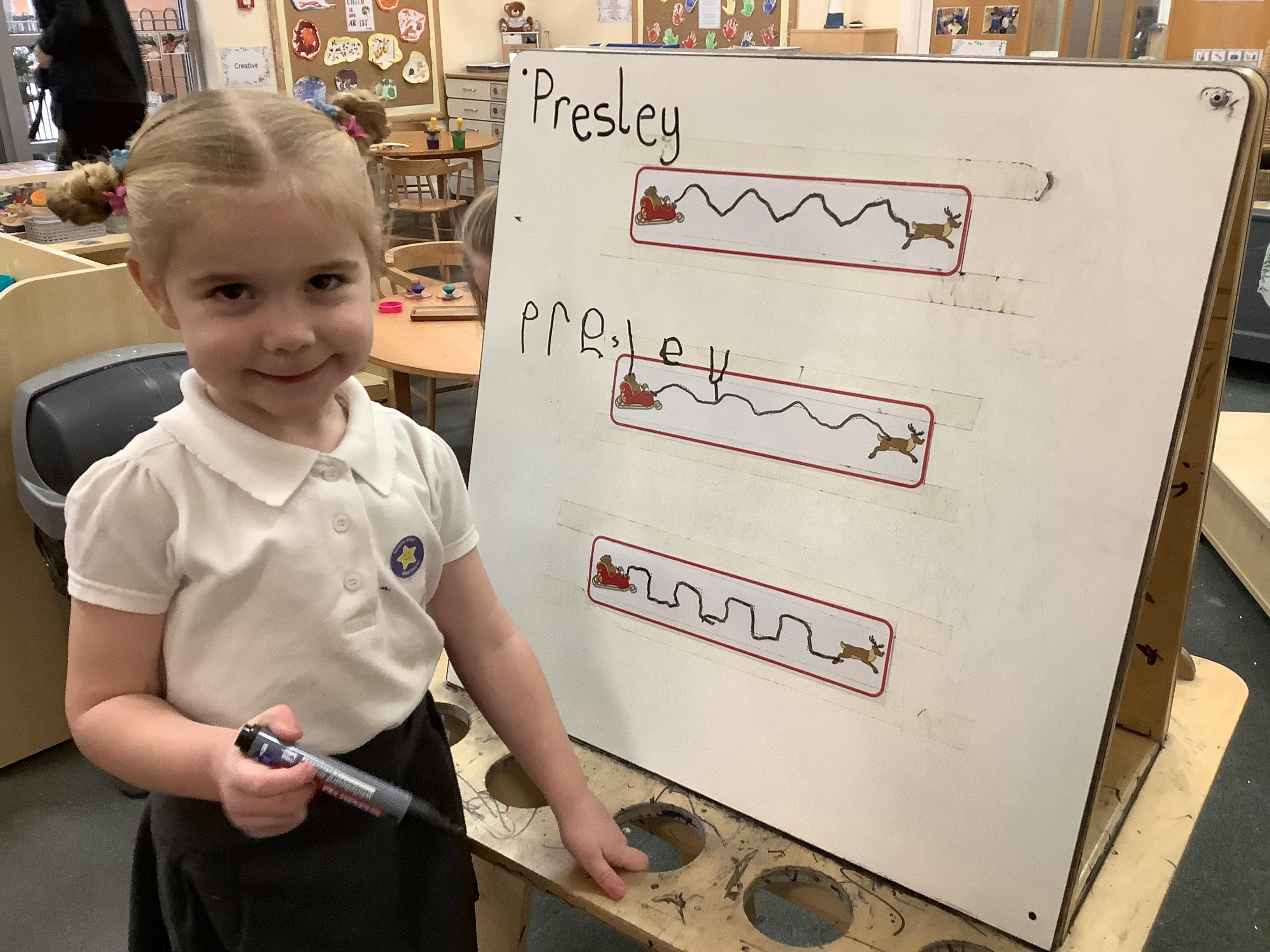 We worked as little elves in Santa's workshop. We chose a toy, used scissors to cut the wrapping paper and then sellotape to wrap it!
