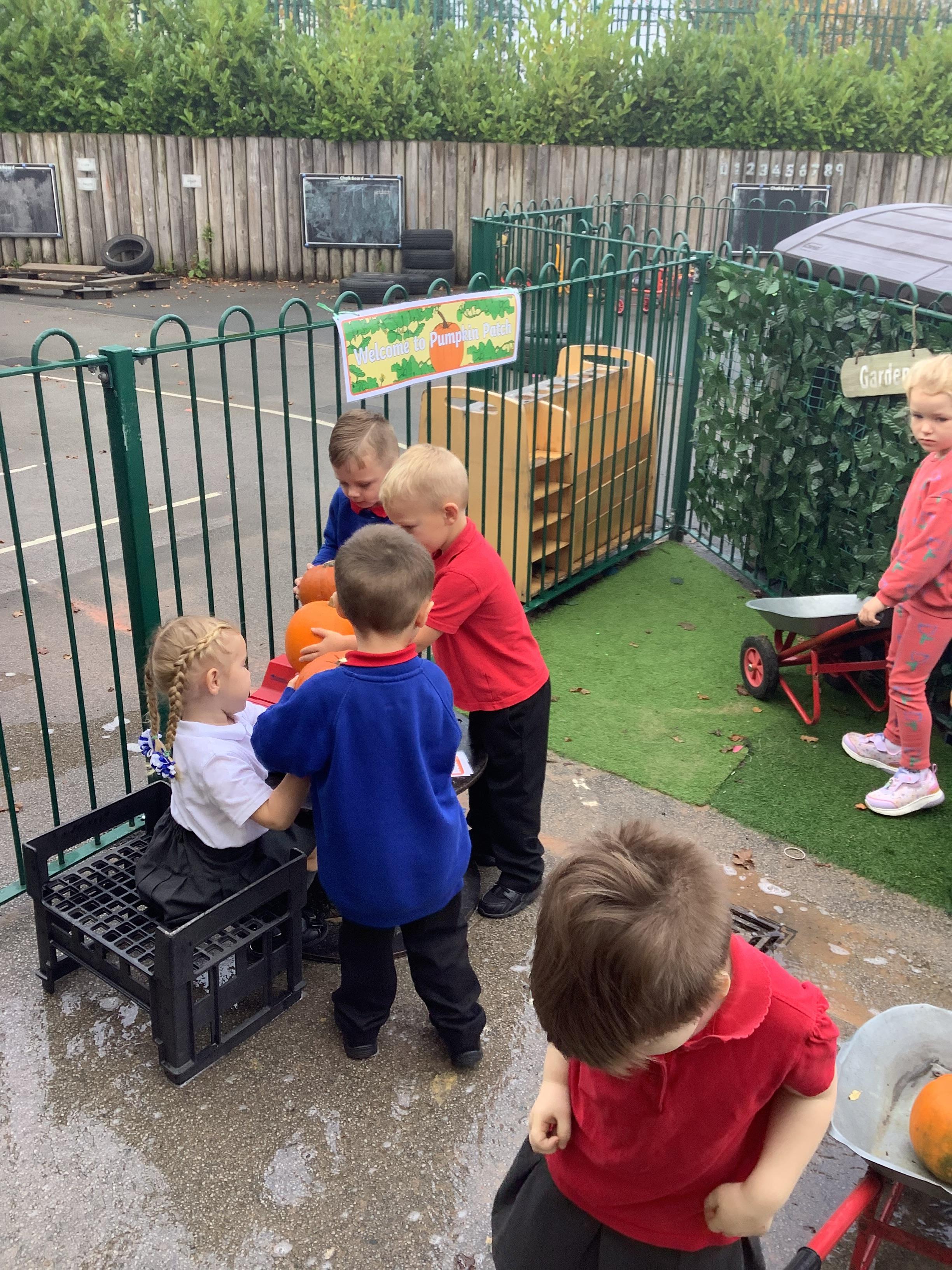 The children were all very excited this week about Halloween. Miss Cain kindly donated 5 pumpkins to us to create a pumpkin patch in the outdoor classroom.