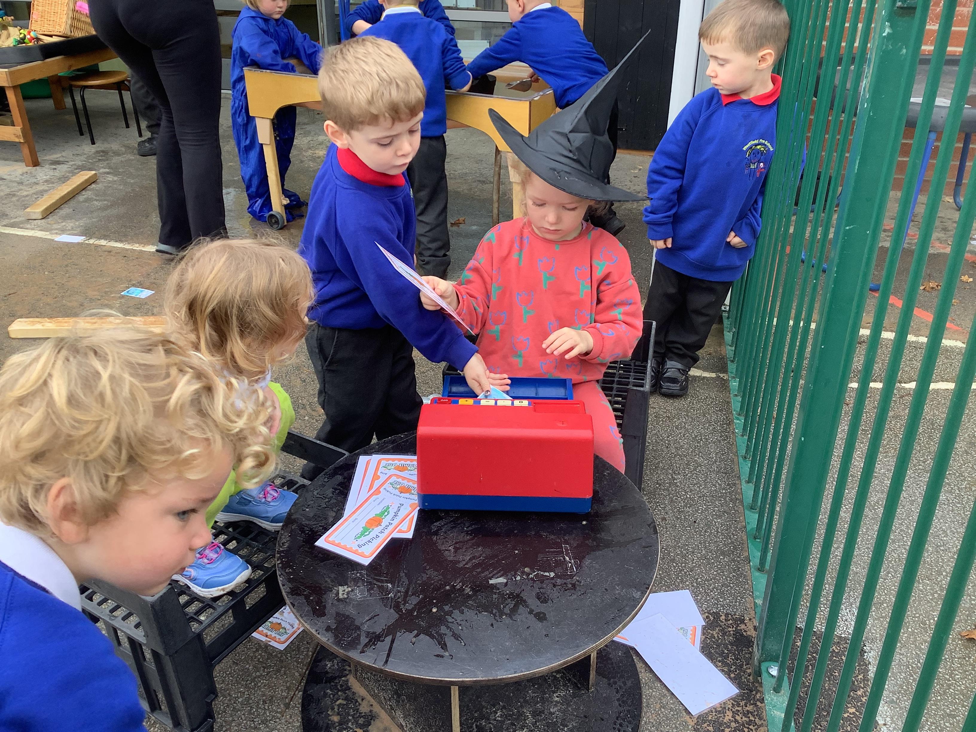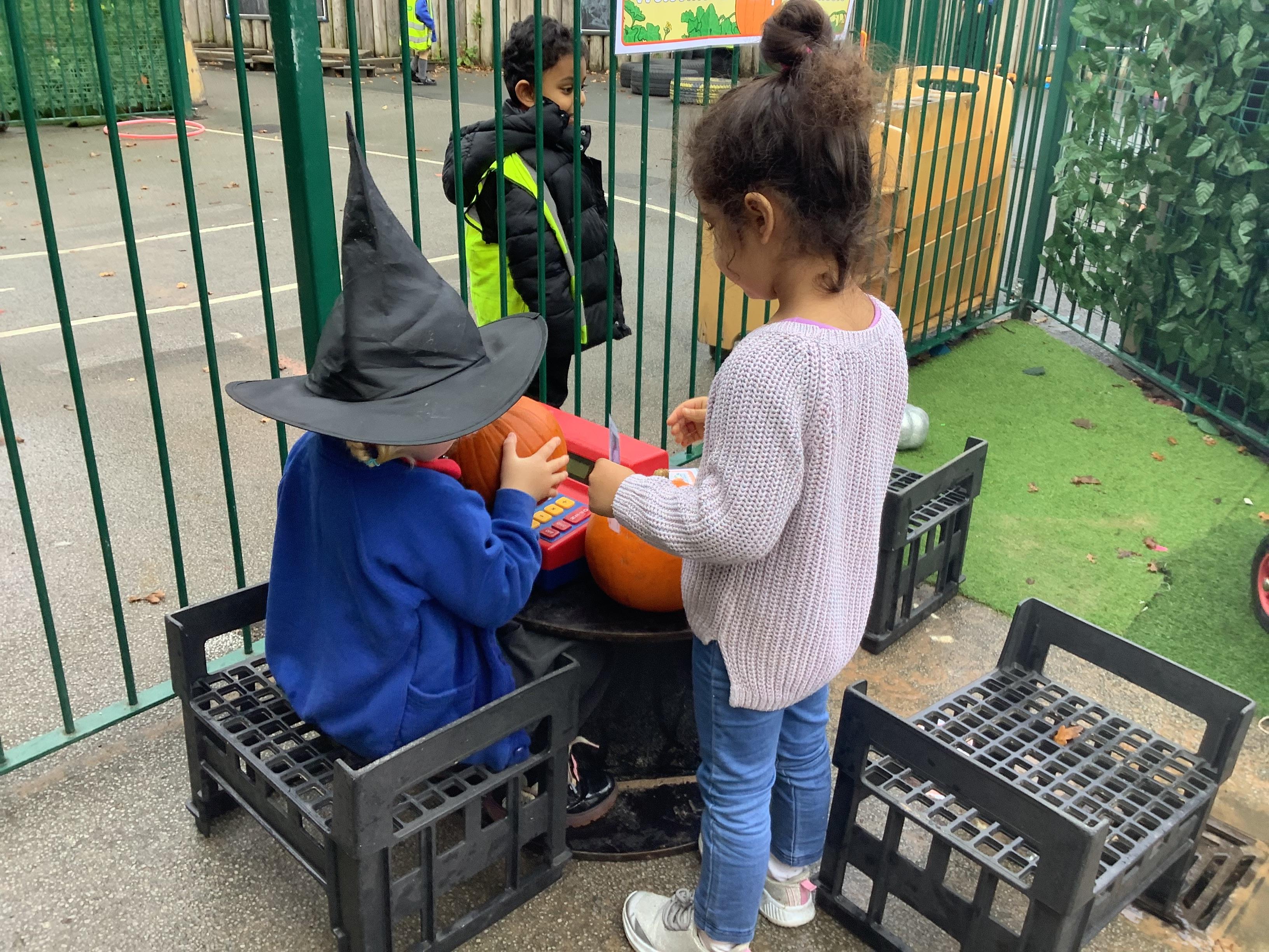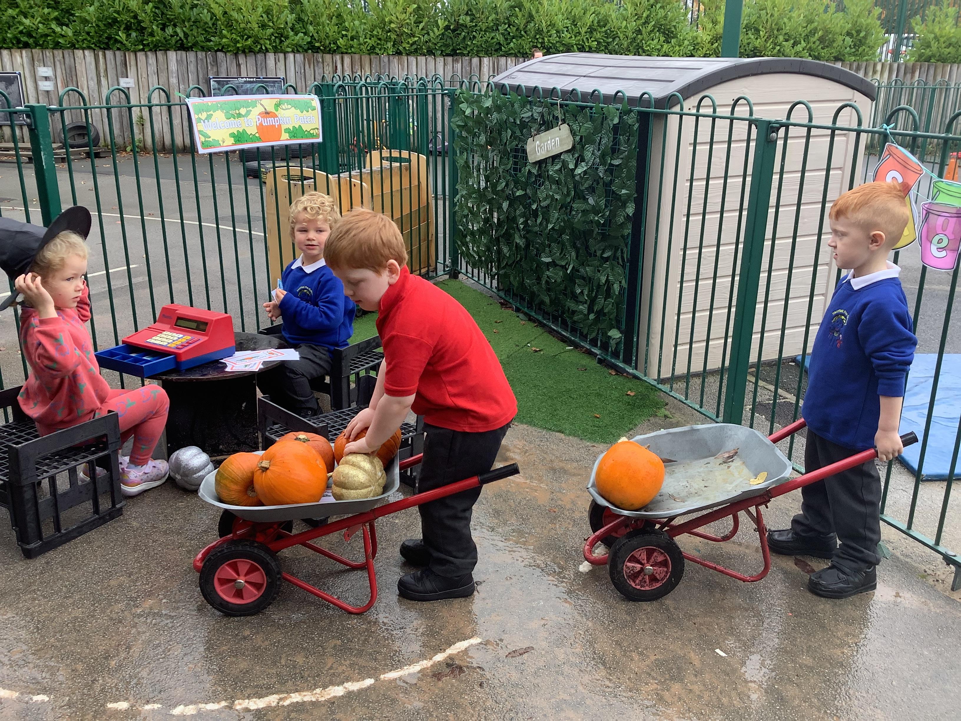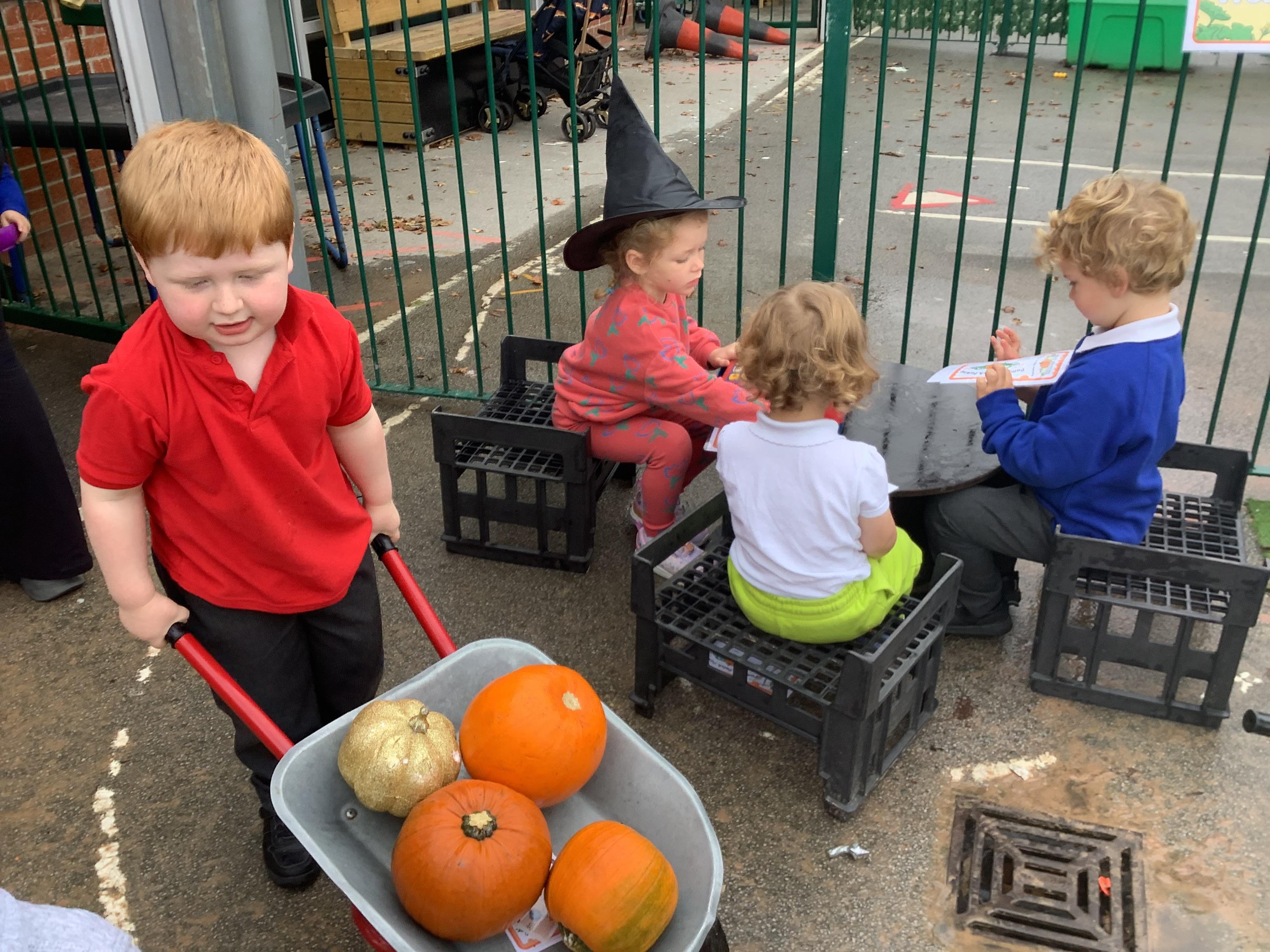 This was a huge hit with all children who picked a pumpkin, loaded it into the wheelbarrow and paid for them with the 'pretend' money.