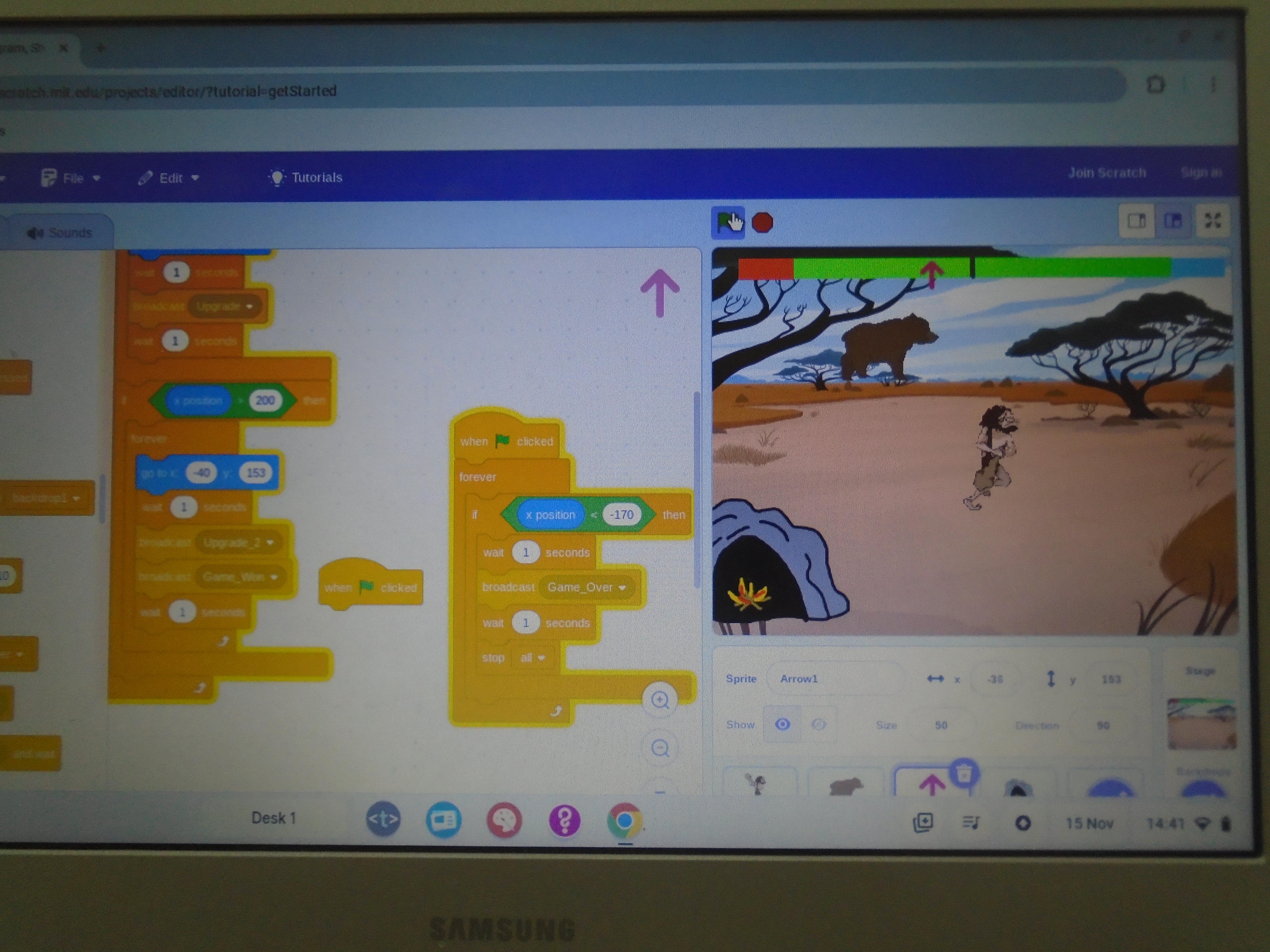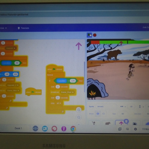In computing, we have been creating a Stone Age game using coding. The Stone Age man has to hunt for the food before the time runs out.