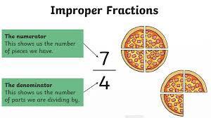 An improper fraction is a fraction in which the numerator is greater than the denominator.