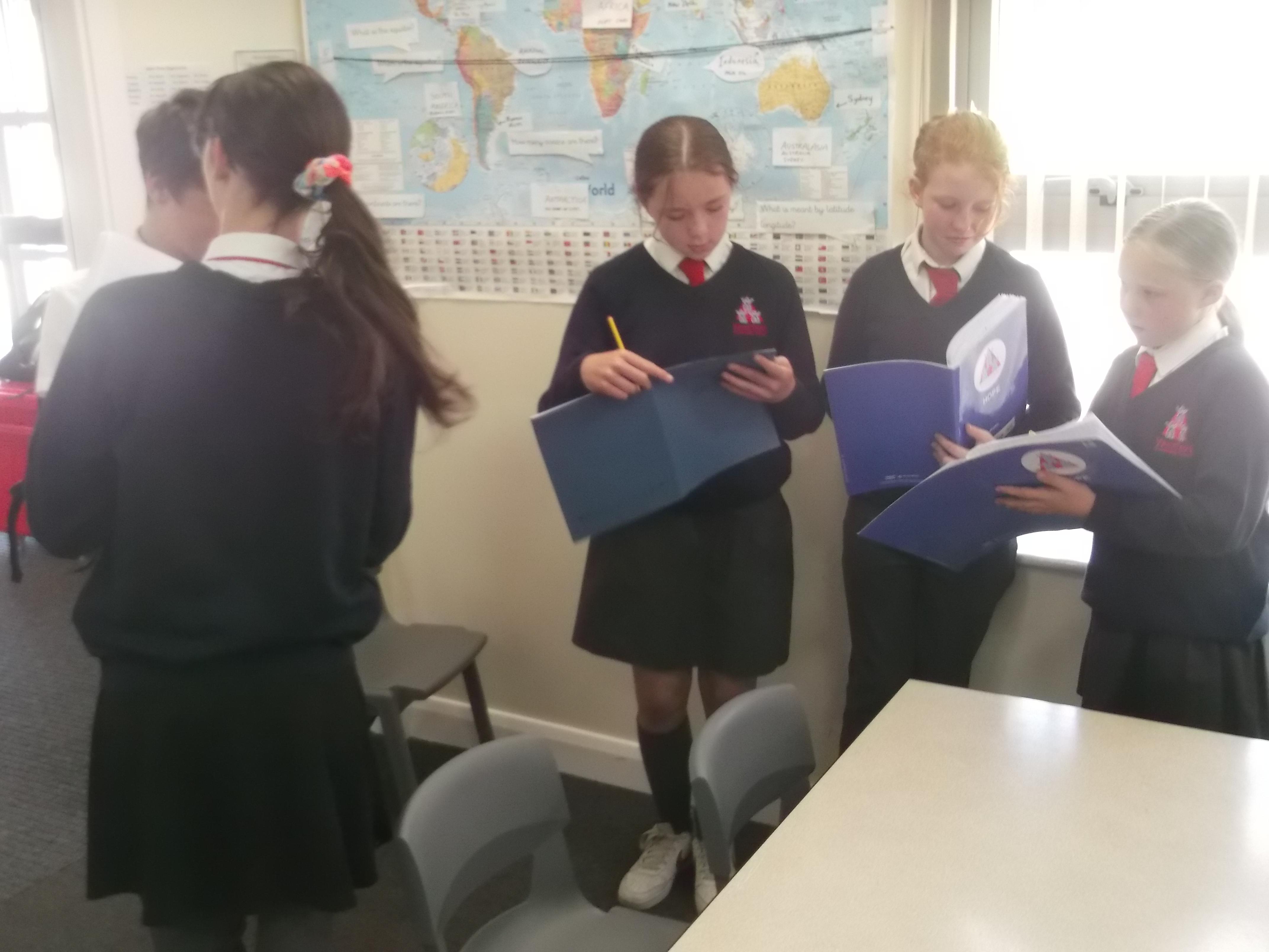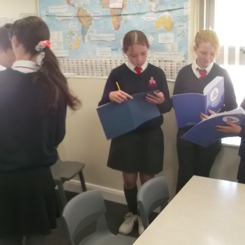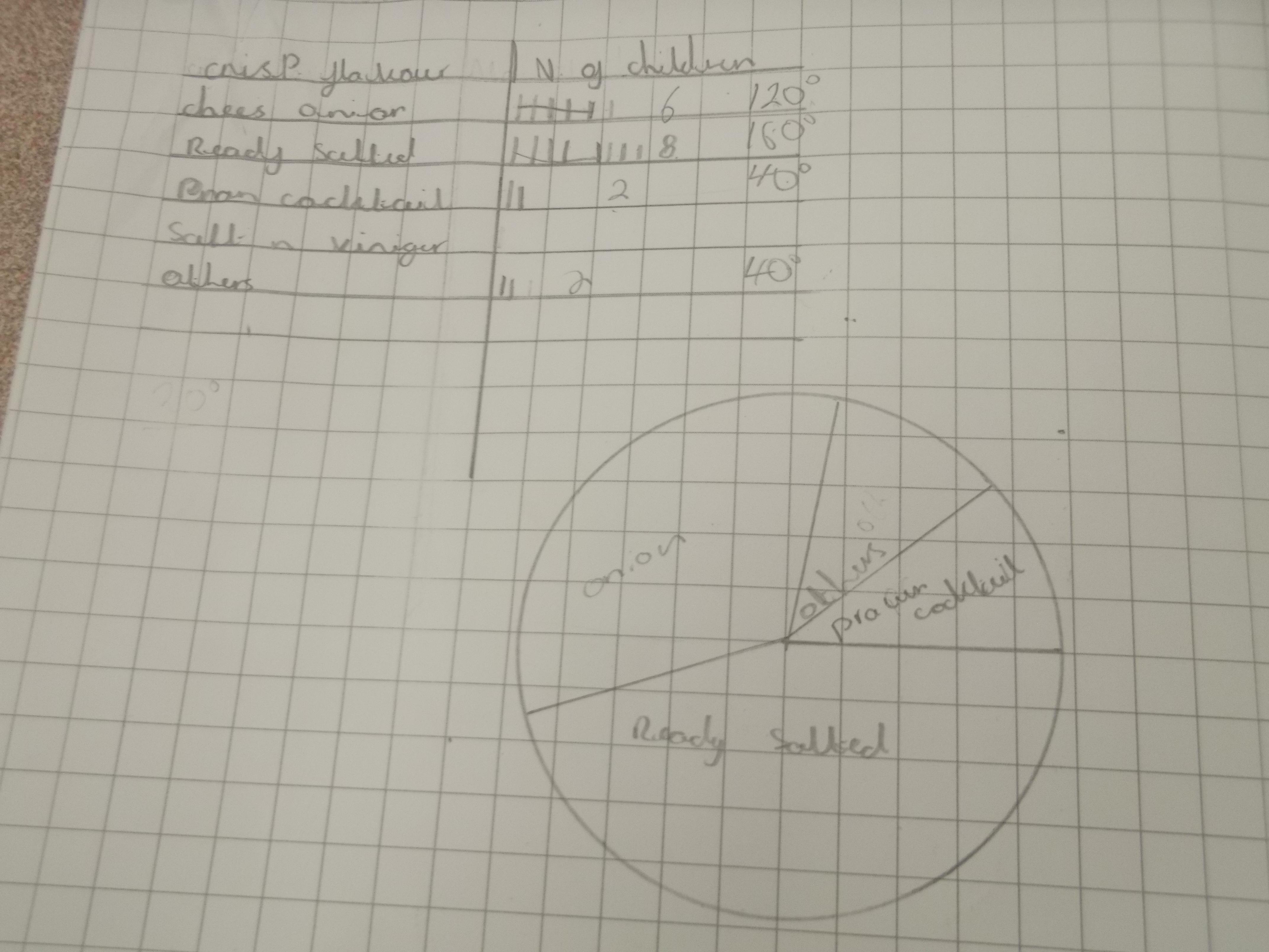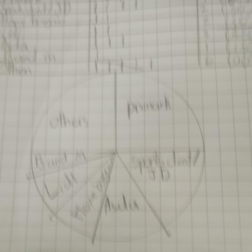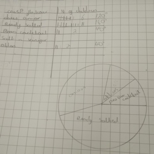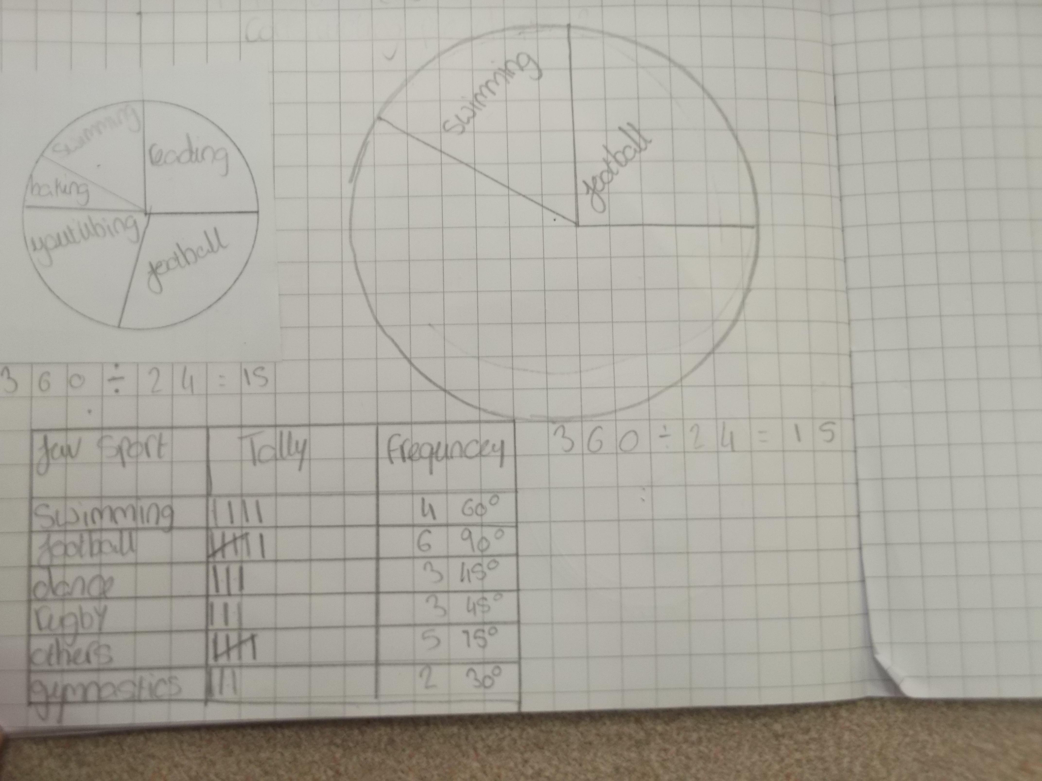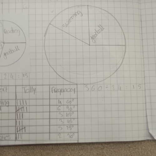 Here are some of Y6W collecting data from their peers. This time, instead of graphs, they constructed their own pie charts to represent the data. This meant working out how many degrees in a circle each pie sector needed to be and then use a protractor to measure and draw them. Impressive stuff!
