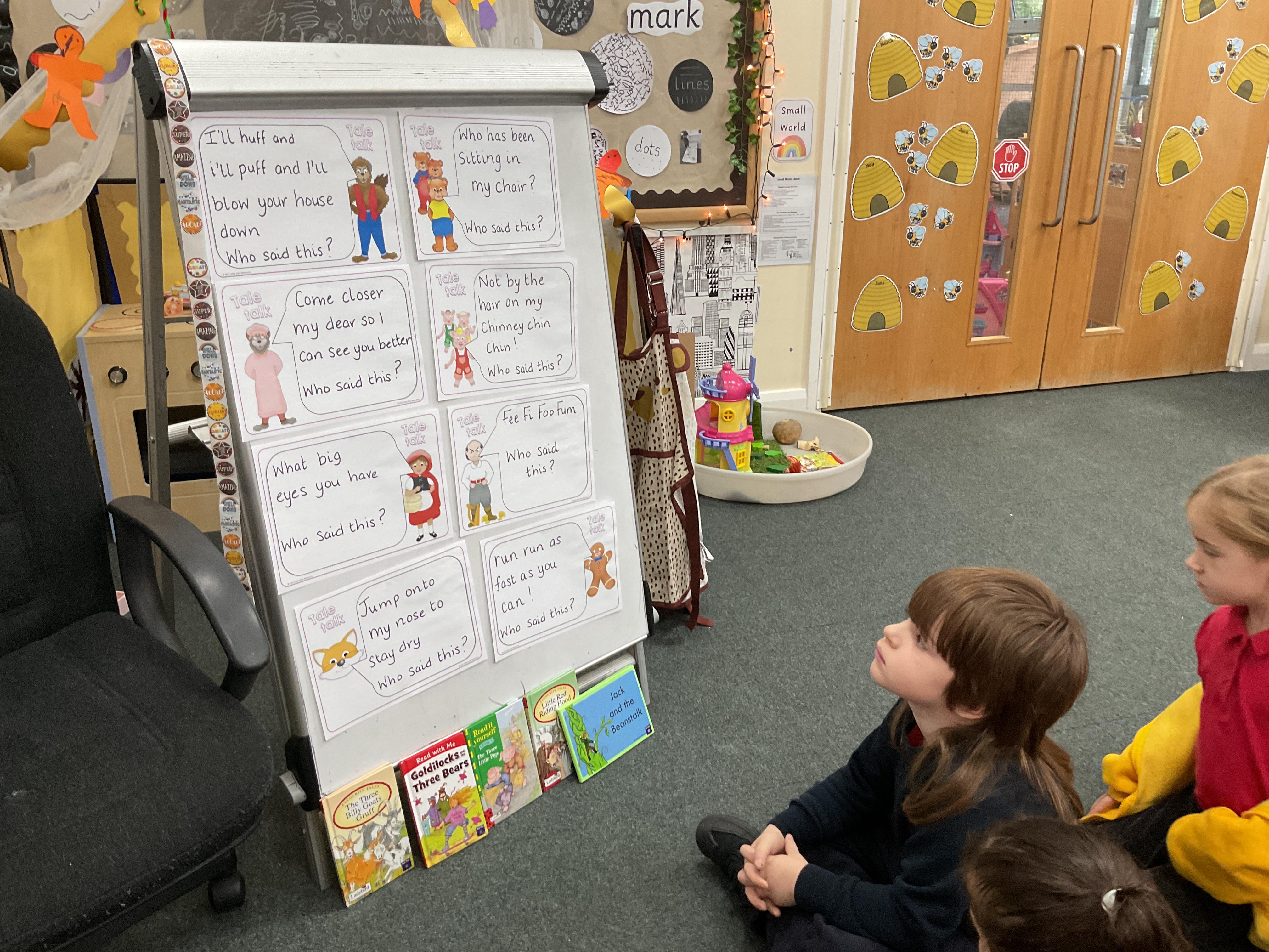 We alos took our knowledge of Traditional Tales to the next level. We looked at some of the repetitive refrains from the story that we knew well for example run, run as fast as you can you can't catch me I'm the .... and talked about which story they came from. Here we are sorting our speech bubbles and finding the matching stories ![]()