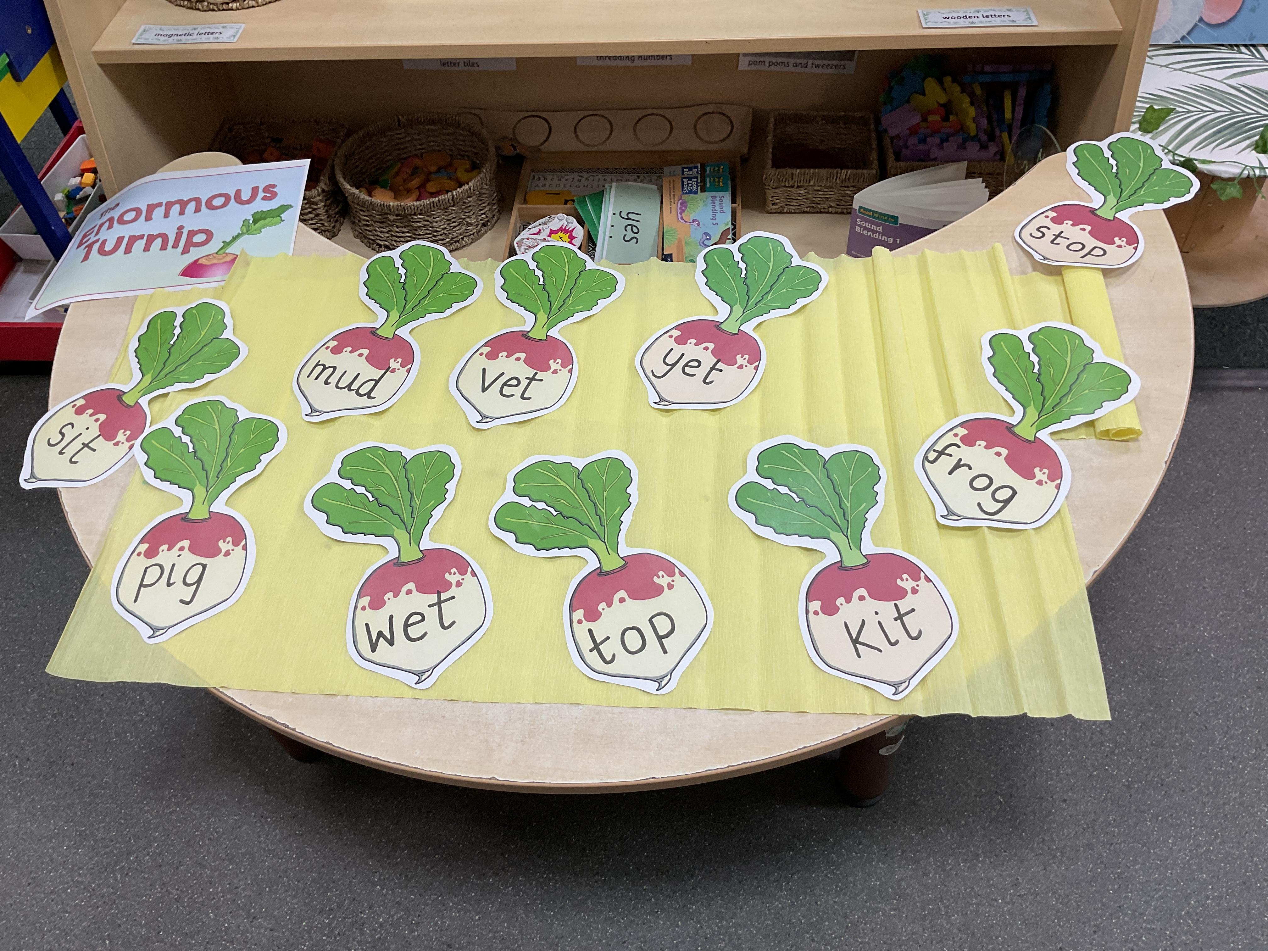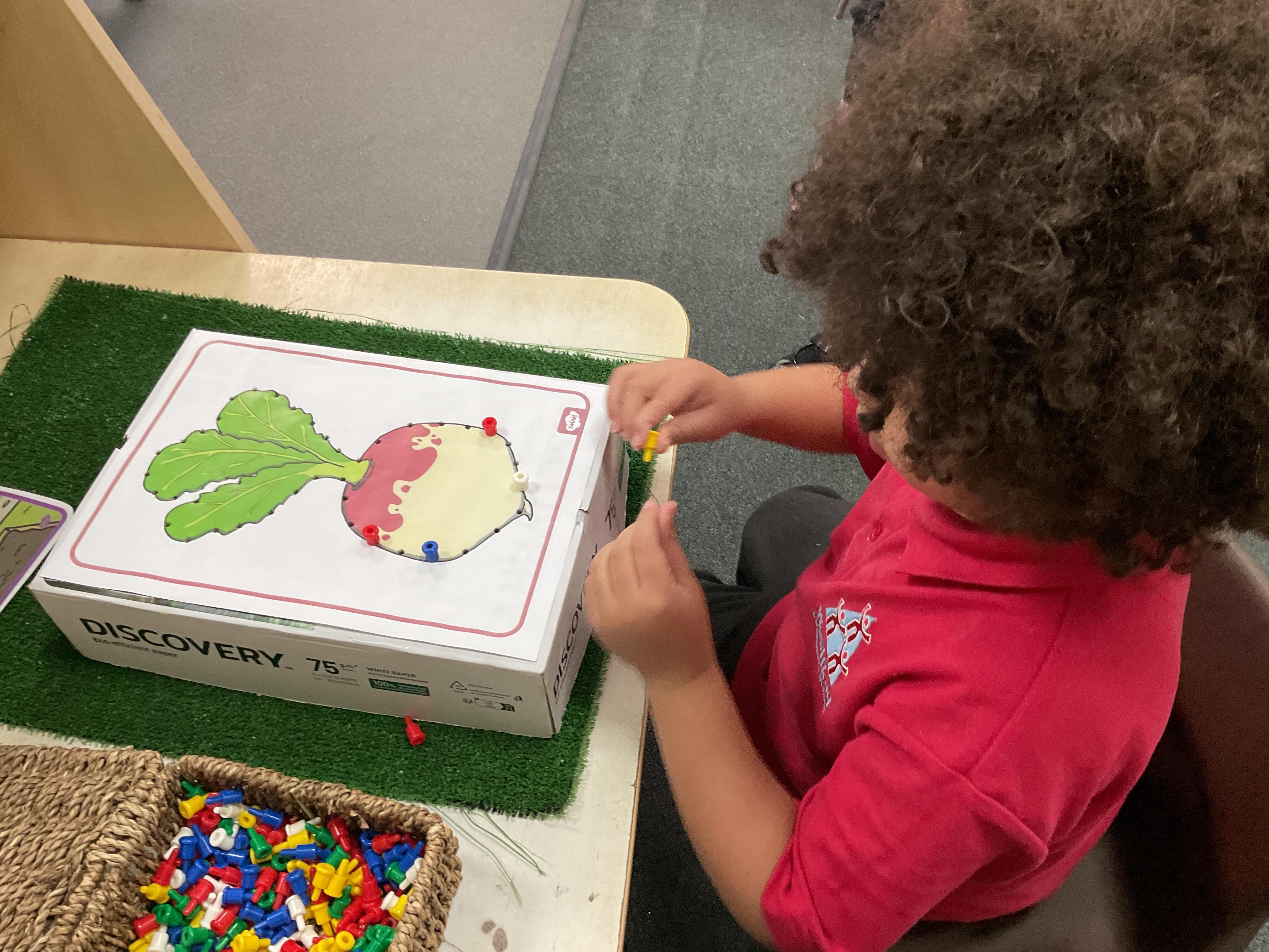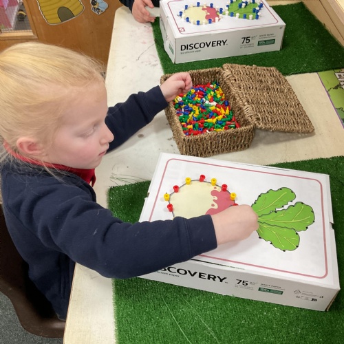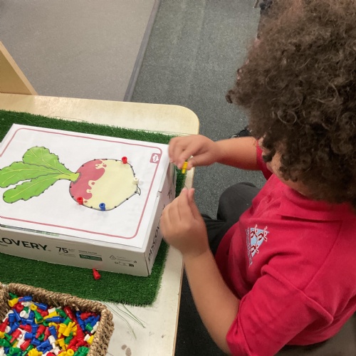 We have also been busy in the Funky Finger area in class. We have created a repeatign pattern on an enormous turnip. Our pincer grip is loving these types of activities and they really do help a child to develop their grip ![]()