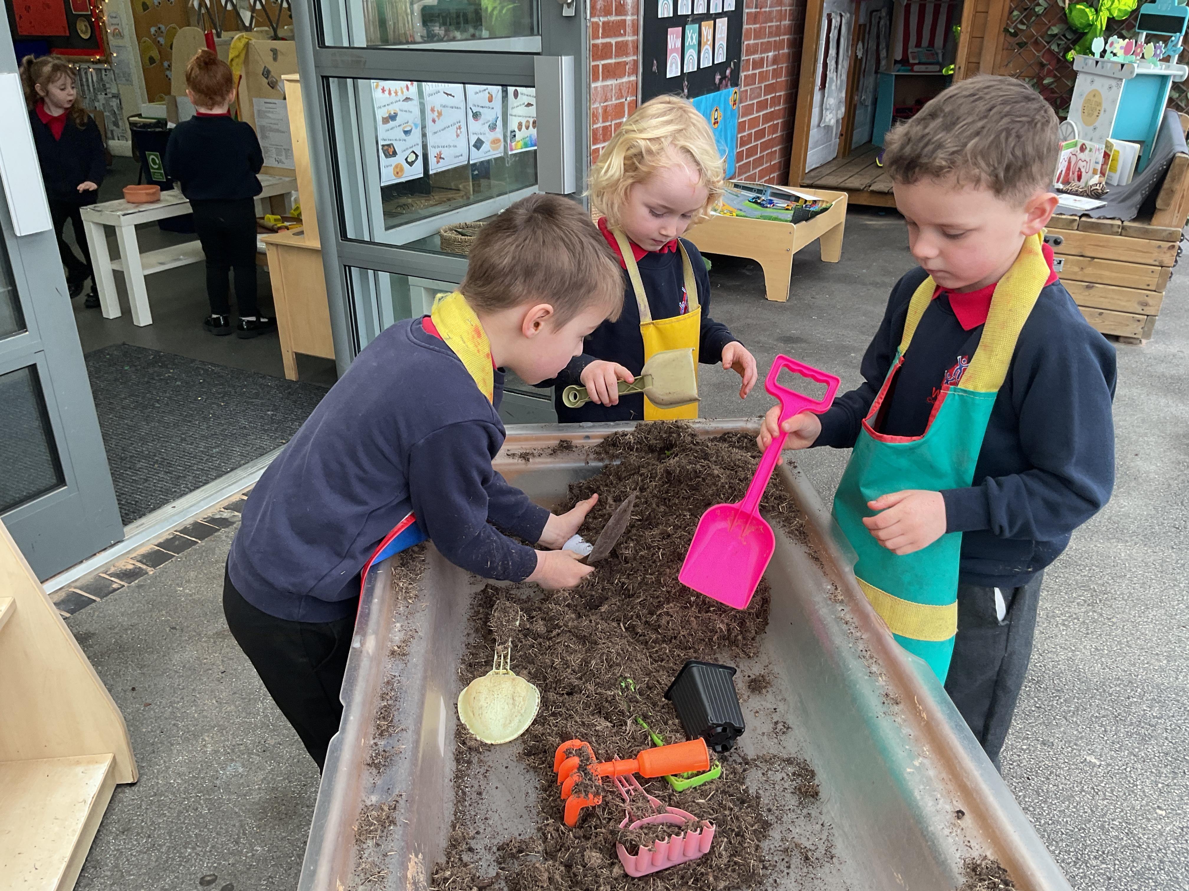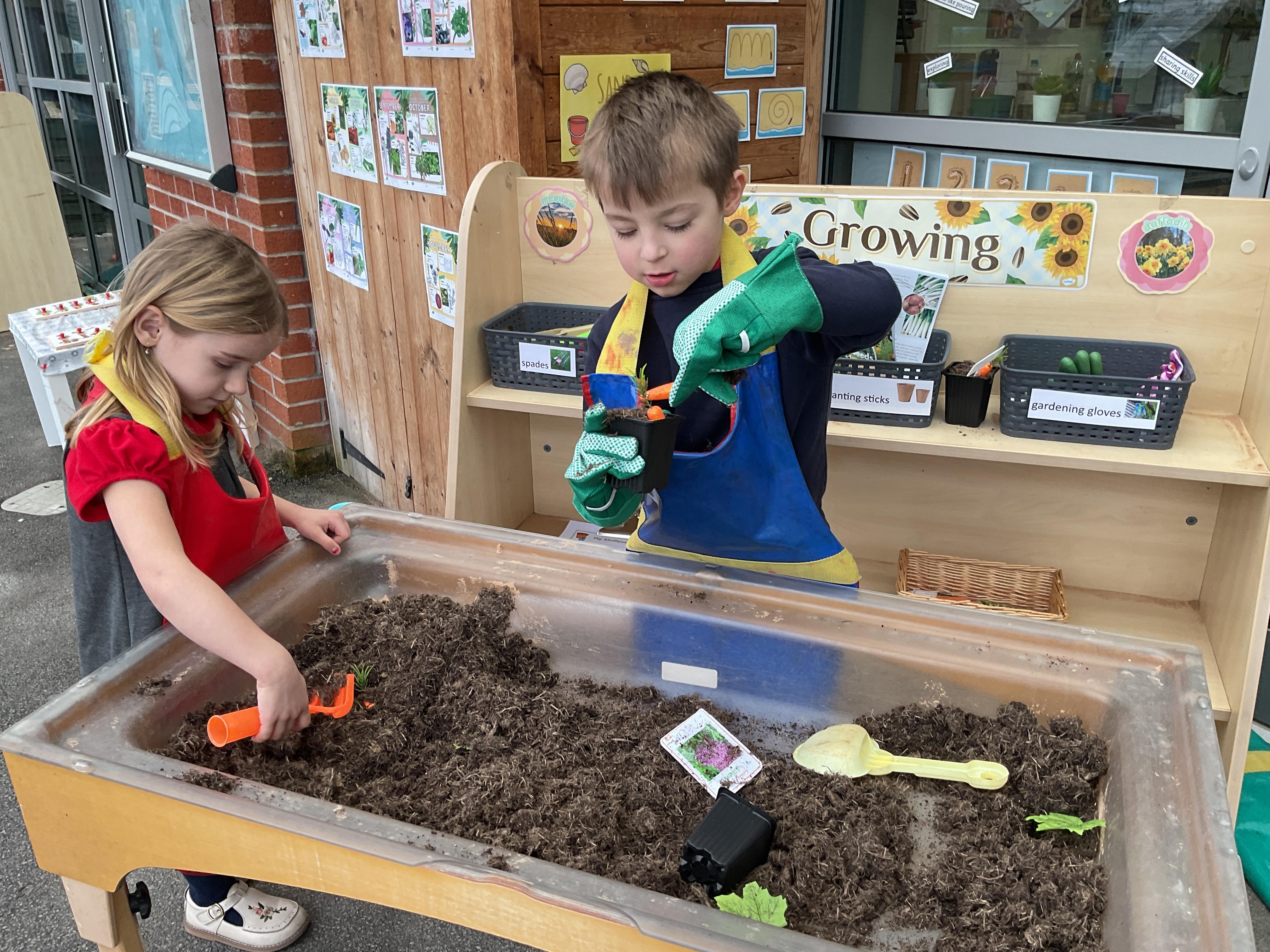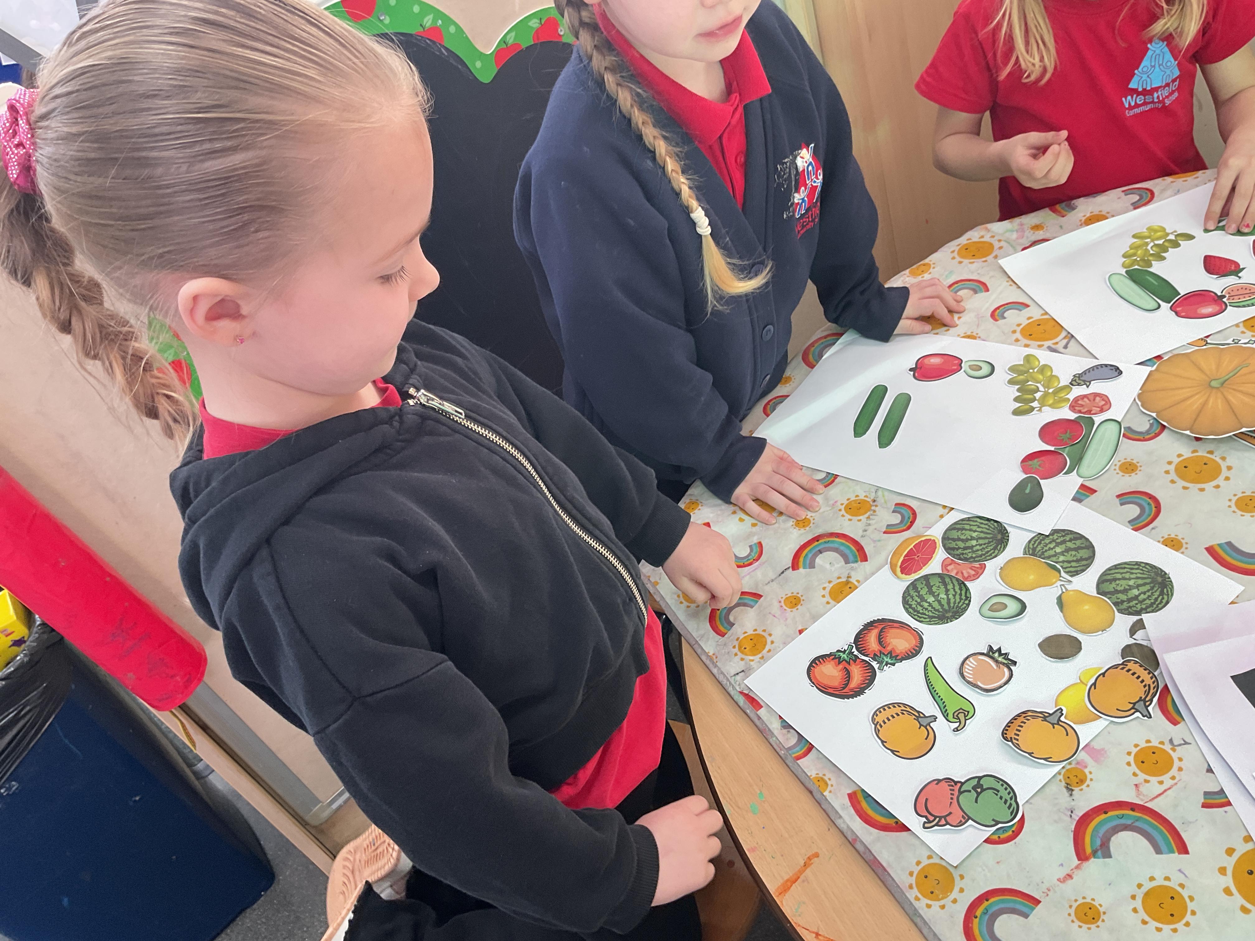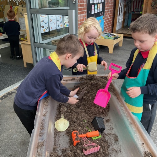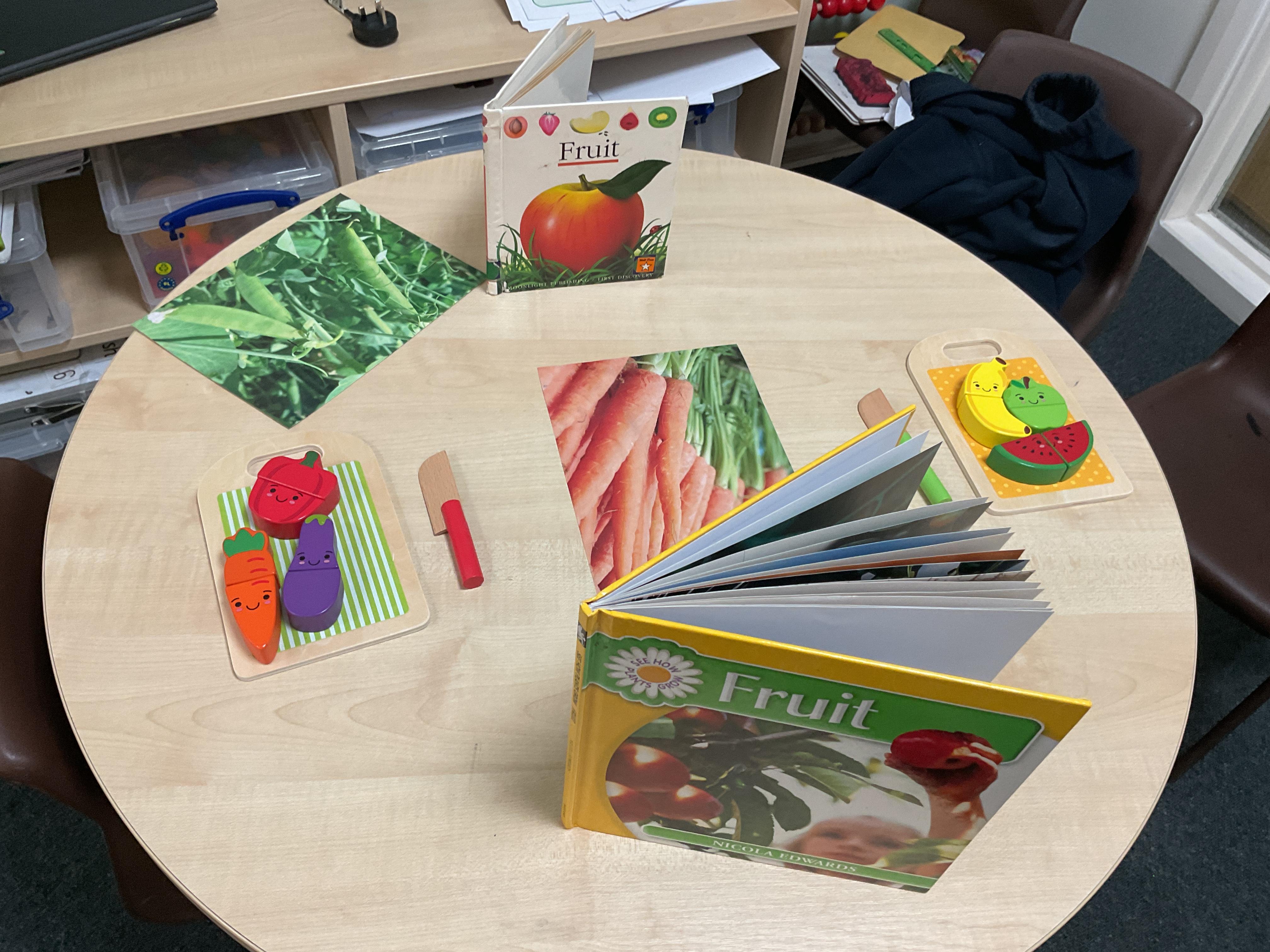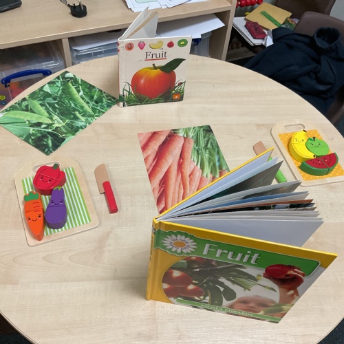 Where better to learn about fruit and vegetables than outside. This week we took our learning outside. We added soil, seeds, plant pots and other things into our sand tray. To say it has been a hit is an understatement. We have heard so many new words such as root, shoot, weeds, stem used by the children in their play ![]()