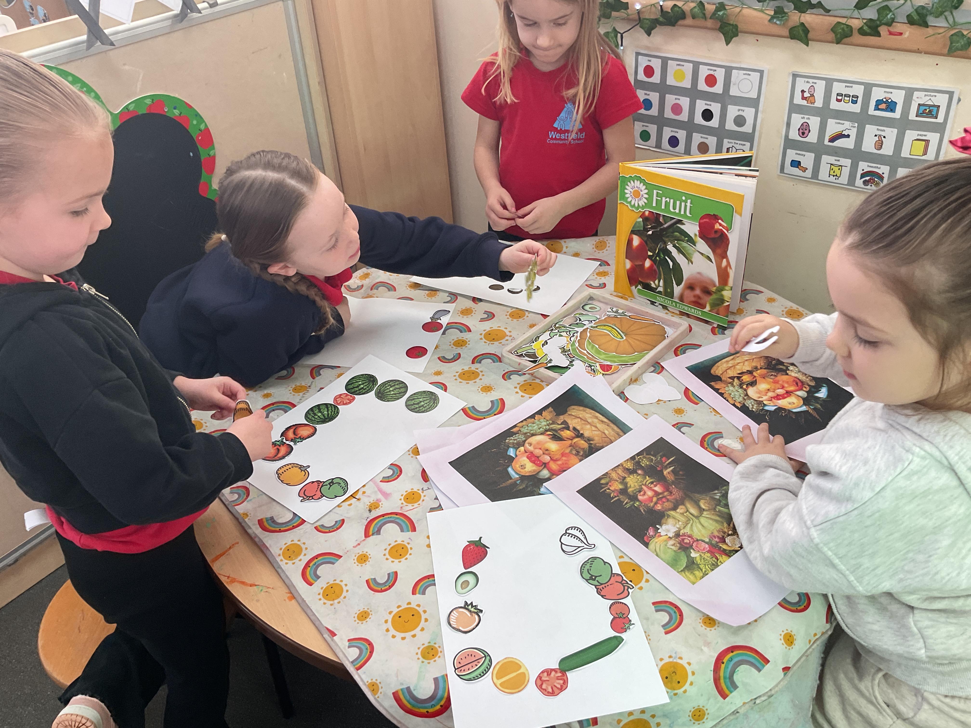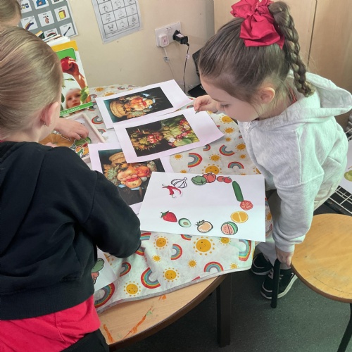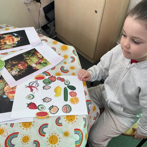 In our creative area this week we have been looking at the work of Guiseppe Arcimboldo - an artist who created portraits using fruit and vegetable images. We re-created our own versions of this. Look at the wonderful work we produced ![]()