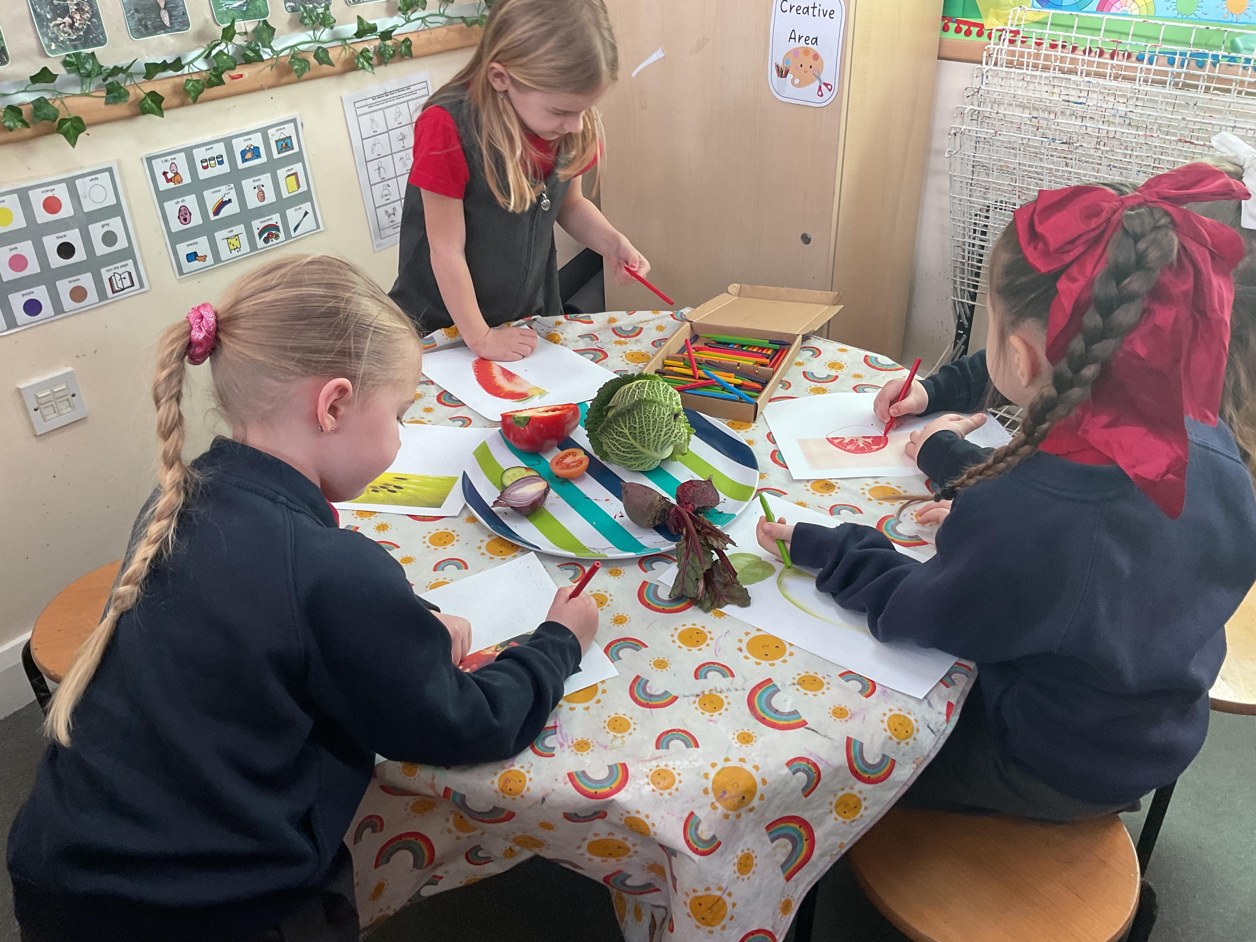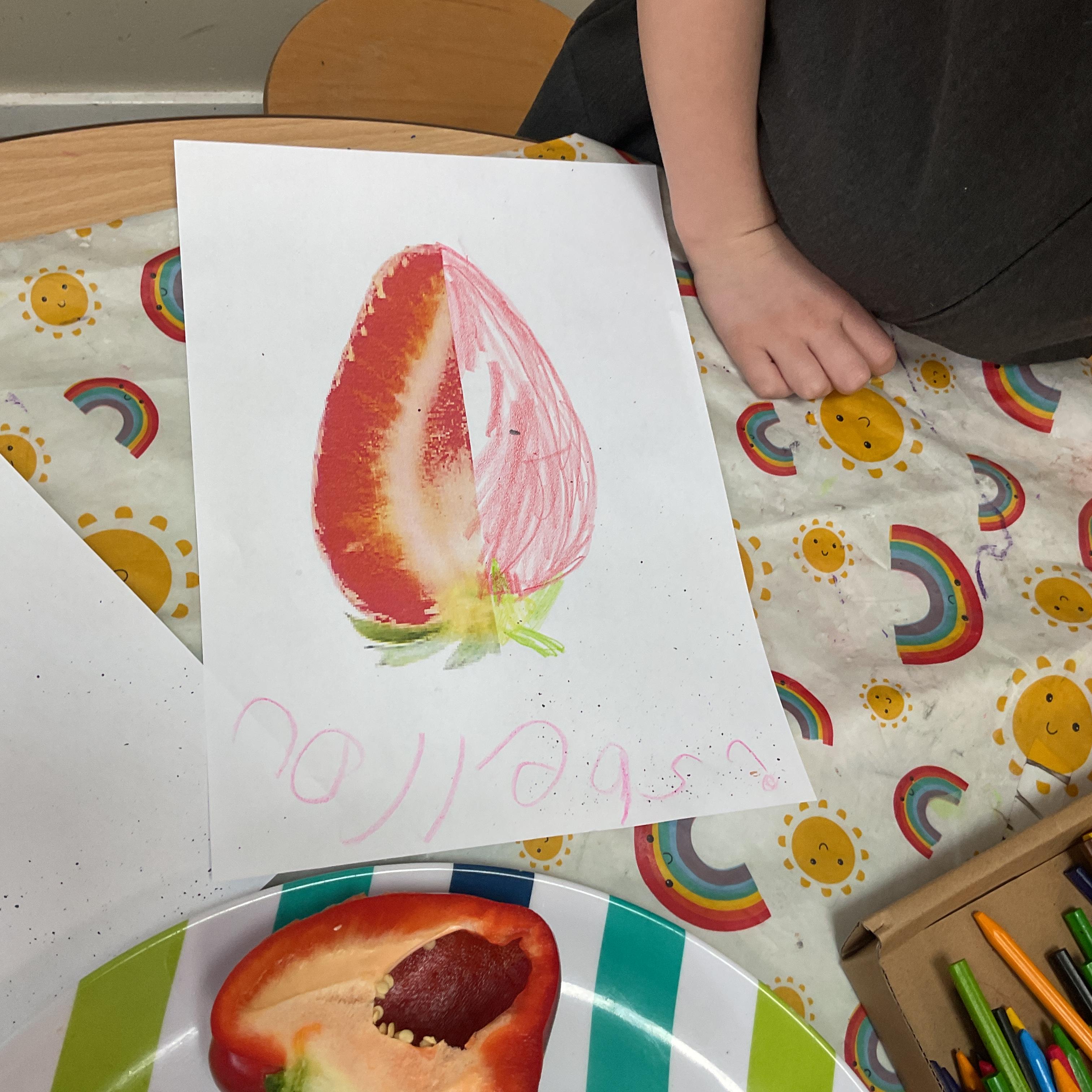 We also created half images of fruit and vegetables. We studied the colours, shape and inside of different fruit and vegetables and then created a symmetrical picture. Great attention to detail. Well done ![]()