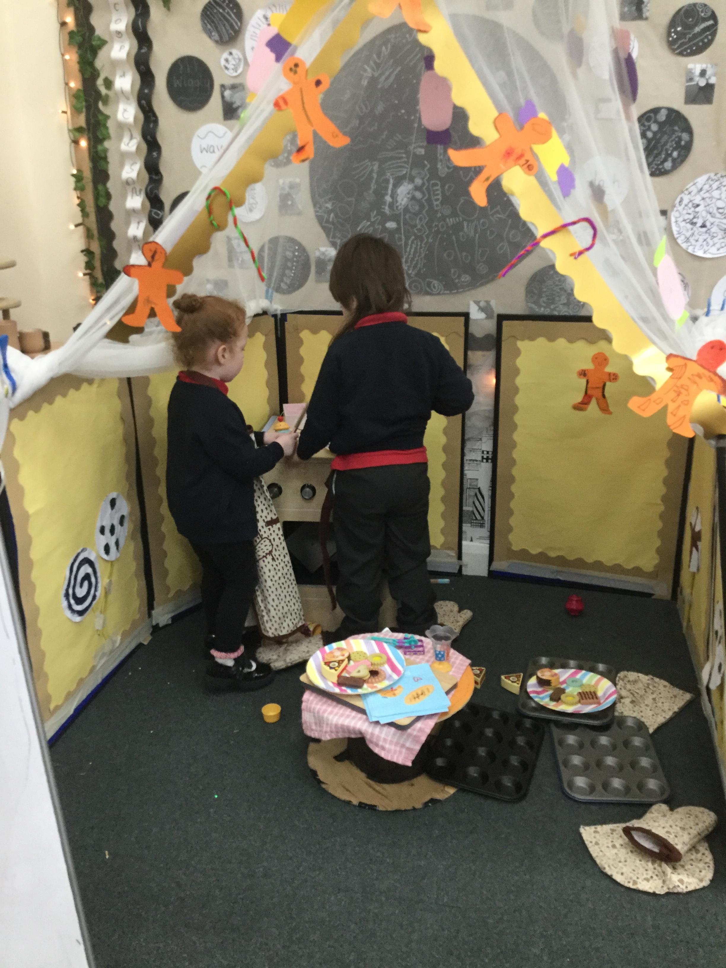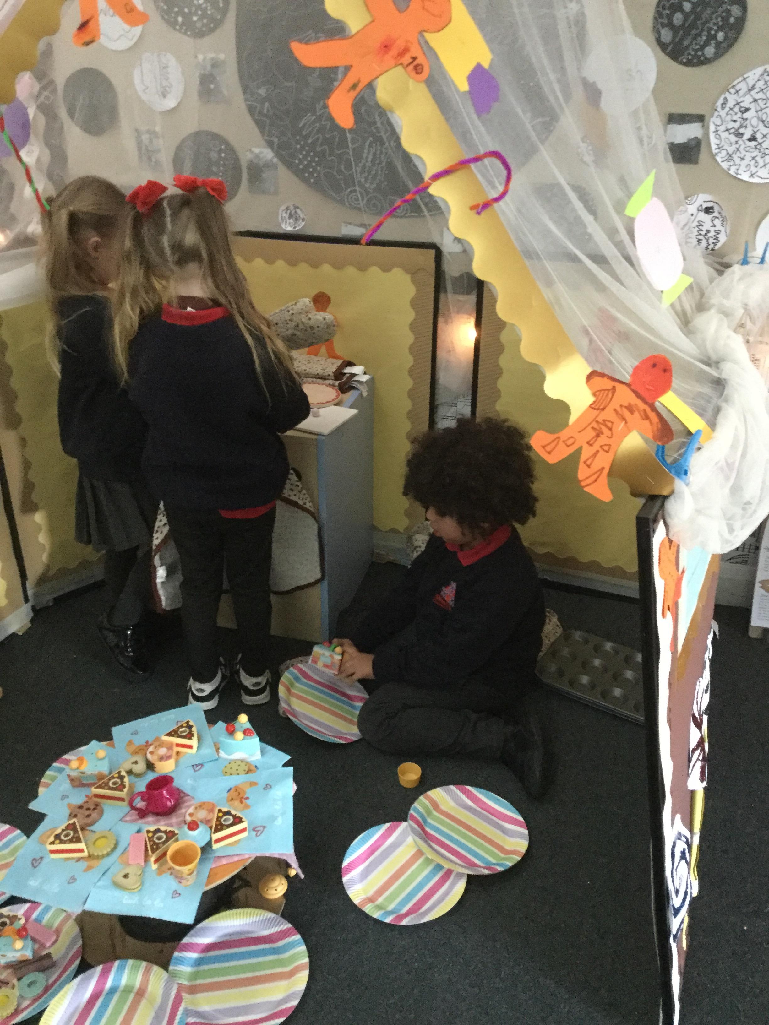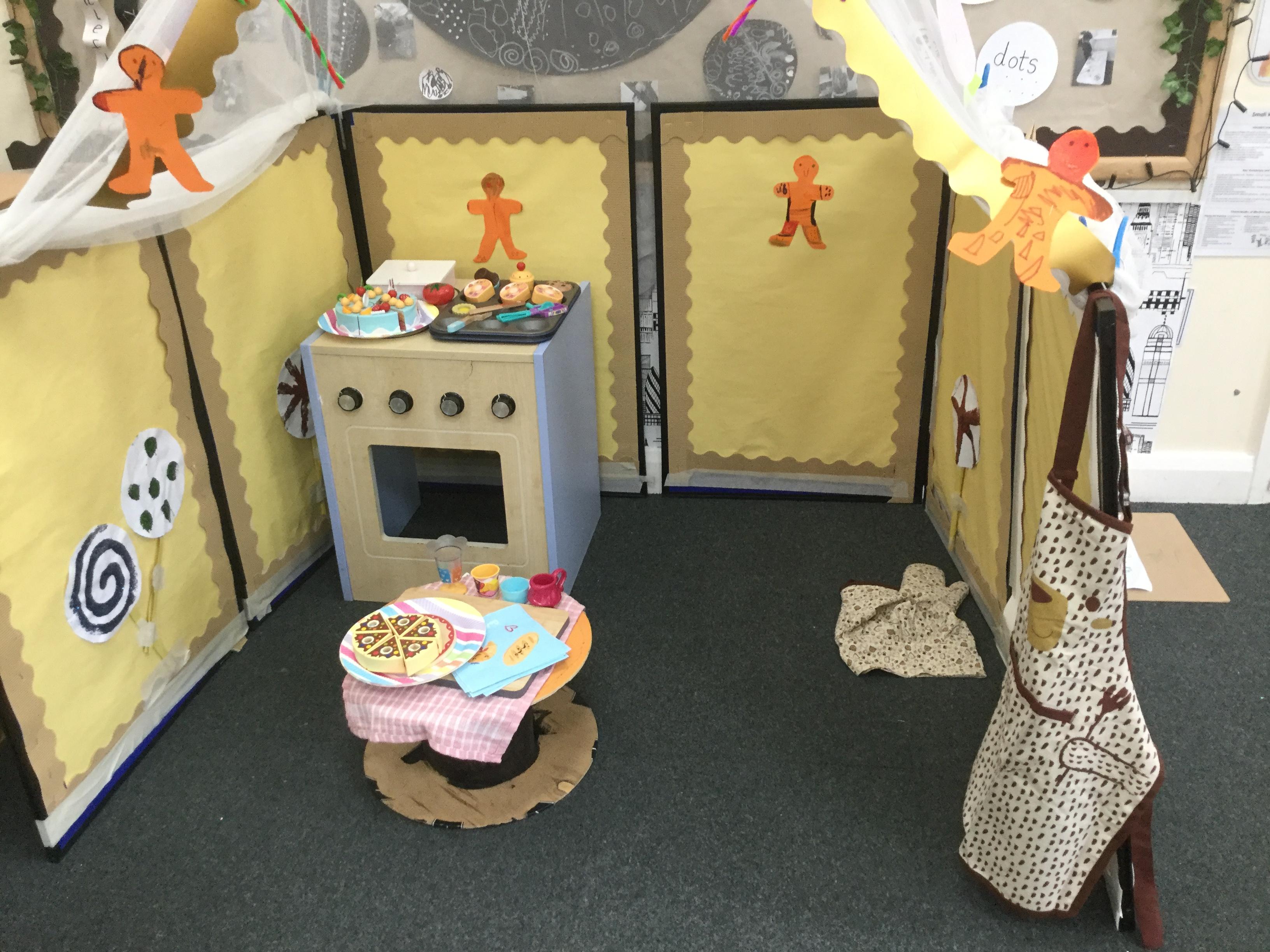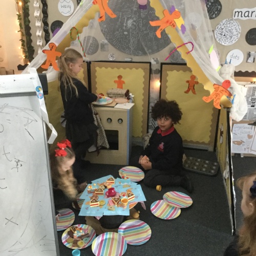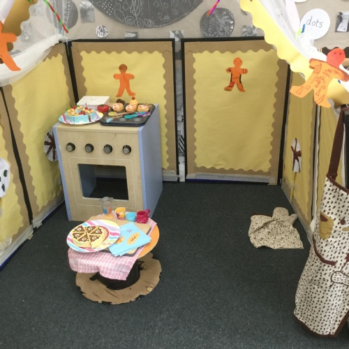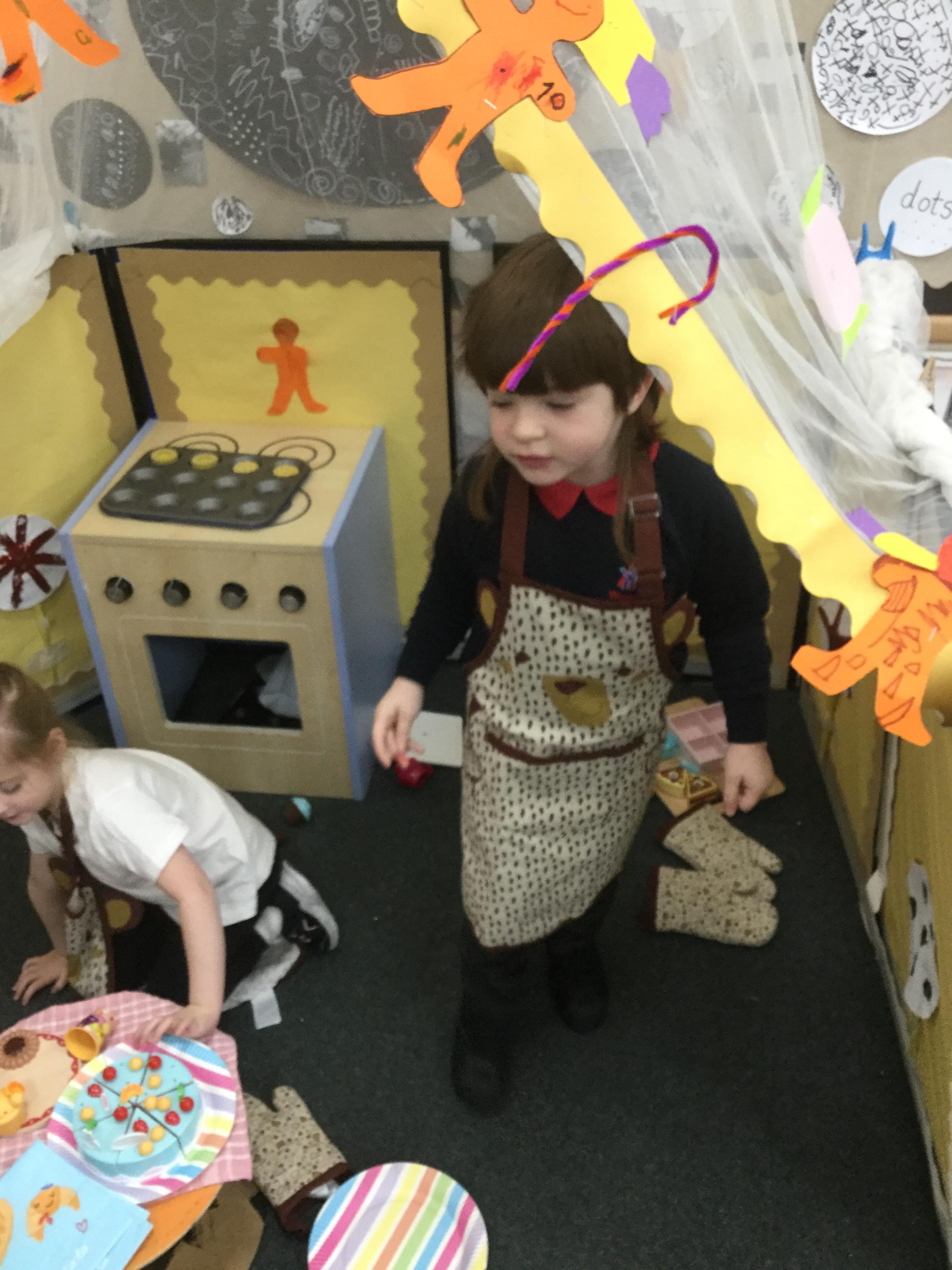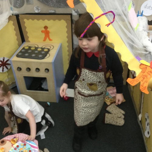 We have also really enjoyed retelling the story in our new role play area. We have created the bakery from the story and this has been the perfect back drop for us to develop our story telling skills. Here we are in action baking gingerbread men ![]()