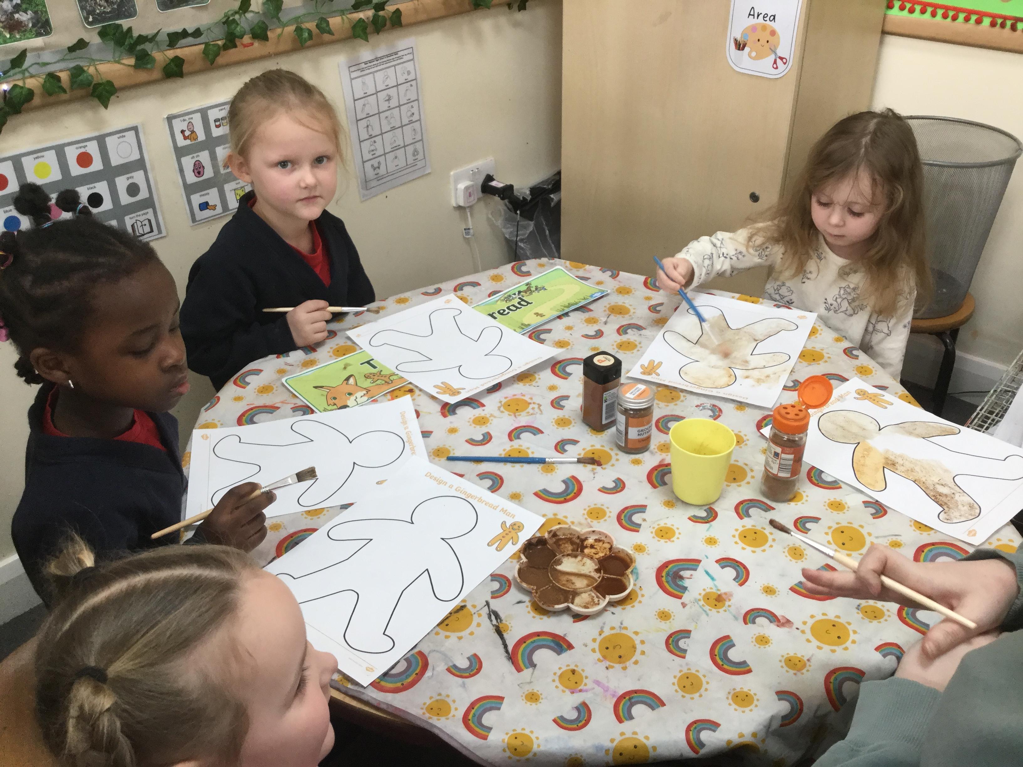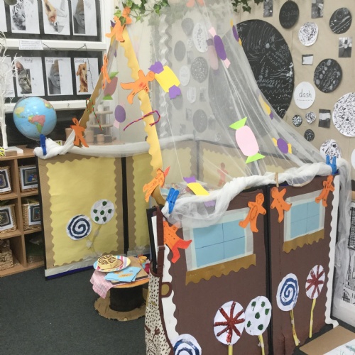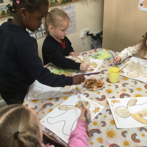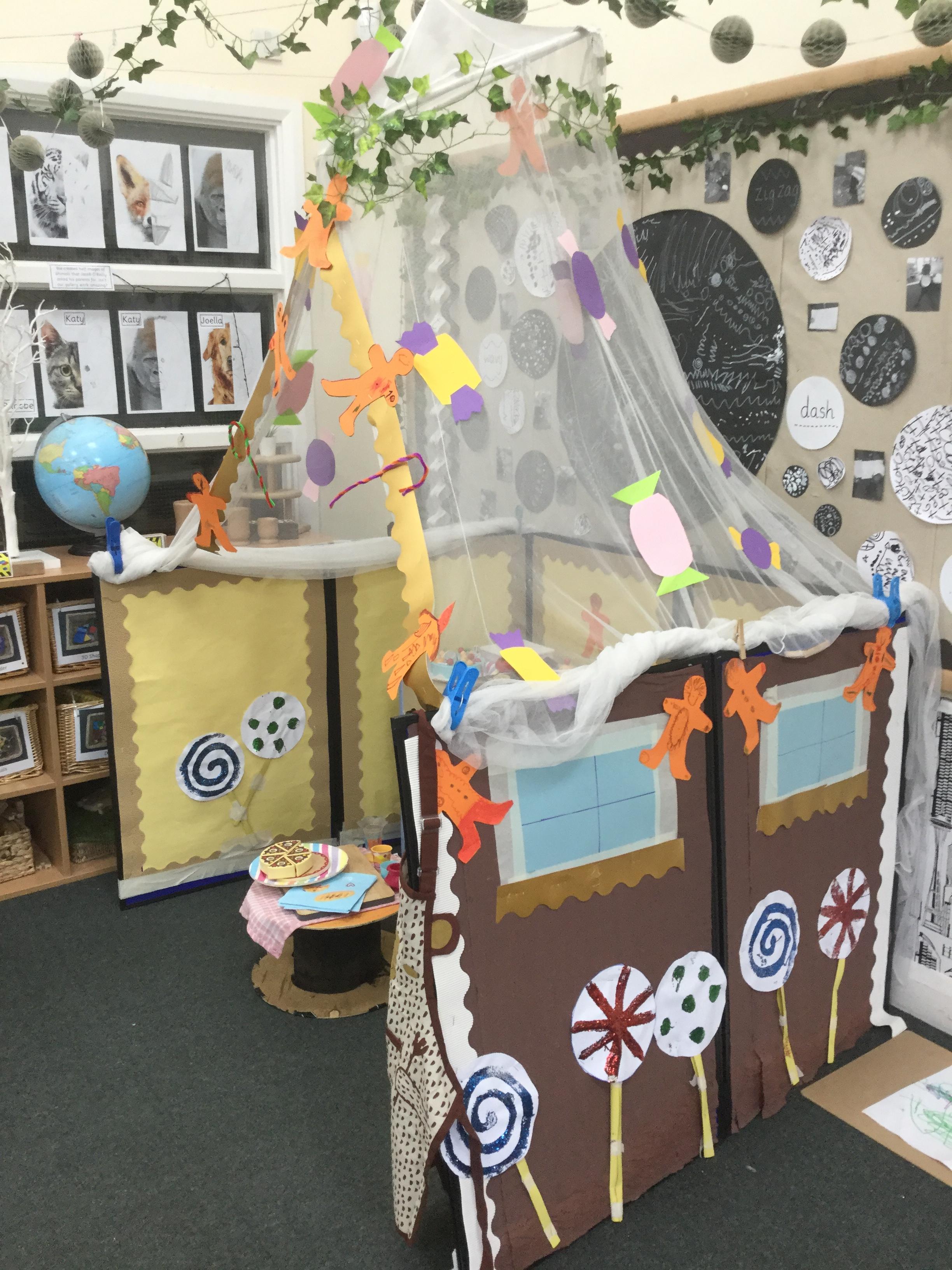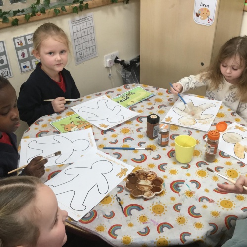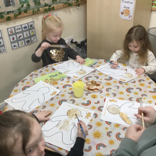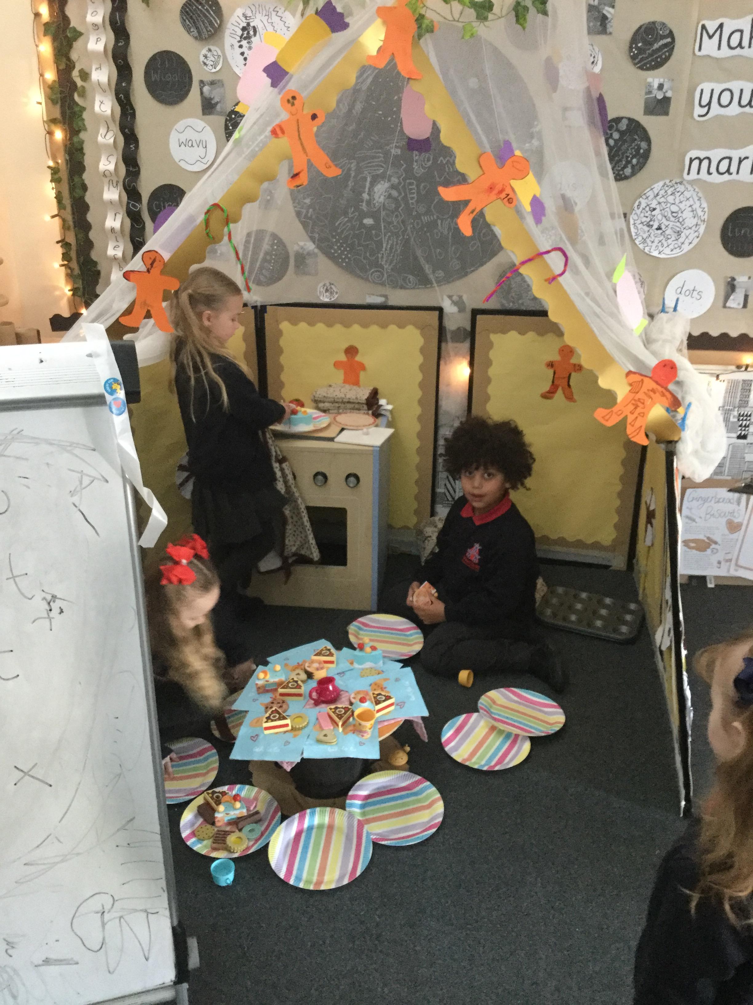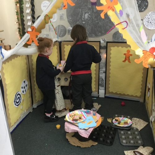 We have also really enjoyed retelling the story in our new role play area. We have created the bakery from the story and this has been the perfect back drop for us to develop our story telling skills. Here we are in action baking gingerbread men ![]()