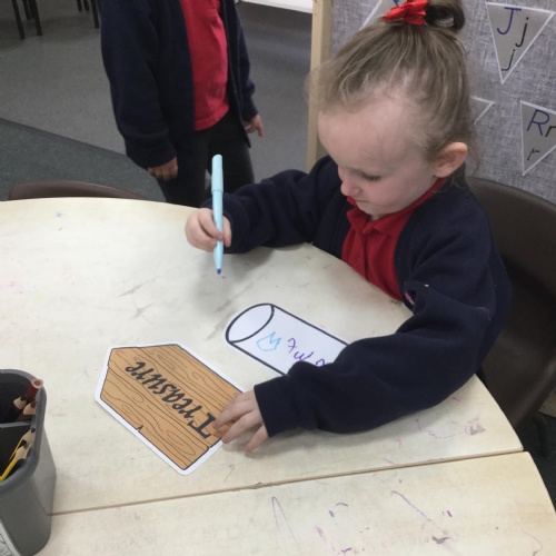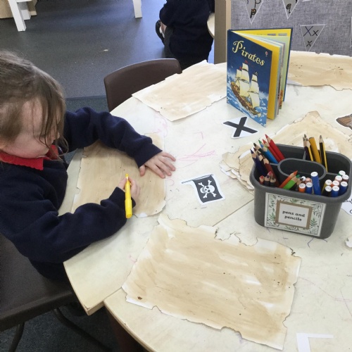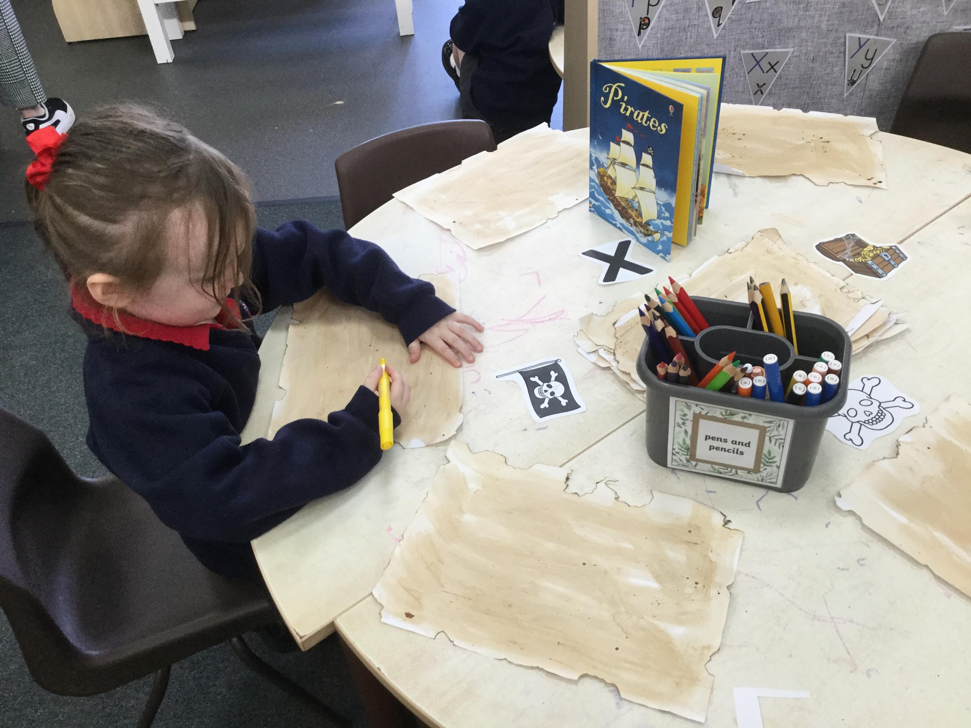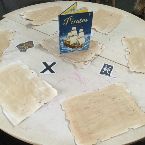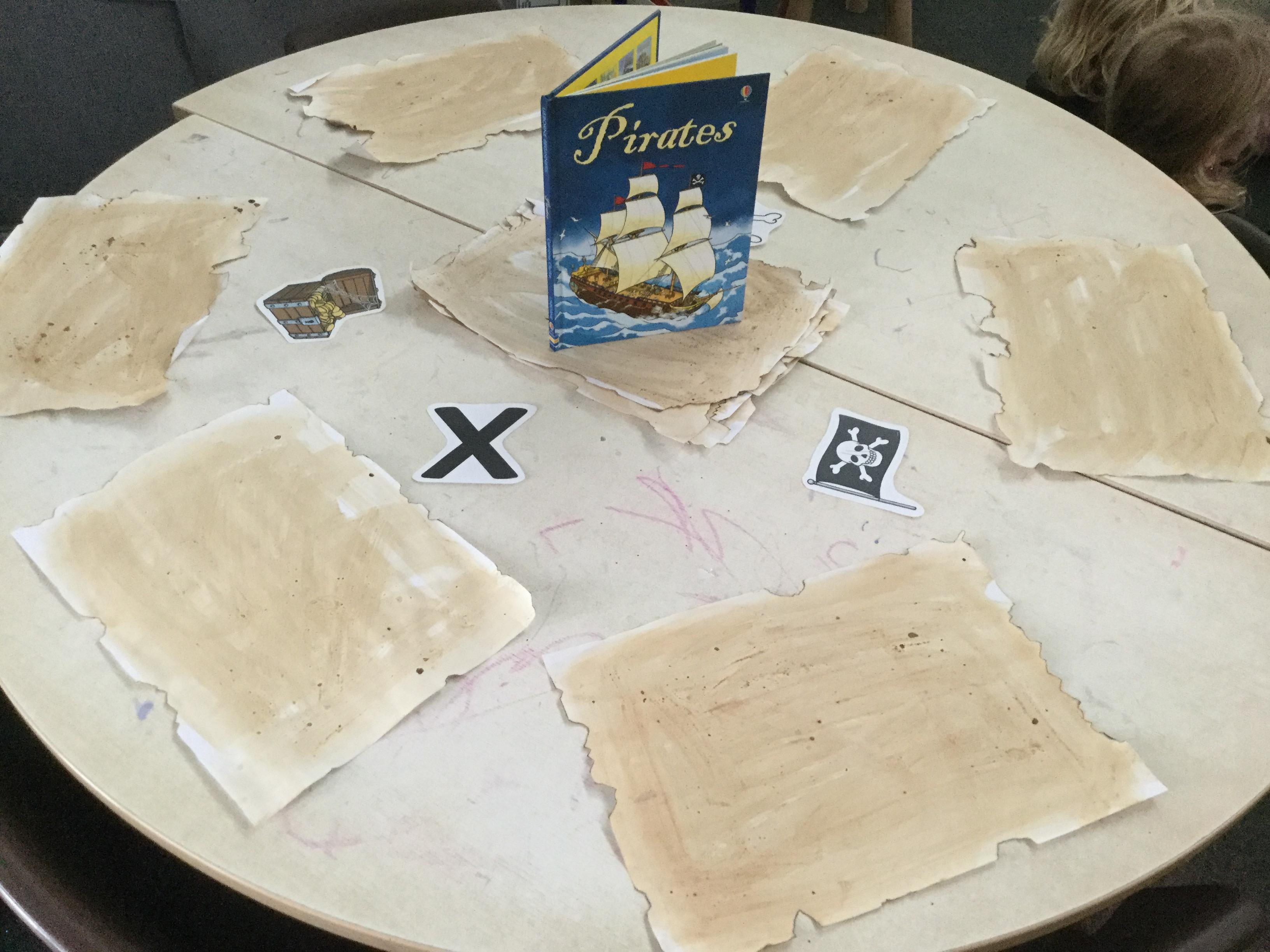 We have also been busy in the writing area in class. We created our very own pirate treasure map on weathered paper just like Pirate Jed used in the story.