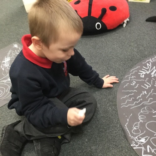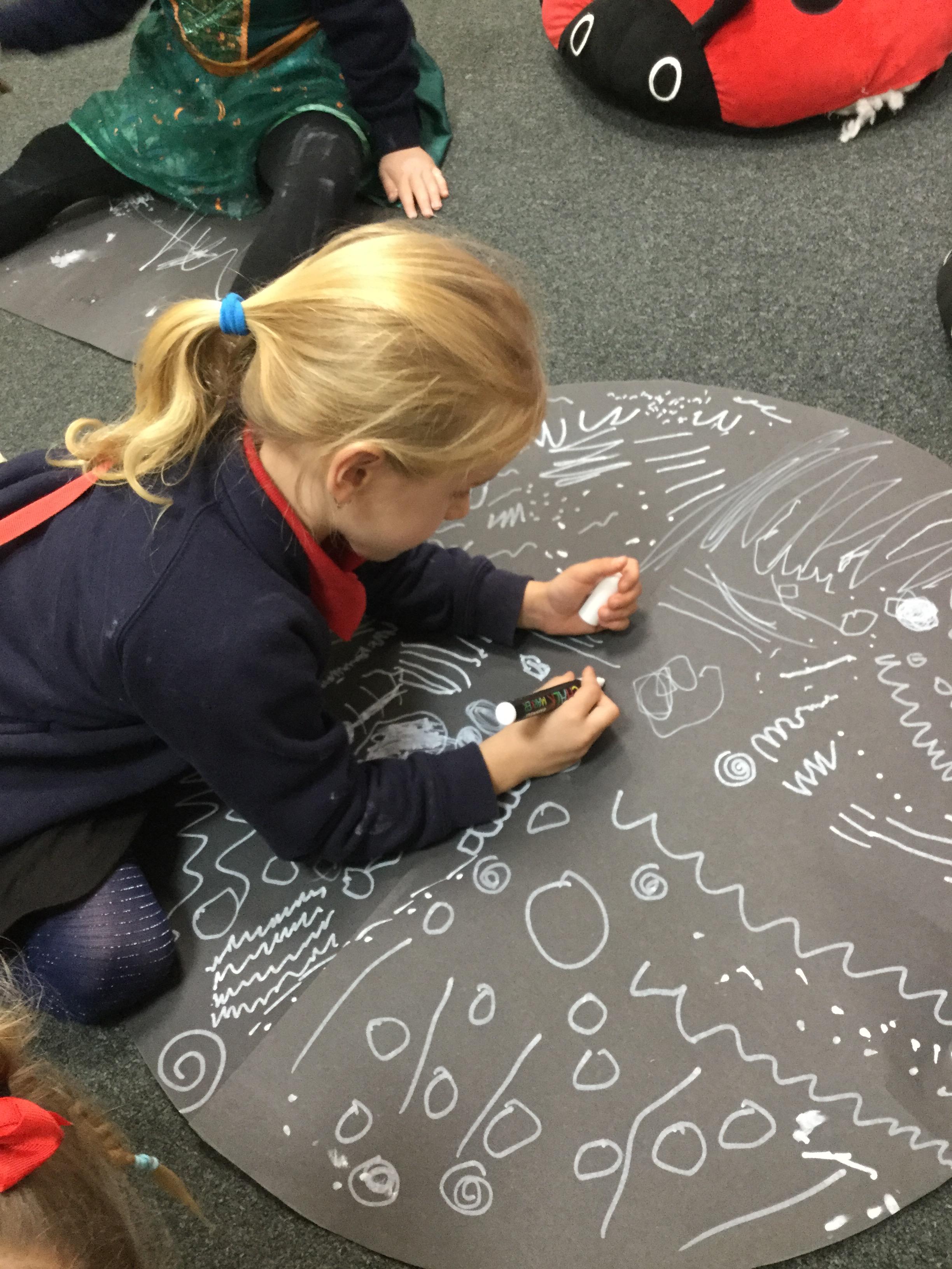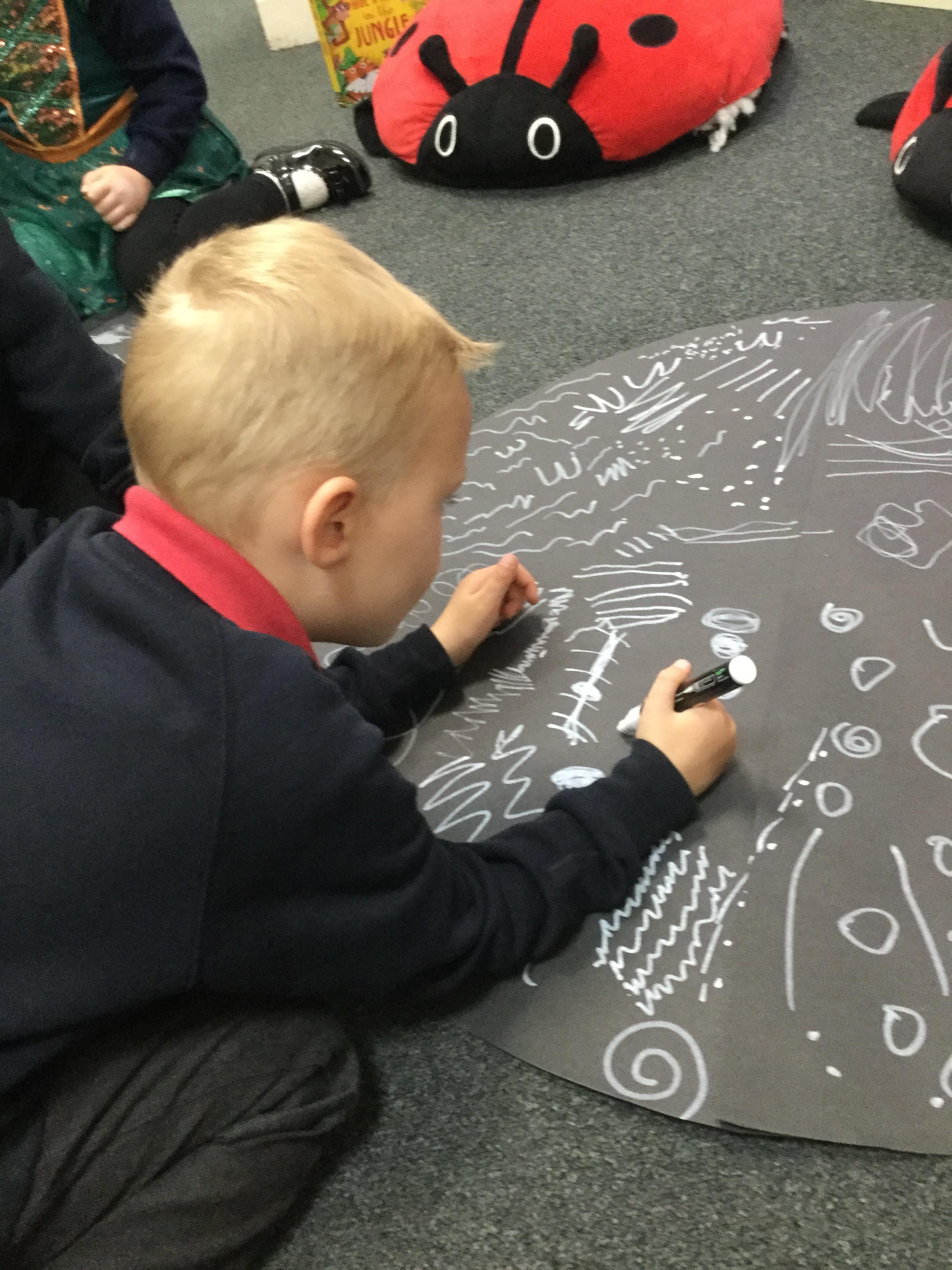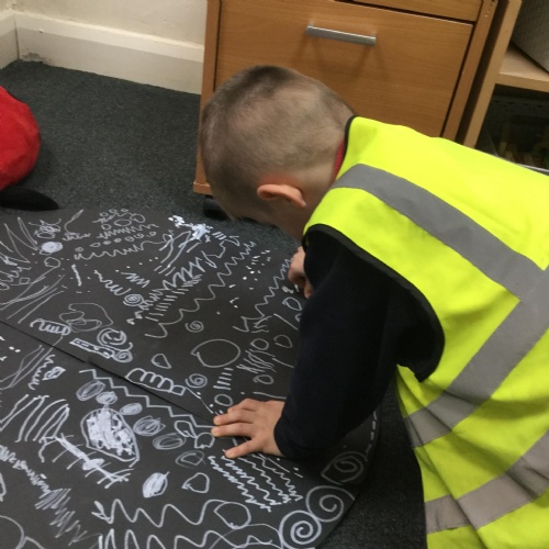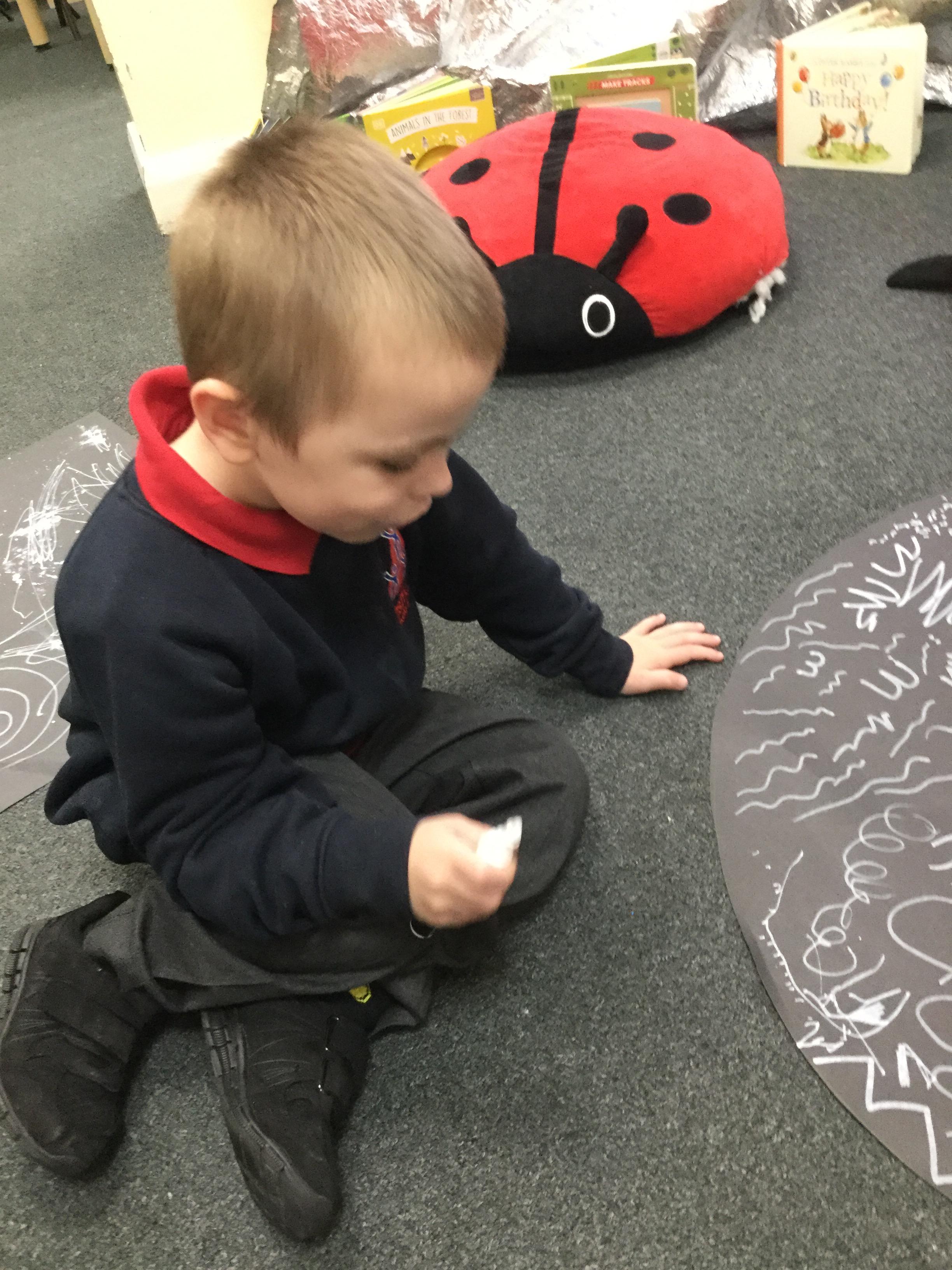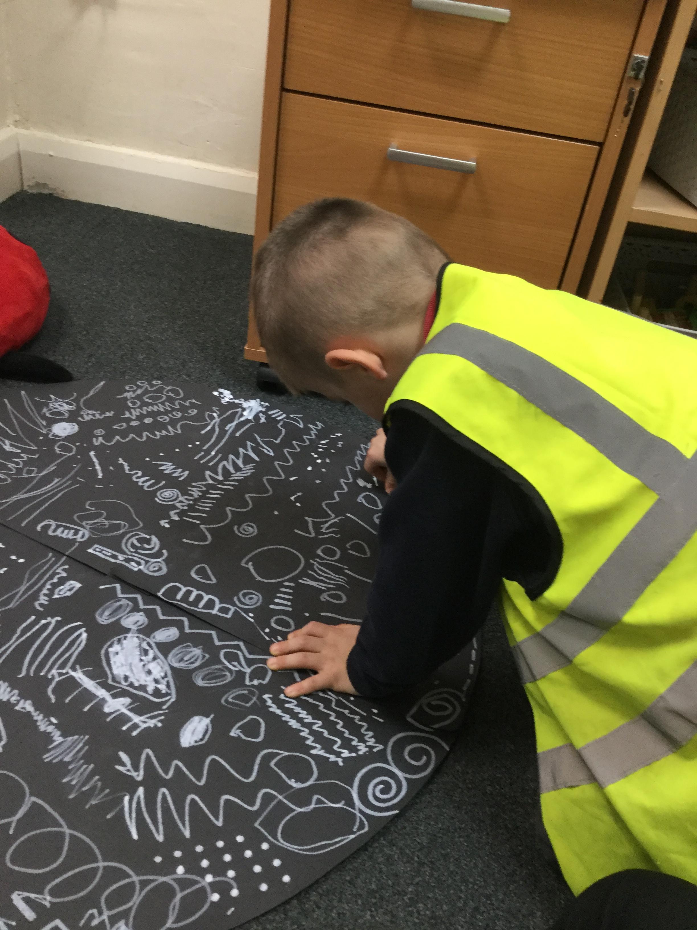 We have also been exploring patterns and have realised that patterns are all around us - on our socks, shoes and in the classroom. Here we are exploring mark making on a large scale to help us develop our muscle tone. We really enjoyed this and talked for ages about the different patterns and contrast of colours.