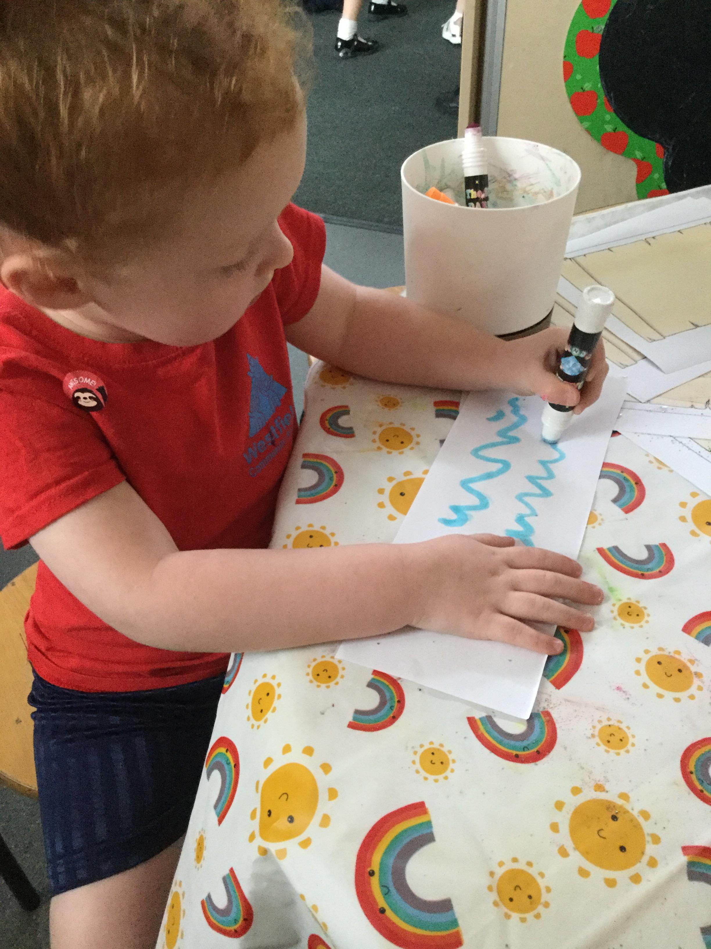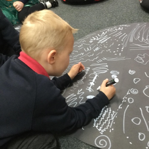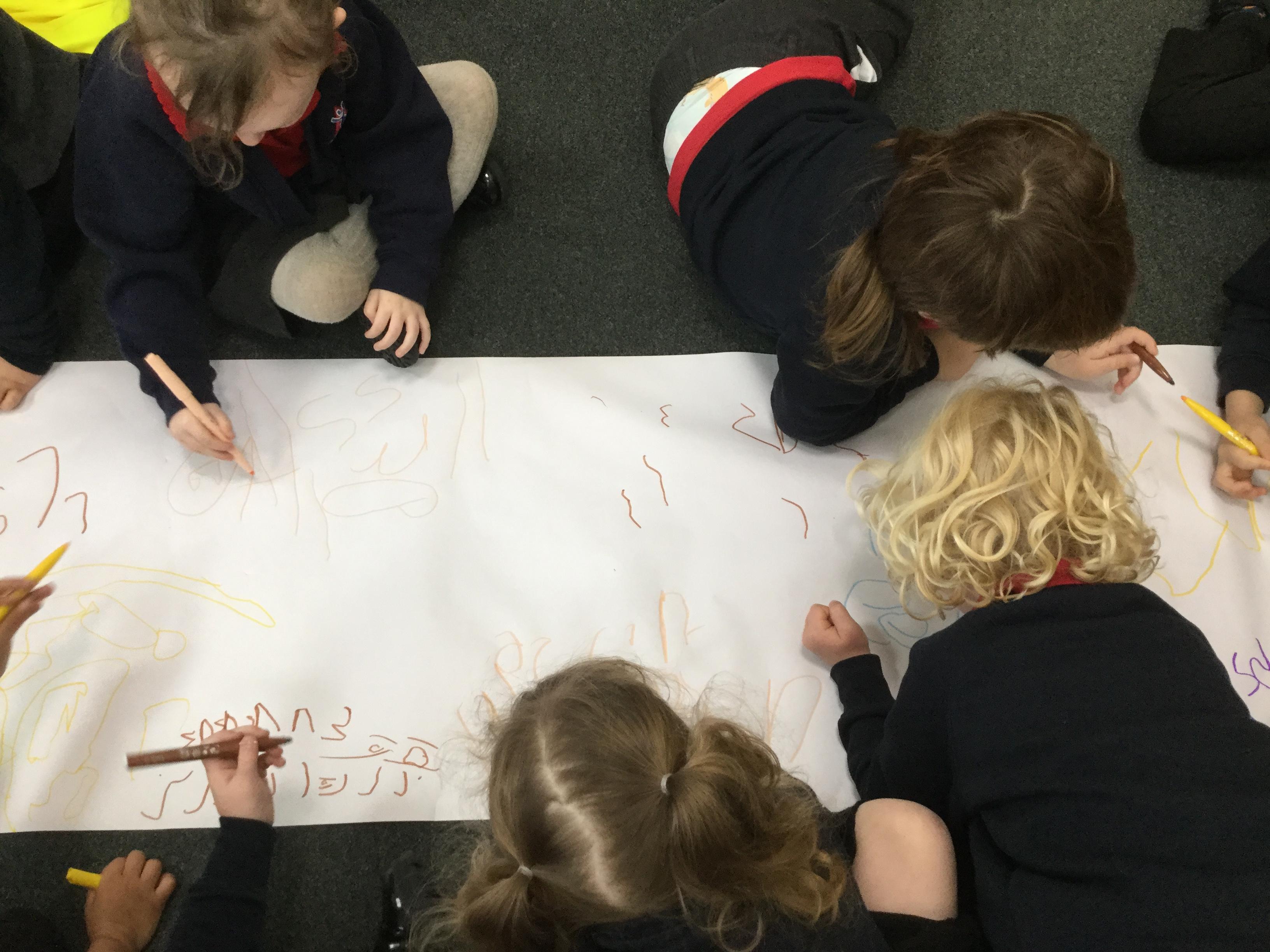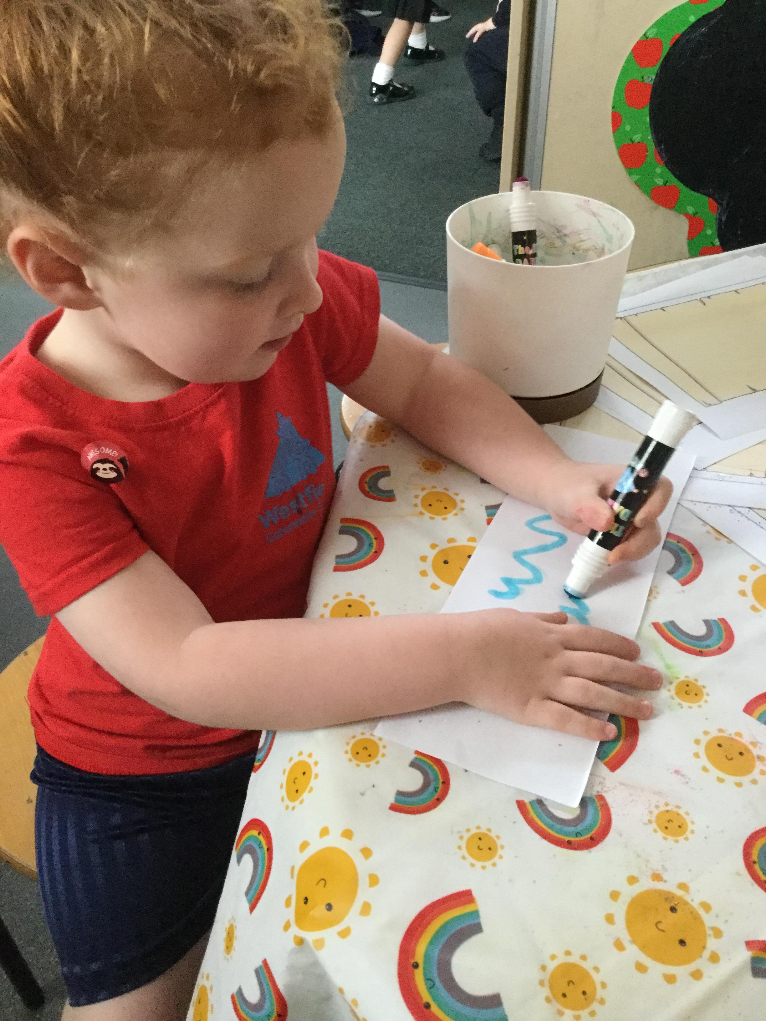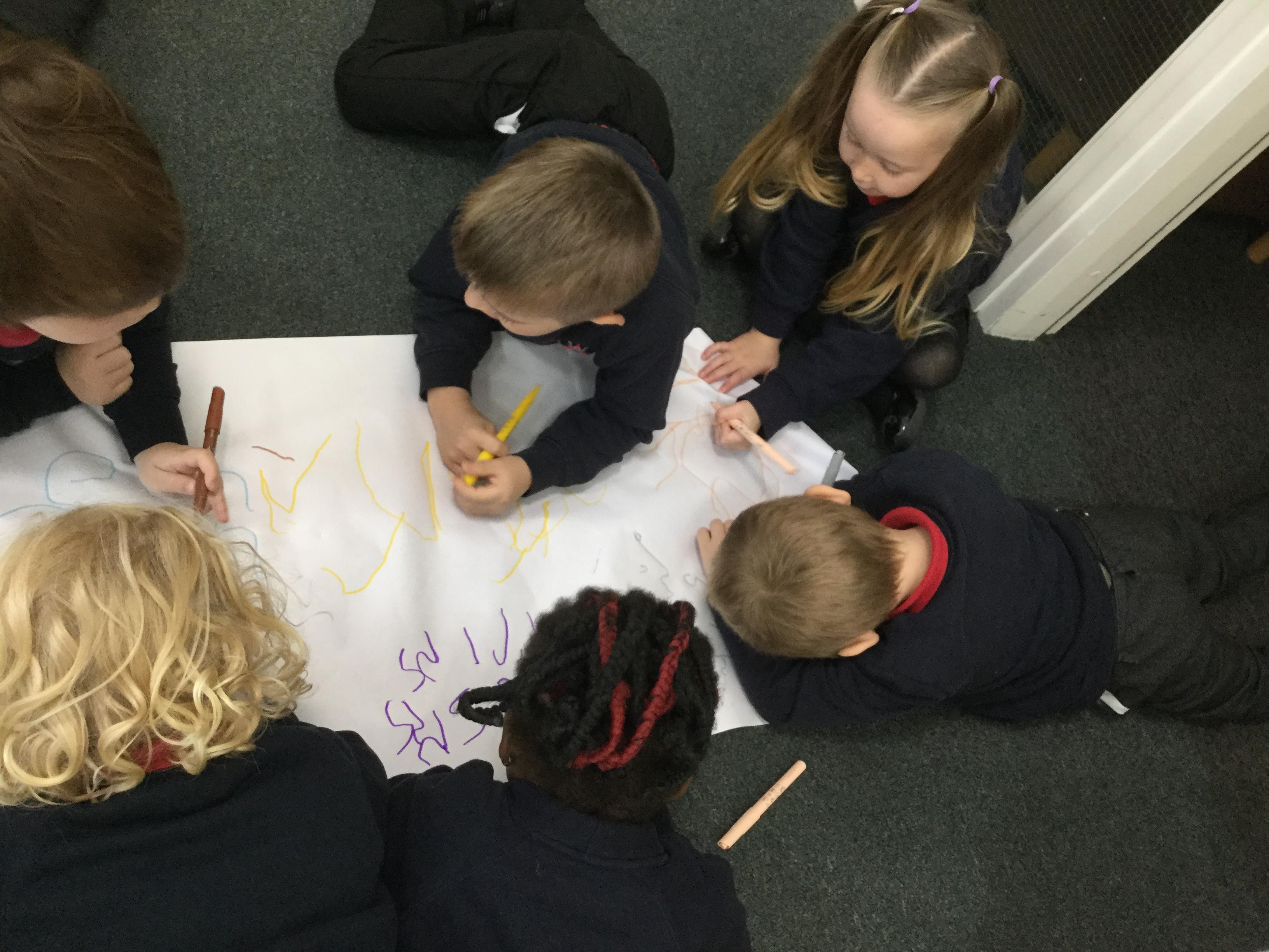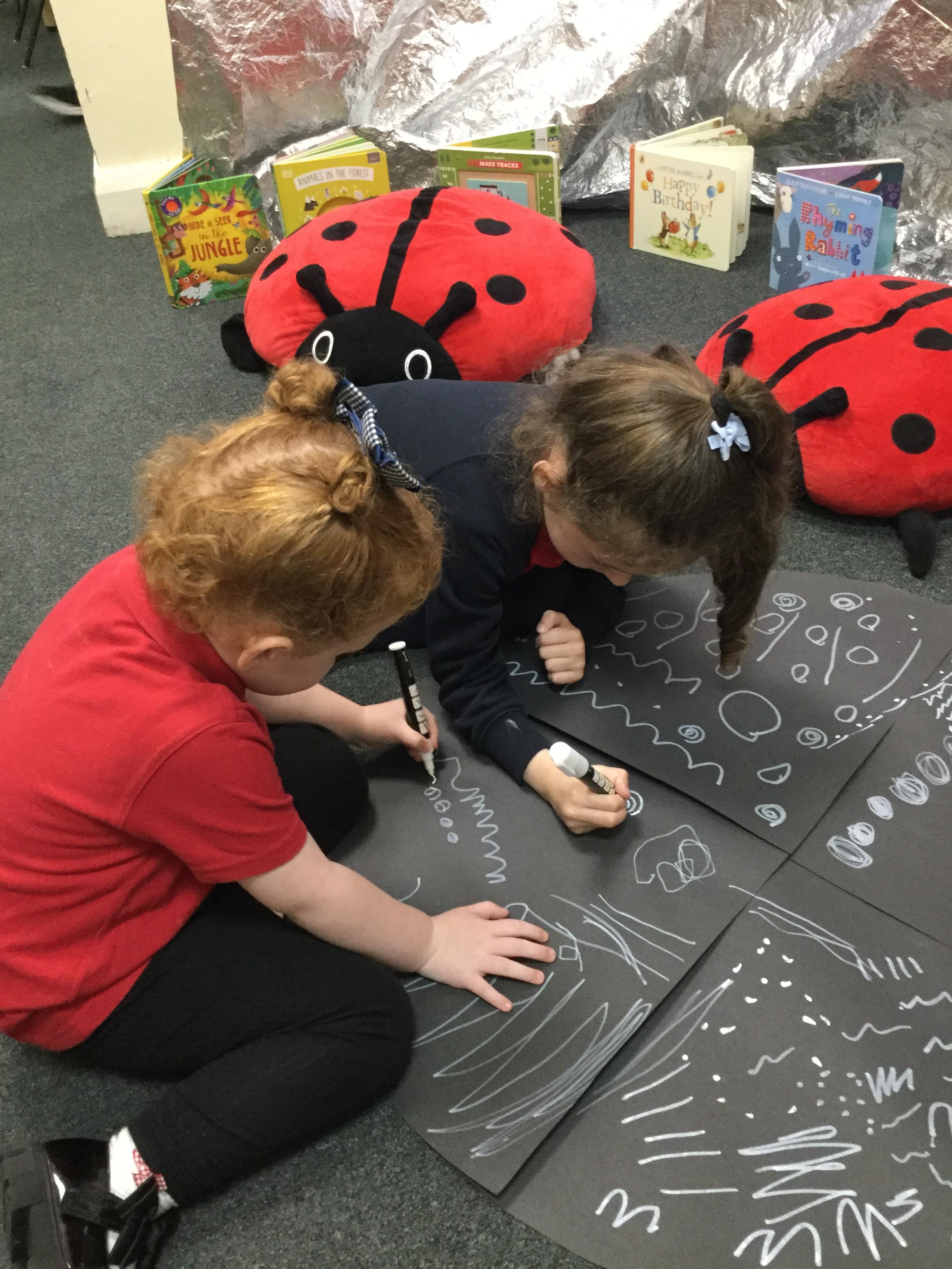 We have also been exploring patterns and have realised that patterns are all around us - on our socks, shoes and in the classroom. Here we are exploring mark making on a large scale to help us develop our muscle tone. We really enjoyed this and talked for ages about the different patterns and contrast of colours.