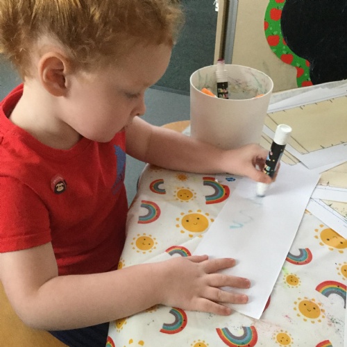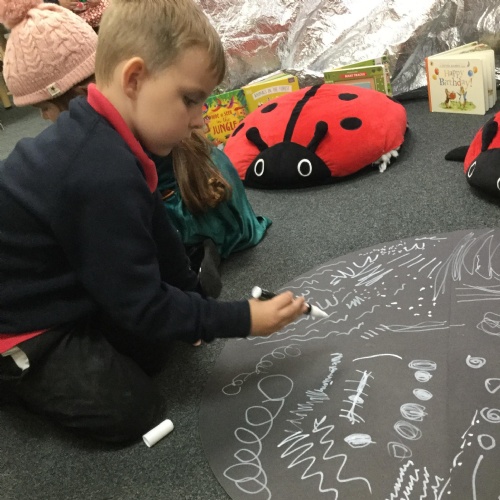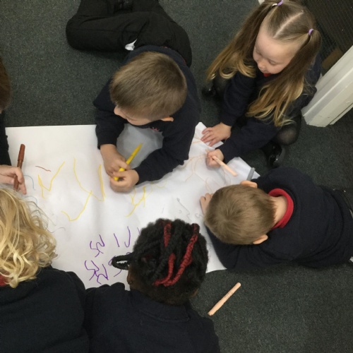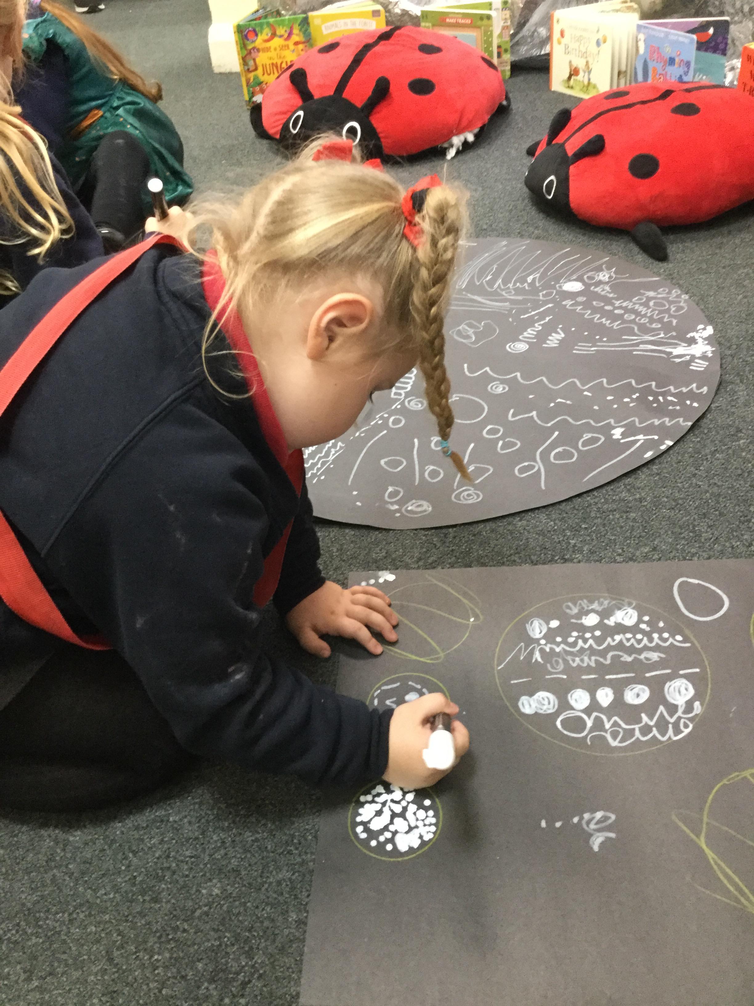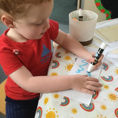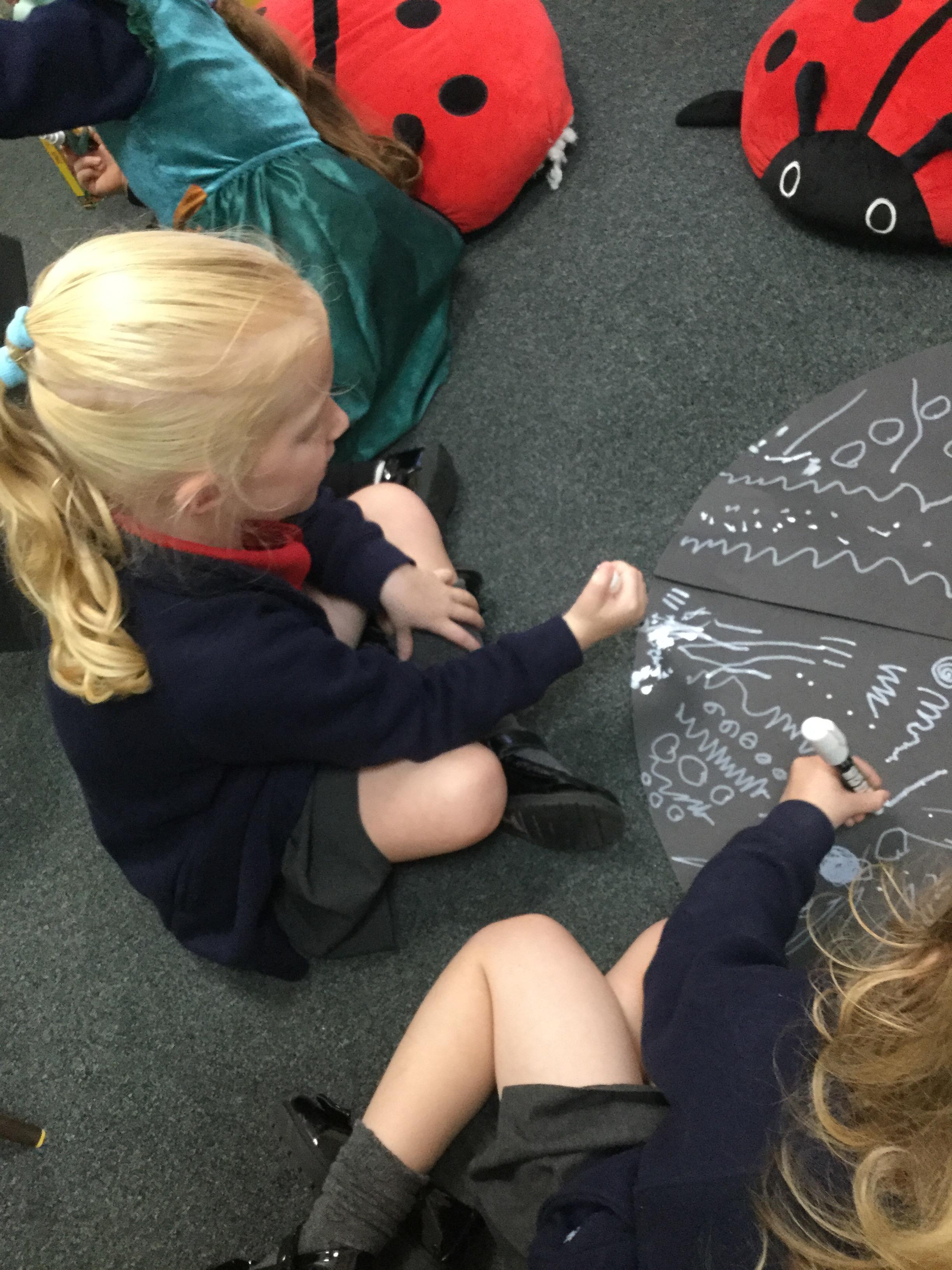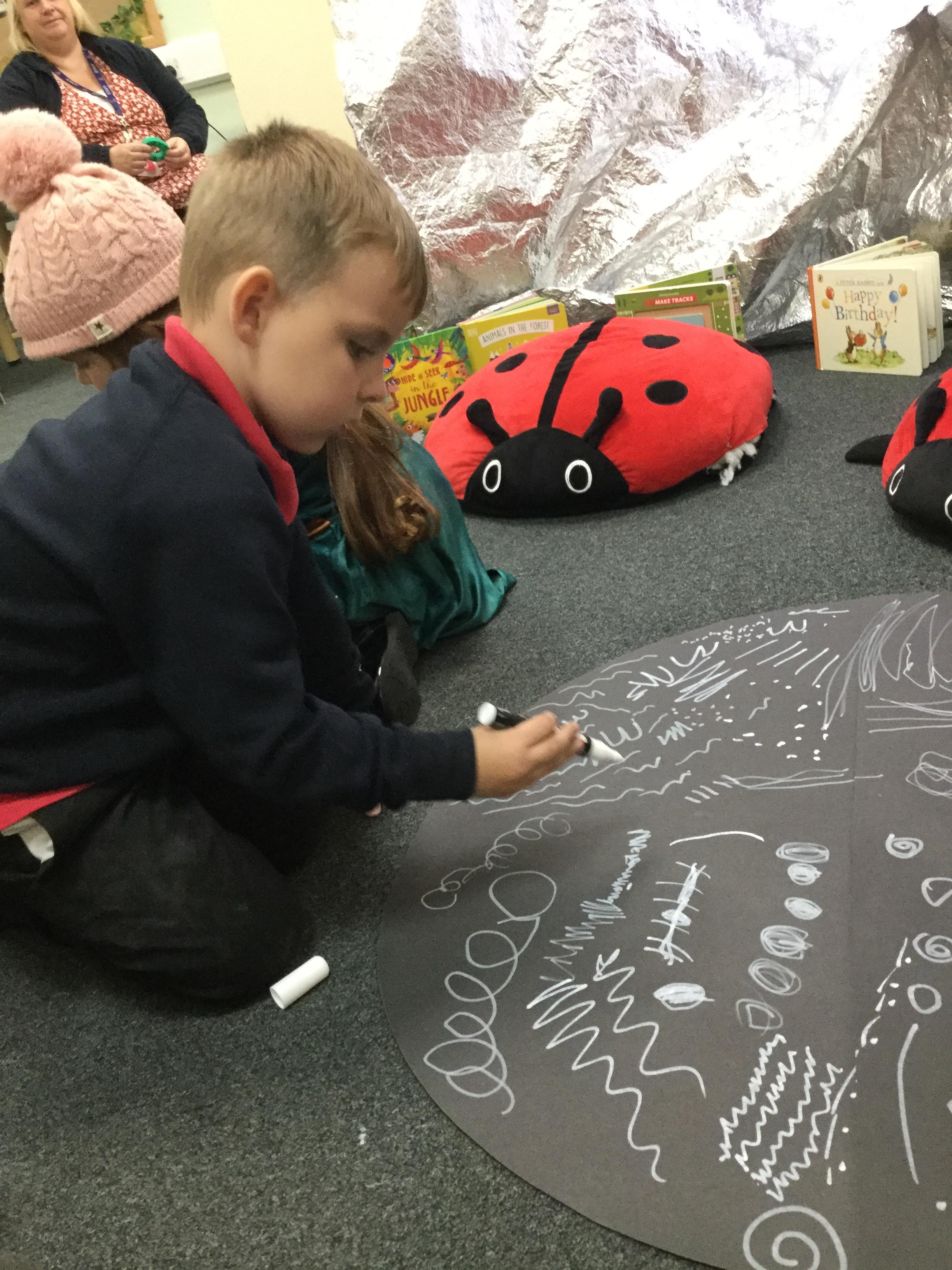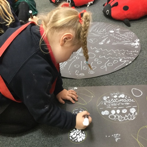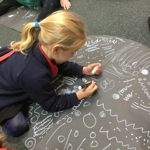 We have also been exploring patterns and have realised that patterns are all around us - on our socks, shoes and in the classroom. Here we are exploring mark making on a large scale to help us develop our muscle tone. We really enjoyed this and talked for ages about the different patterns and contrast of colours.