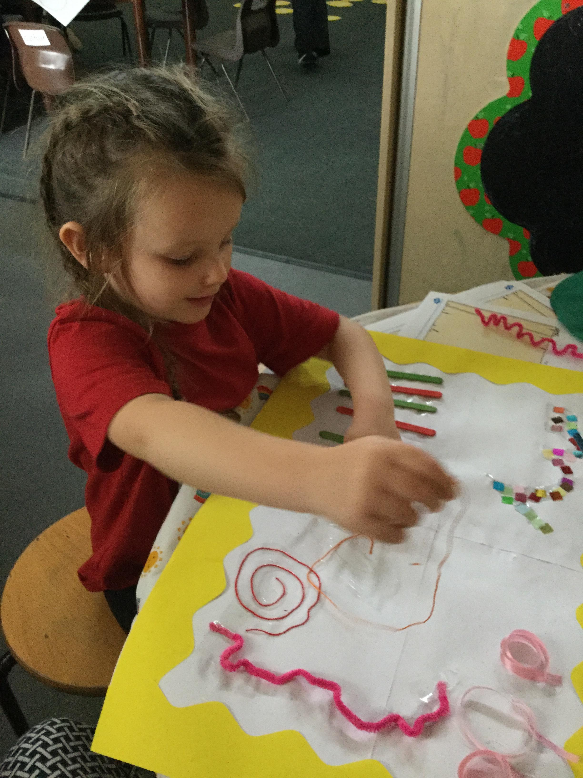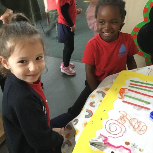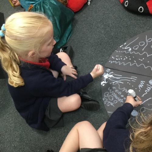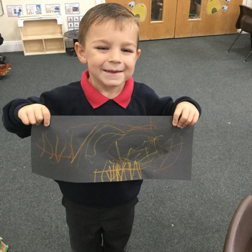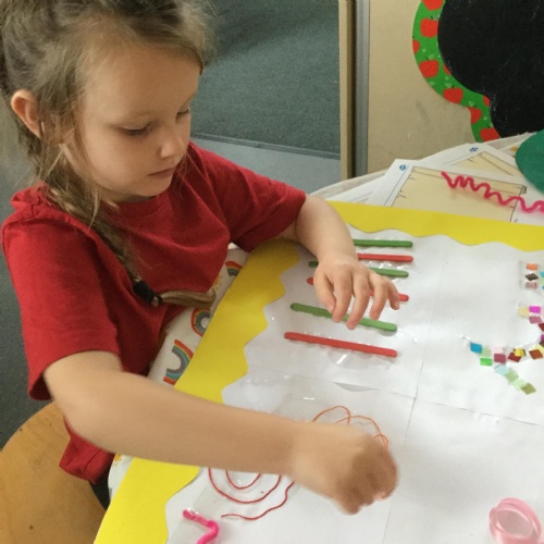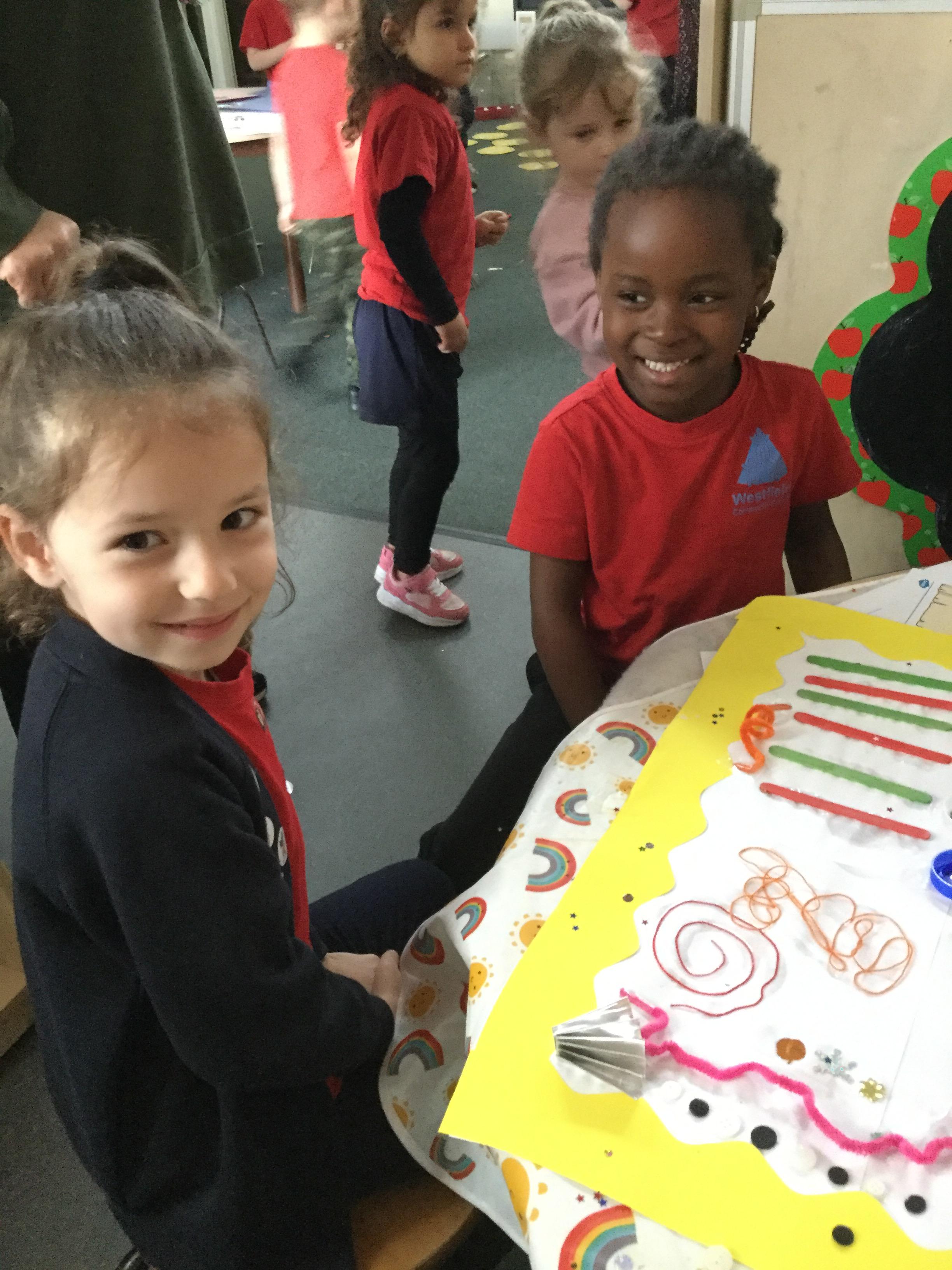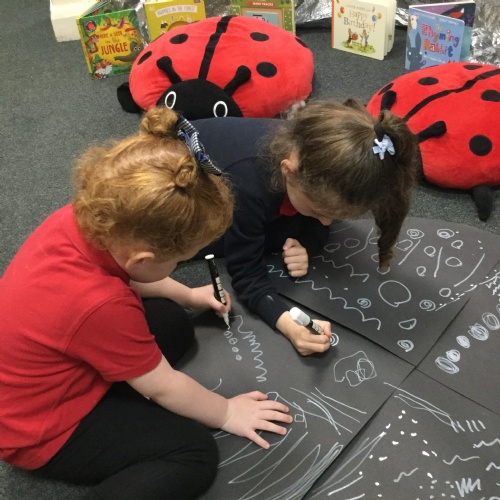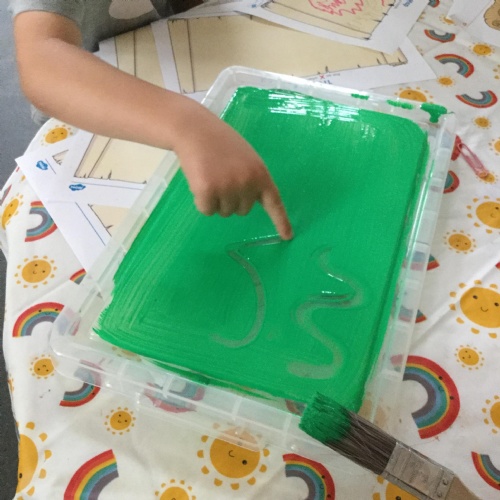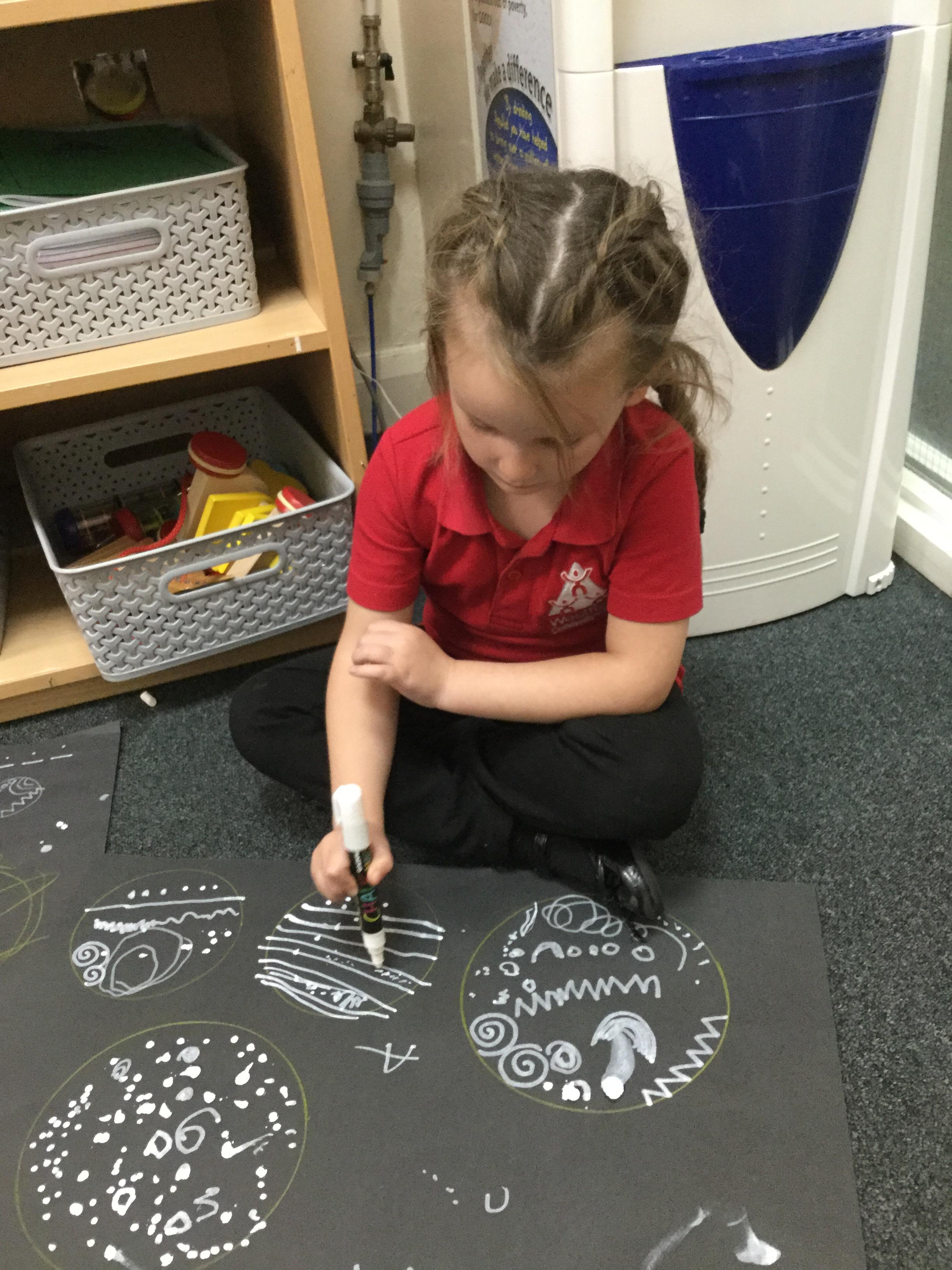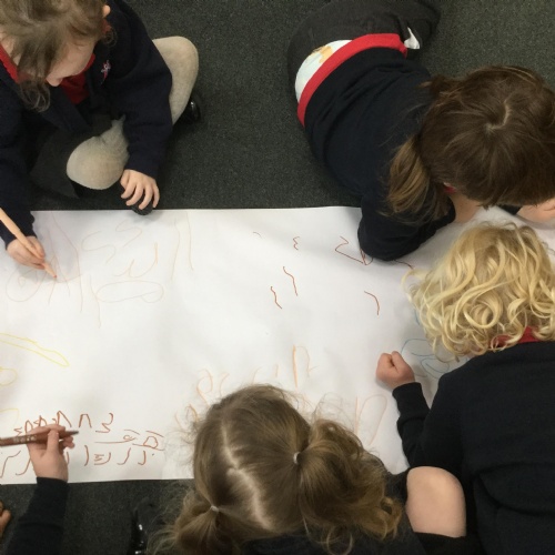 We have also been exploring patterns and have realised that patterns are all around us - on our socks, shoes and in the classroom. Here we are exploring mark making on a large scale to help us develop our muscle tone. We really enjoyed this and talked for ages about the different patterns and contrast of colours.