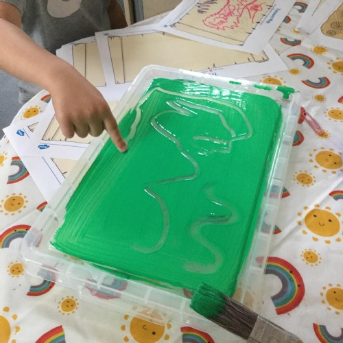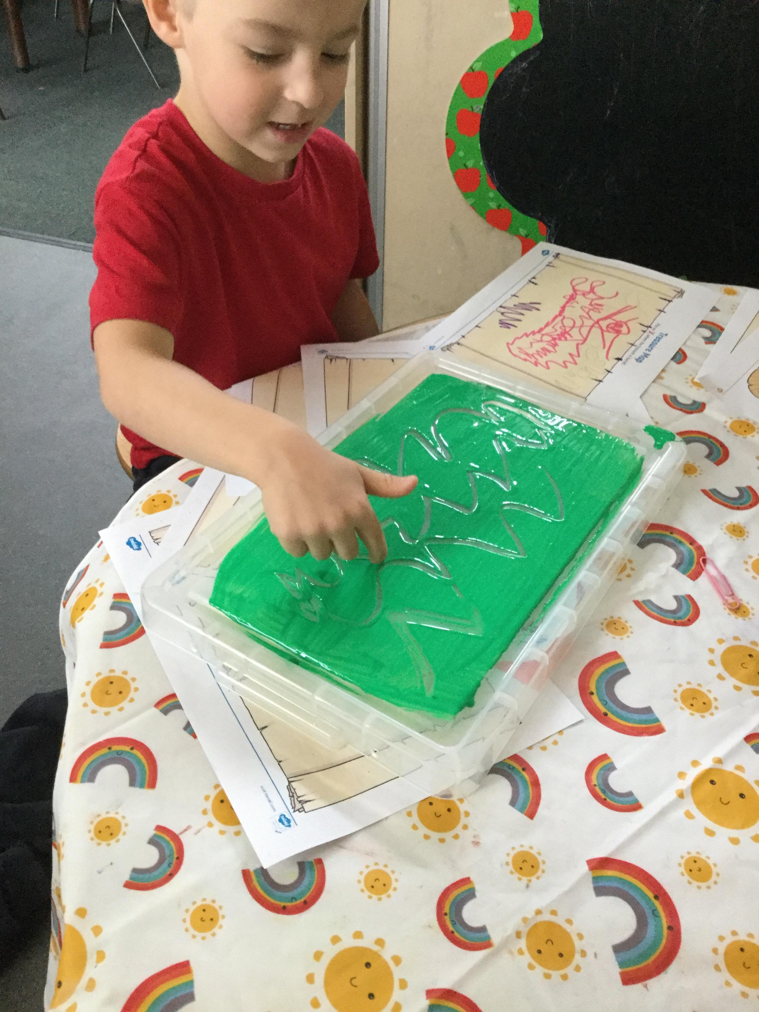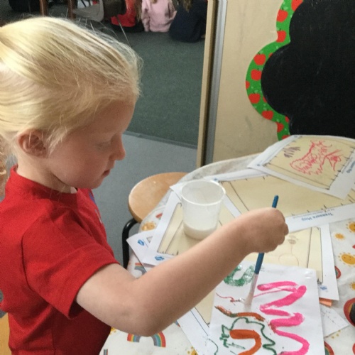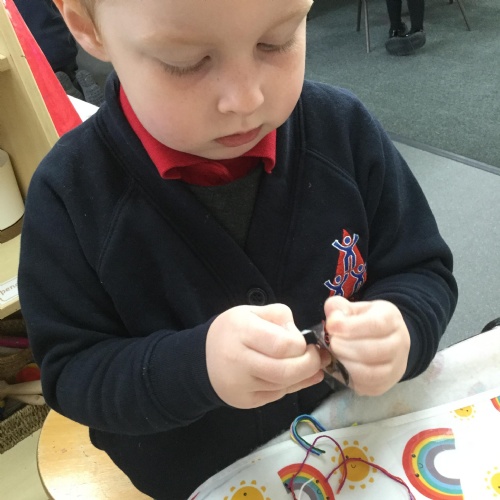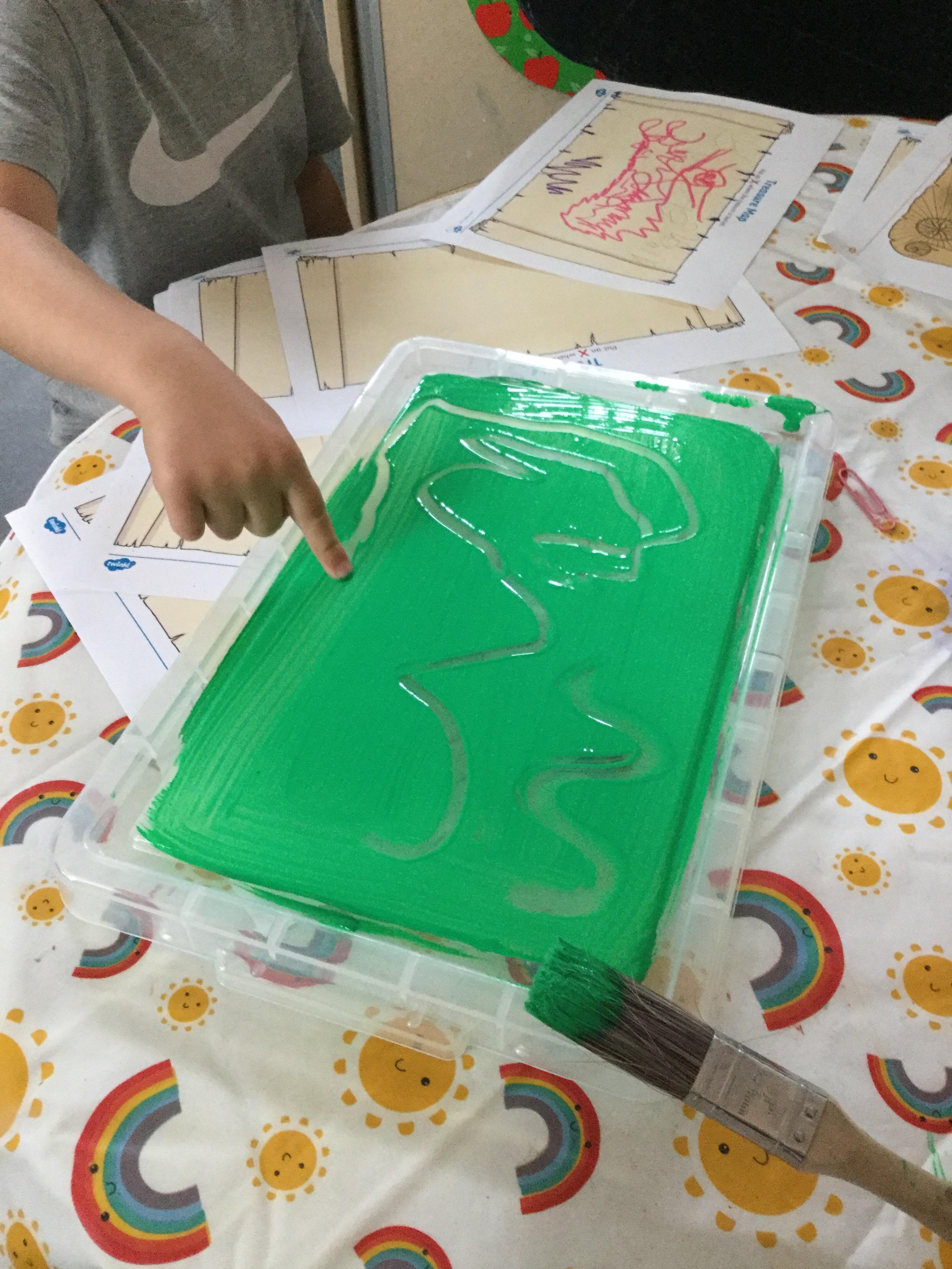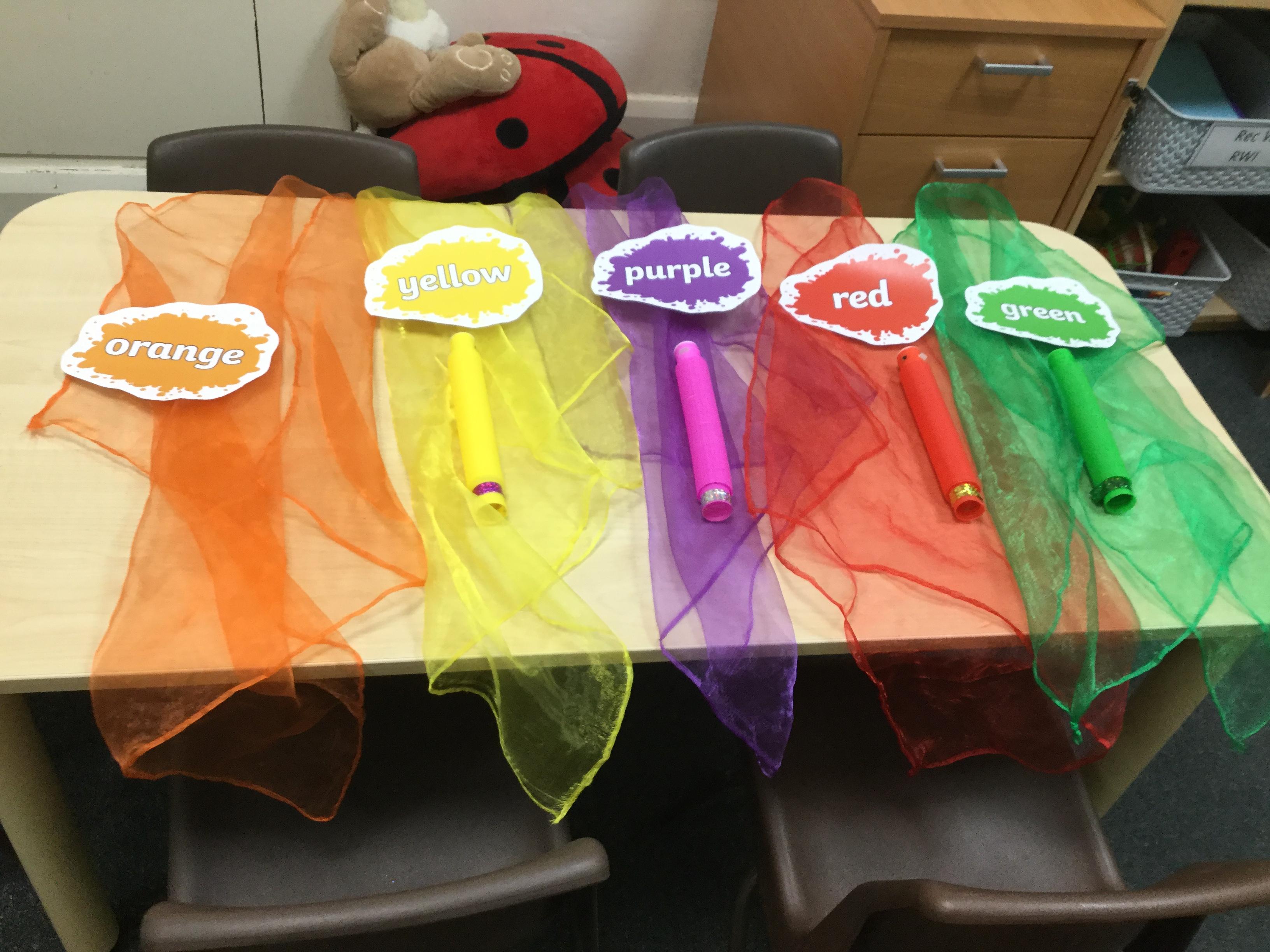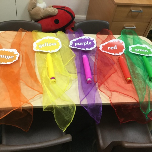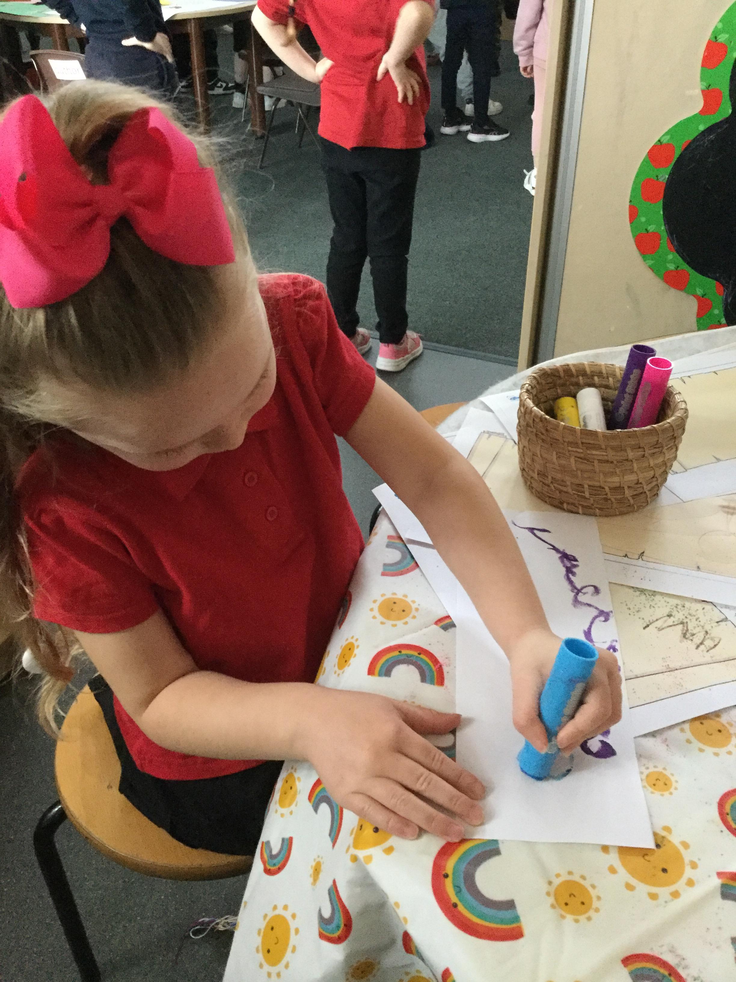 We have also been exploring patterns and have realised that patterns are all around us - on our socks, shoes and in the classroom. Here we are exploring mark making on a large scale to help us develop our muscle tone. We really enjoyed this and talked for ages about the different patterns and contrast of colours.