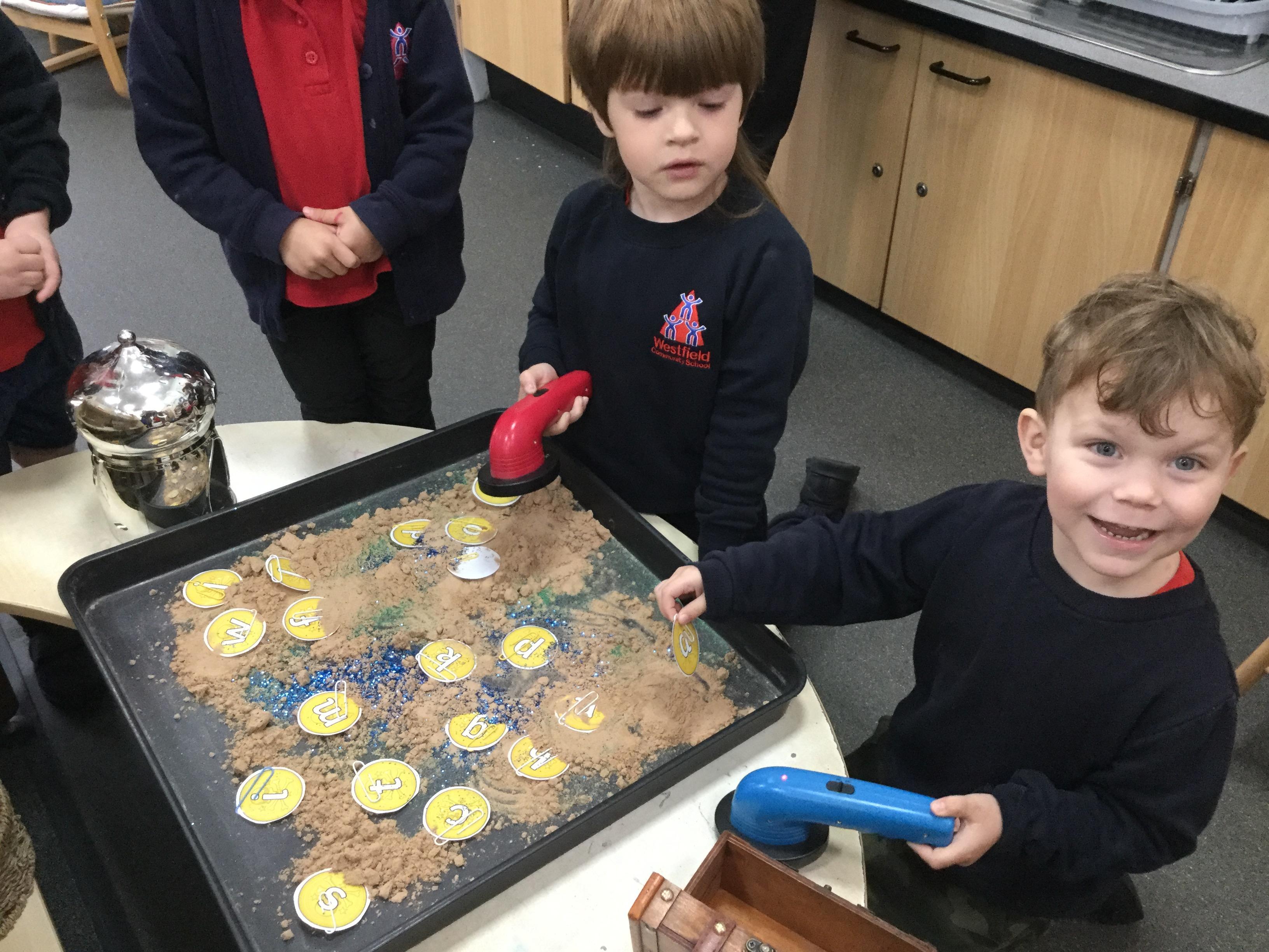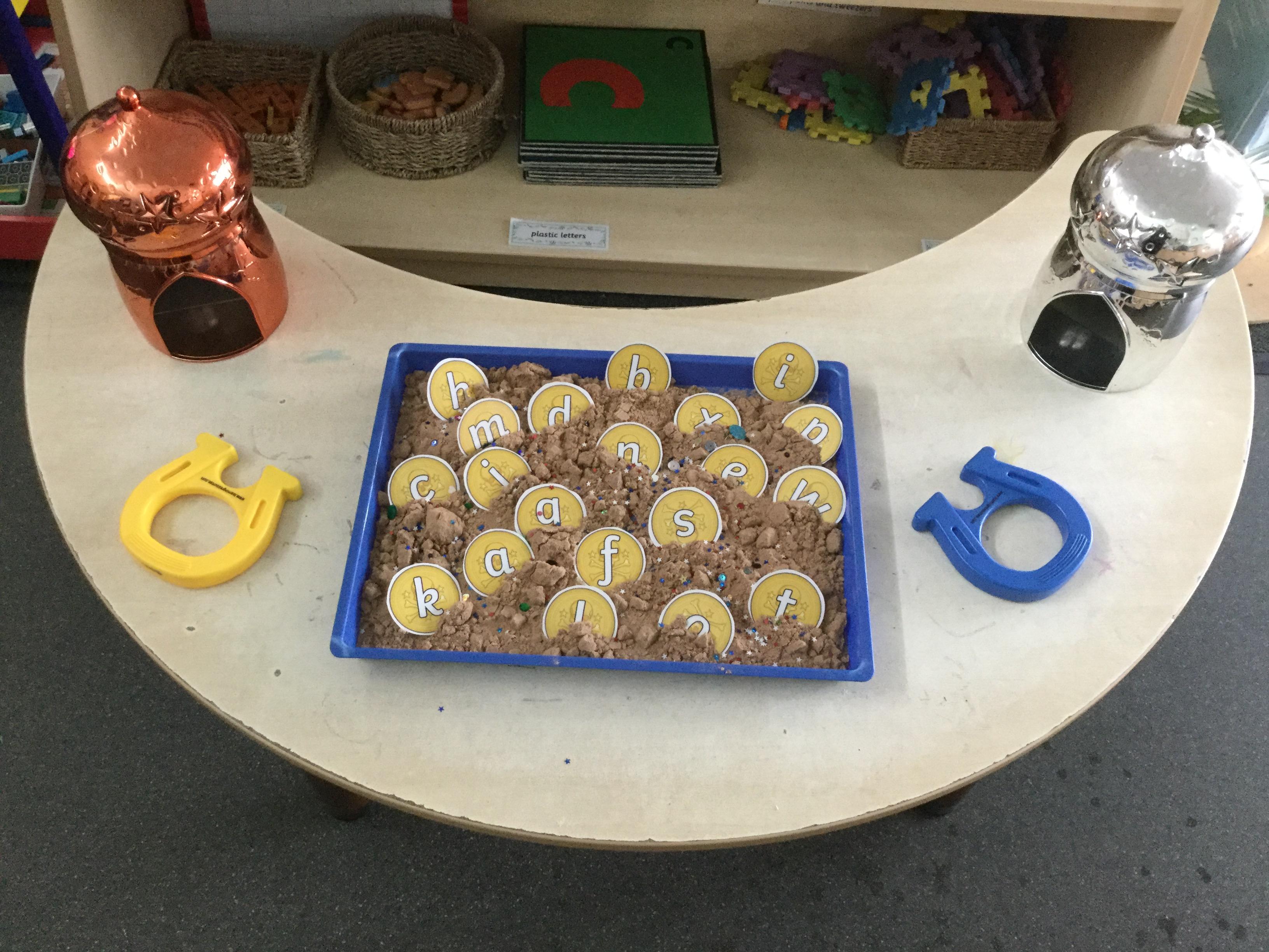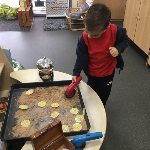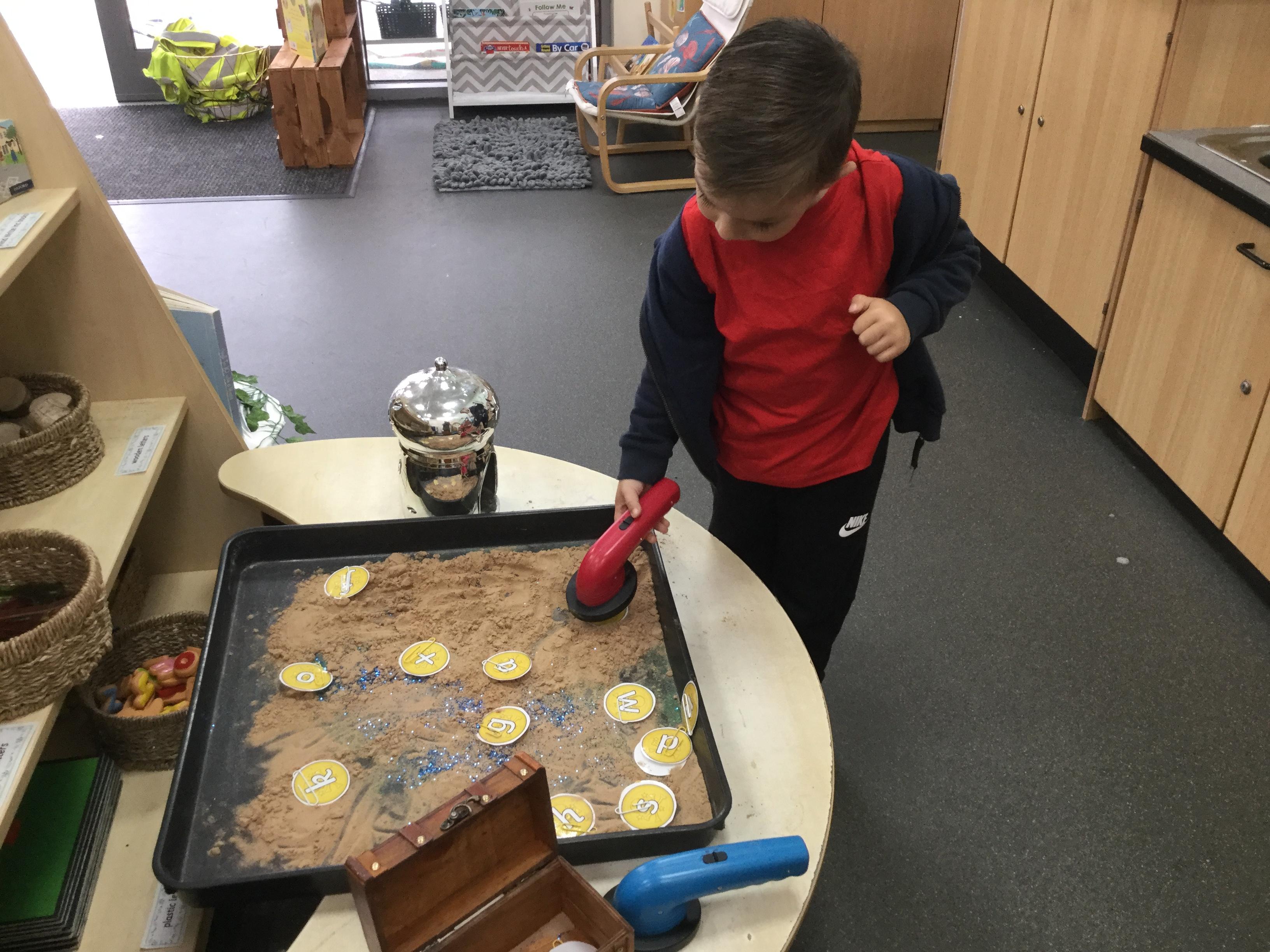 In keeping with out text of the week work we have bene exploring letter sounds like pirate Jed would do - in the sand! We had to dig for the sounds, use a magnet to collect them and tell our friend the sound we have discovered. Great fun ![]()