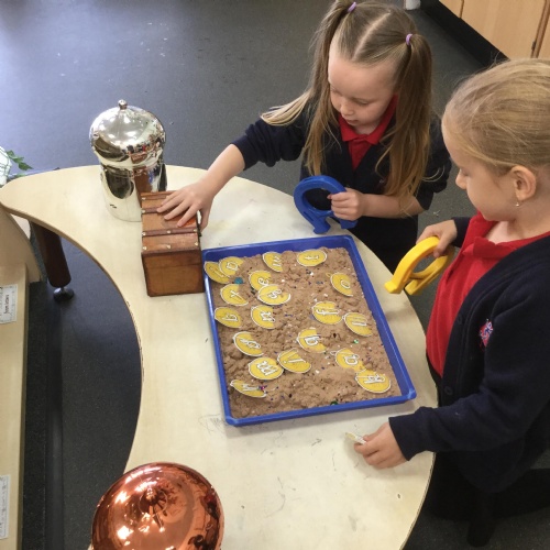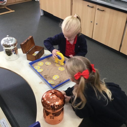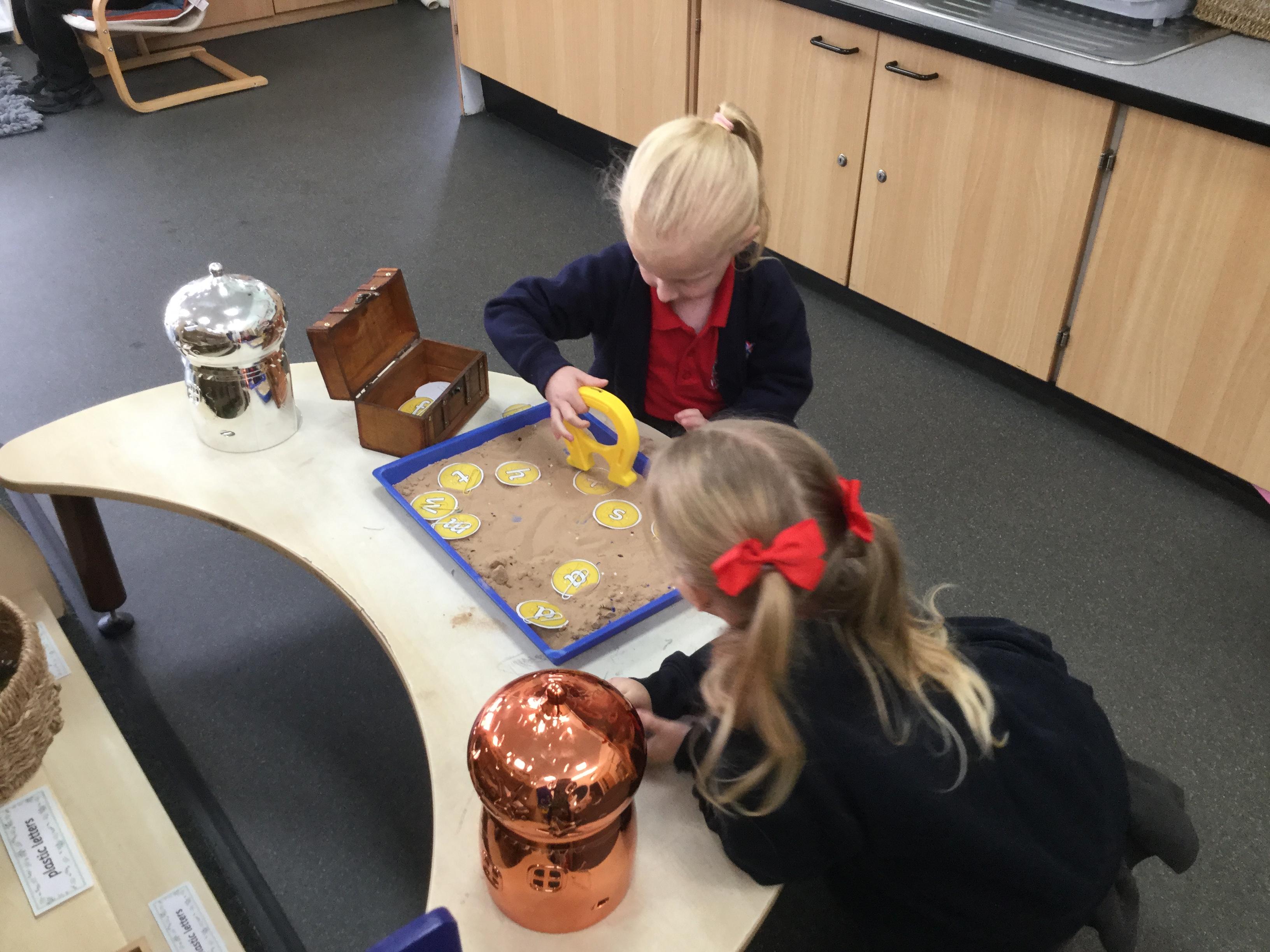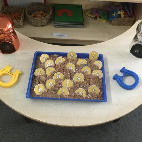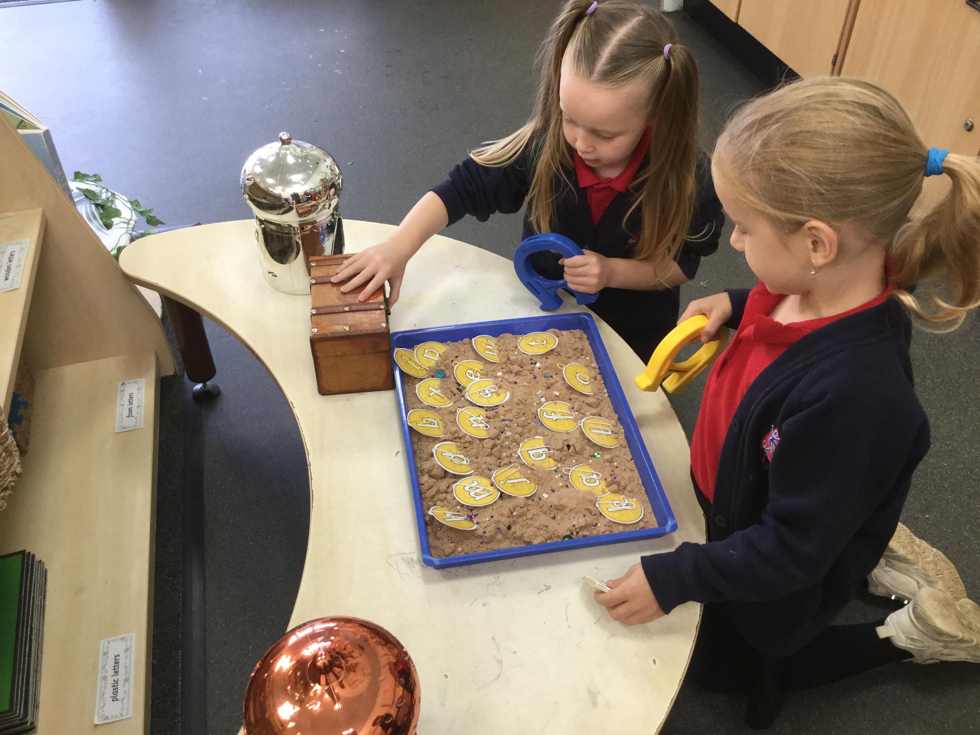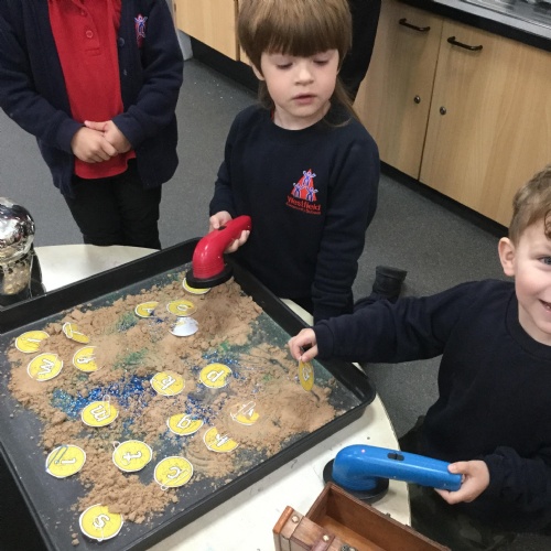 In keeping with out text of the week work we have bene exploring letter sounds like pirate Jed would do - in the sand! We had to dig for the sounds, use a magnet to collect them and tell our friend the sound we have discovered. Great fun ![]()