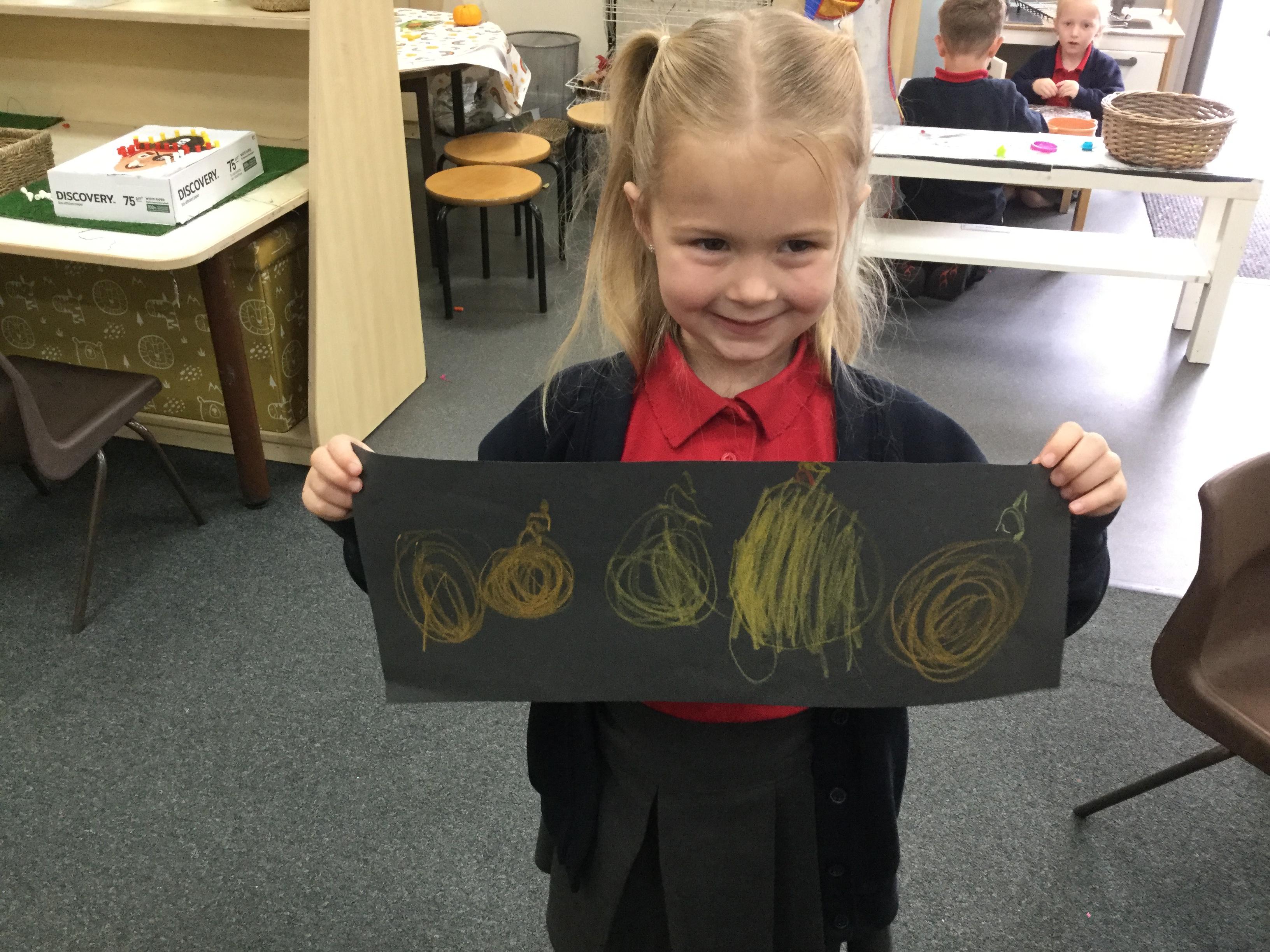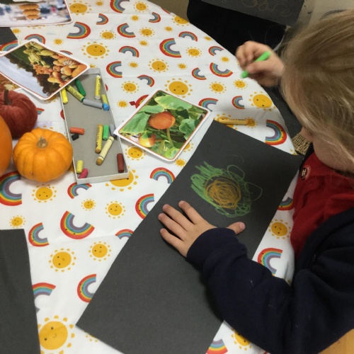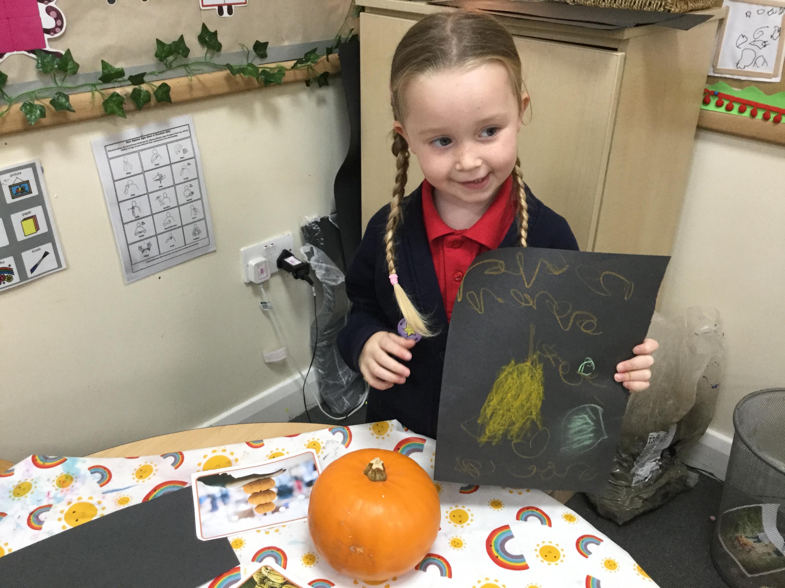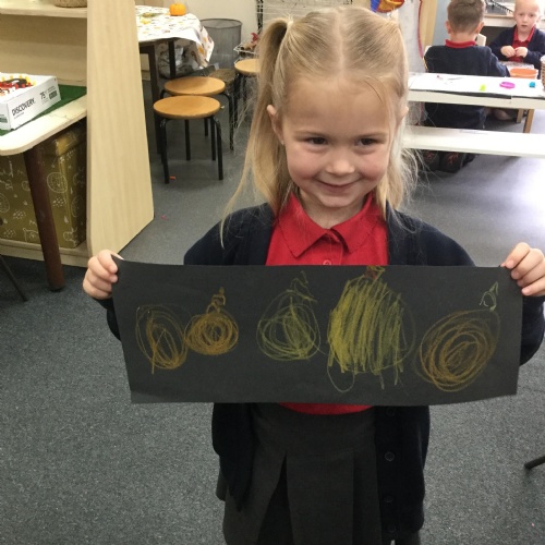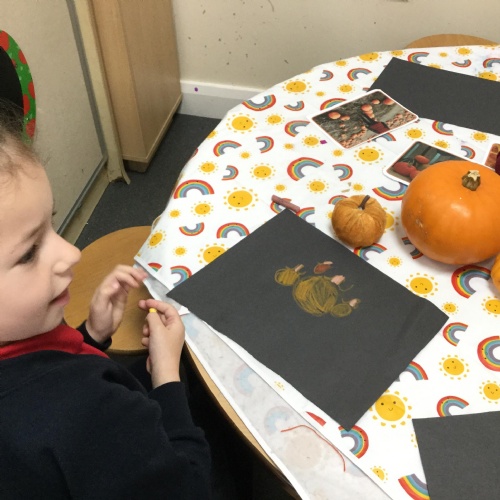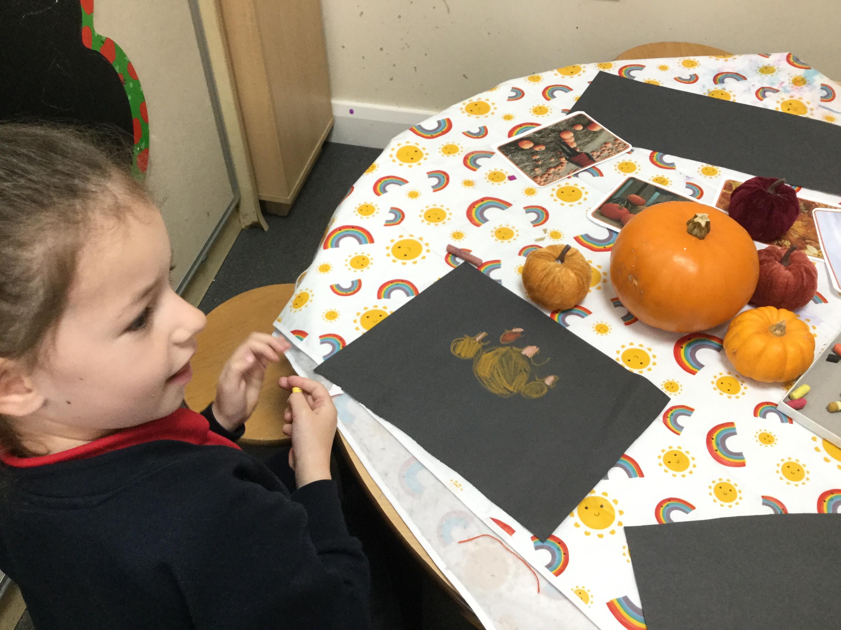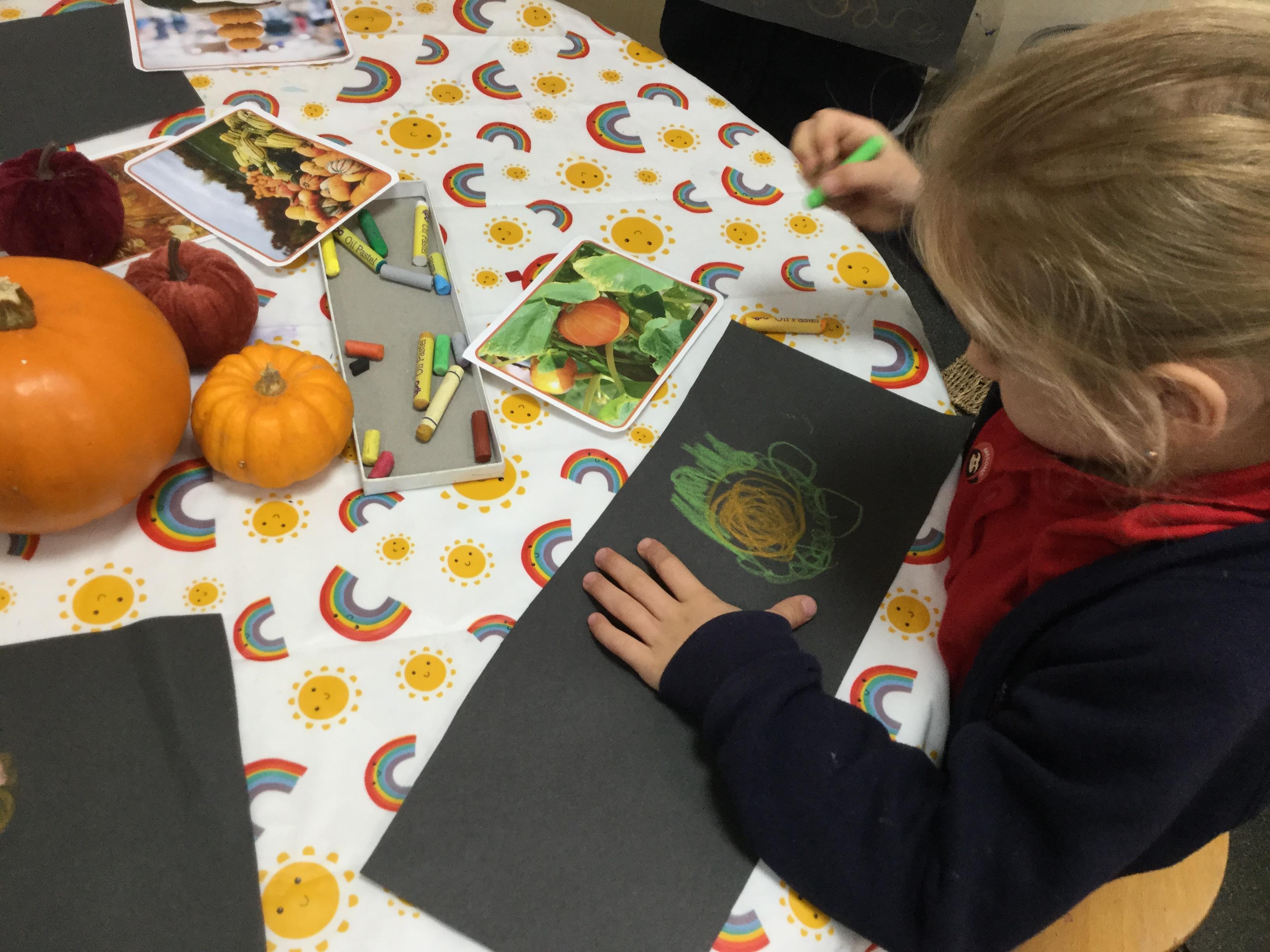 Now that Pirate Jed has his new home high on a hill with a roof as blue as the sky we thought about what he might grow in his garden. We had some fabulous ideas and the majority of children thought pumpkins. So we investigated what they looked like by creating some observational drawings. Enjoy! ![]()