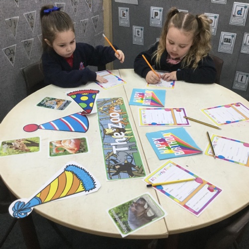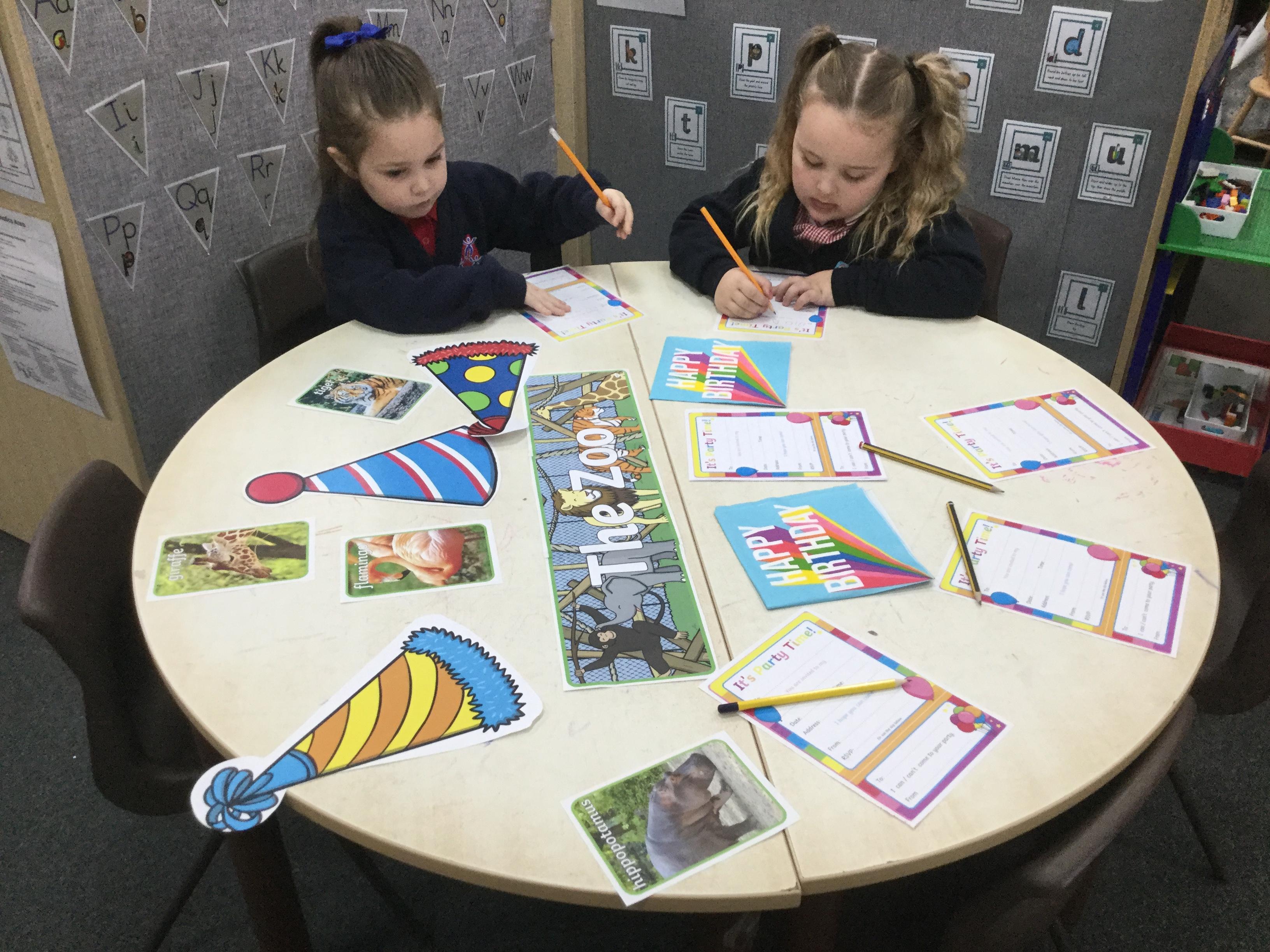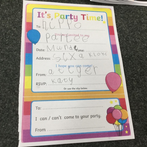 In the story the Platypus wanted to invite the friends in the zoo to his party. We used this as a reason to come and write at our writing area. We created party invitations, addressed envelopes and posted them. This was great for helping us to identify days of the week, times and so on when writing