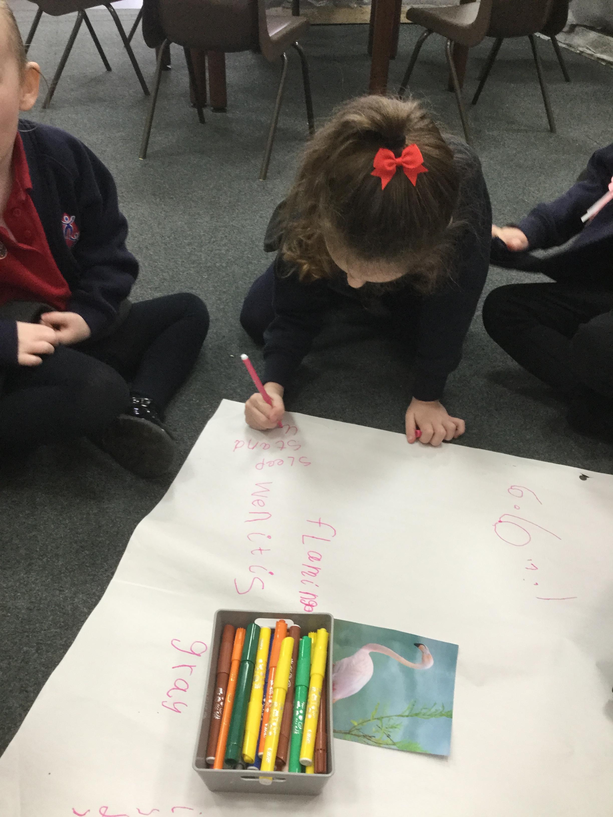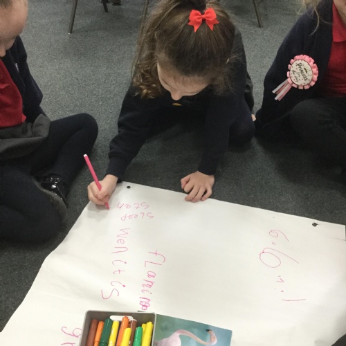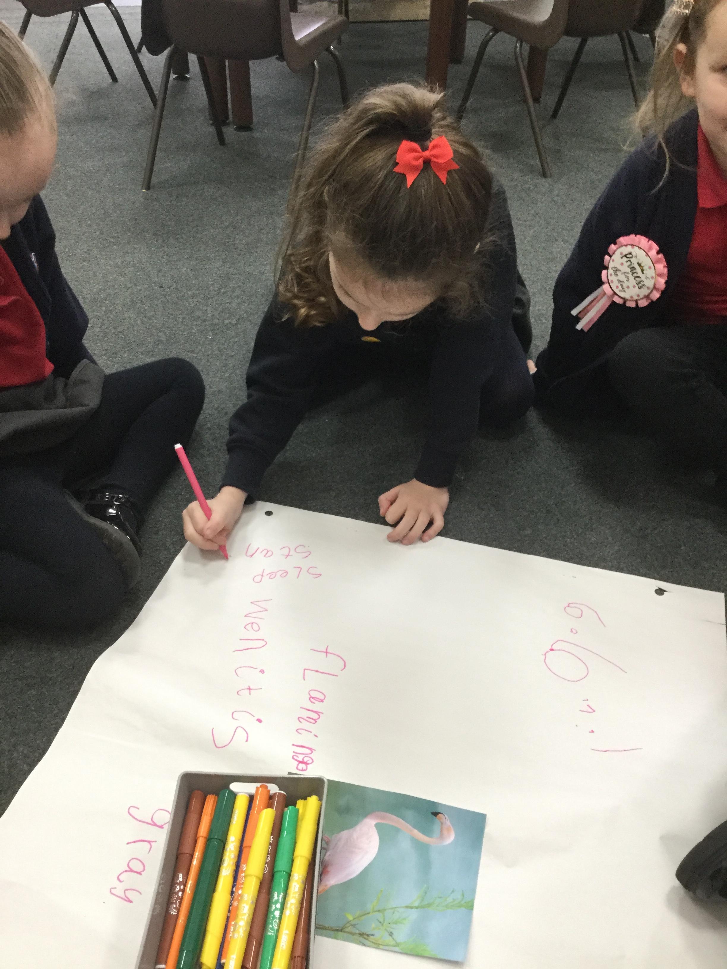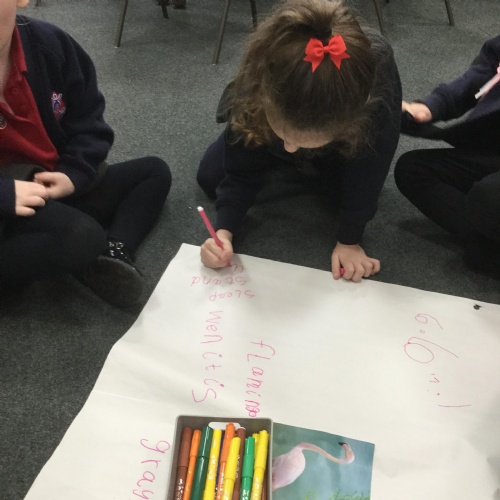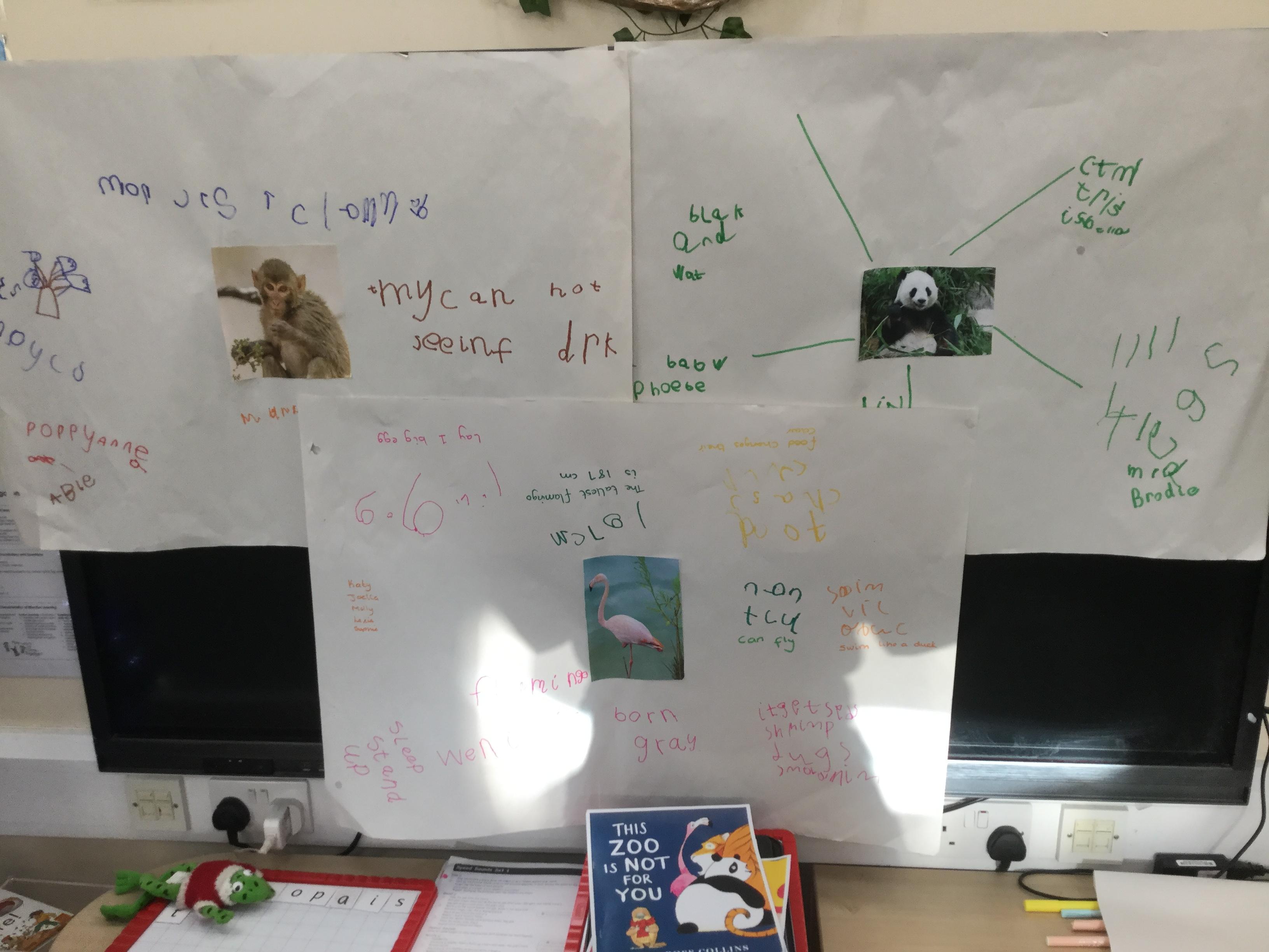 We used the animals from the story to help us learn more about their habitat and to learn some more fun facts. We used books and the Internet to find out information. For example, did you know that flamingos sleep standing upright on one leg? Nor did we but we now know lots more facts ![]()