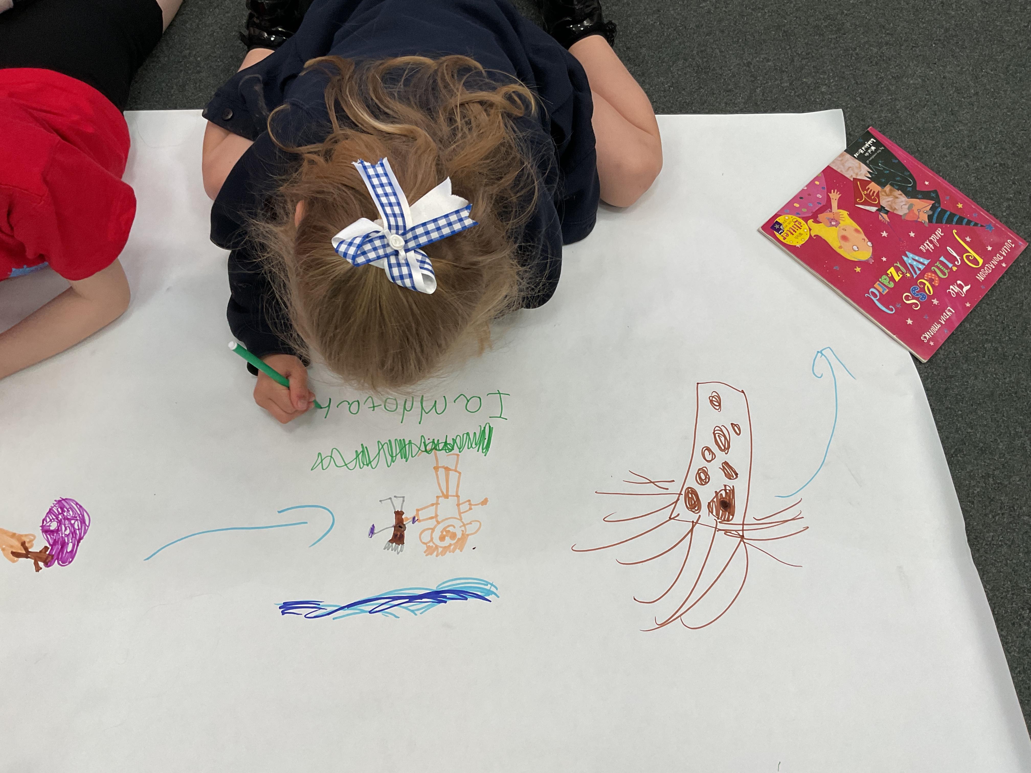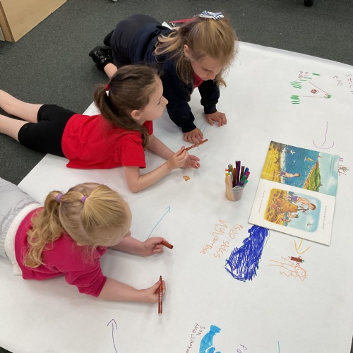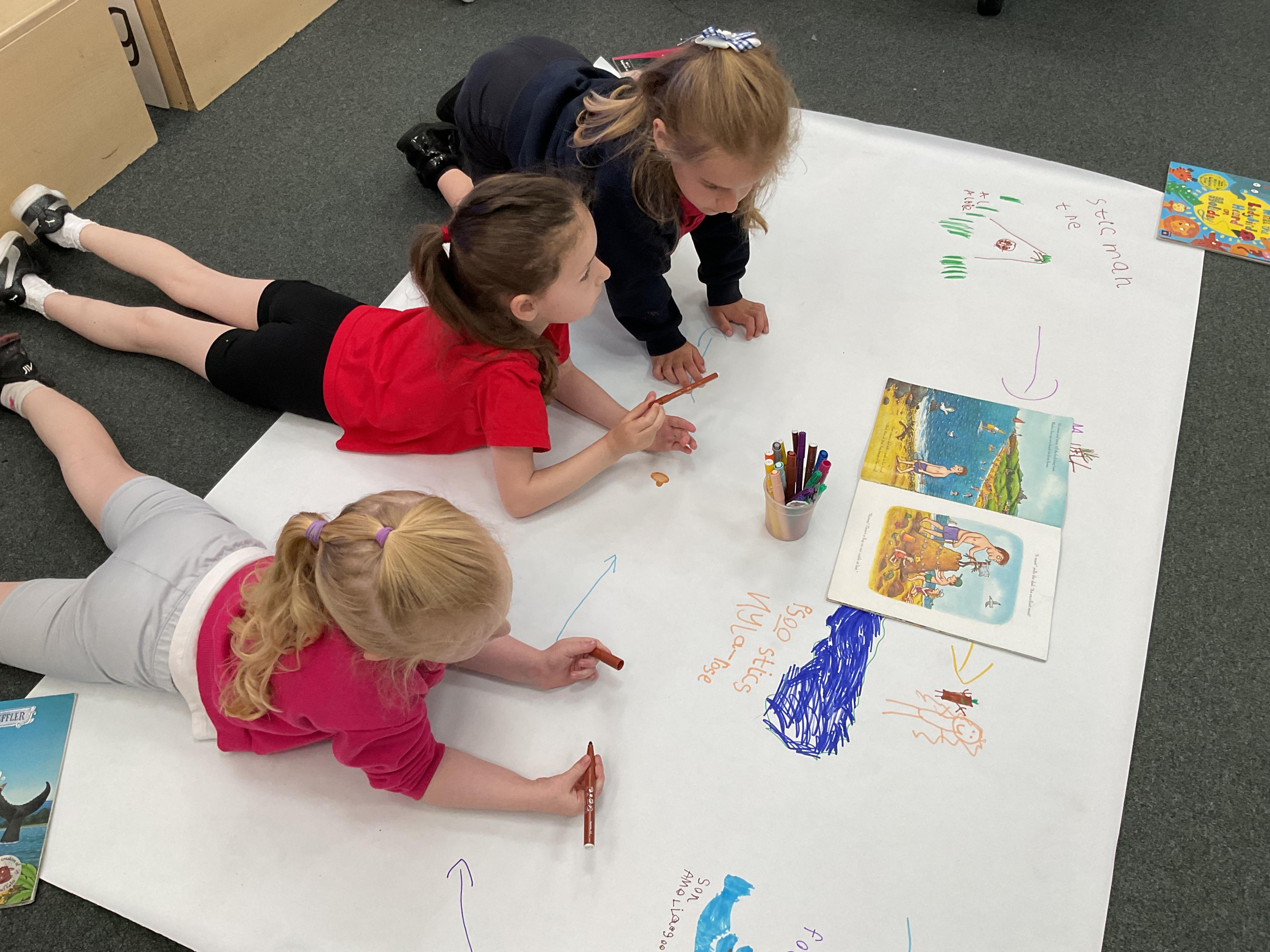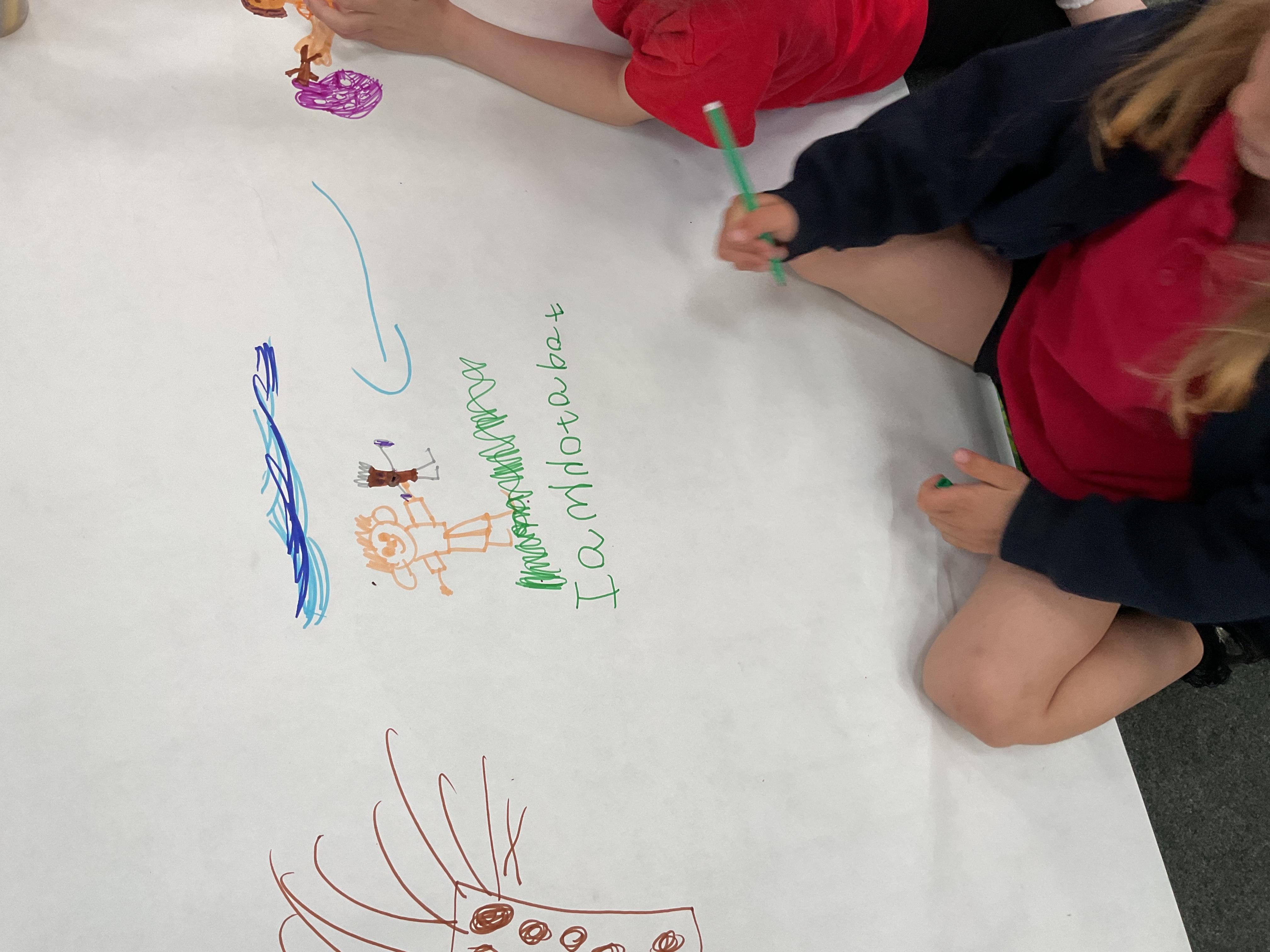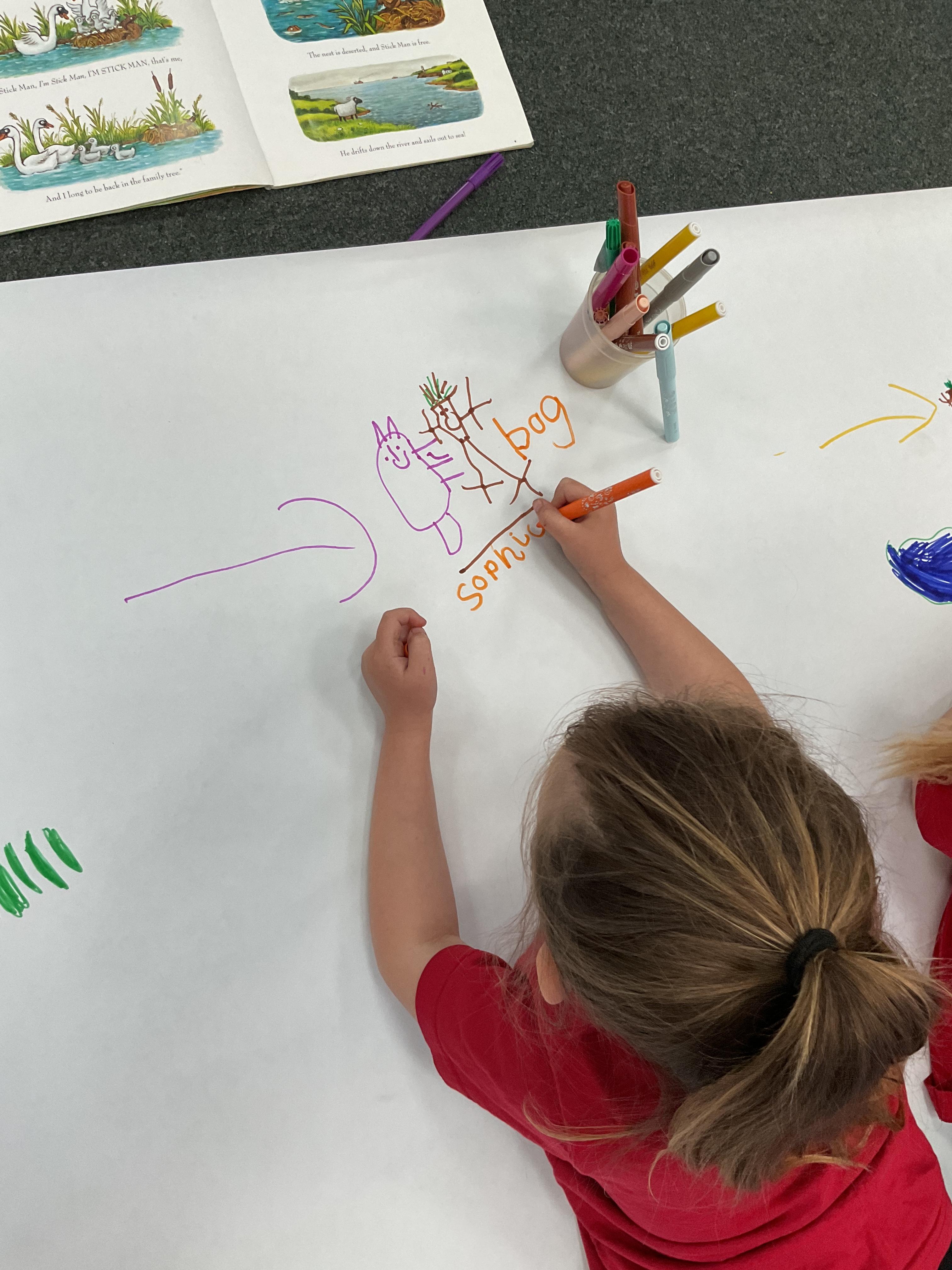 We created a giant story map all about the journey of Stickman. We told the story orally and then annotated it with our own illustrations. Take a look at our amazing work and our writing. Brilliant.
