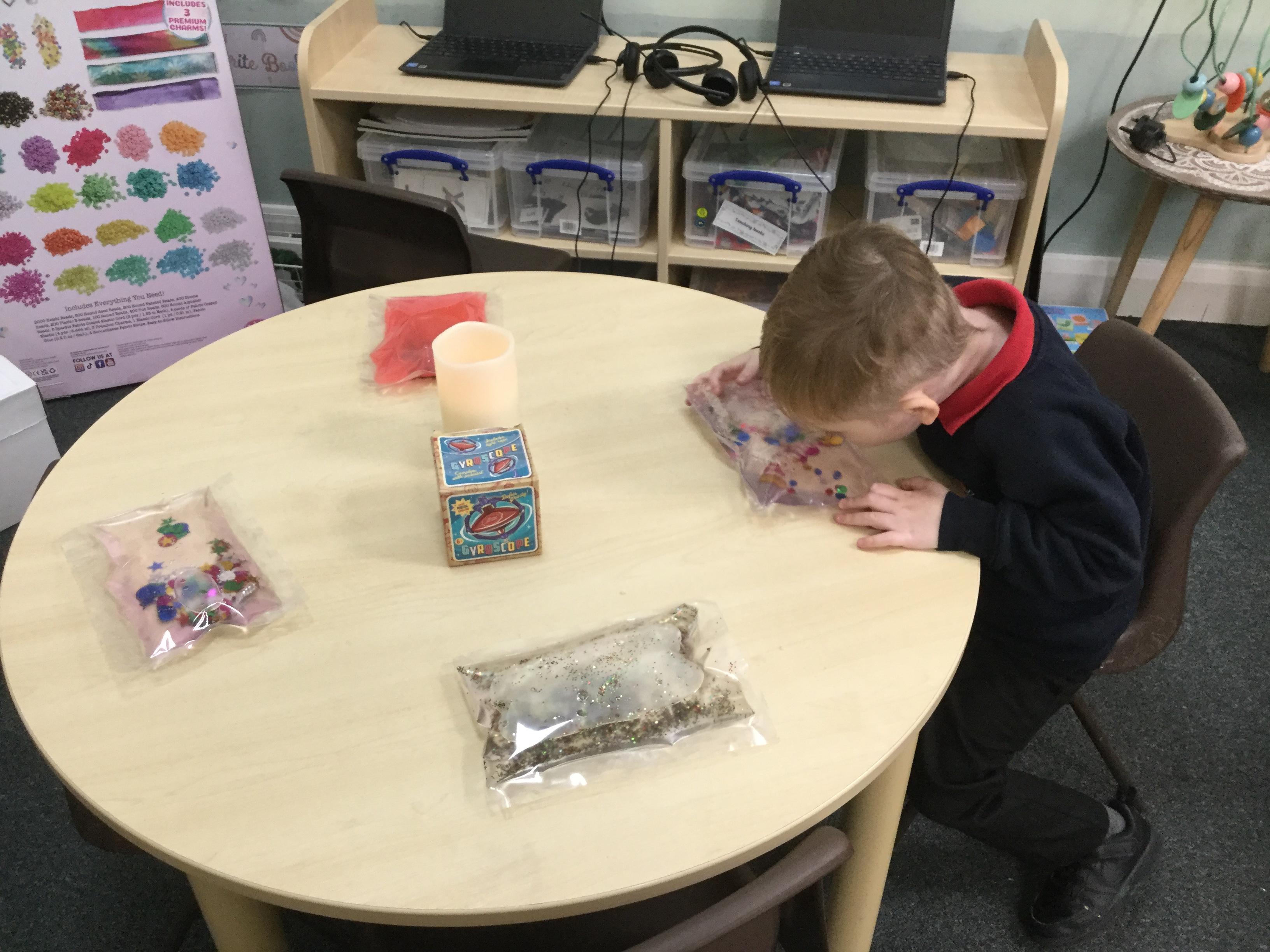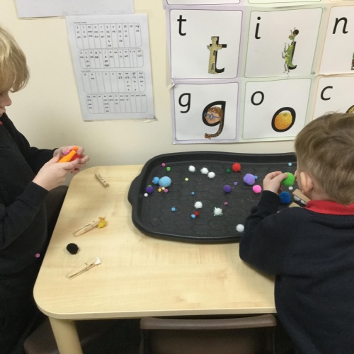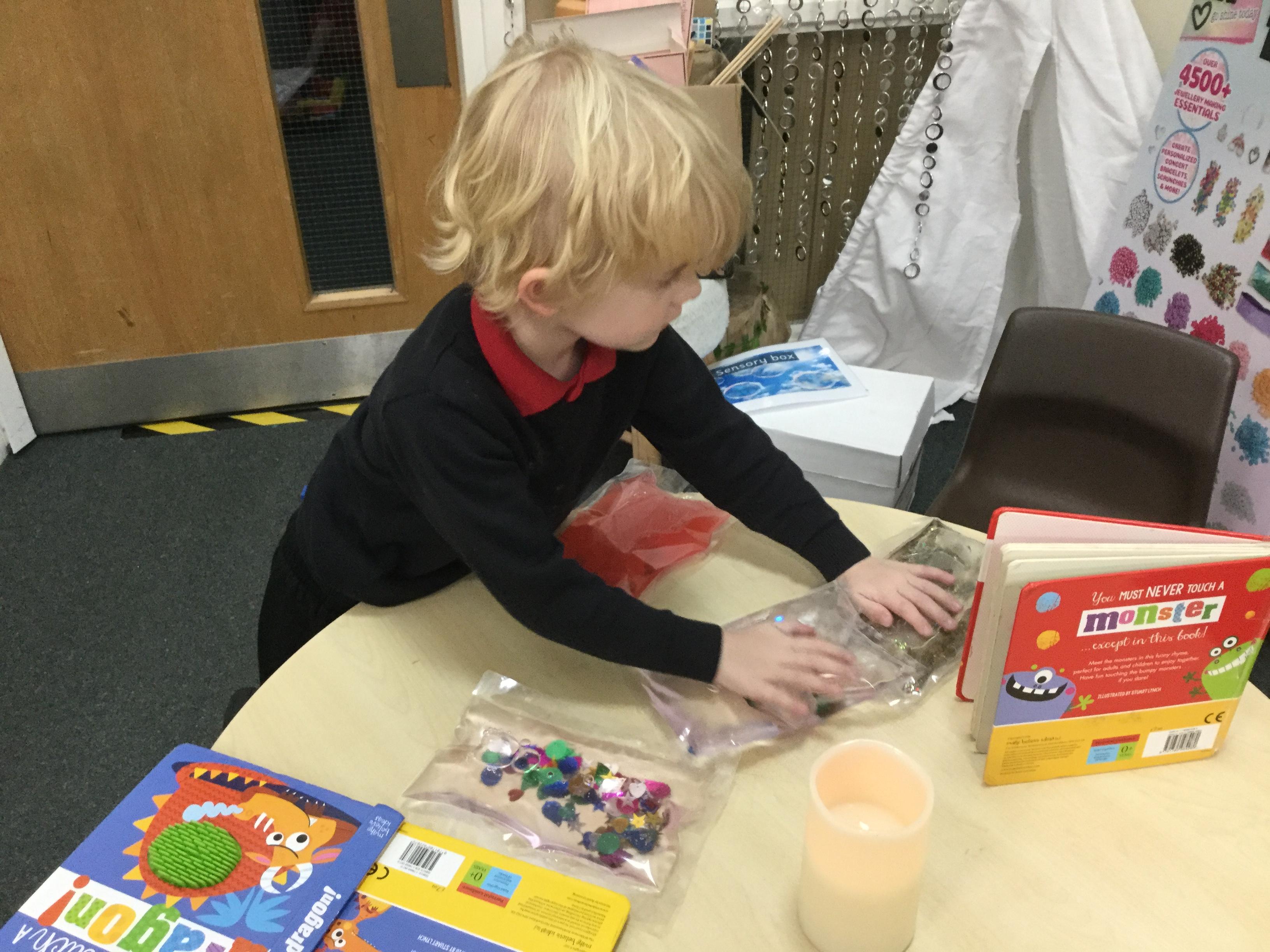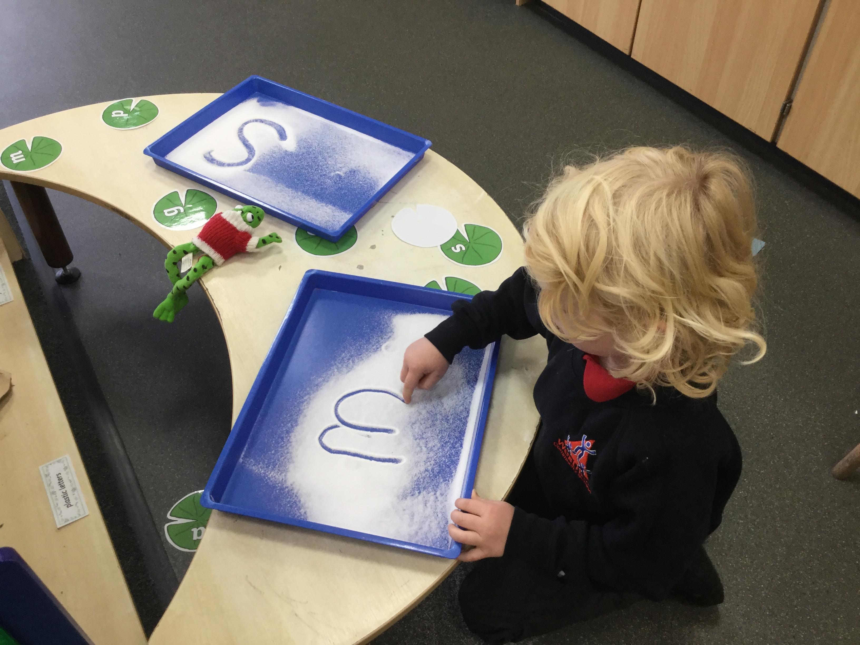 We have also been using different materials to practise our letters. Here we are using coloured sand and our finger! ![]()