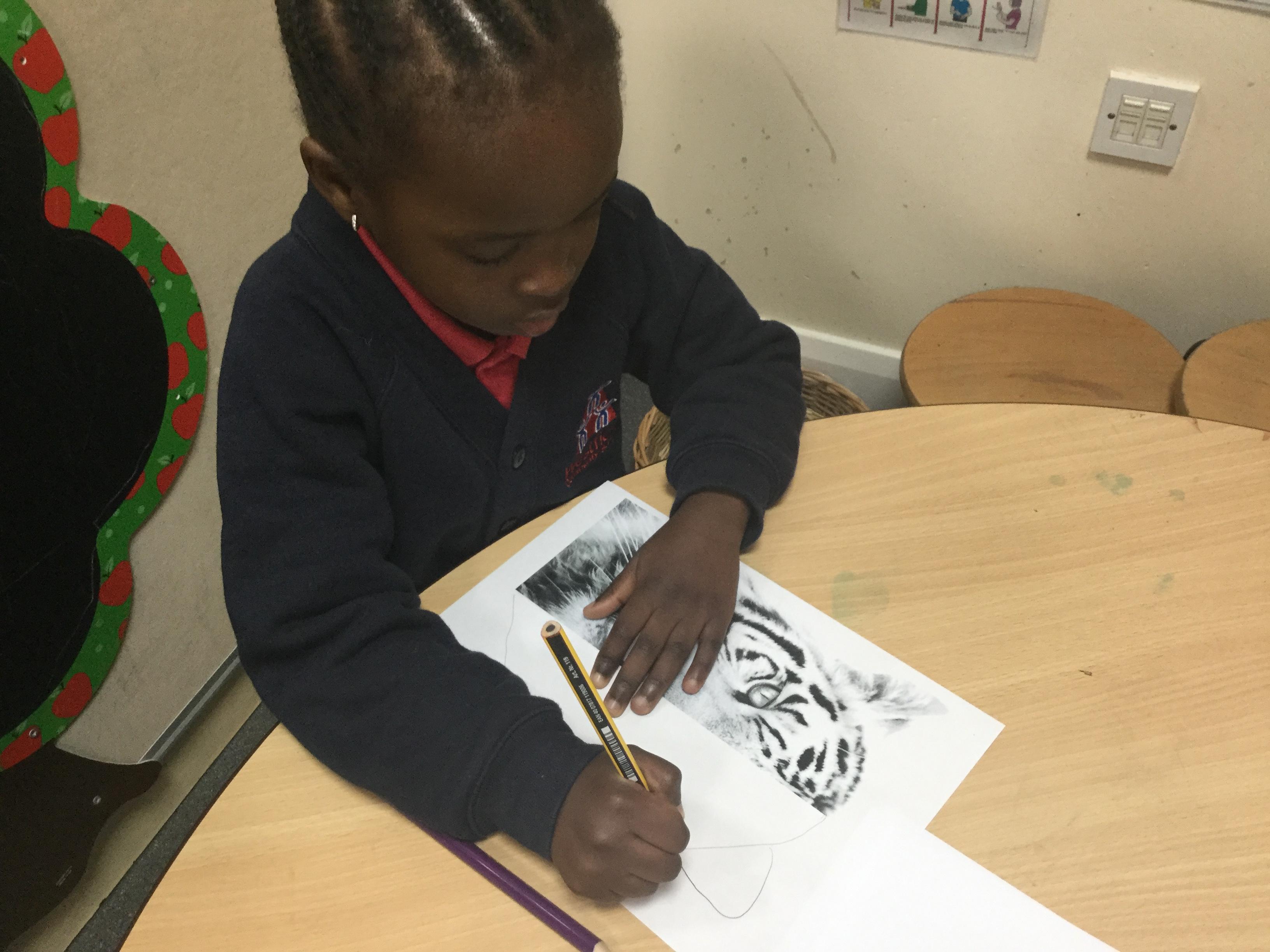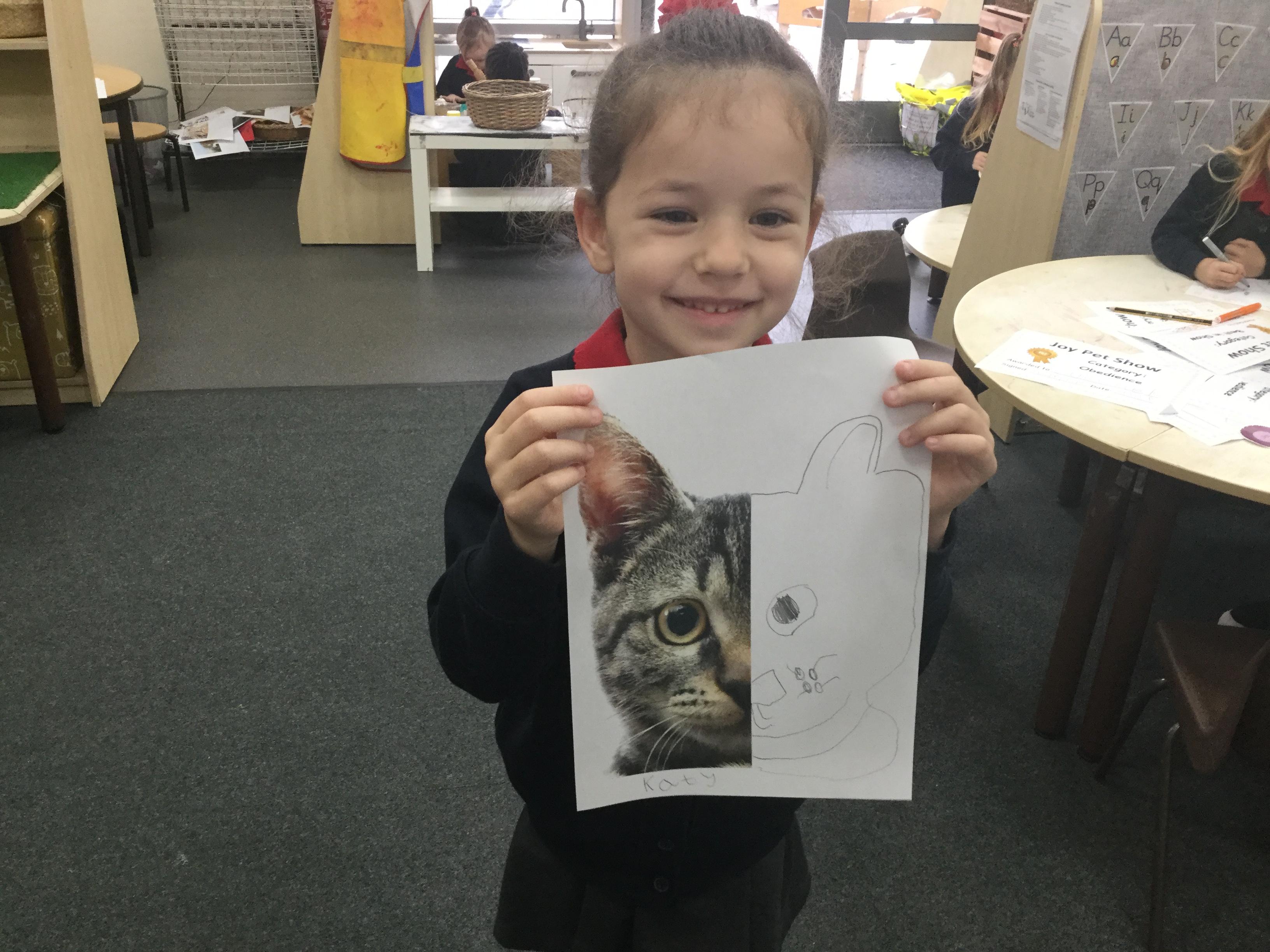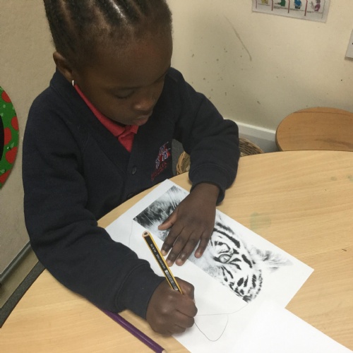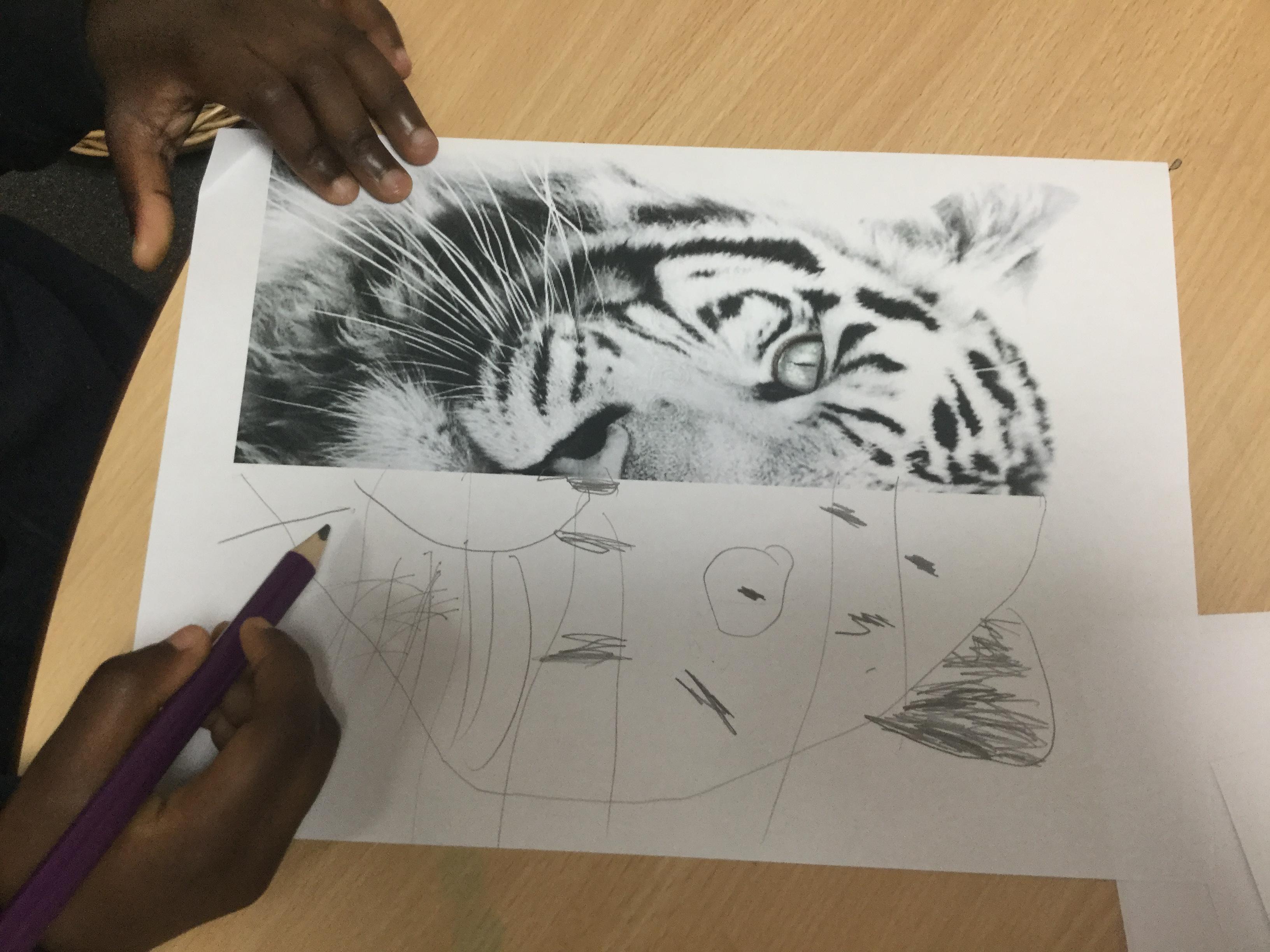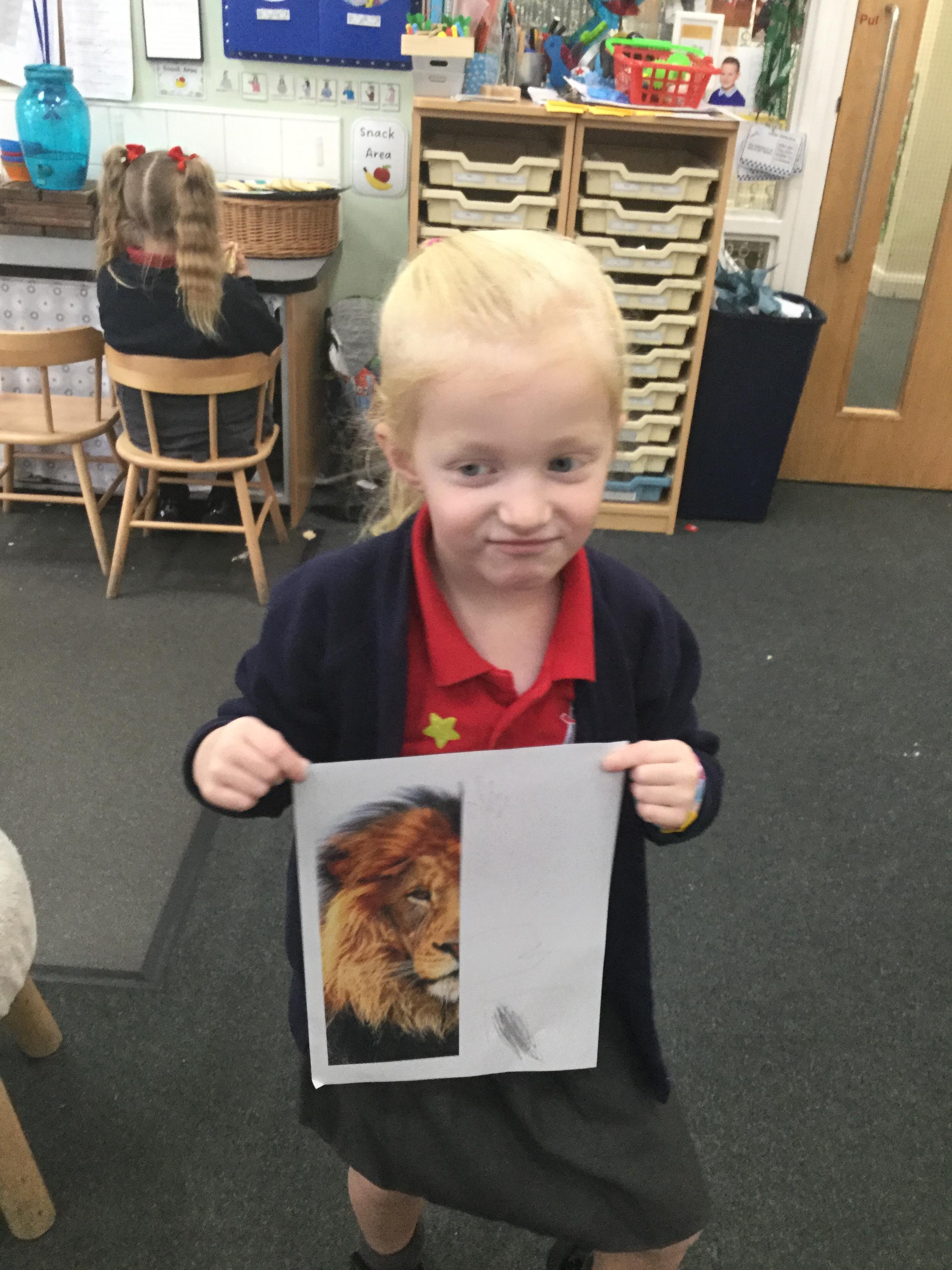 We started the week off by looking at some half face images of different animals and then we talked about how we could add the other half of the features. We used pencils and our observational skills and sketched. Here are the end products ![]()