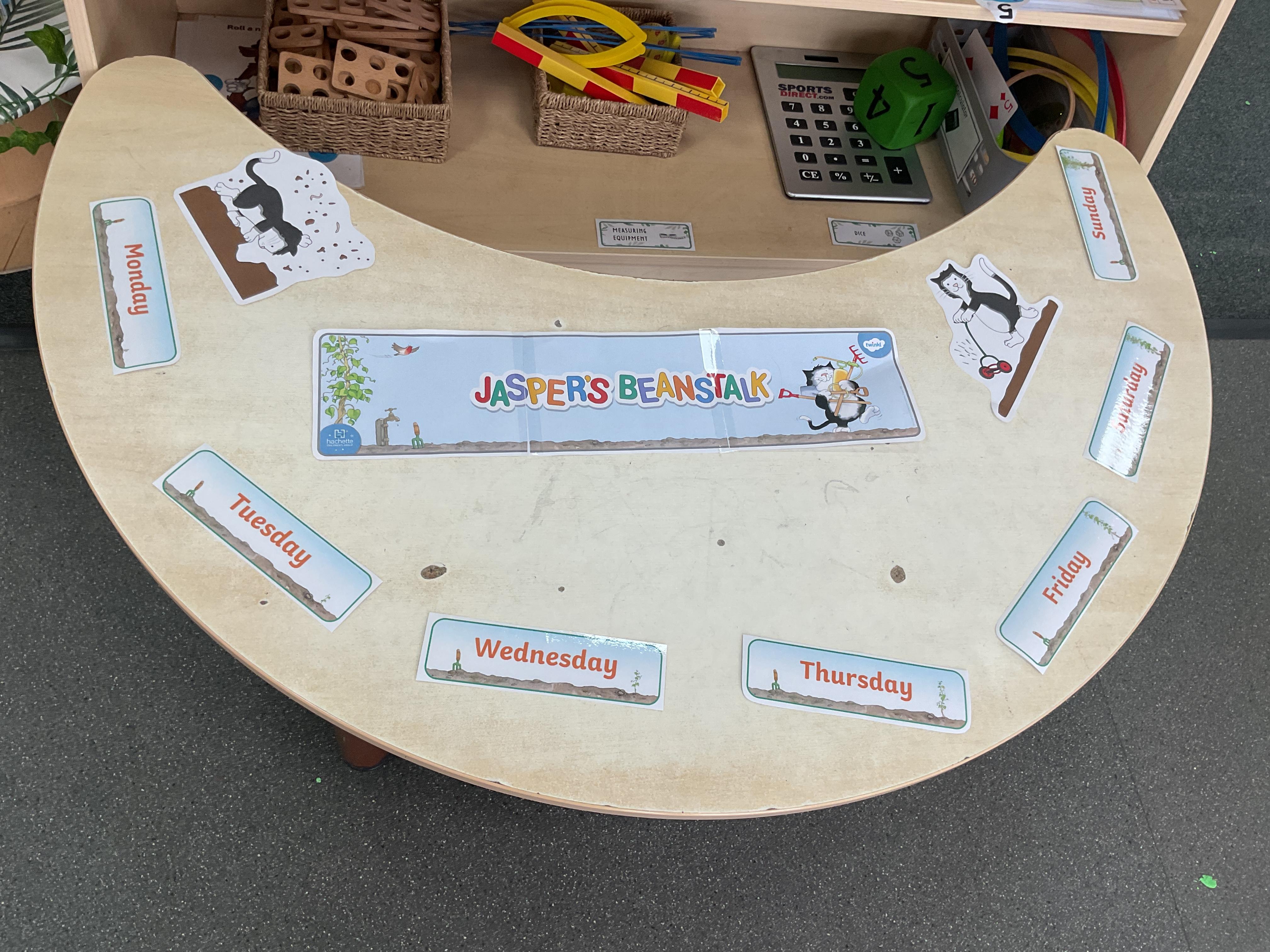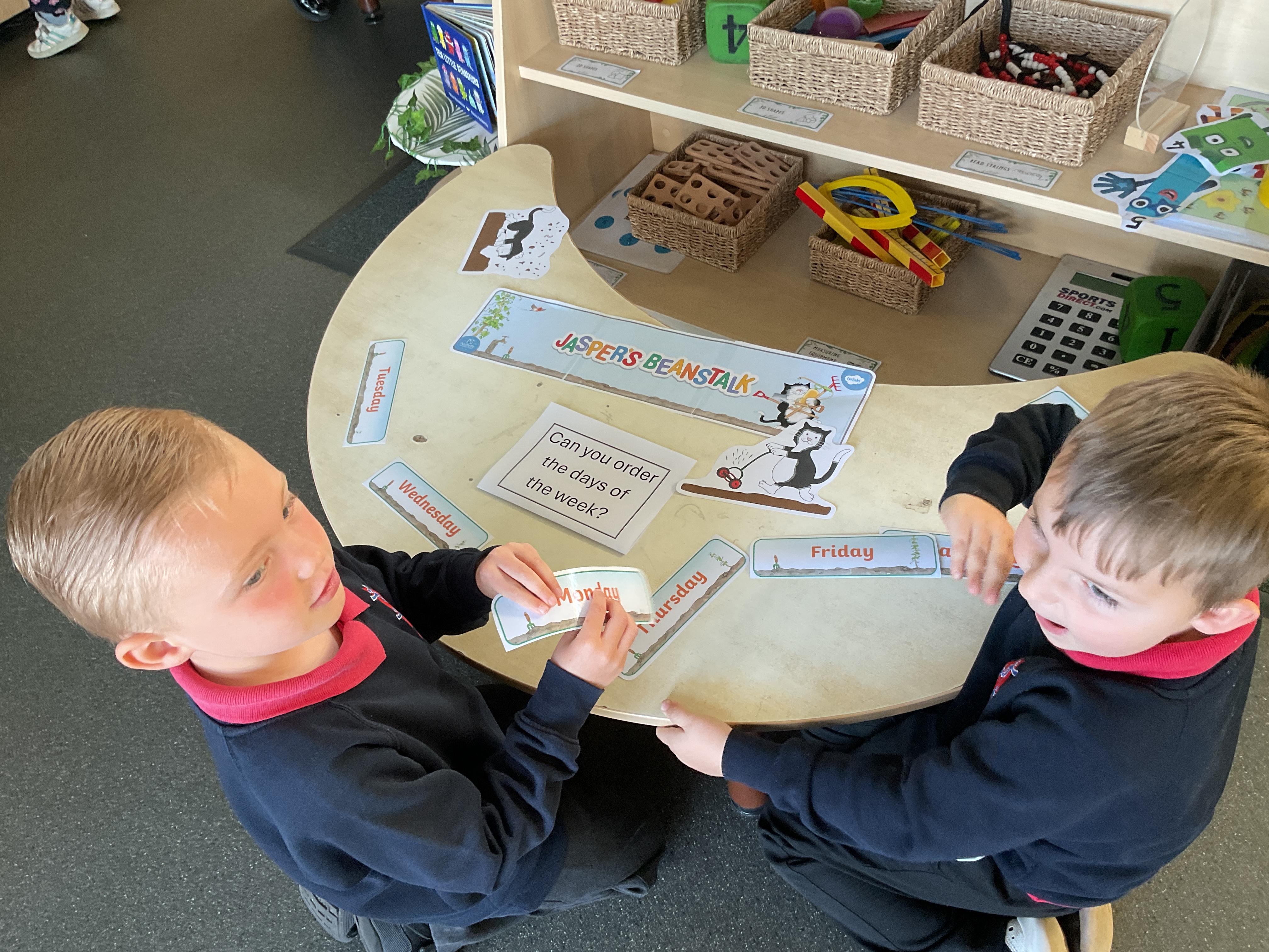 In the story of Jasper's Beanstalk Jasper did something everyday to encourage his bean to grow. On Monday he found it, on Tuesday he dug it, on Wednesday he watered it and so on. This gave us the perfect opportunity to develop our understanding of the days of the week. Here we are ordering them ![]()