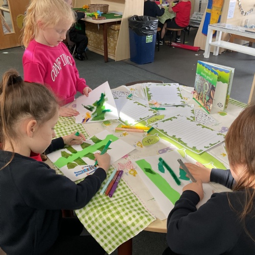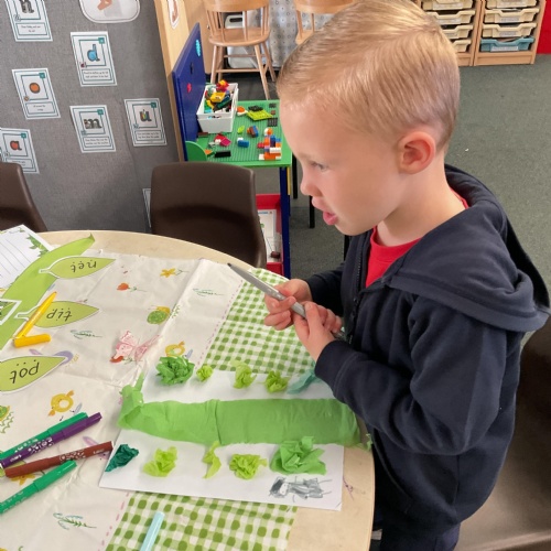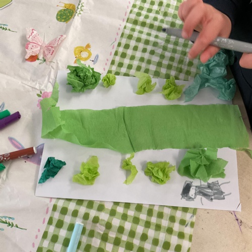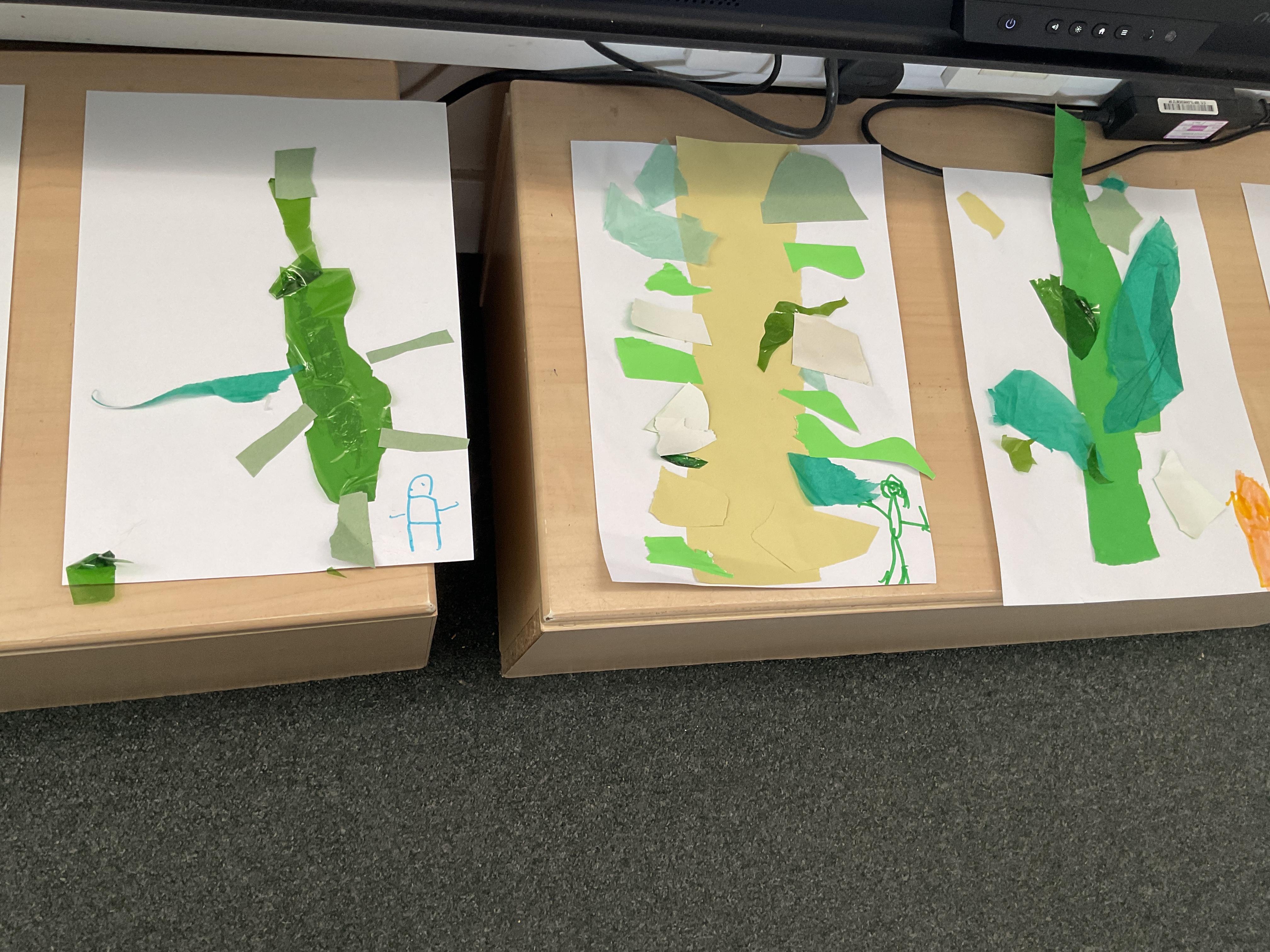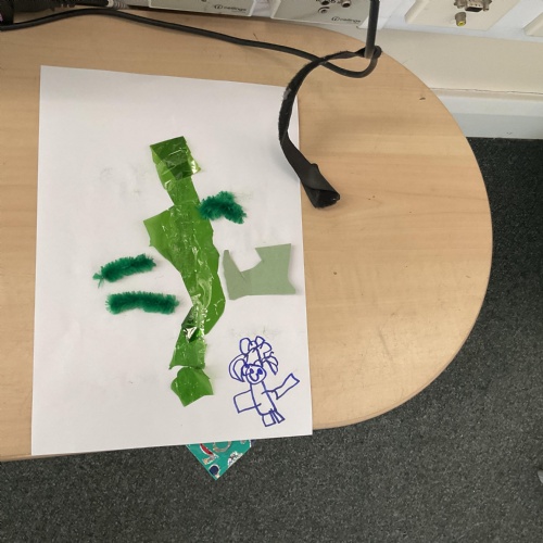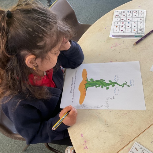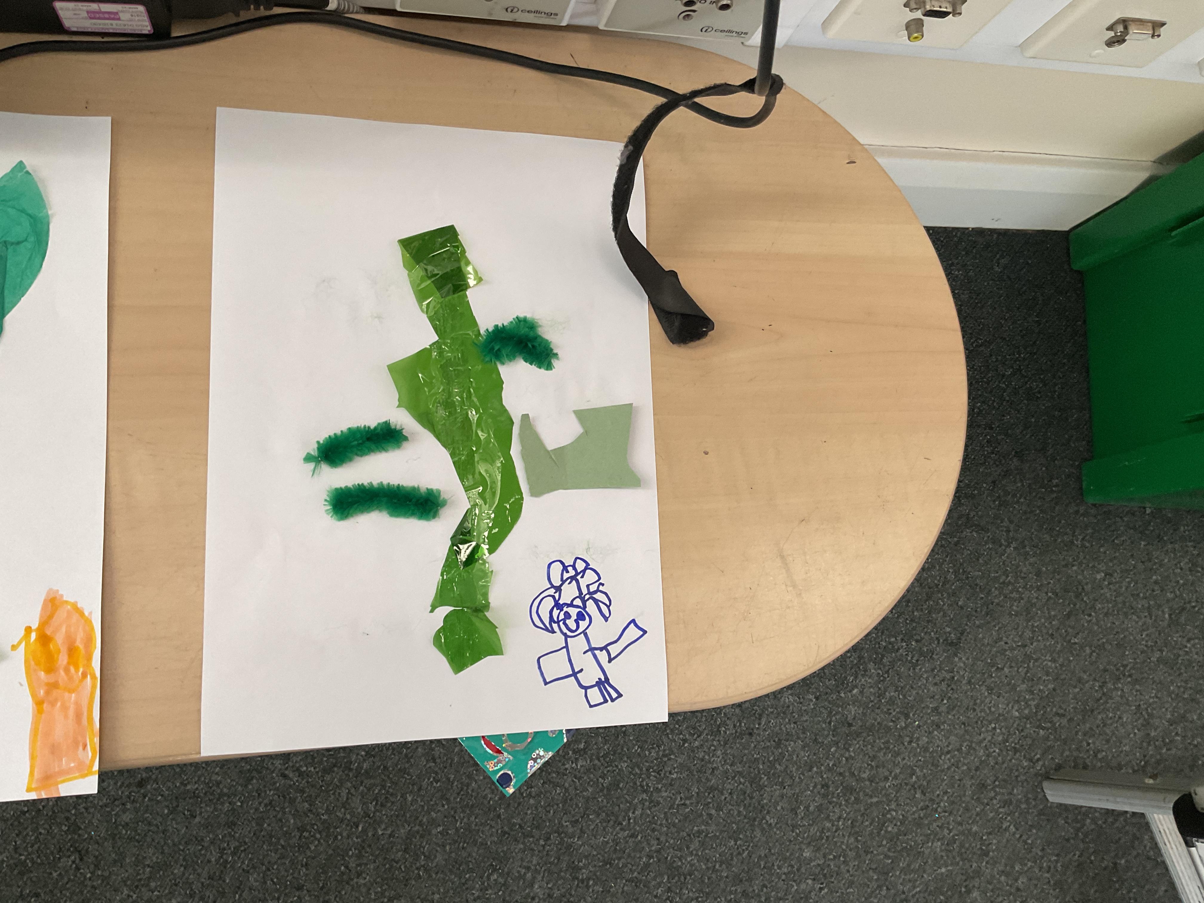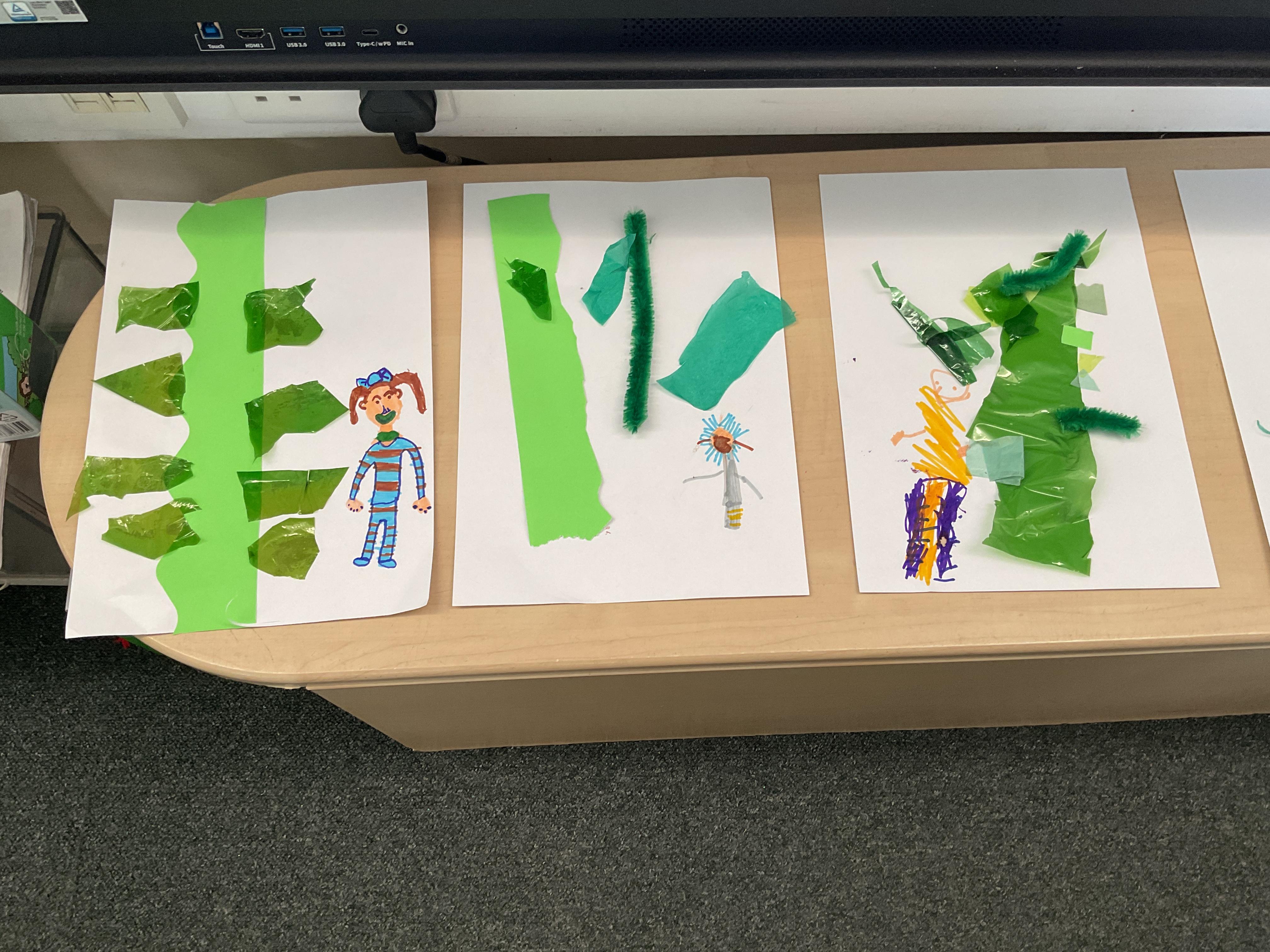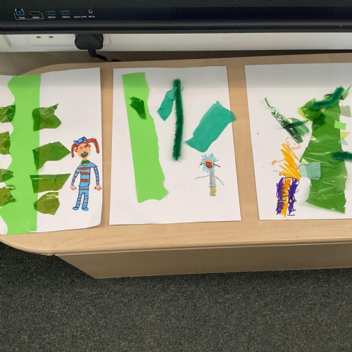On our return to class we used as much green collage that we could find and gather to make our own beanstalk. We problem solved, ripped, tore and cut shades of green and then used them to make a beanstalk. We added ourselves at the bottom of the beanstalk to show just how tall they are ![]()