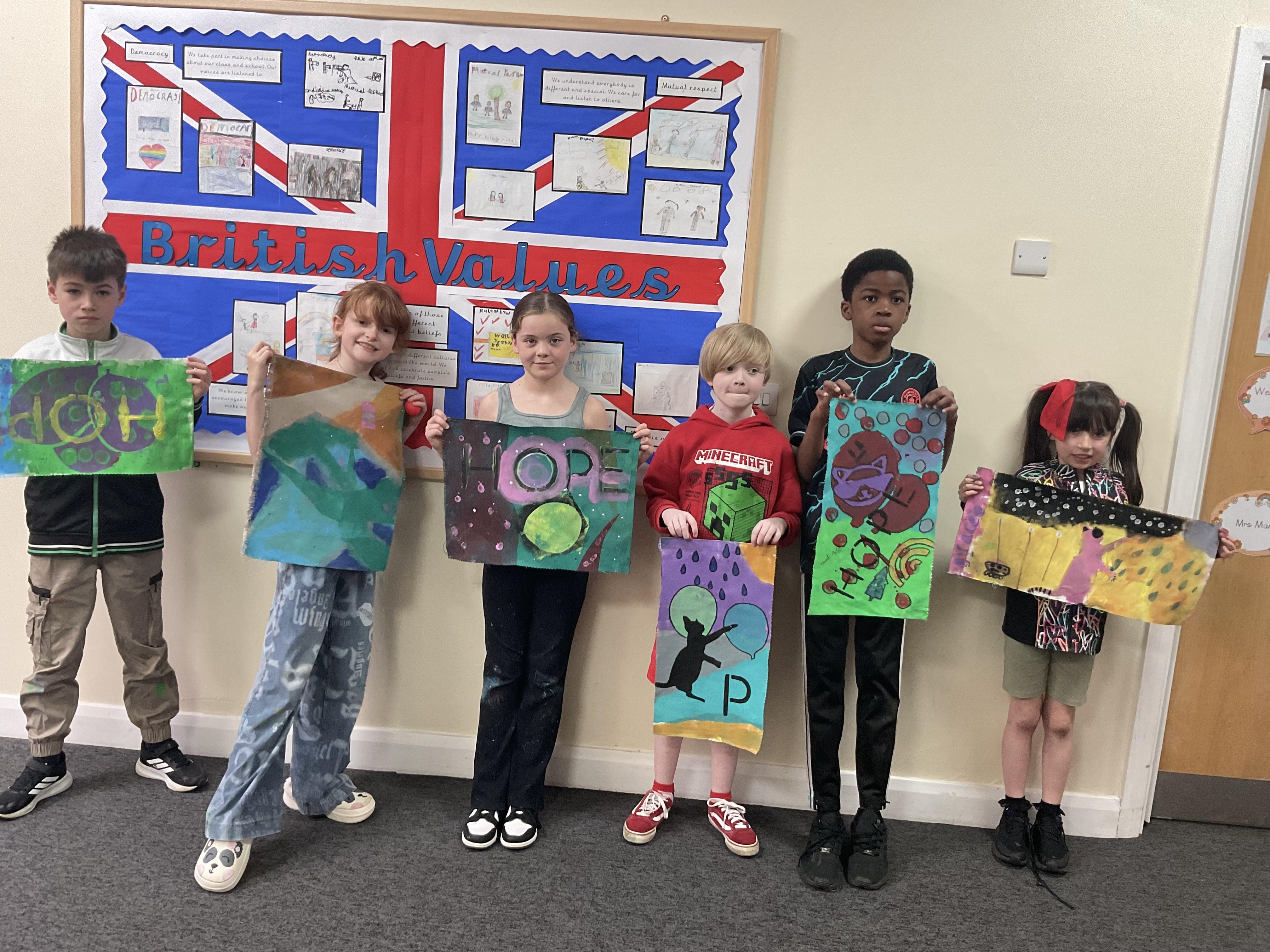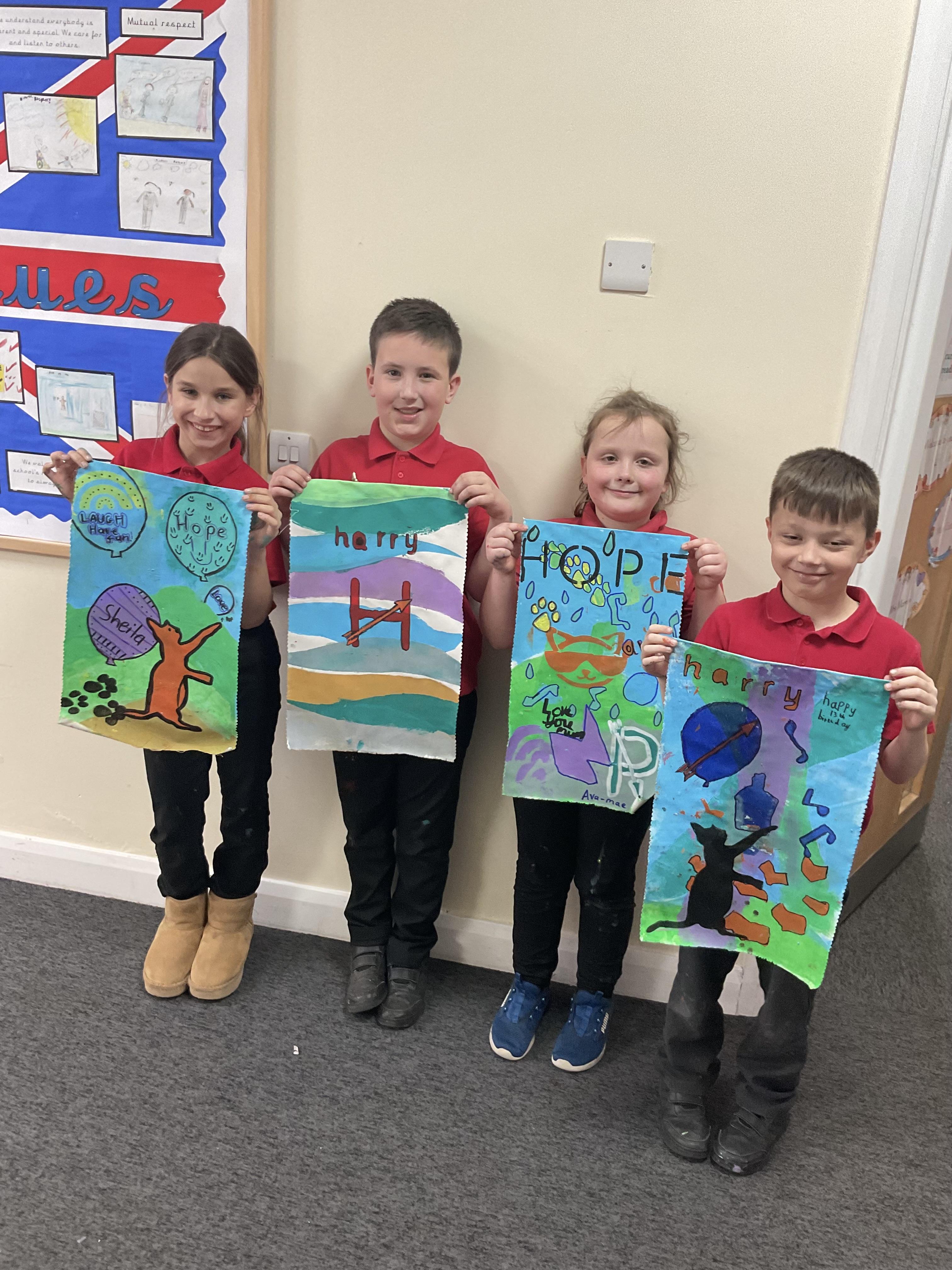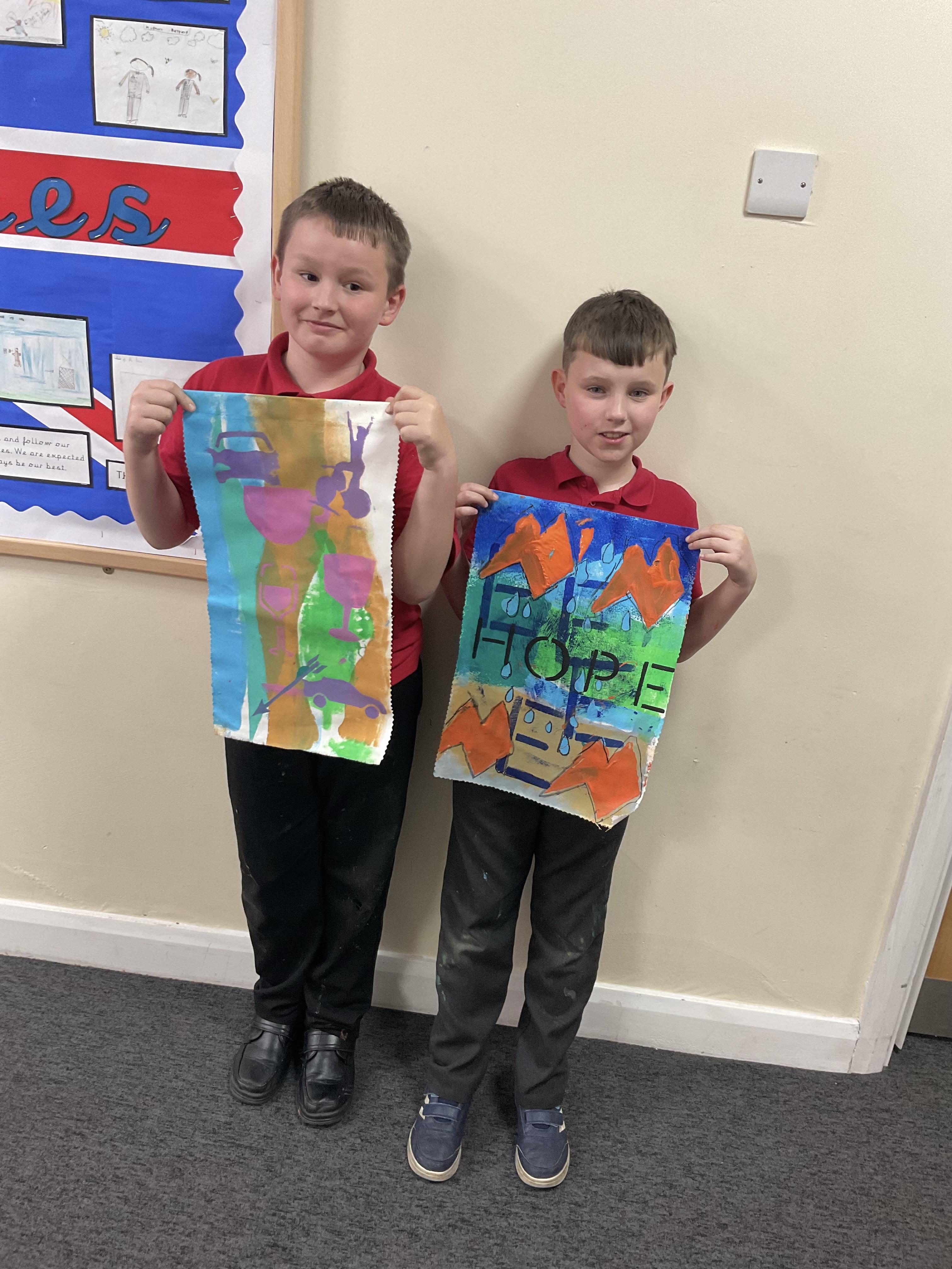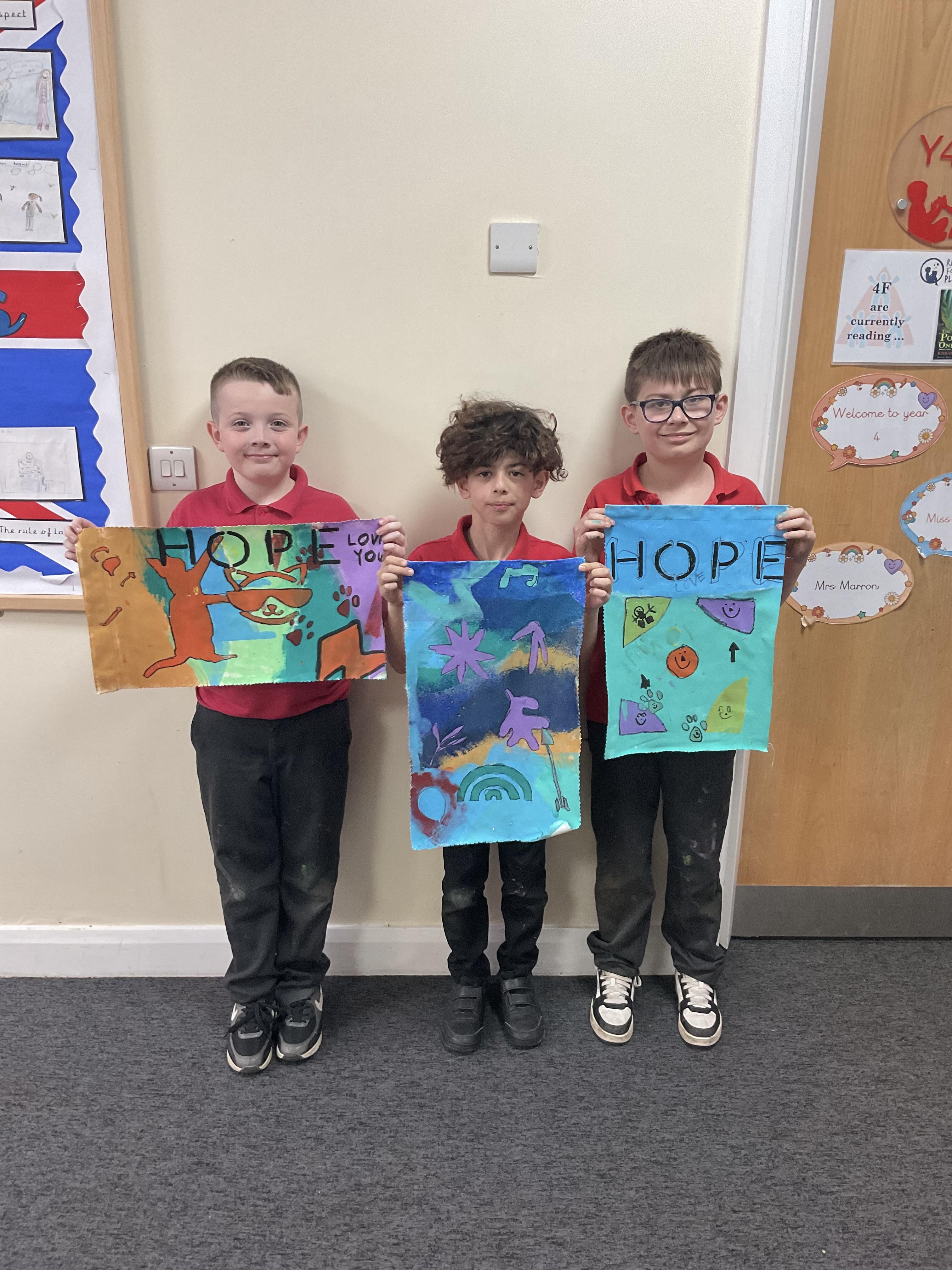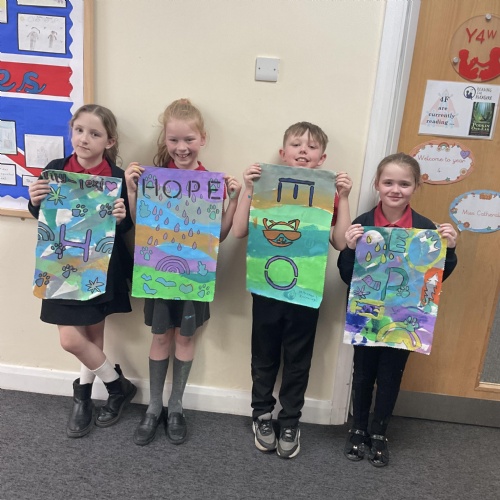 We created our own little canvas' by printing and stencilling paints. We also created as a whole class a huge canvas which will be hung up in the hall that spells out our motto HOPE.