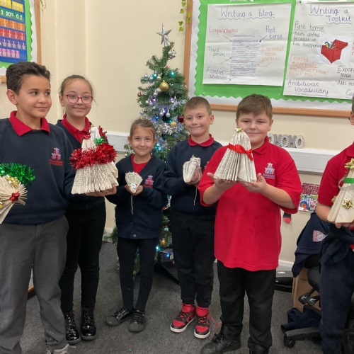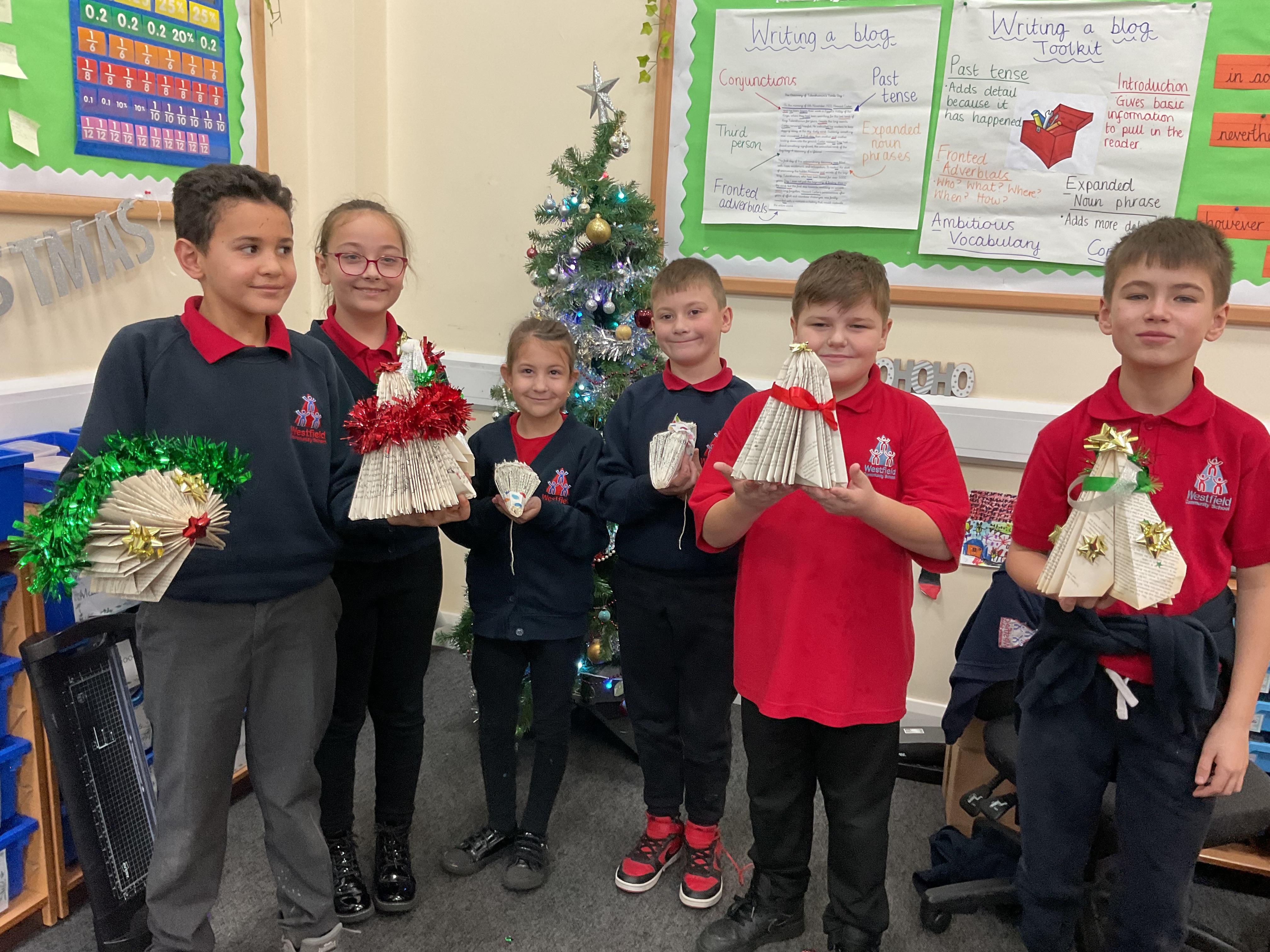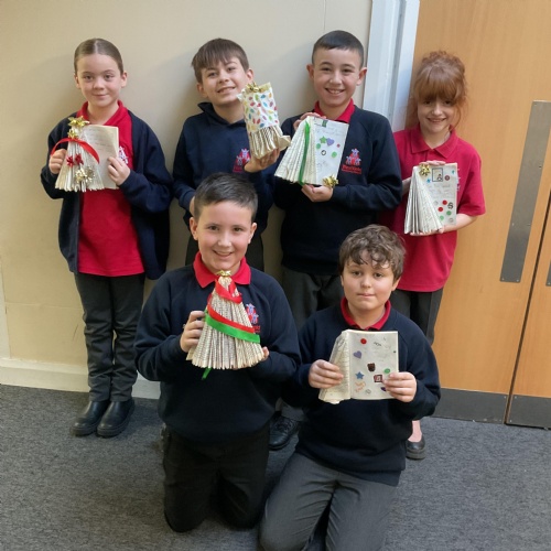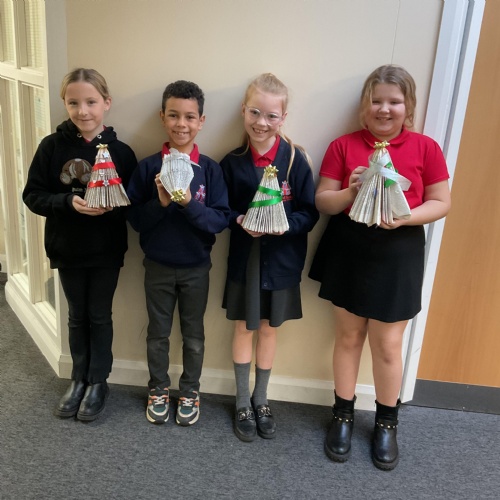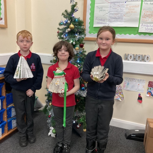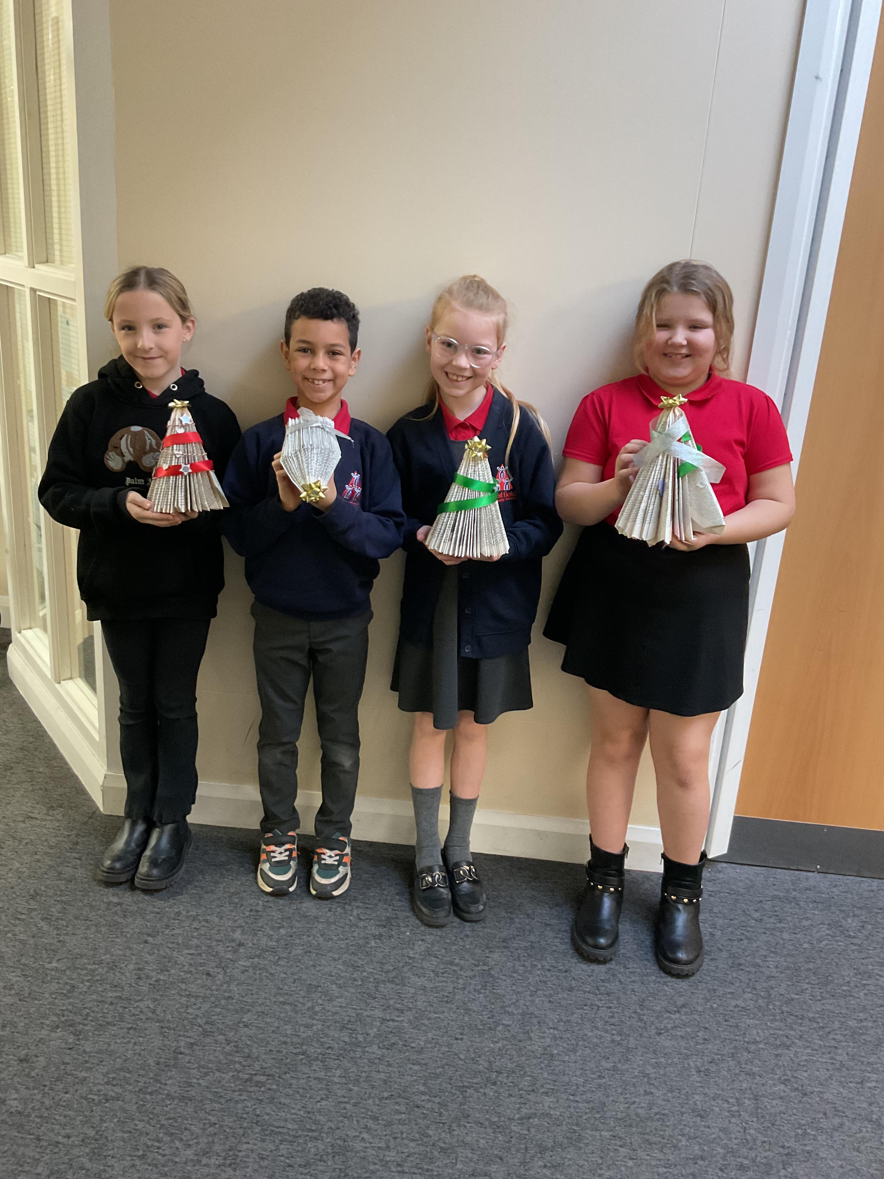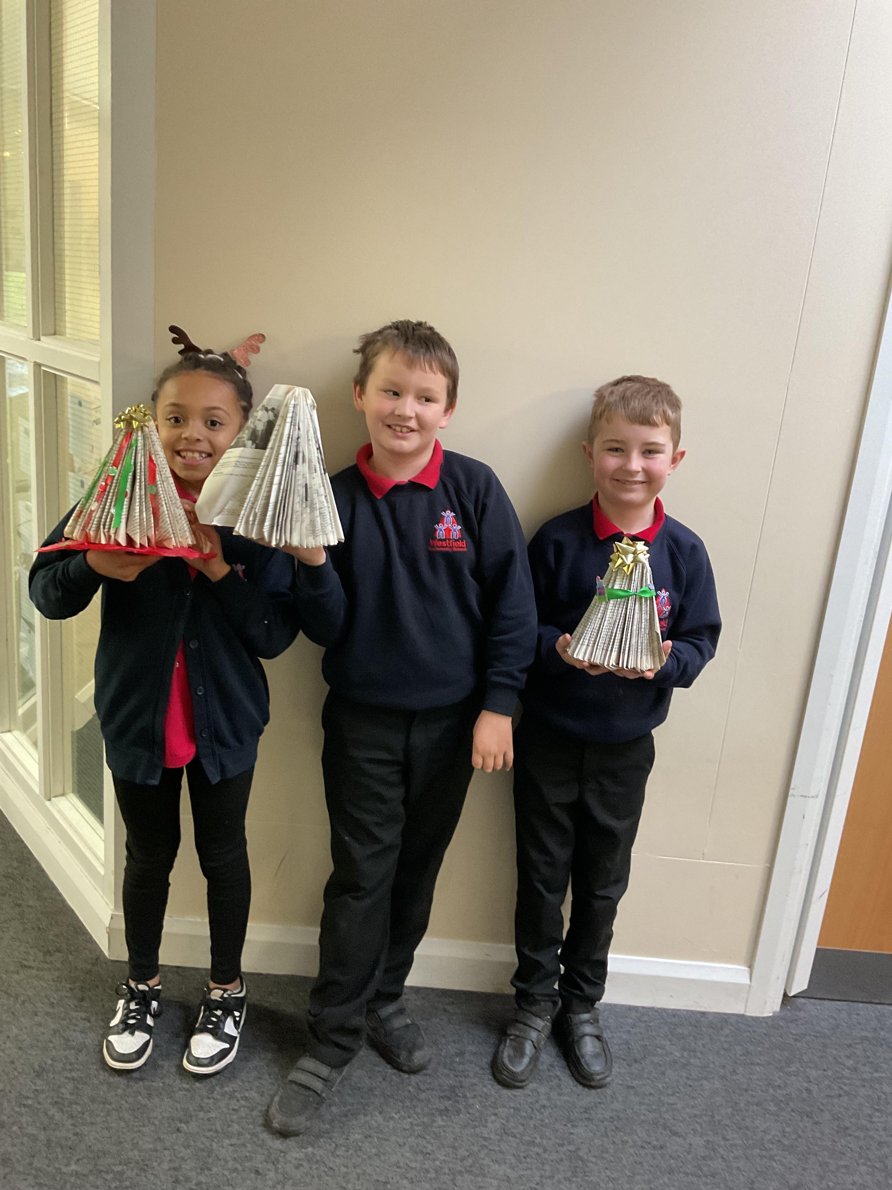 One of our activities this week was a visit from Ellen Hardaker from Wigan council who did some beautiful chrismas book folding. We created Christmas trees from old books and recycled them into stunning pieces of art work.