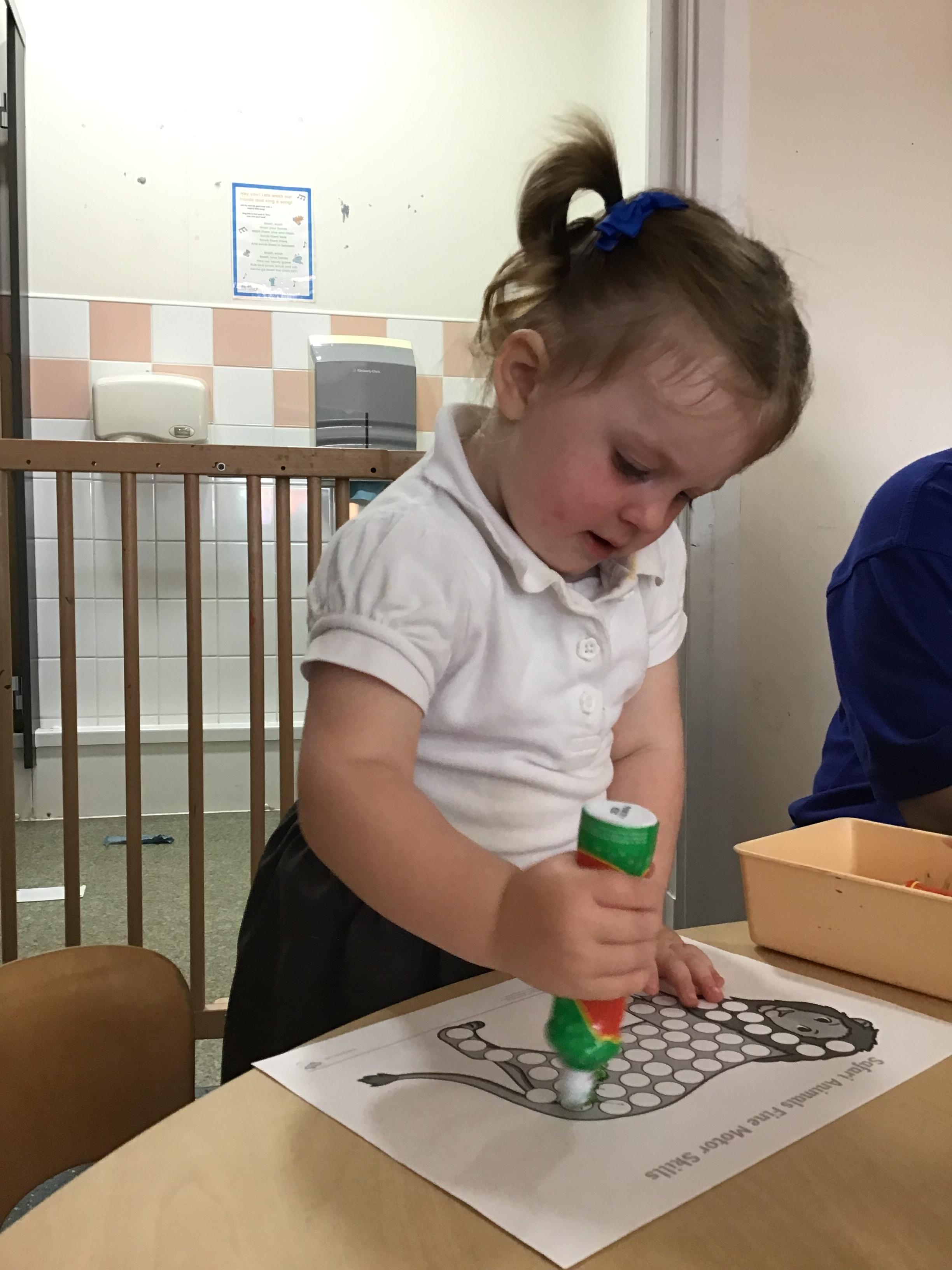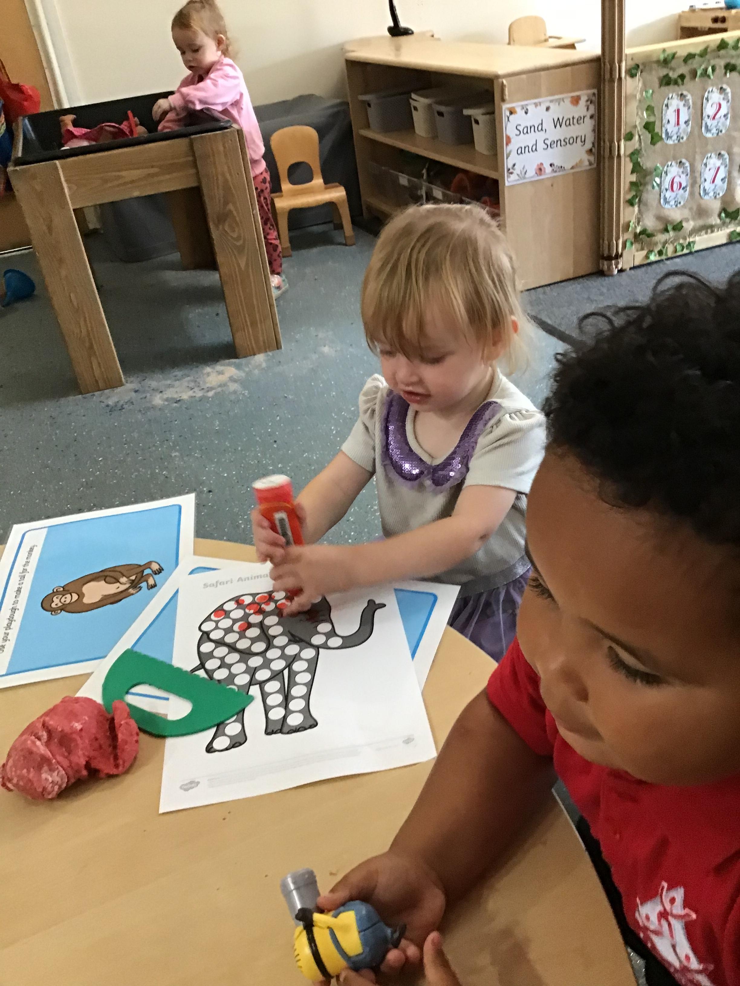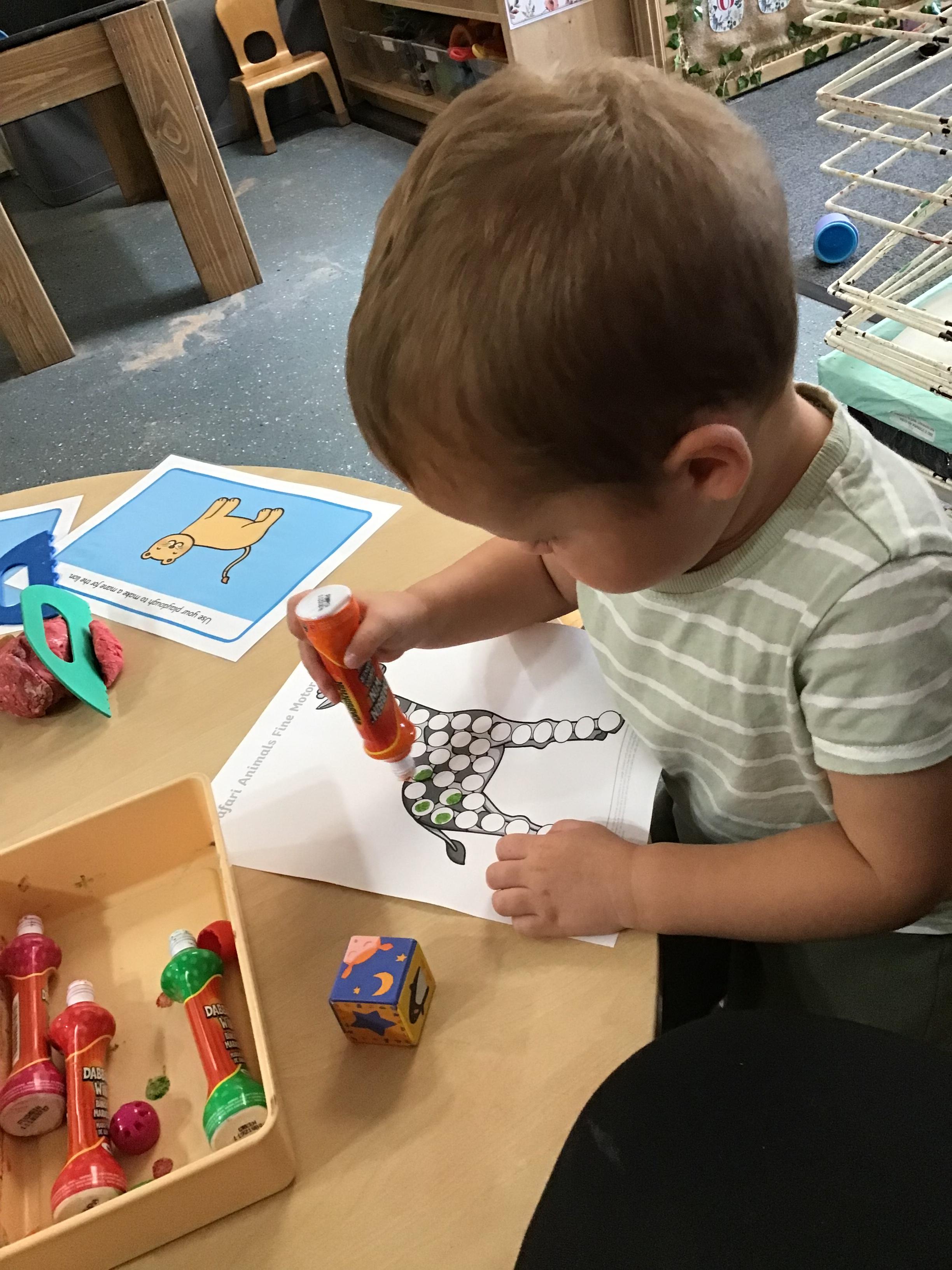 Developing our fine motor skills, using bingo dabbers to fill the dots on the animal pictures