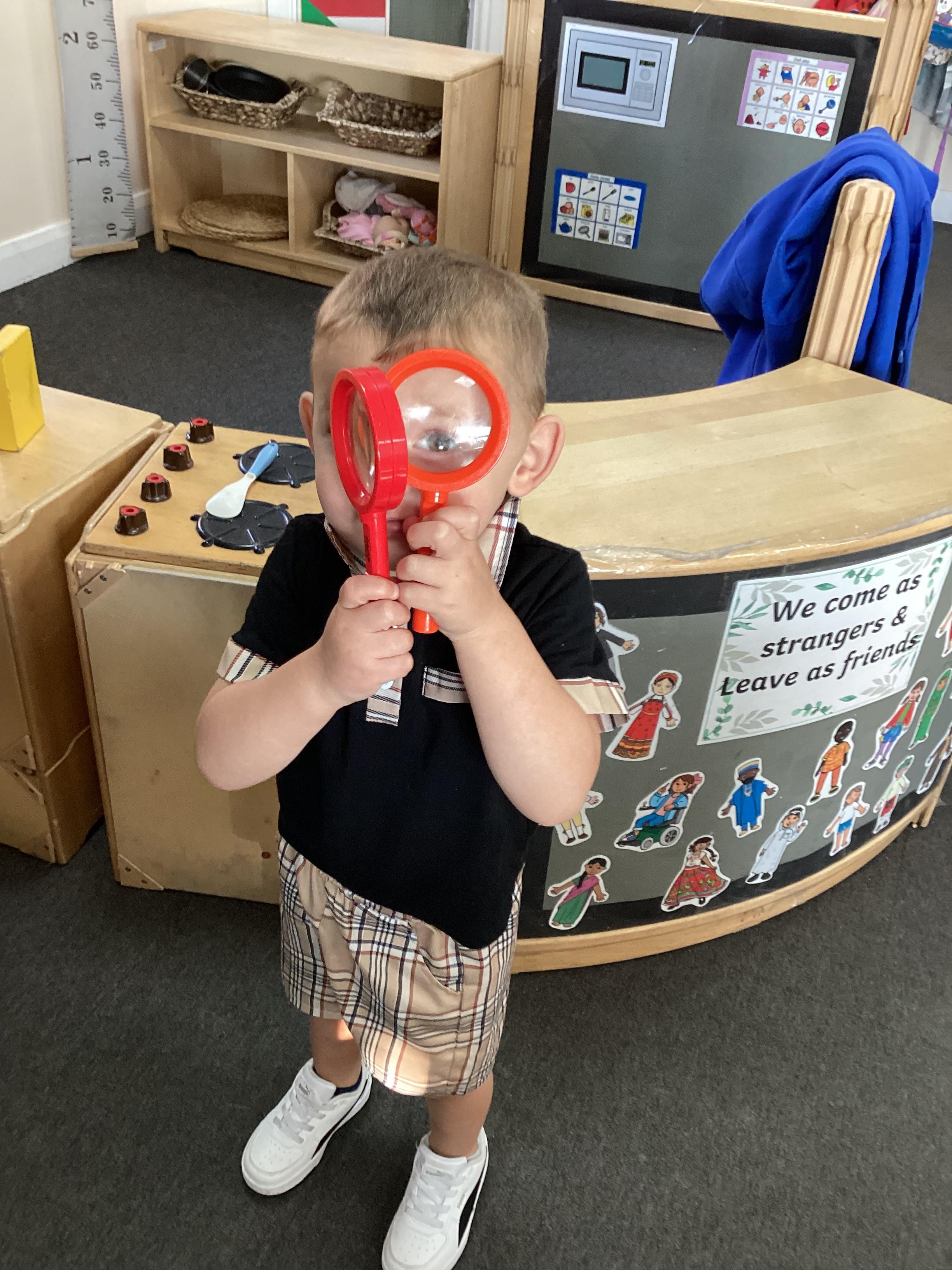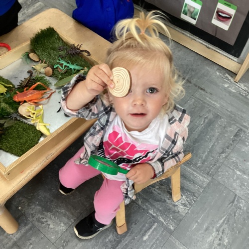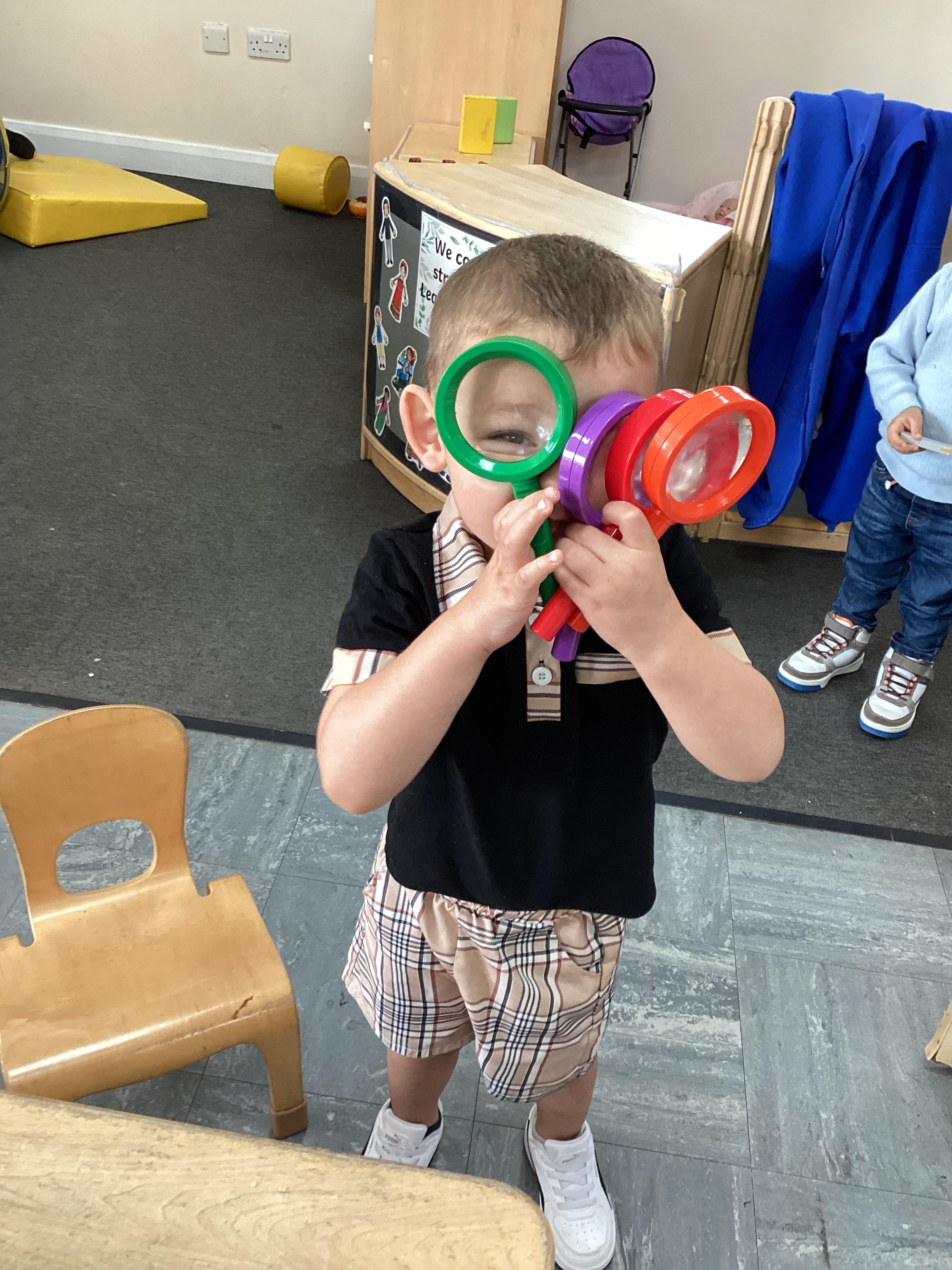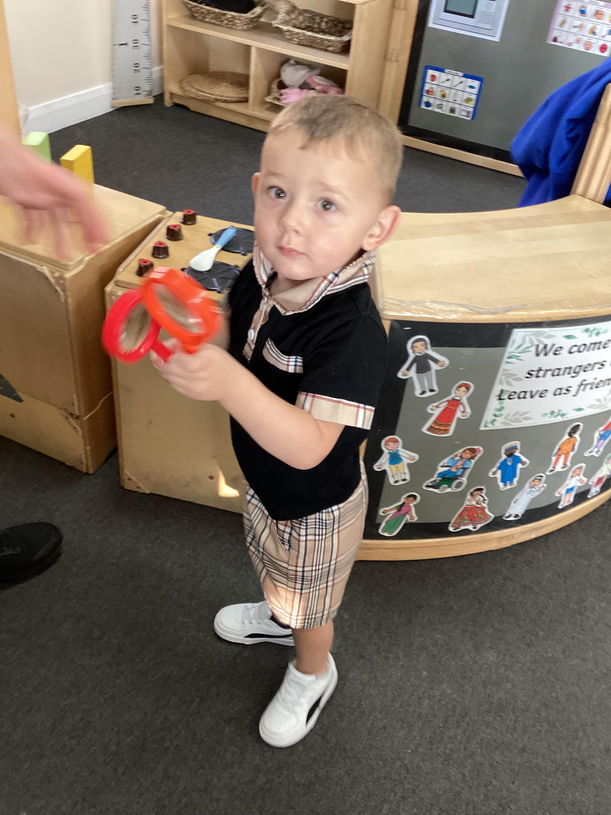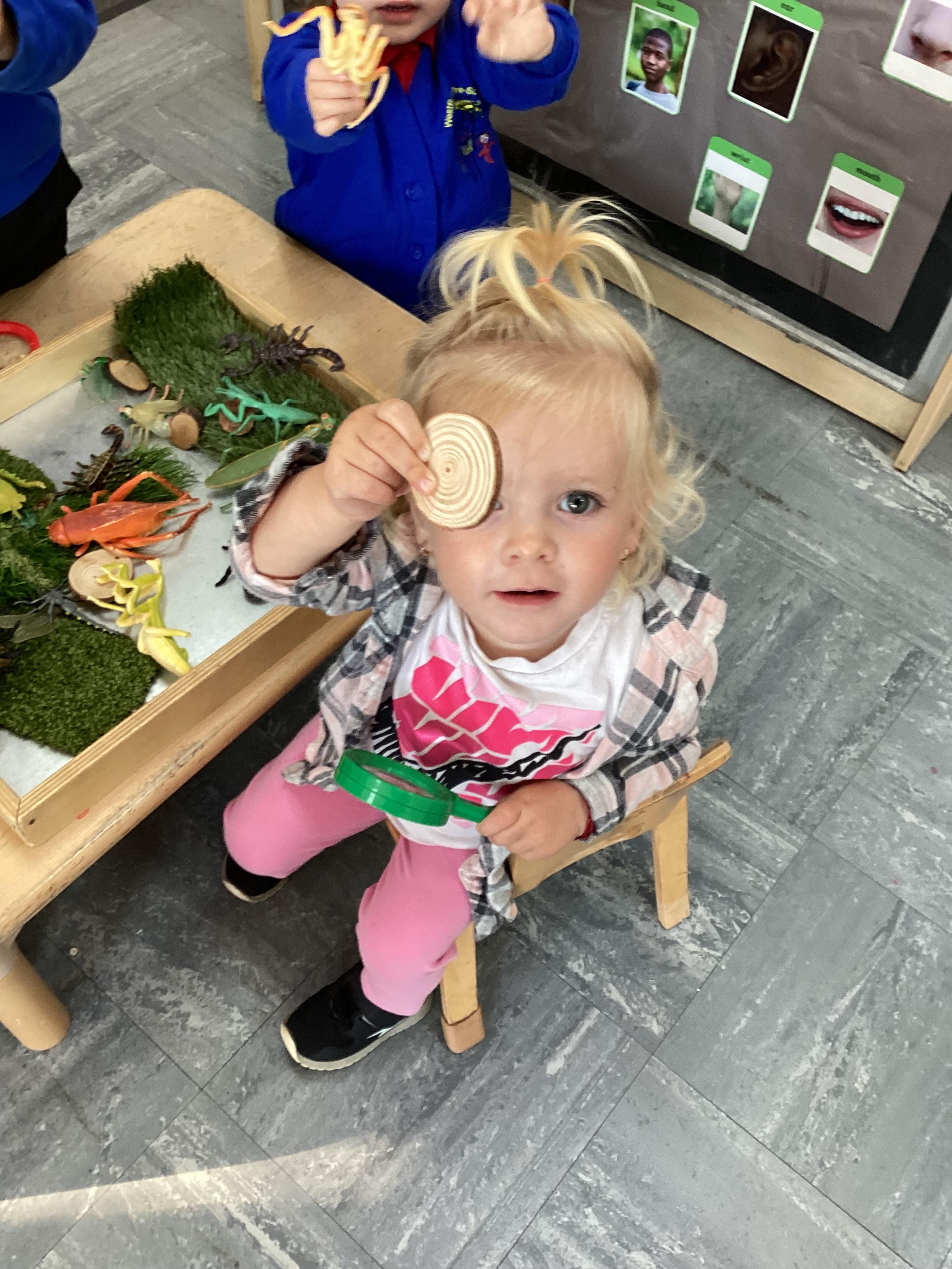 The children really enjoy playing and exploring using the magnifying glasses whilst looking at the bugs/insects in the tray. They enjoy putting the insects on their heads and chasing and tickling their friends![]()