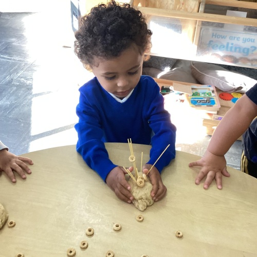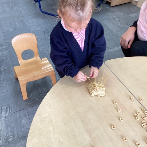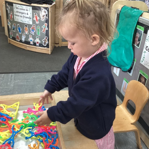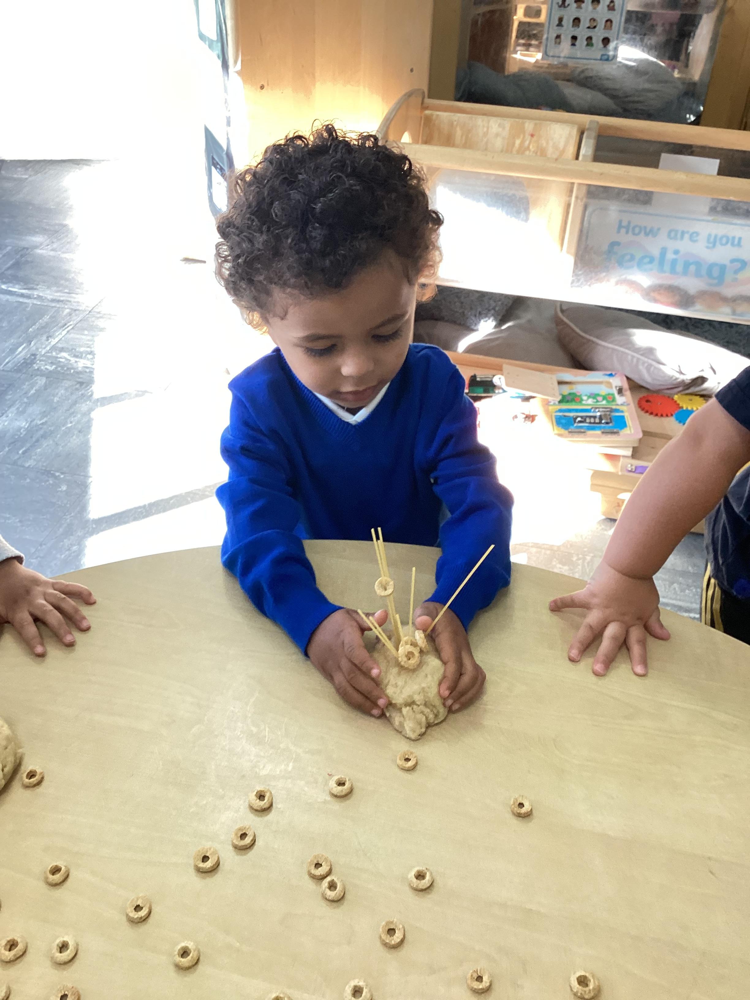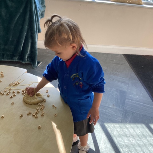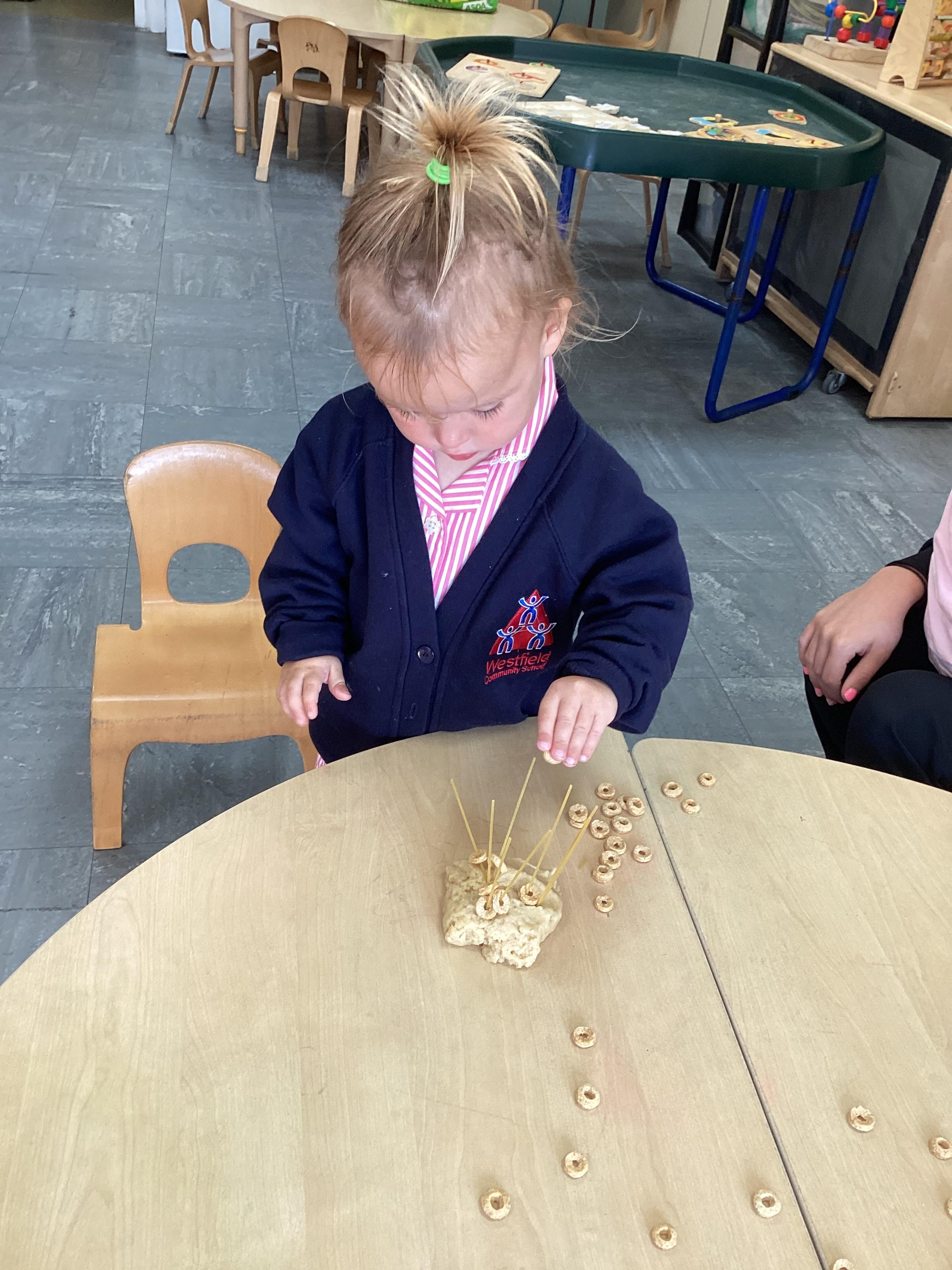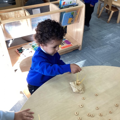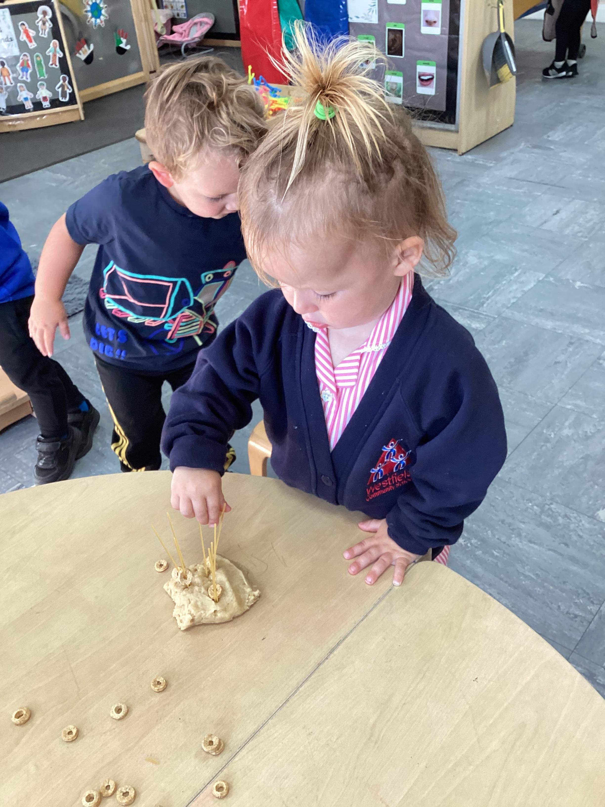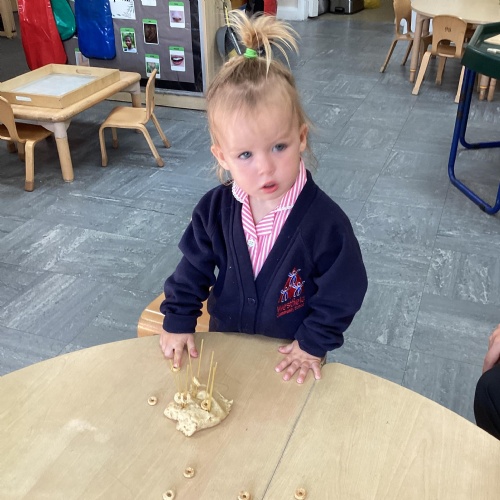 This week we have focused on our fine motor skills by using cheerio's to thread onto spaghetti. We have also used the coloured connecting acrobats to help develop these skills too. The children enjoyed making crowns/hats with these with some adult support![]()