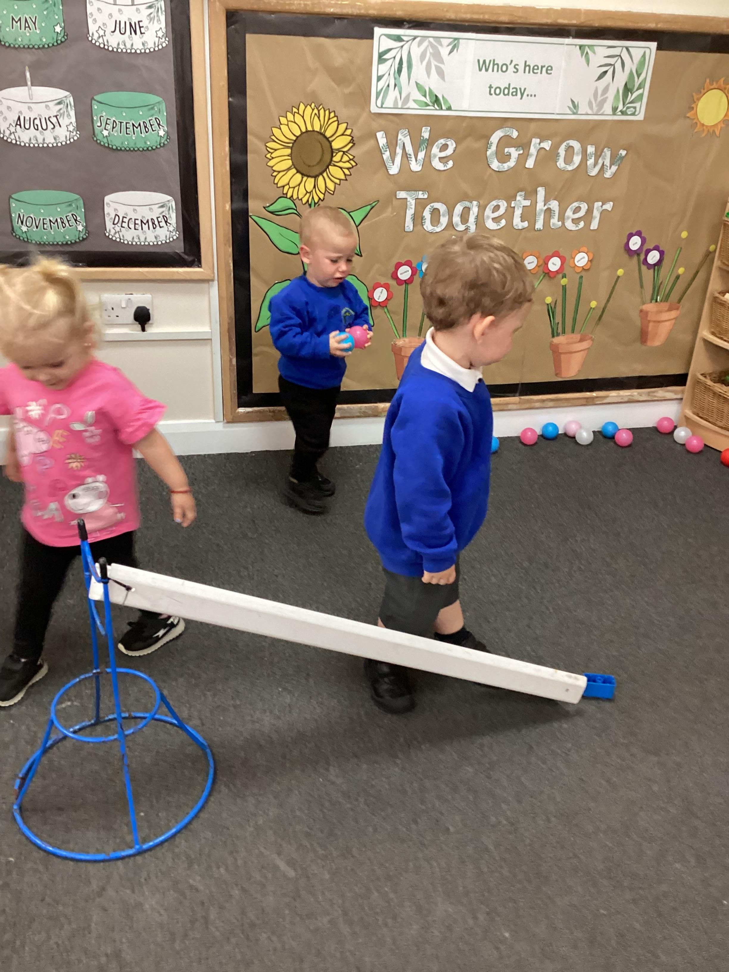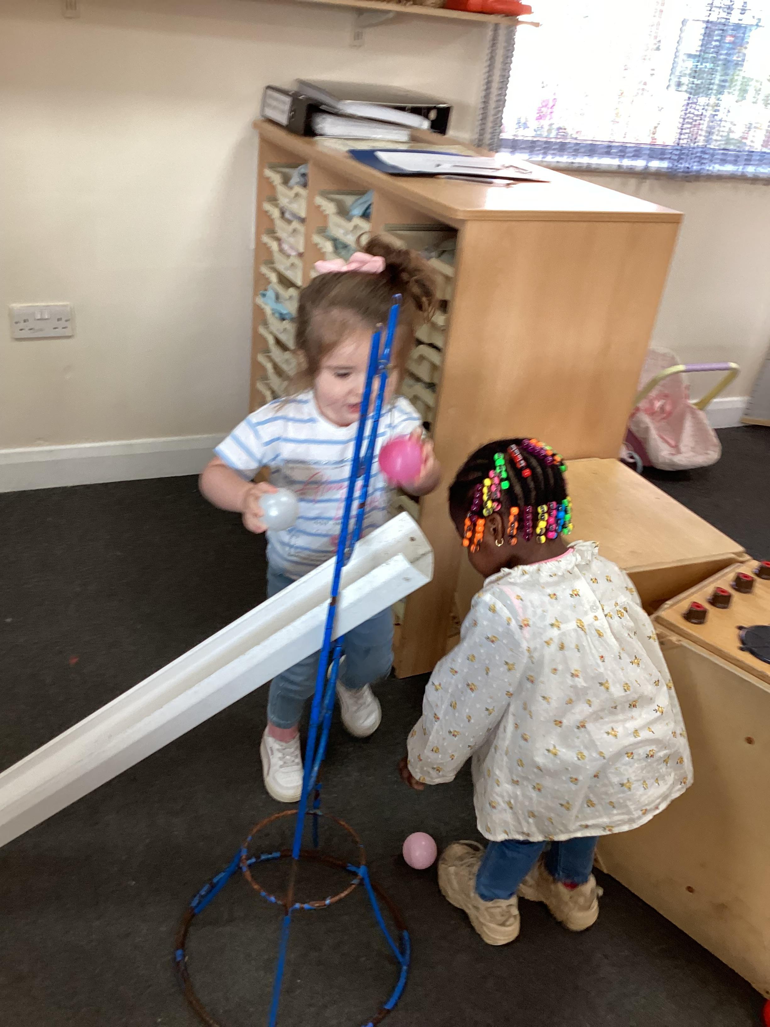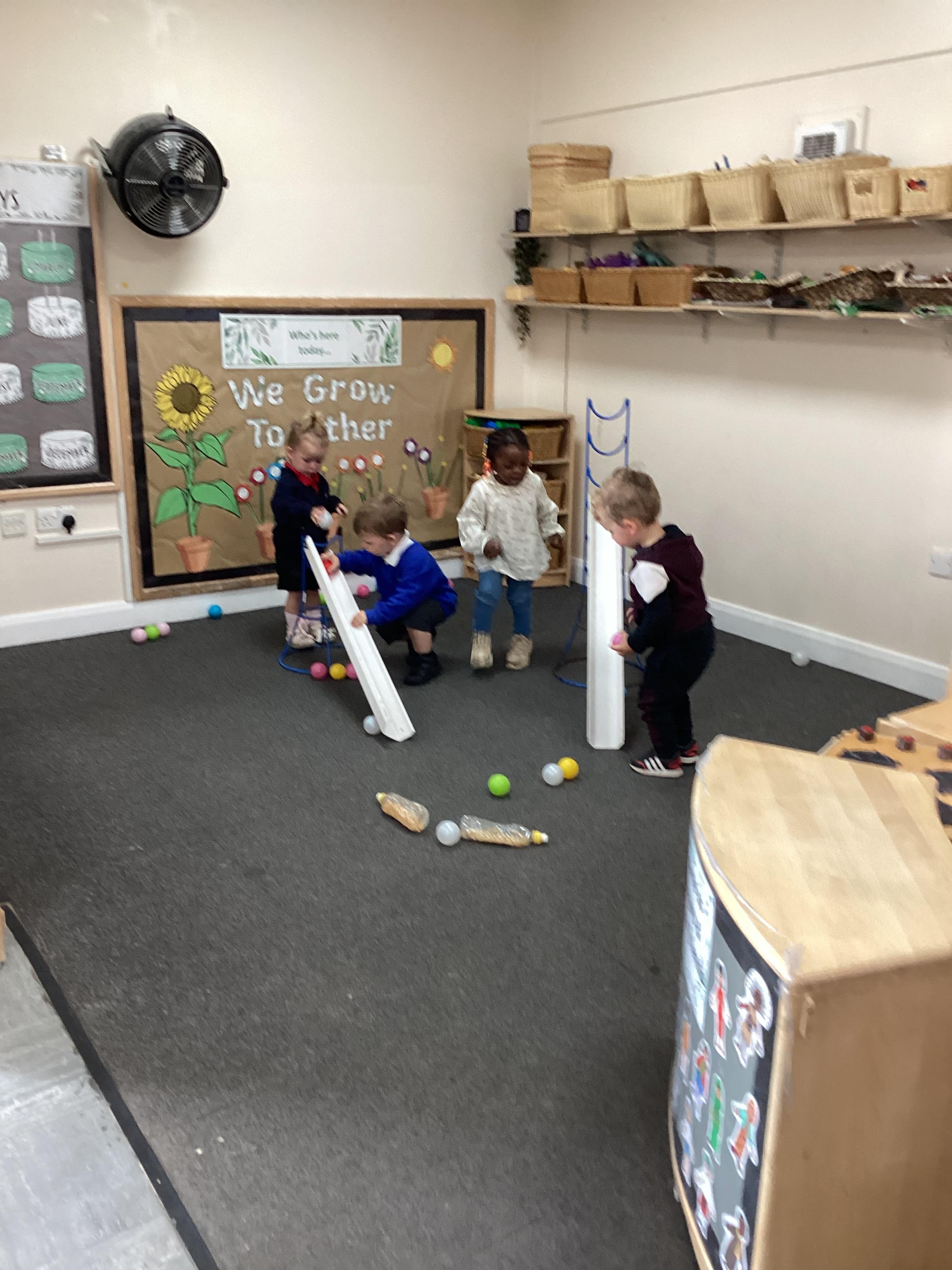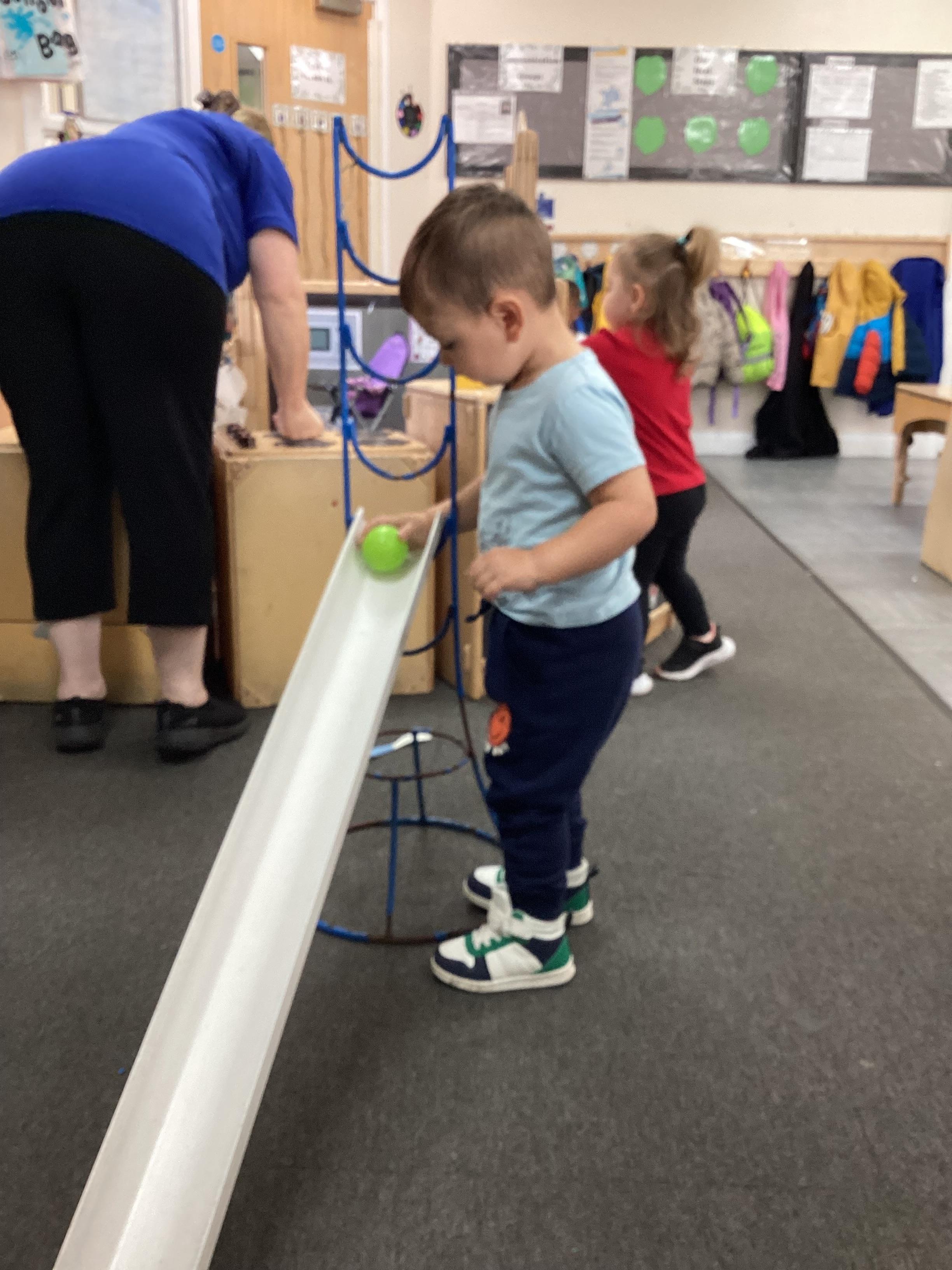 Today we enjoyed playing with the balls/guttering, the children took turns rolling the balls and even started to identify the colours of the balls! They enjoyed shouting "ready steady go" and using counting when rolling the balls. We are so proud with the way they have all settled into nursery