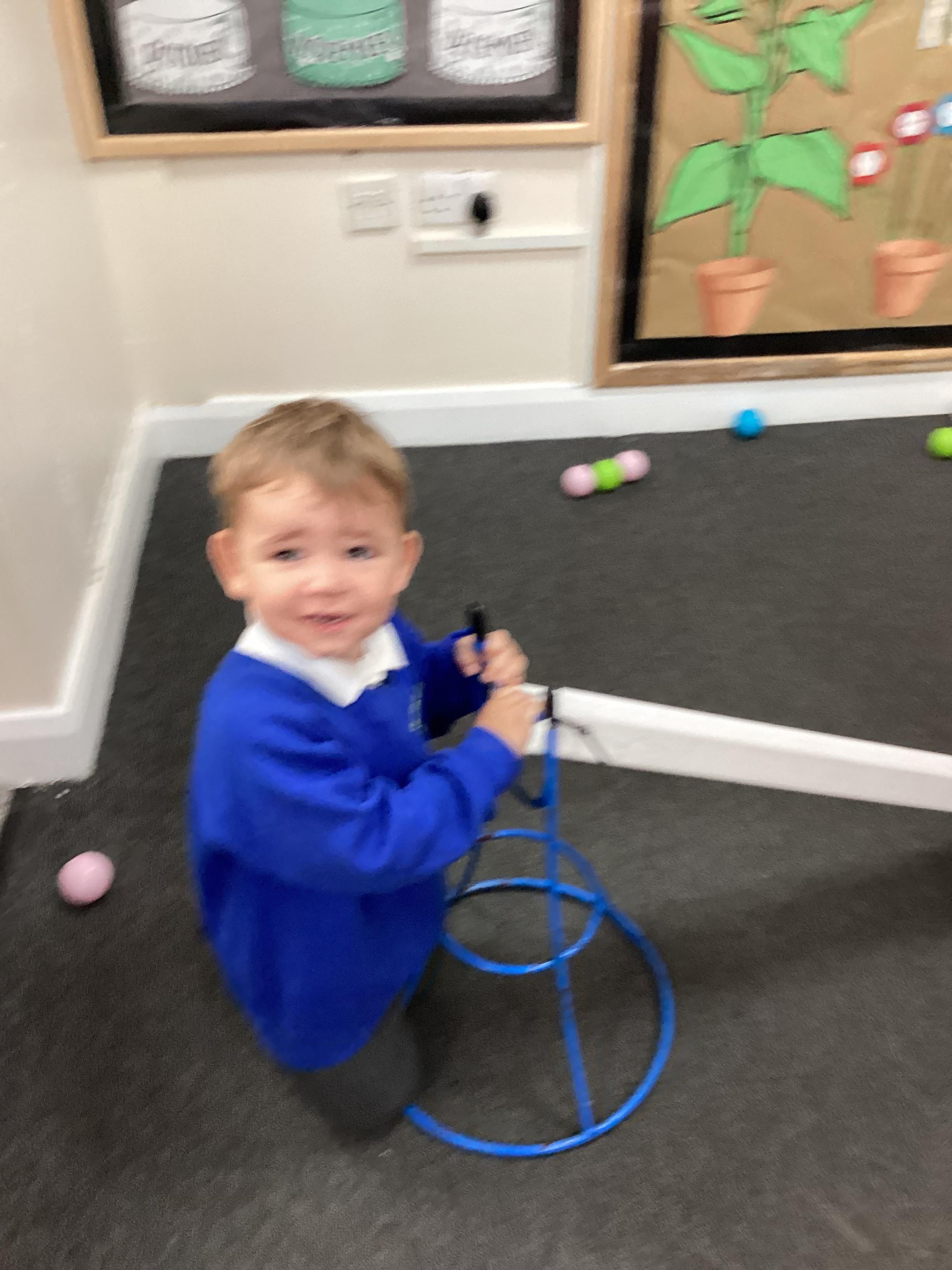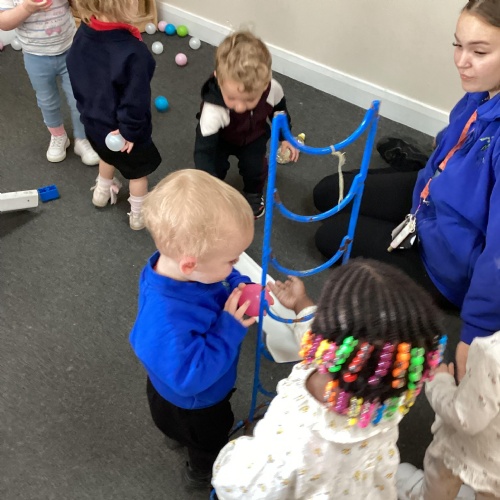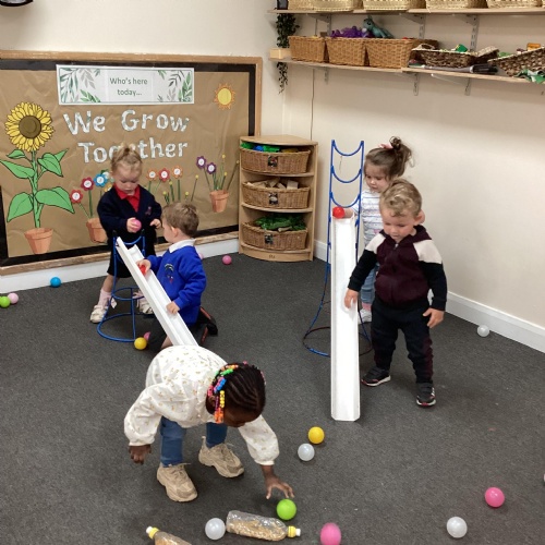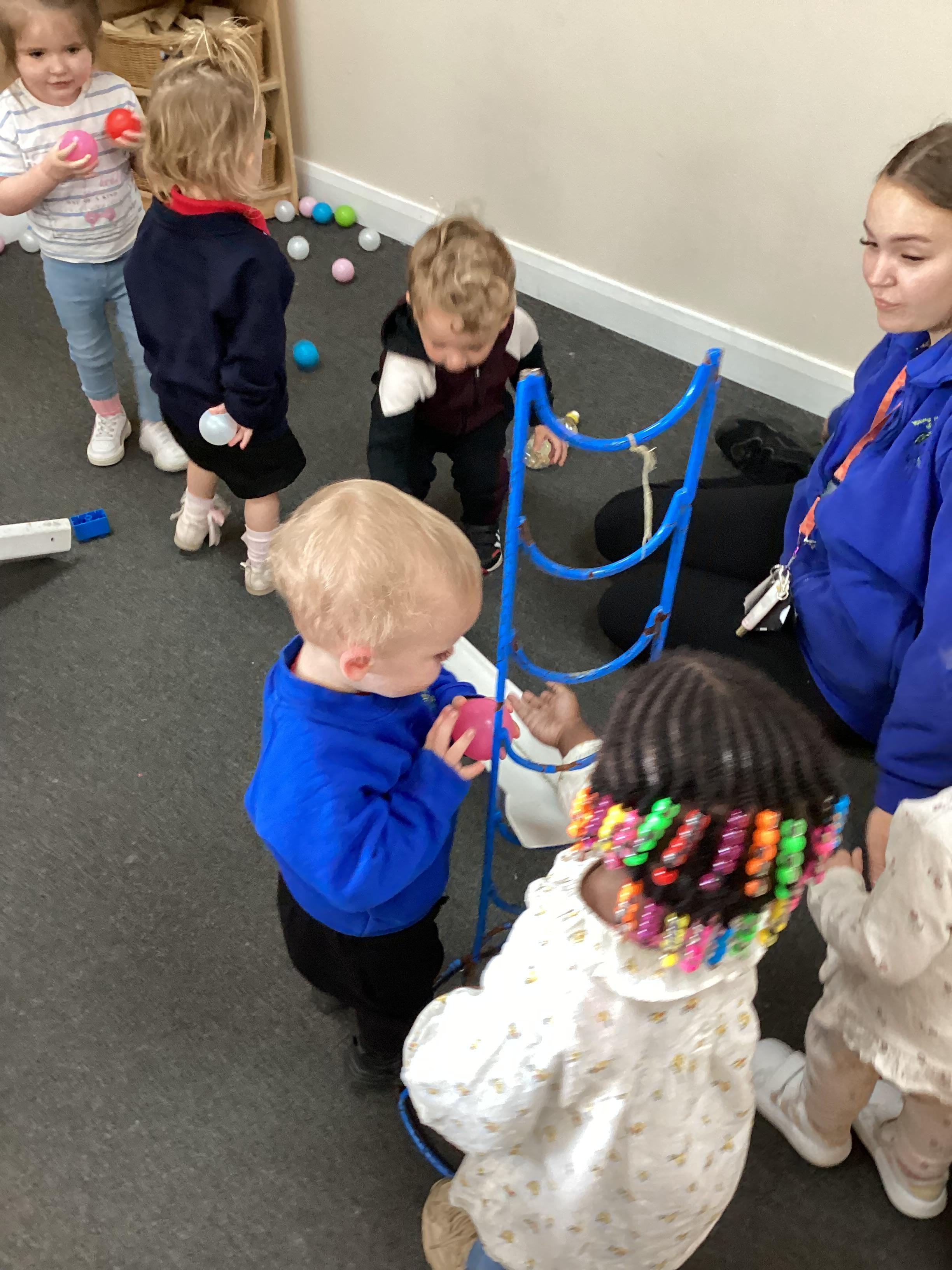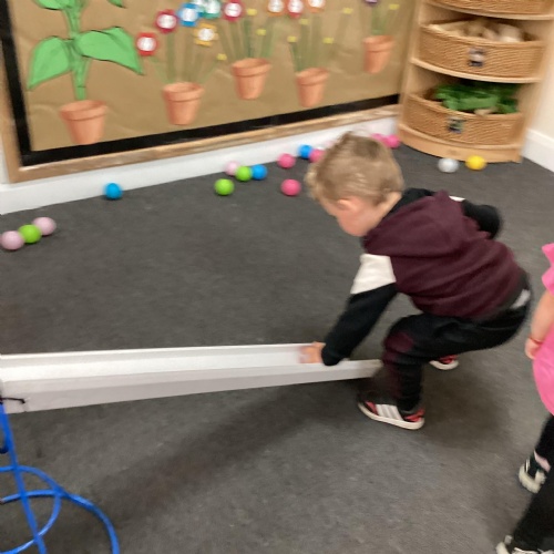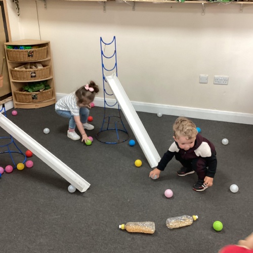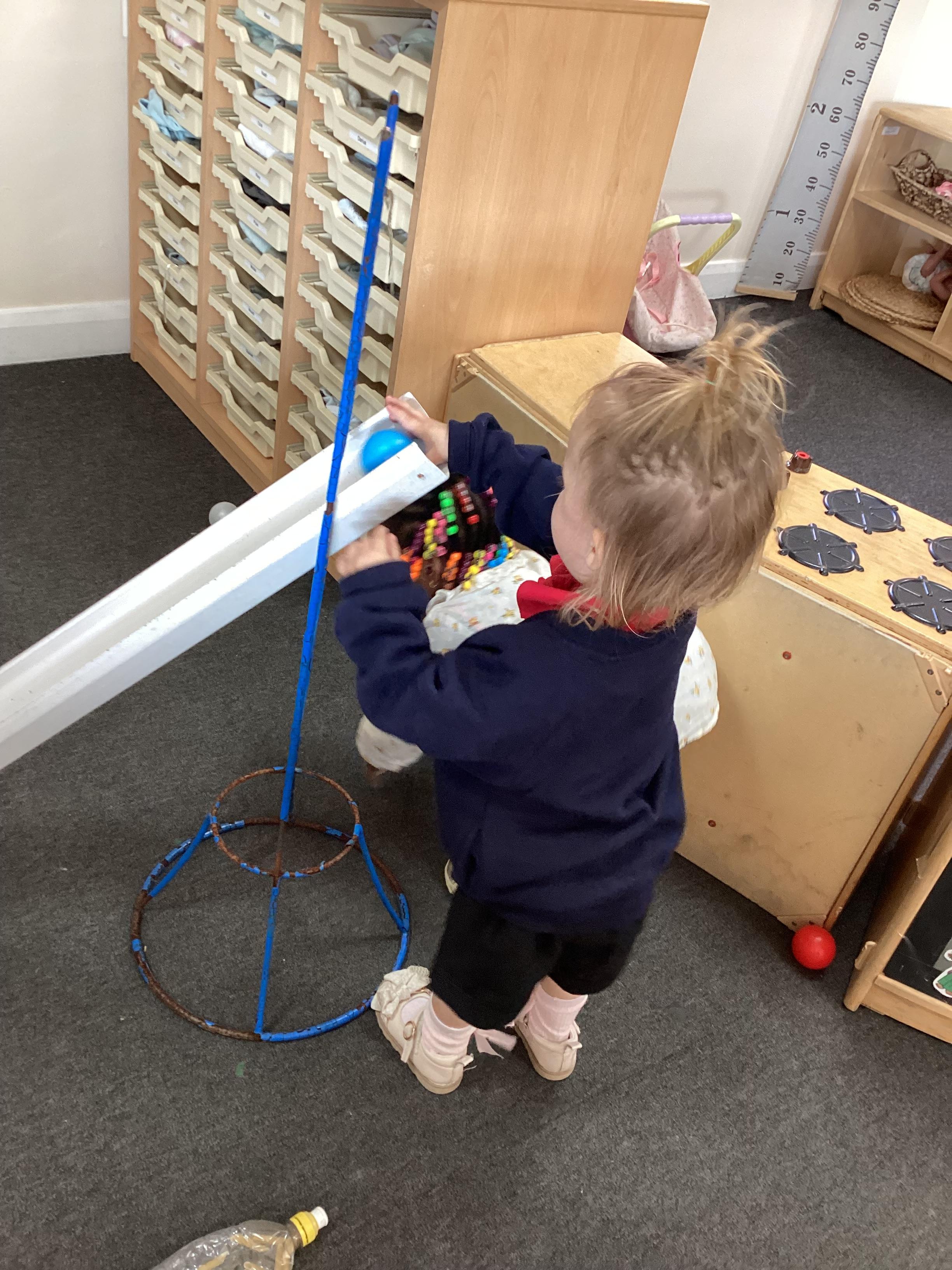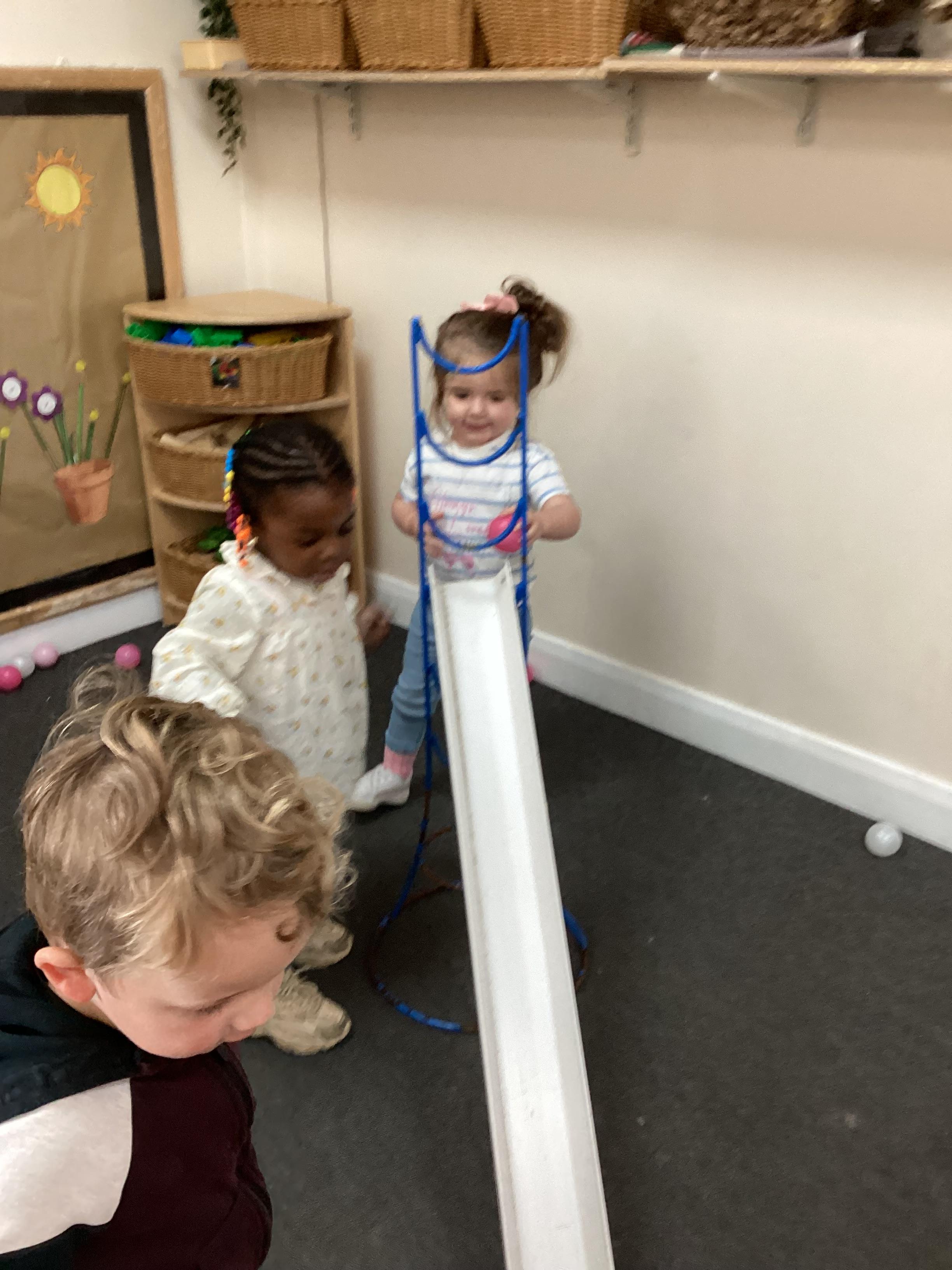 Today we enjoyed playing with the balls/guttering, the children took turns rolling the balls and even started to identify the colours of the balls! They enjoyed shouting "ready steady go" and using counting when rolling the balls. We are so proud with the way they have all settled into nursery