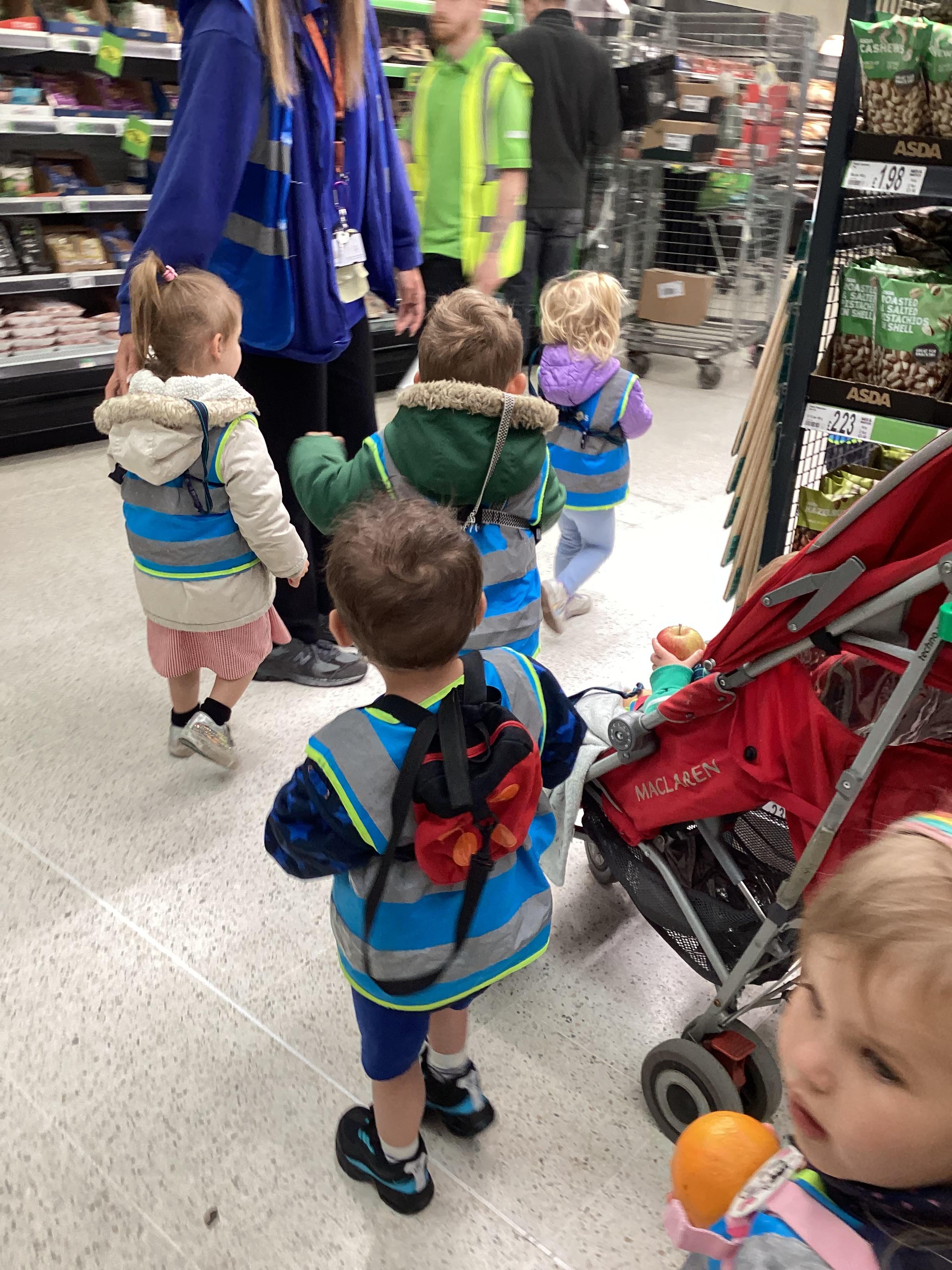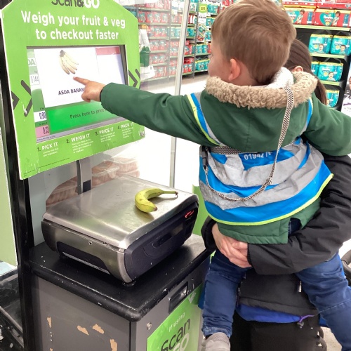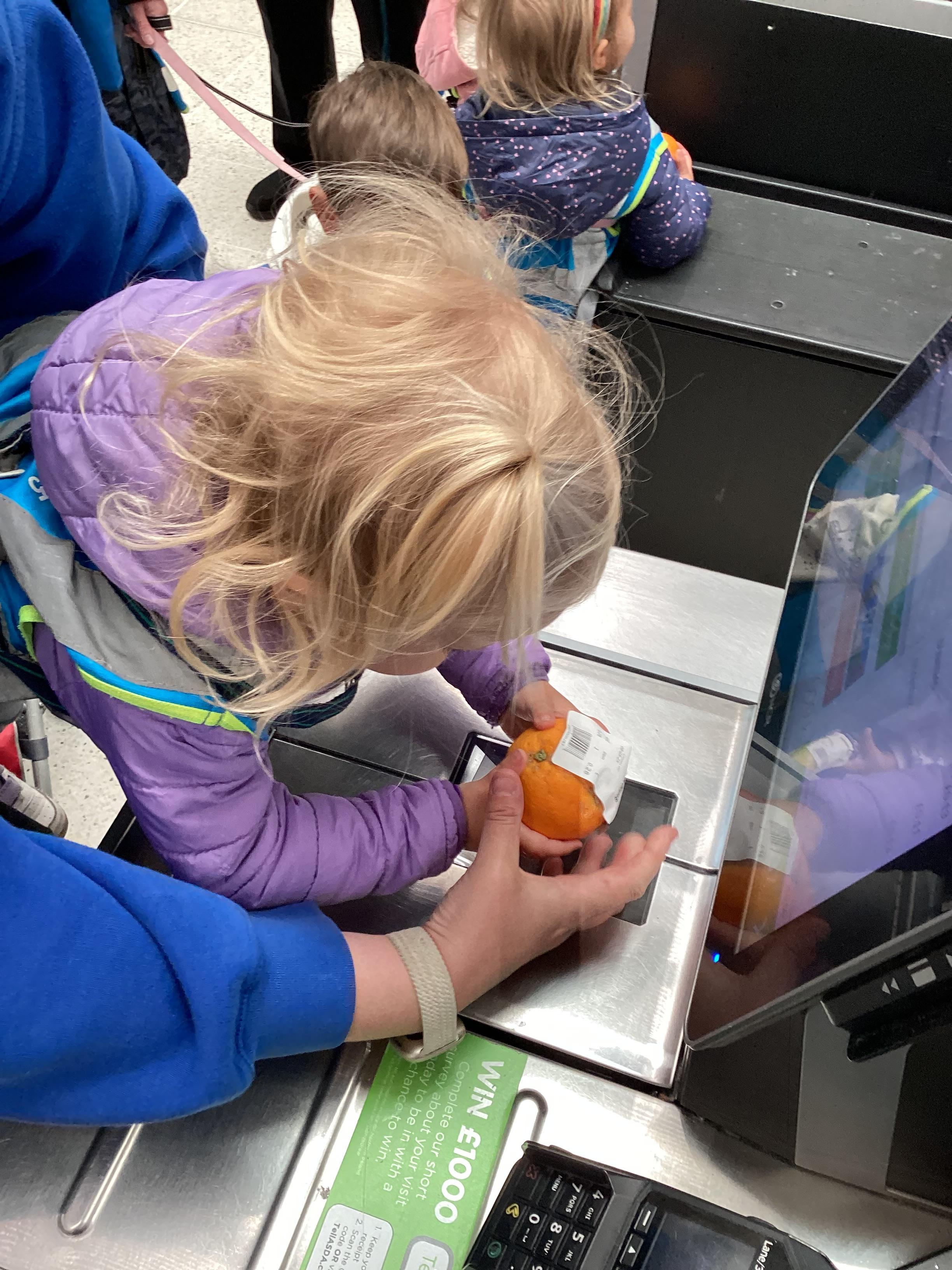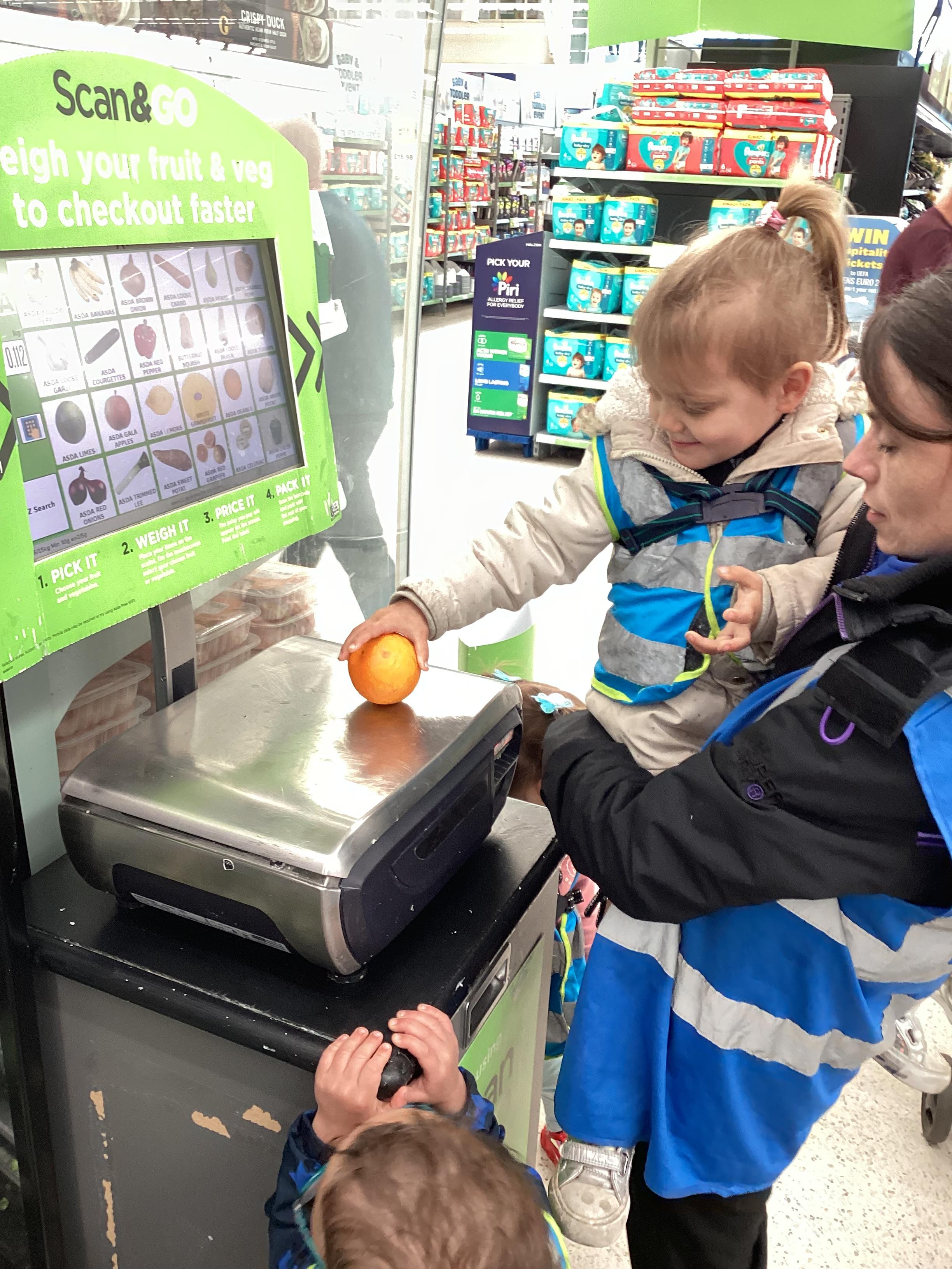 Today we walked down to Asda to choose our own fruit to eat as part of our Hungry Caterpillar theme. The children chose their own piece of fruit, weighed them on the scales and then they scanned them at the till. The children were very well behaved and they had a great time.