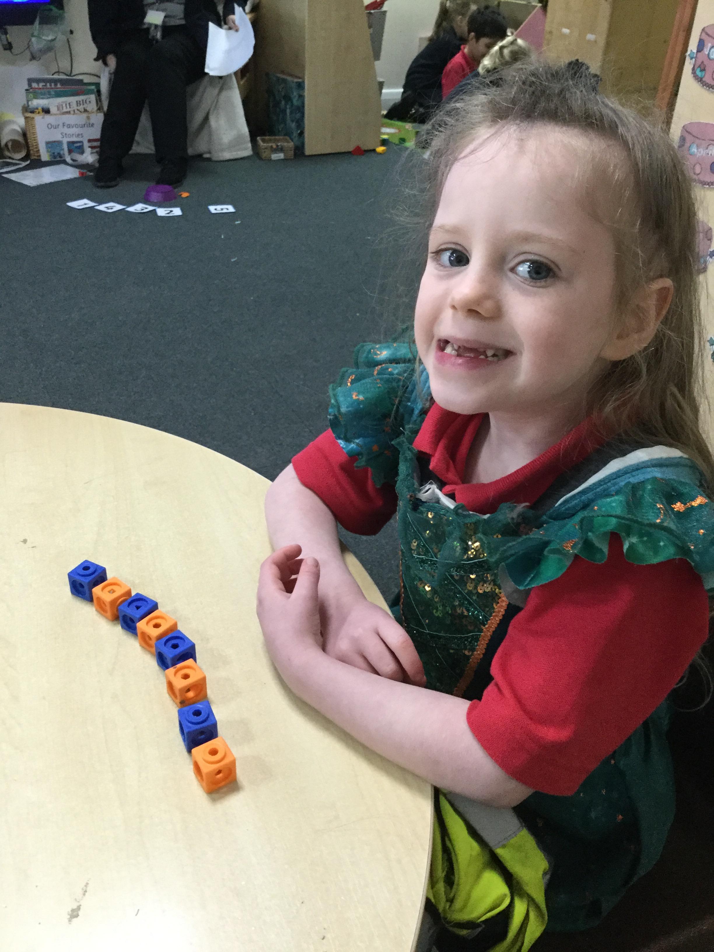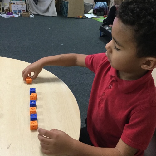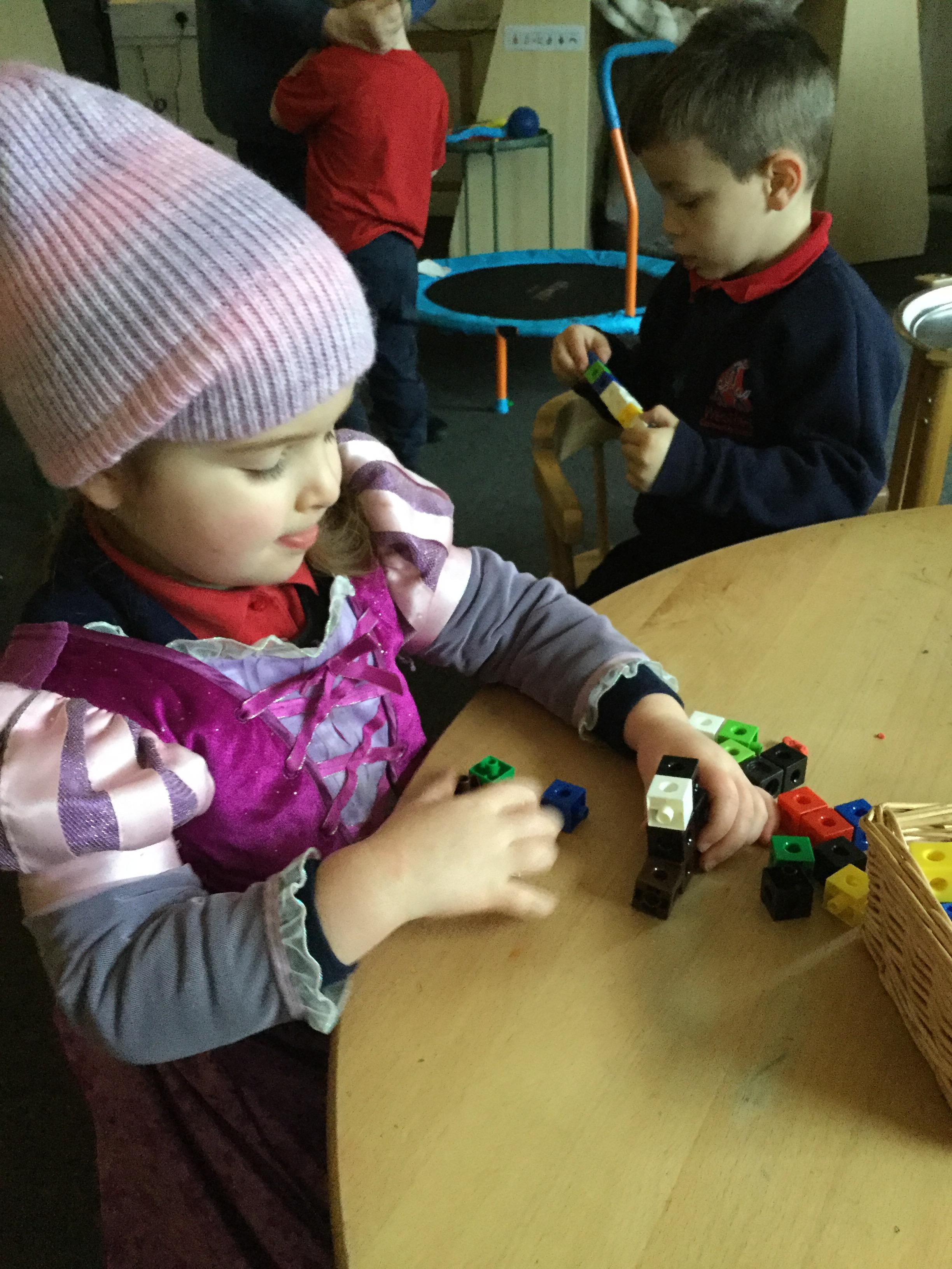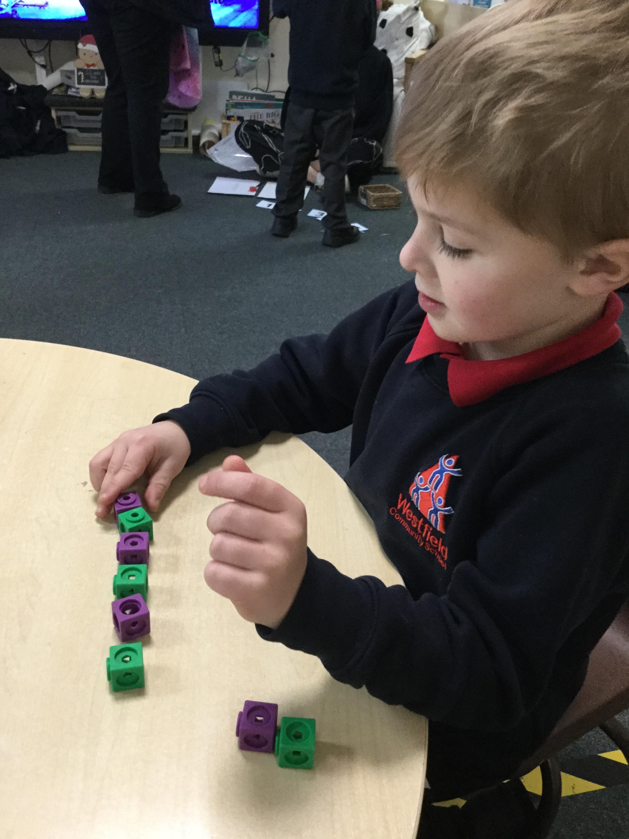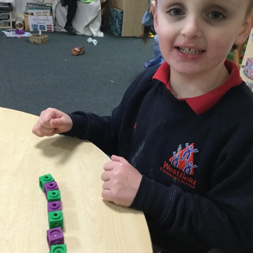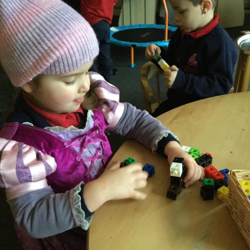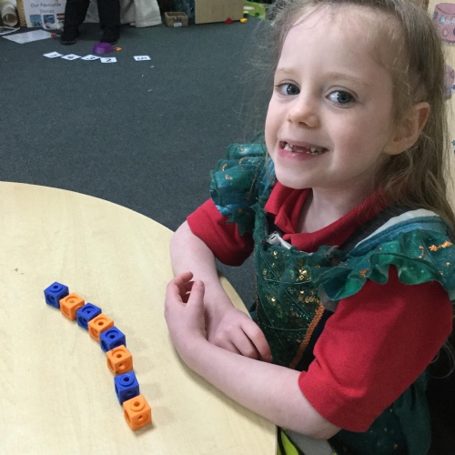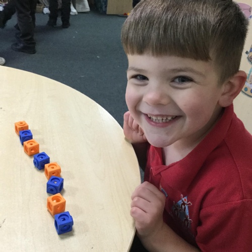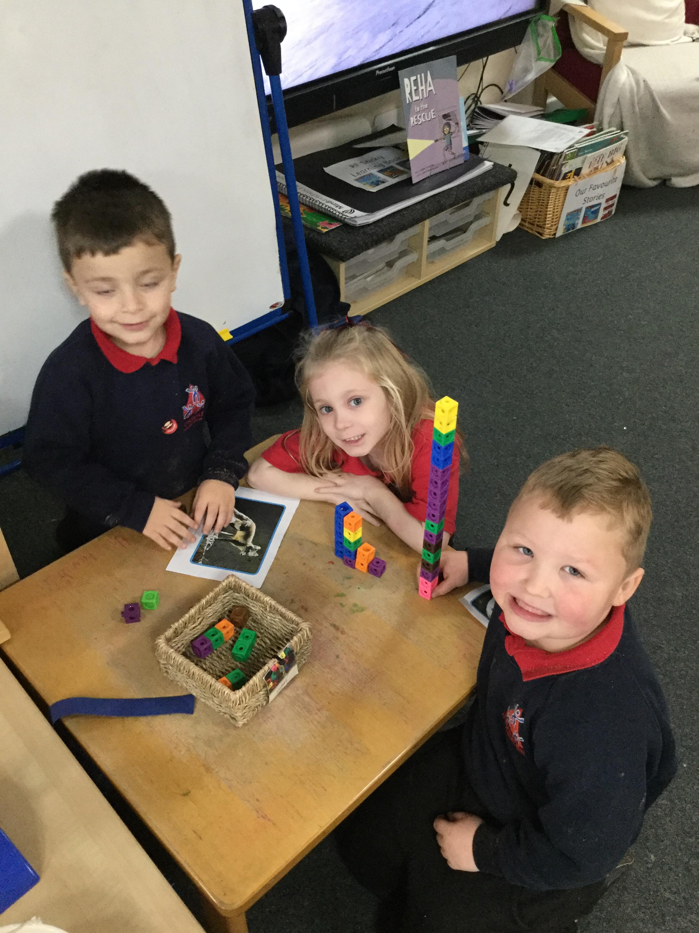 In maths, we have been working with numbers 4 and 5, we have subitised, sorted amounts, looked at numerals and matched quantities to it. We have played fast fingers to match an amount and showed the correct number of fingers on one hand. Using coloured blocks we made repeating patterns. We have looked at circles and squares, we sorted shapes and described them. We looked at shape pictures and looked for circles and triangles in the pictures.