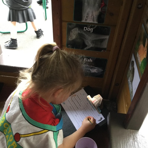 Our role play shed has been changed into a Veterinary Surgery. We have animals to look after and need to see why the animals are sick and write prescriptions. We've really enjoyed our new role play.