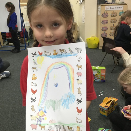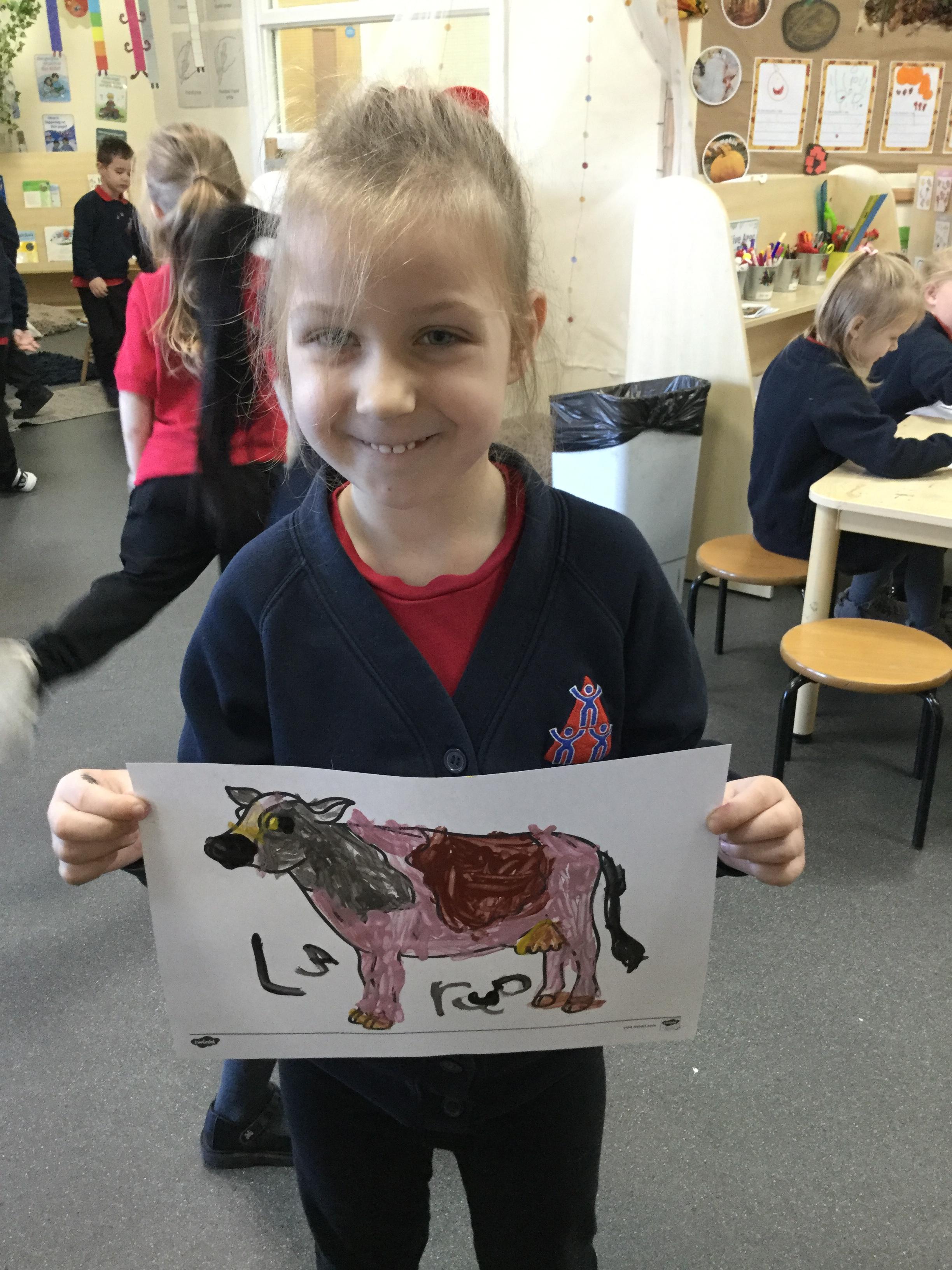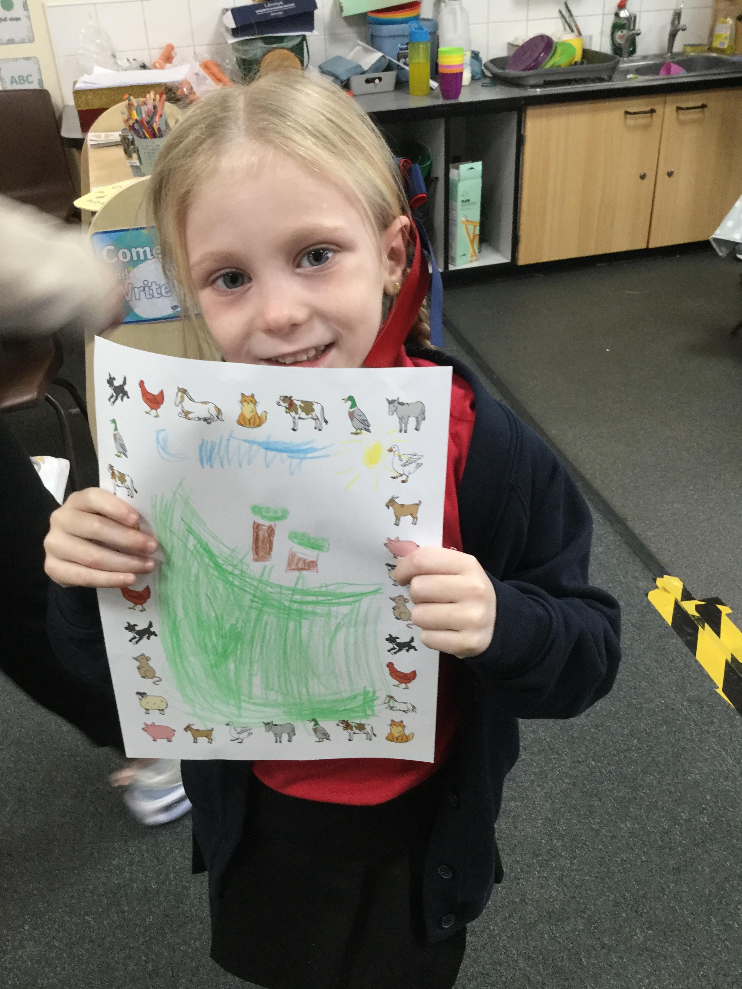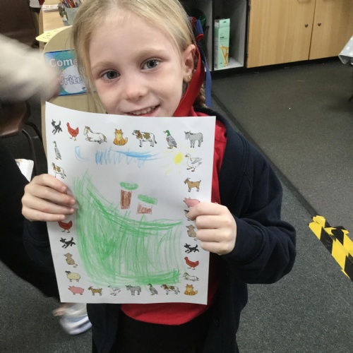 Our text this week has been 'On the Farm' by Axel Scheffler. In Literacy we have learned about farm animals. We have found out about different animals that live on a farm, we drew an animal and wrote what it is called. We thought about all the different foods we get from the farm, whether it is grown or something we get from the animals like milk or eggs. We wrote lists of the different foods we could think of that we can buy in a farm shop.
