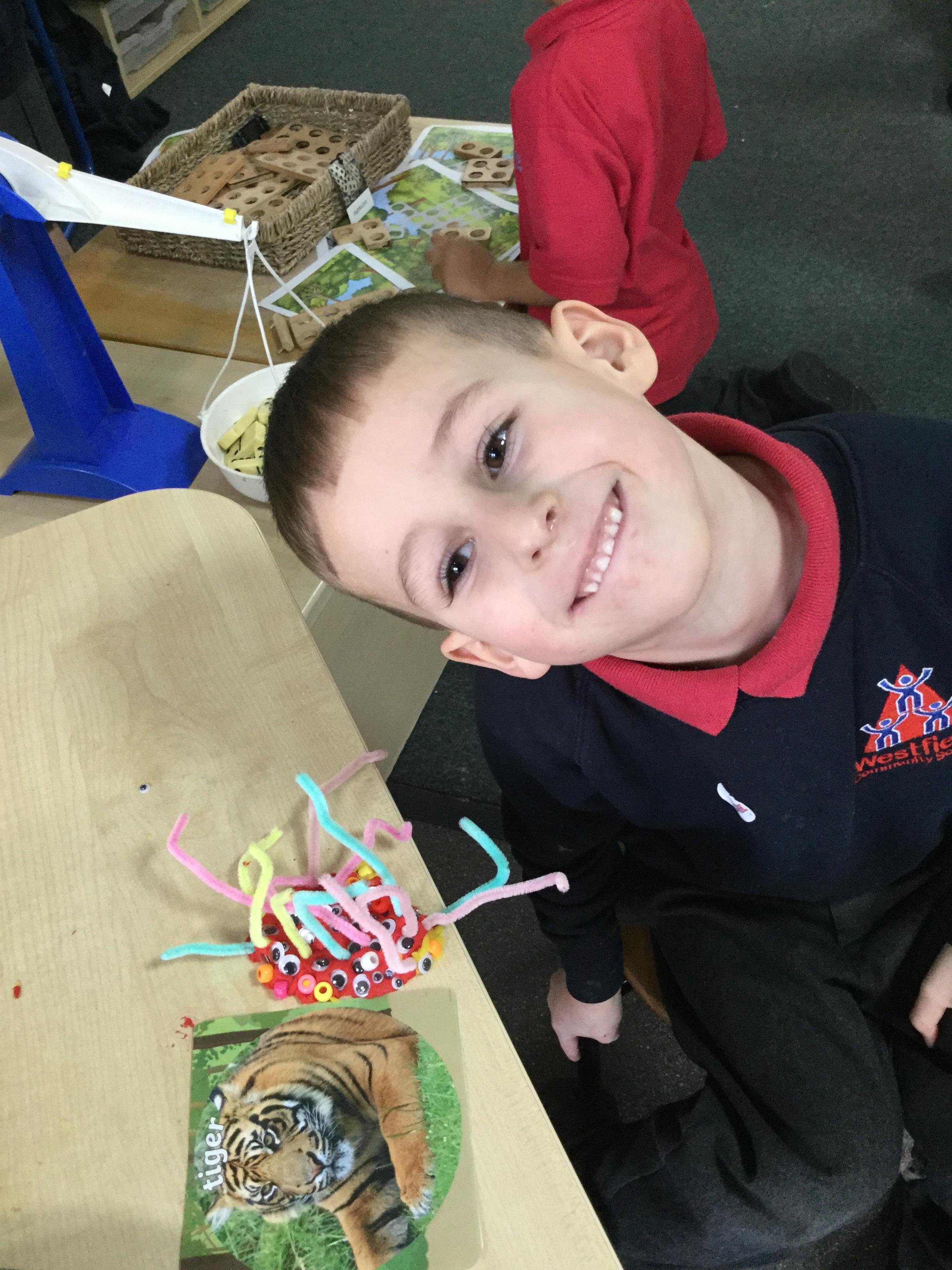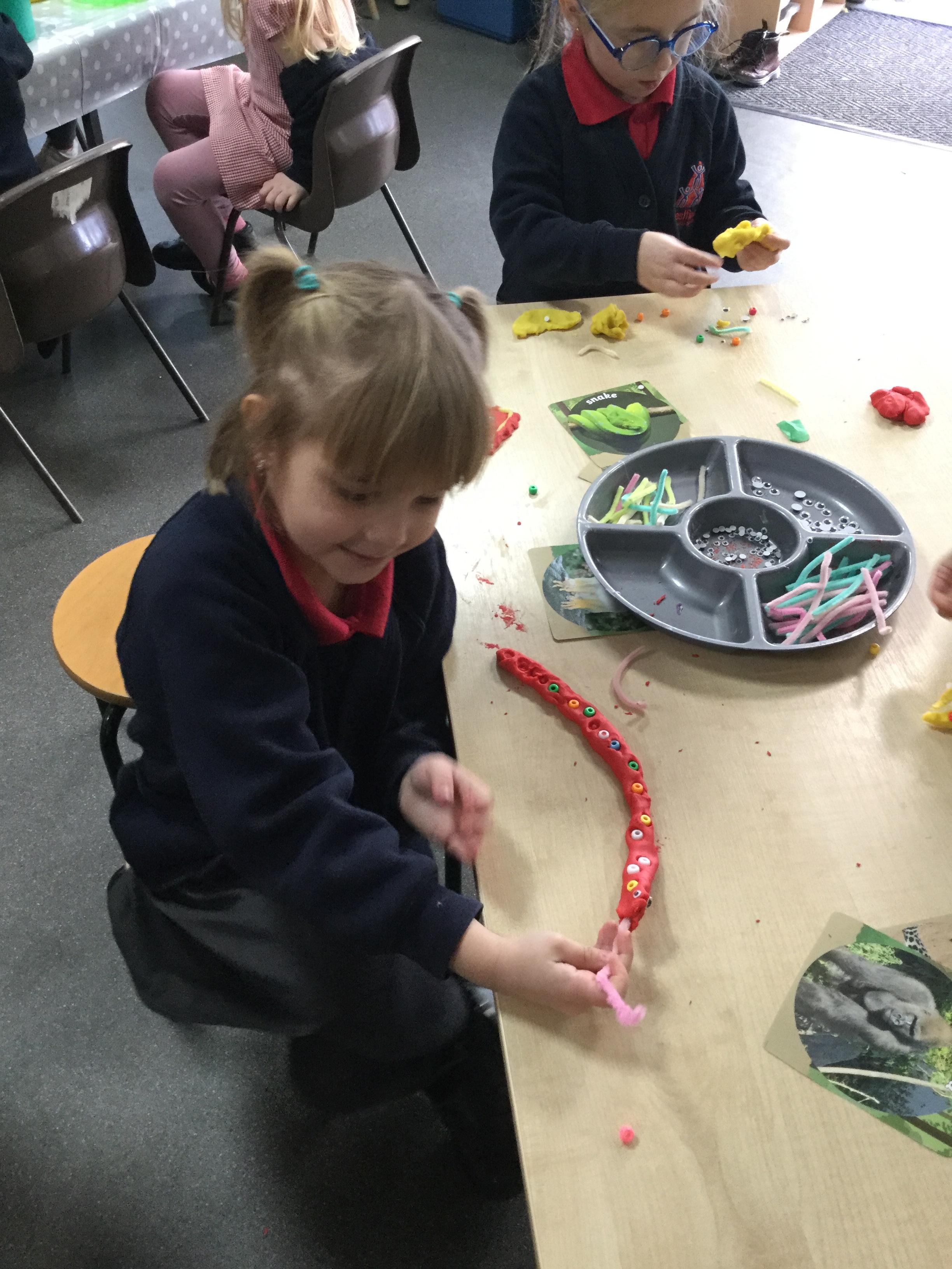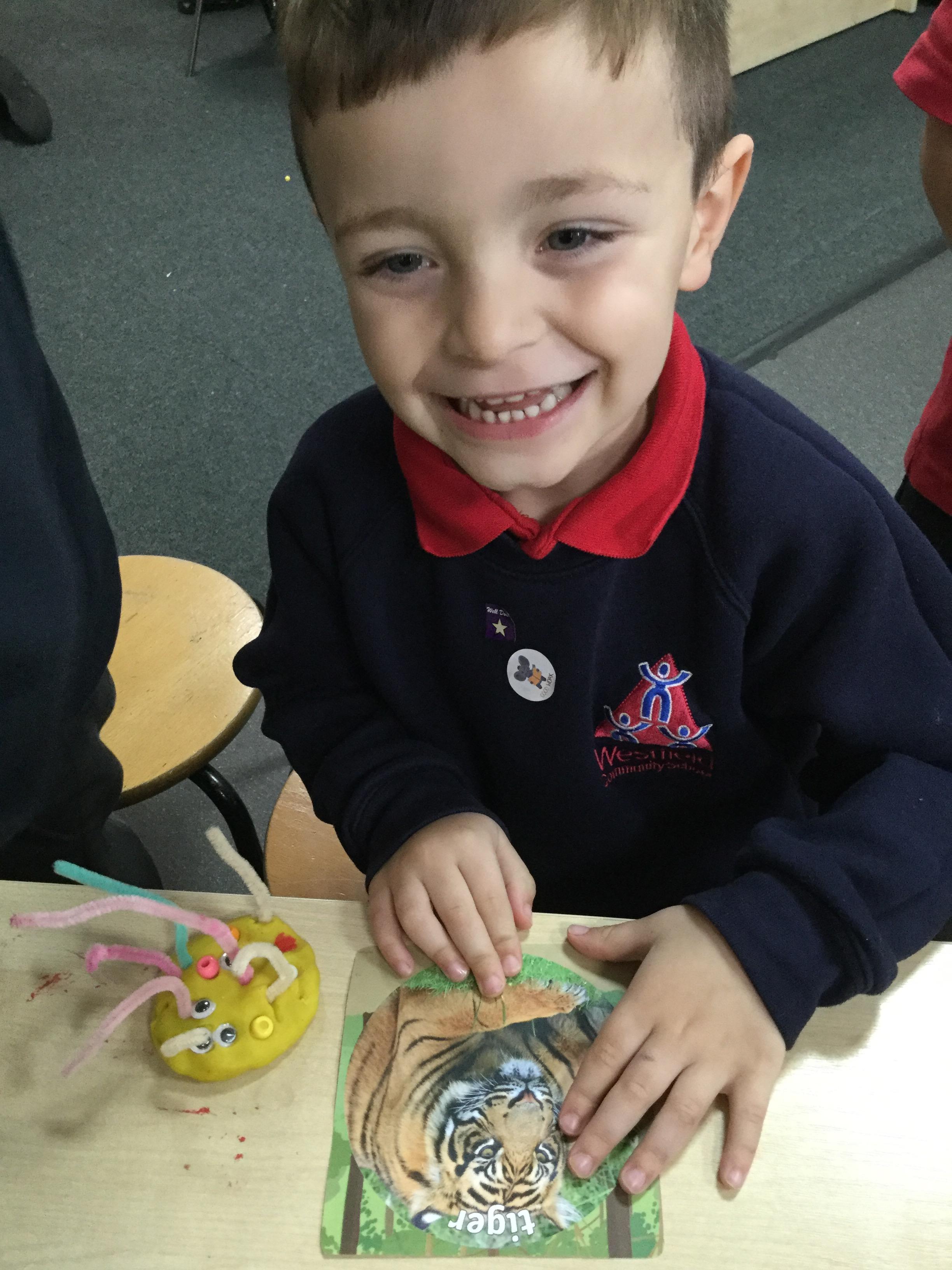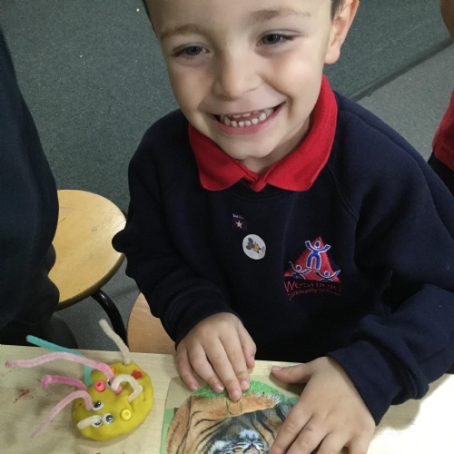 We've been very creative this week, we had half an animal picture that we needed to finish, we created animals from play dough and added pipe cleaners, beads and wobbly eyes. We looked at jungle paintings by the artist Rousseau and made our own pictures based on them. We copied animal patterns and drew some safari scenes.