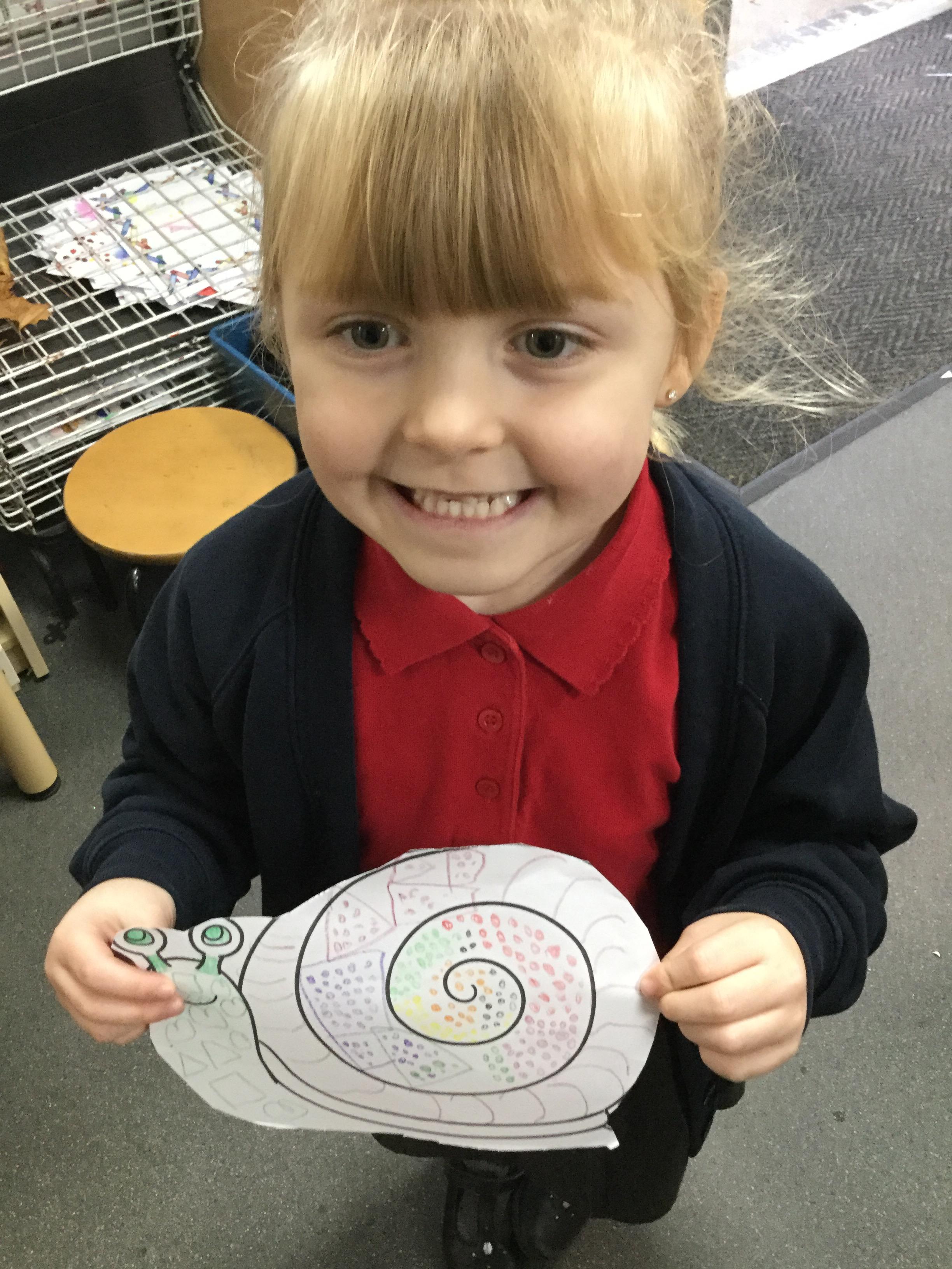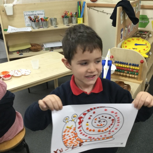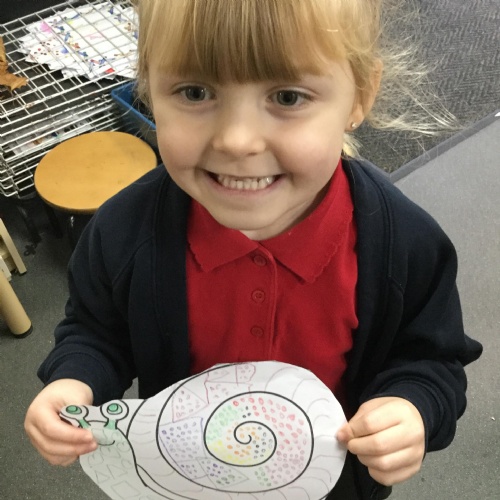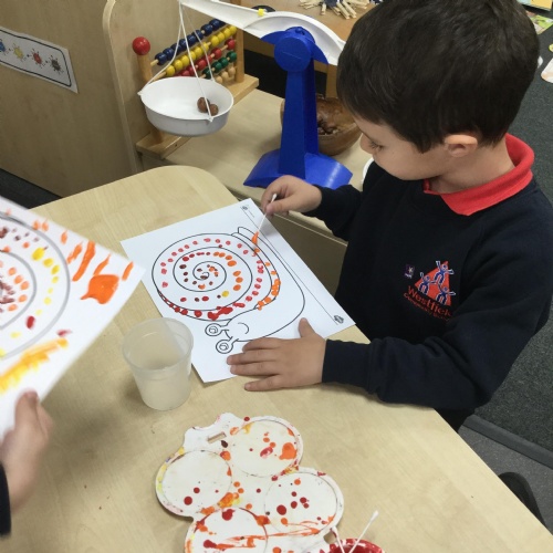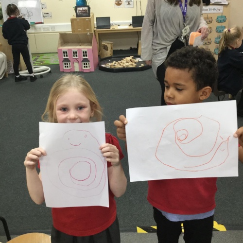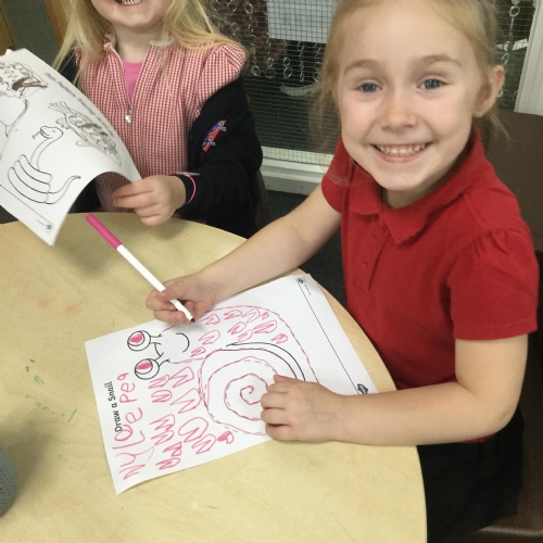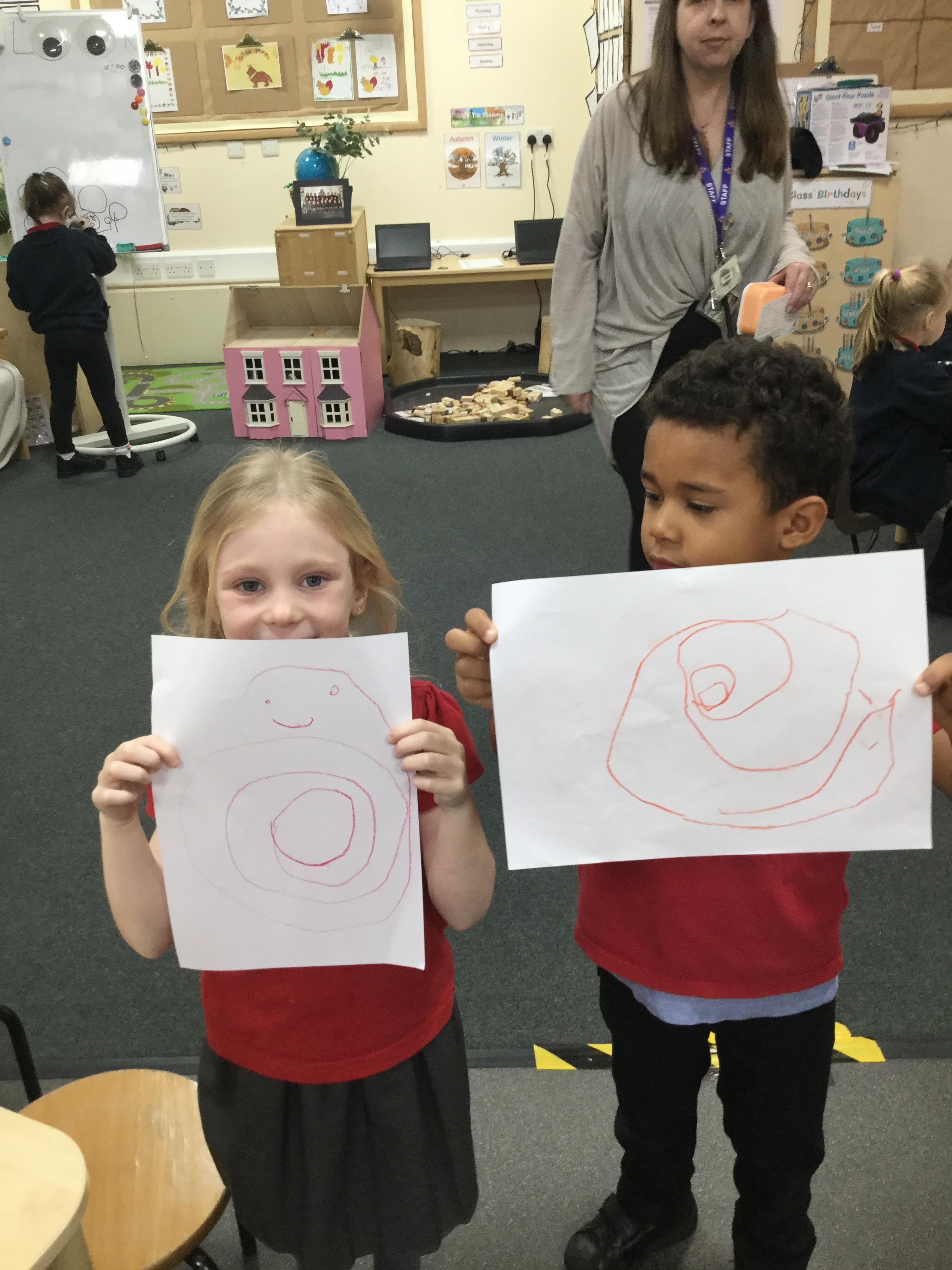 In our story, Jacob O'Reilly decided a snail was the best pet for him. Mrs Williamson found some snails in her garden and brought them in for us to look at. We drew snails and spiral pictures just like on the snails shell. We called the snails, 'Michelle' and 'Sidney'.