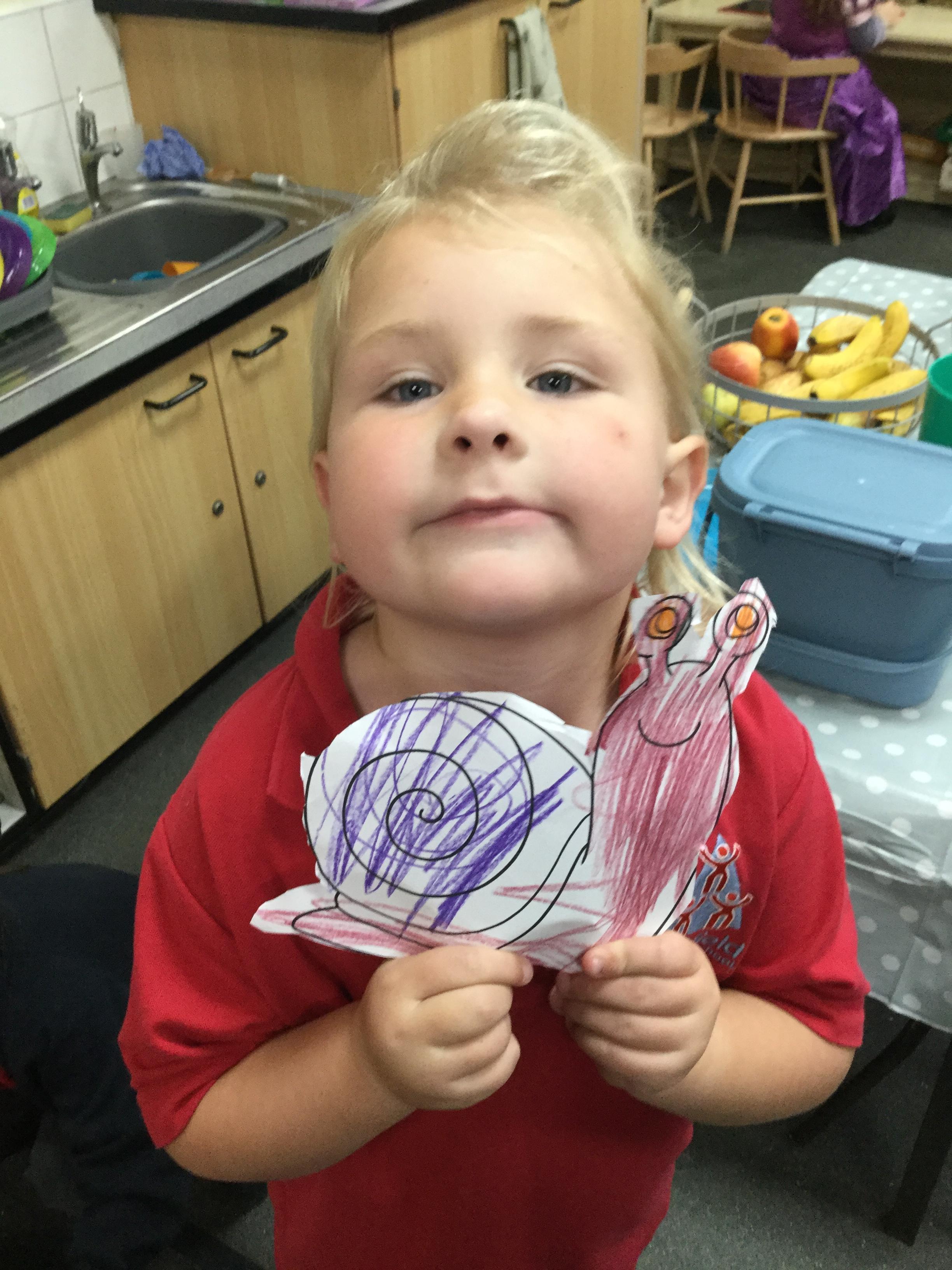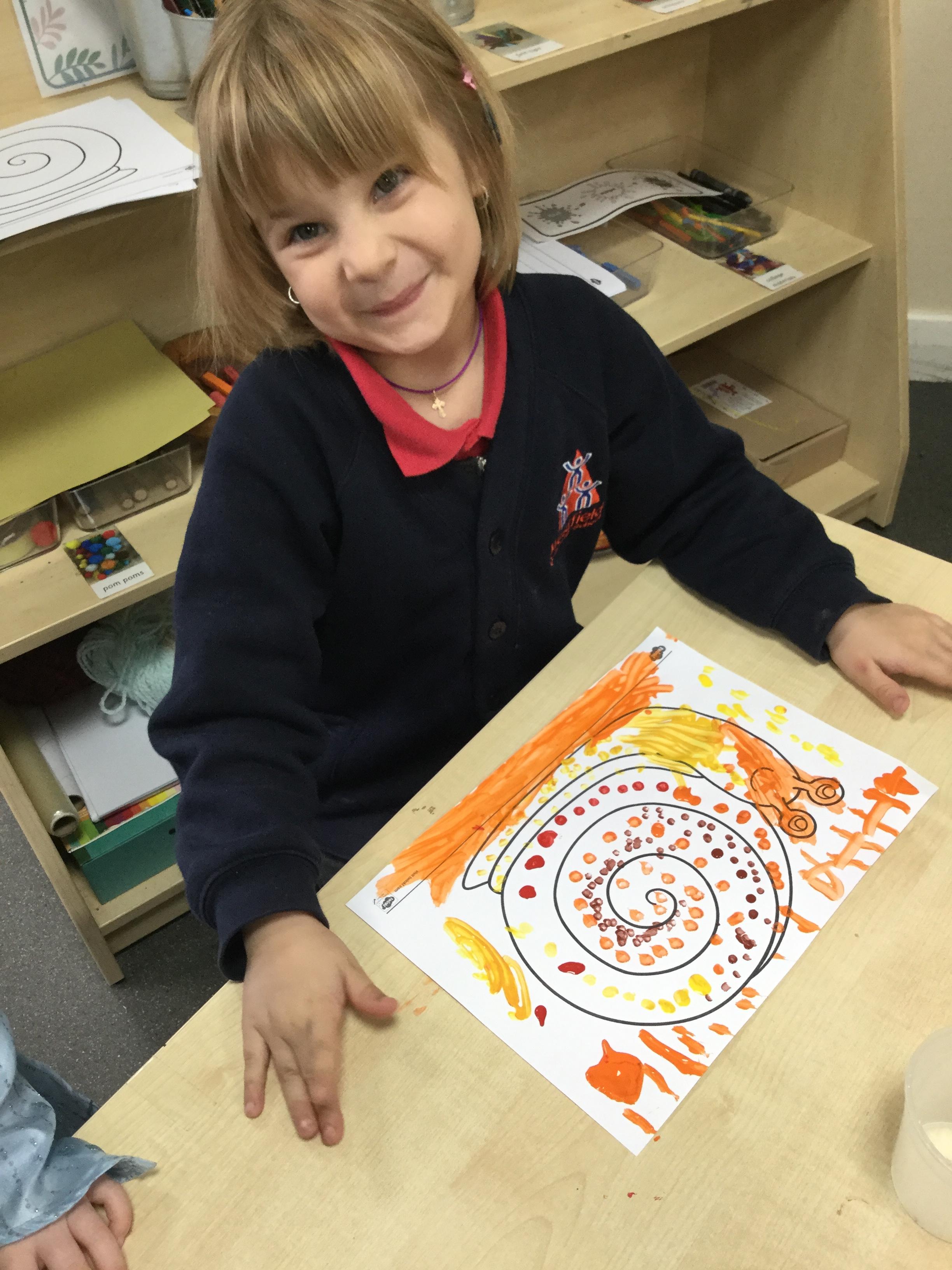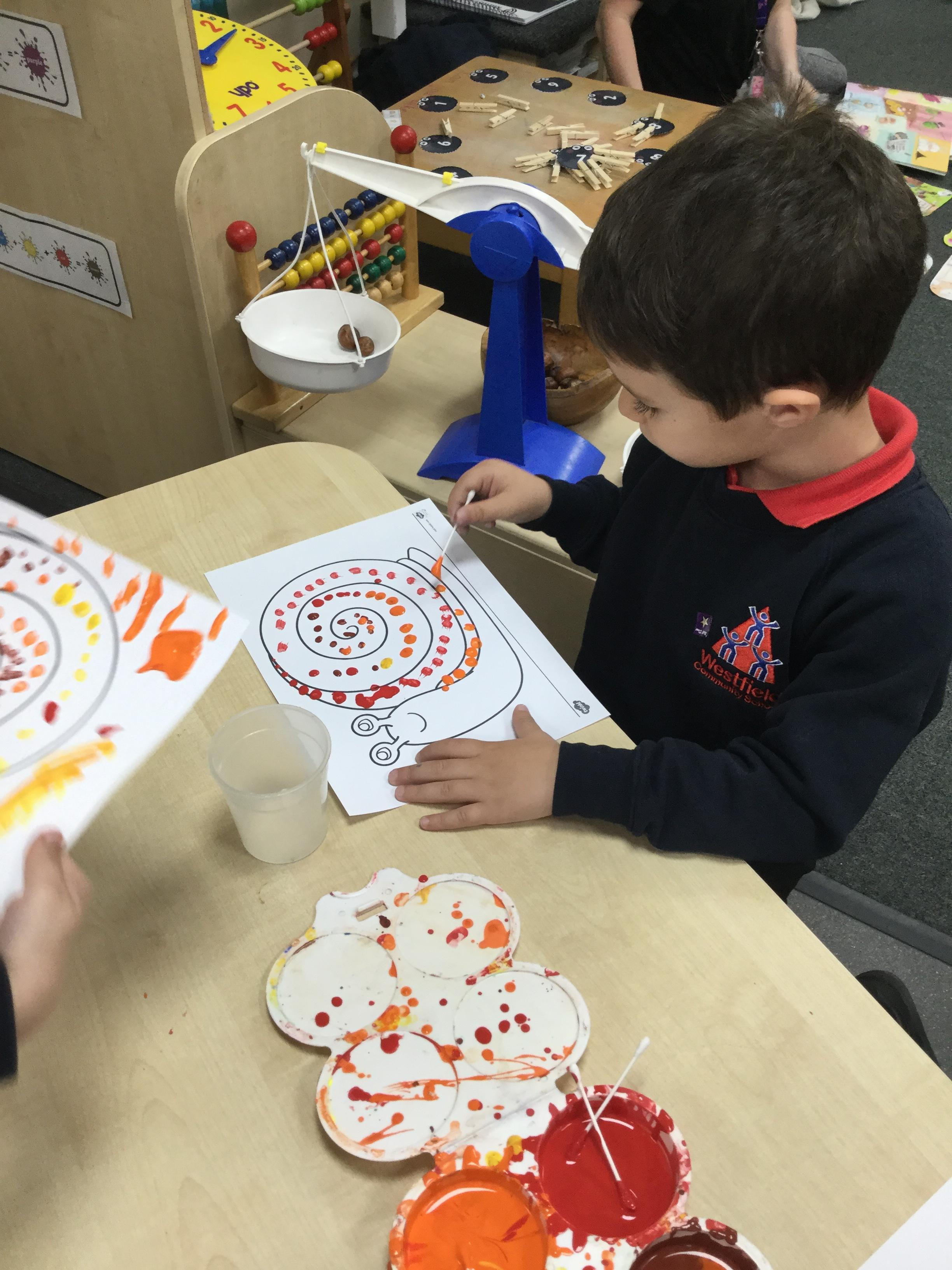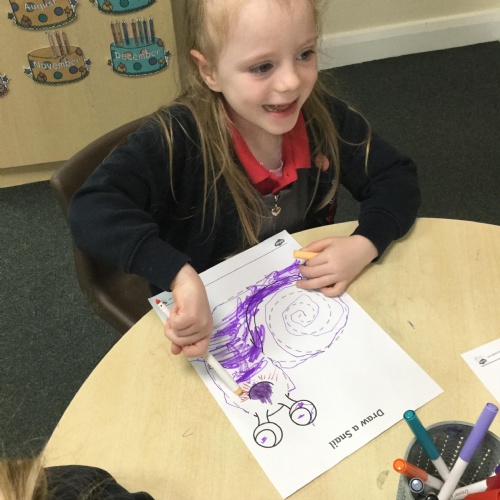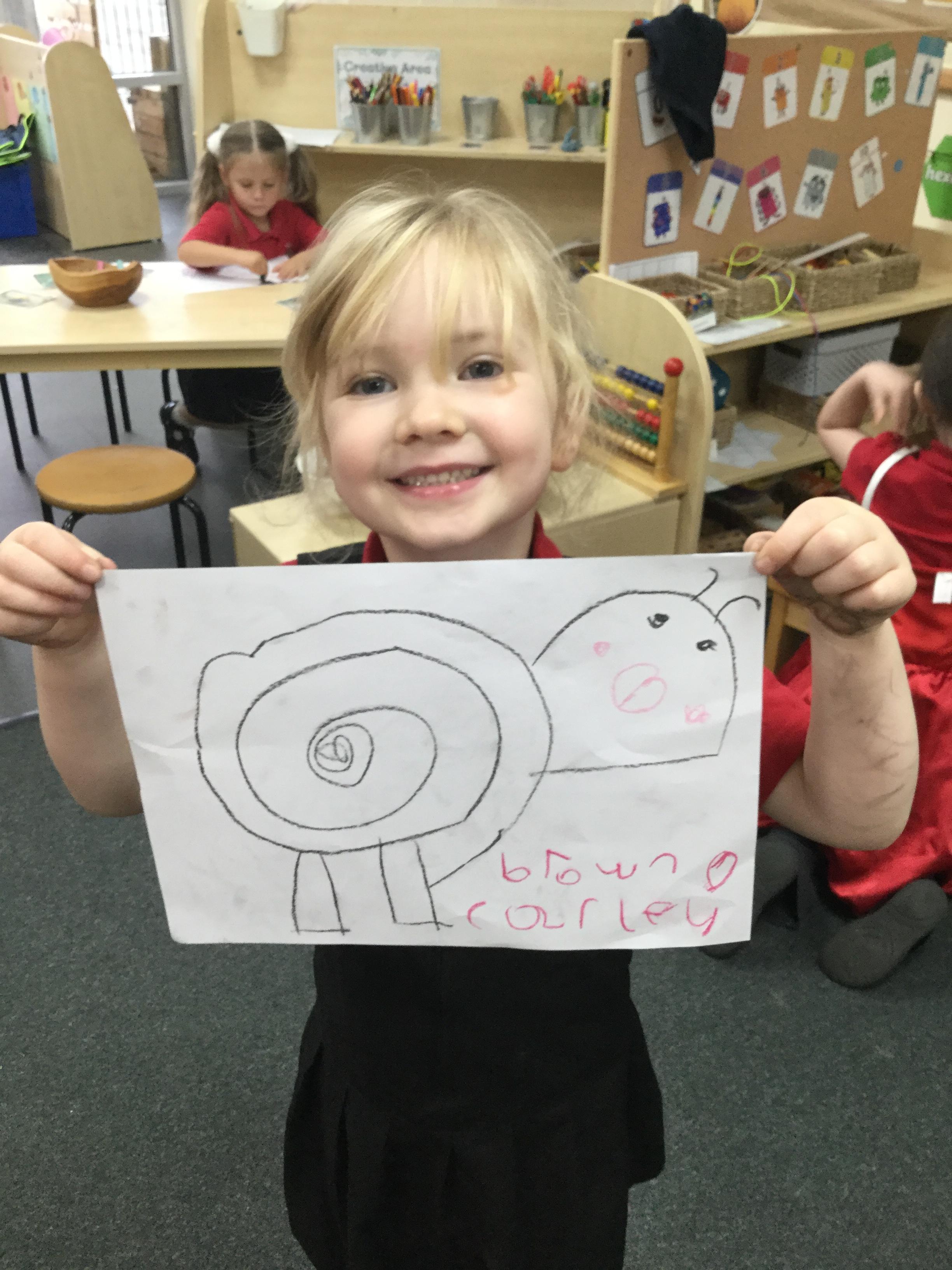 In our story, Jacob O'Reilly decided a snail was the best pet for him. Mrs Williamson found some snails in her garden and brought them in for us to look at. We drew snails and spiral pictures just like on the snails shell. We called the snails, 'Michelle' and 'Sidney'.