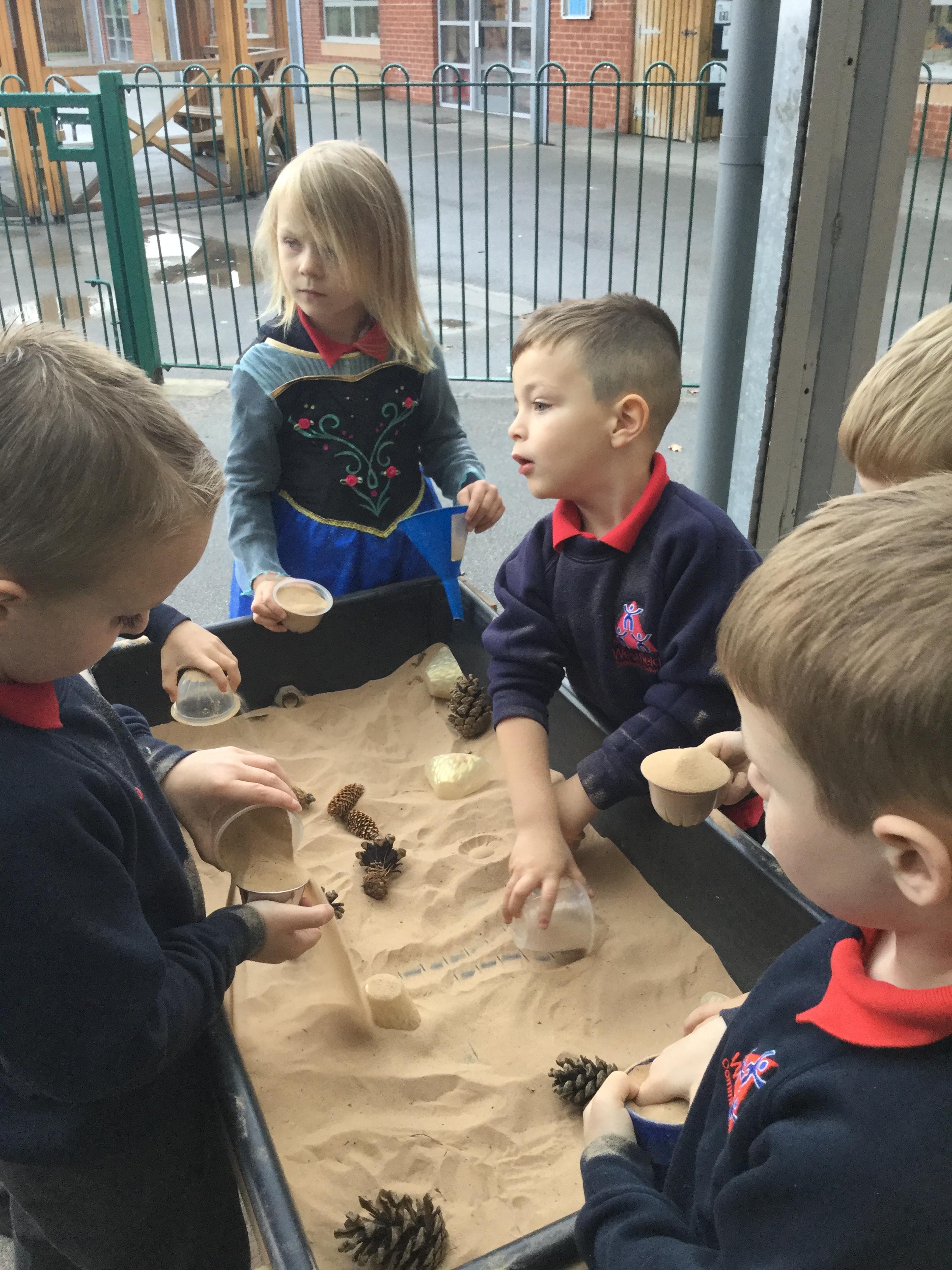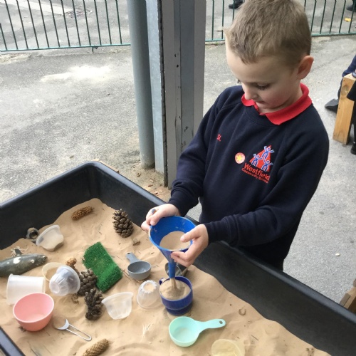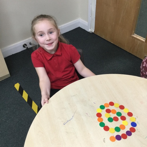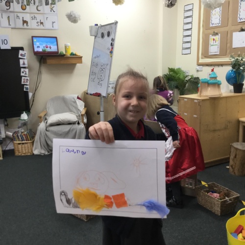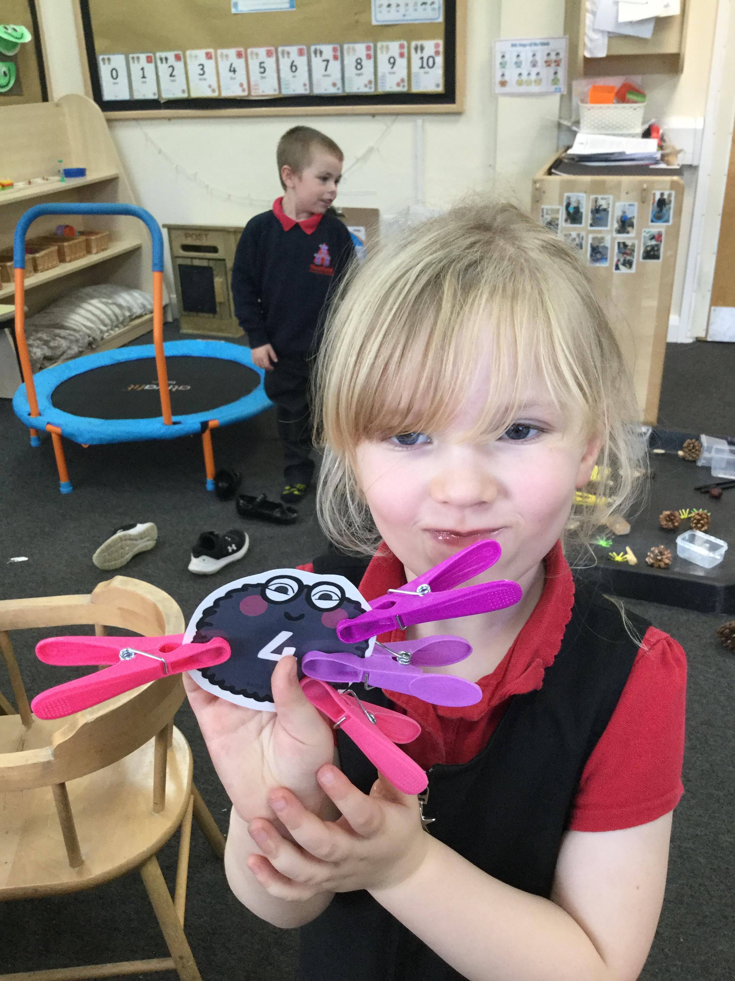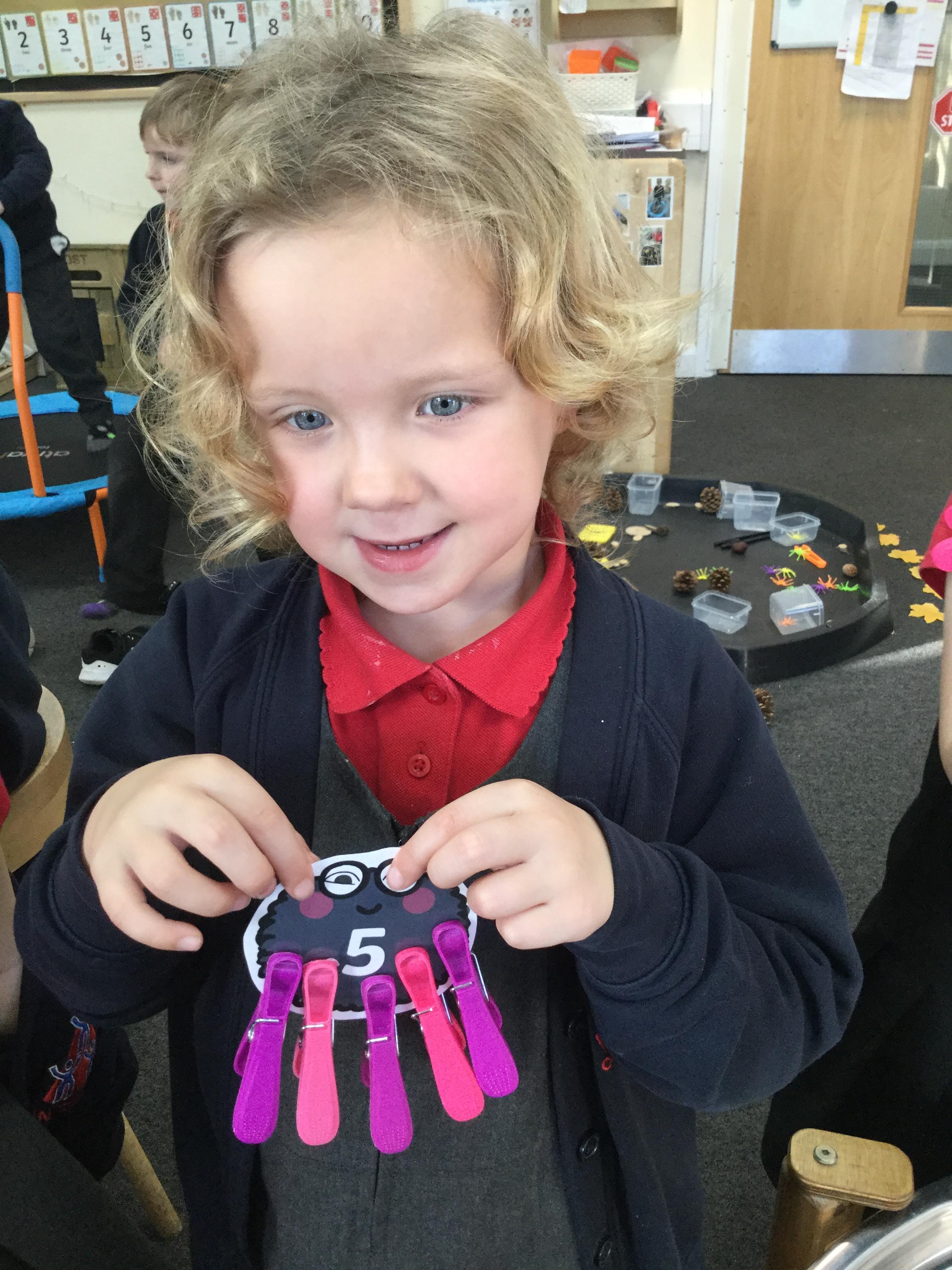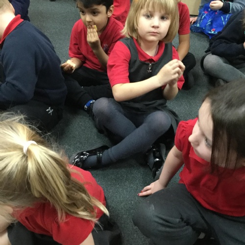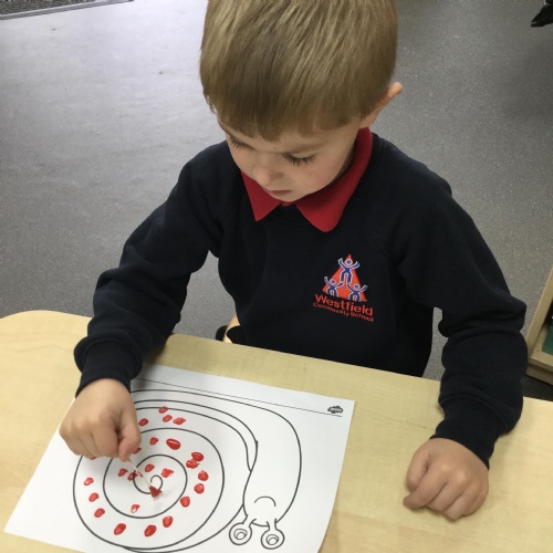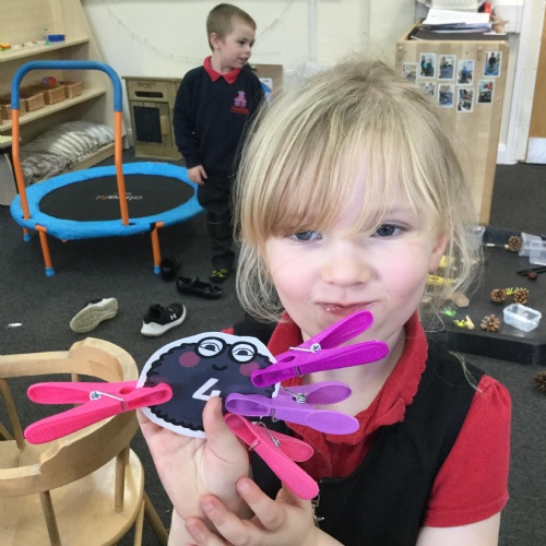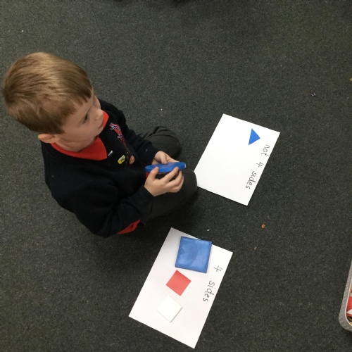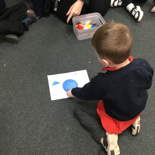In maths we have been done a lot of work about the number 5. We have been singing the rhyme '5 little peas in a peapod' and can see we have 5 fingers on one hand. We have been counting to 5, making collections of 5 objects, looking at the pattern of 5 on a dice and looking at how we have 5 fingers on each hand that make 10 altogether. We have also looked at 4 sided shapes and sorted 2D shapes into sets of '4 sides' and 'not 4 sides'.