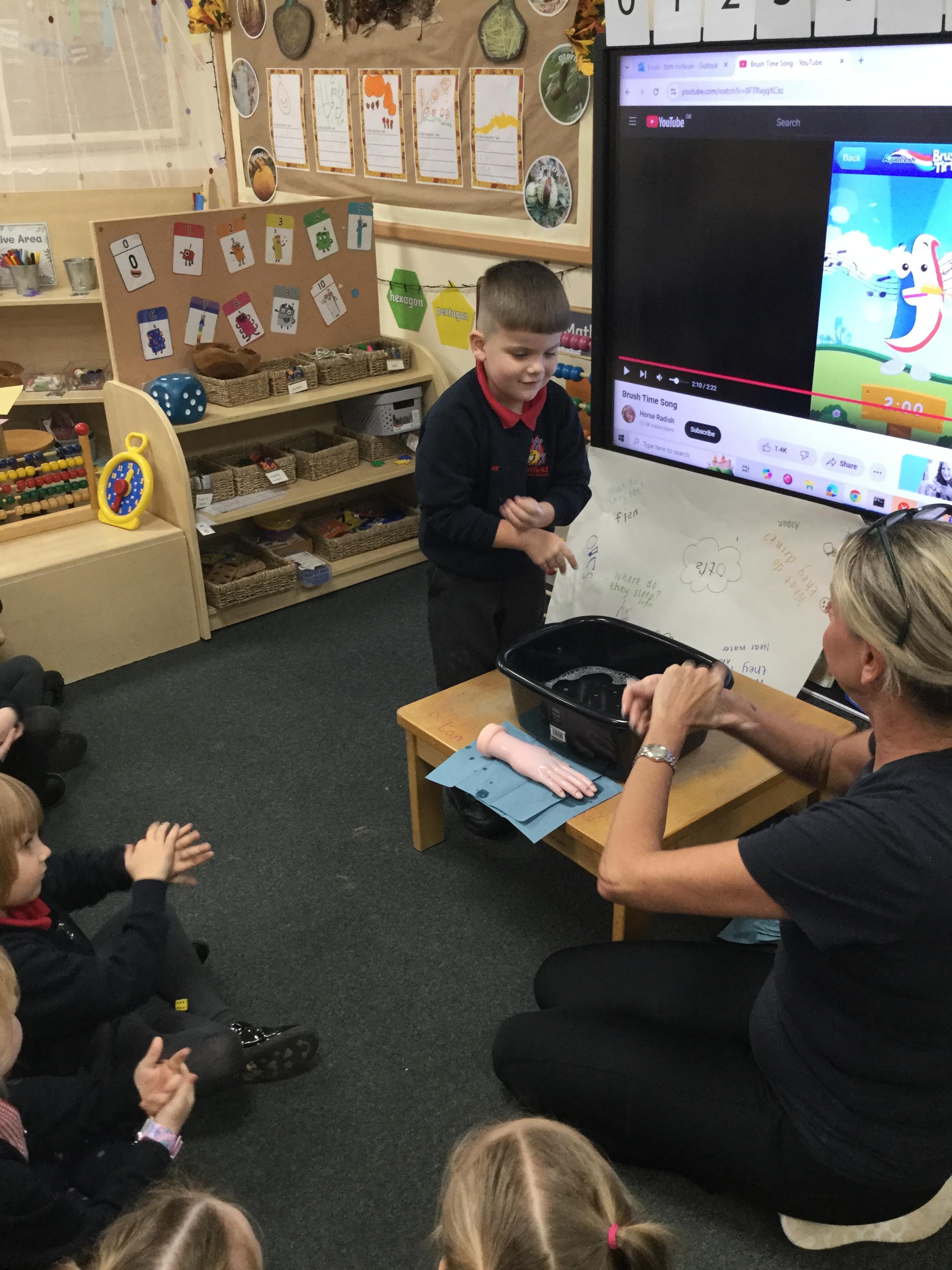 On Tuesday, Tracey from 'Be Well Wigan' came to talk to us about brushing our teeth. She showed us how to brush and told us rules to make sure we do a good job and keep our teeth healthy.